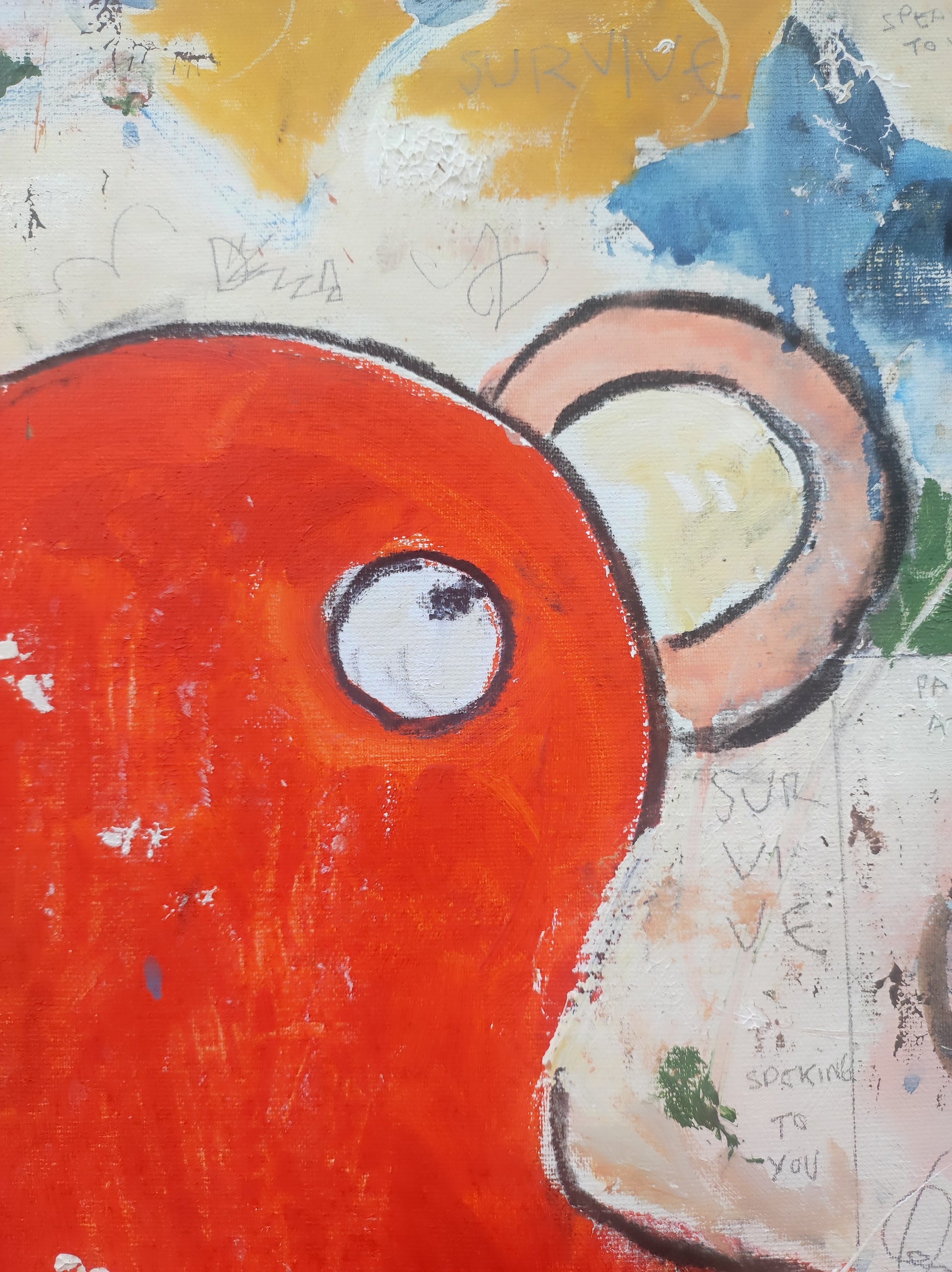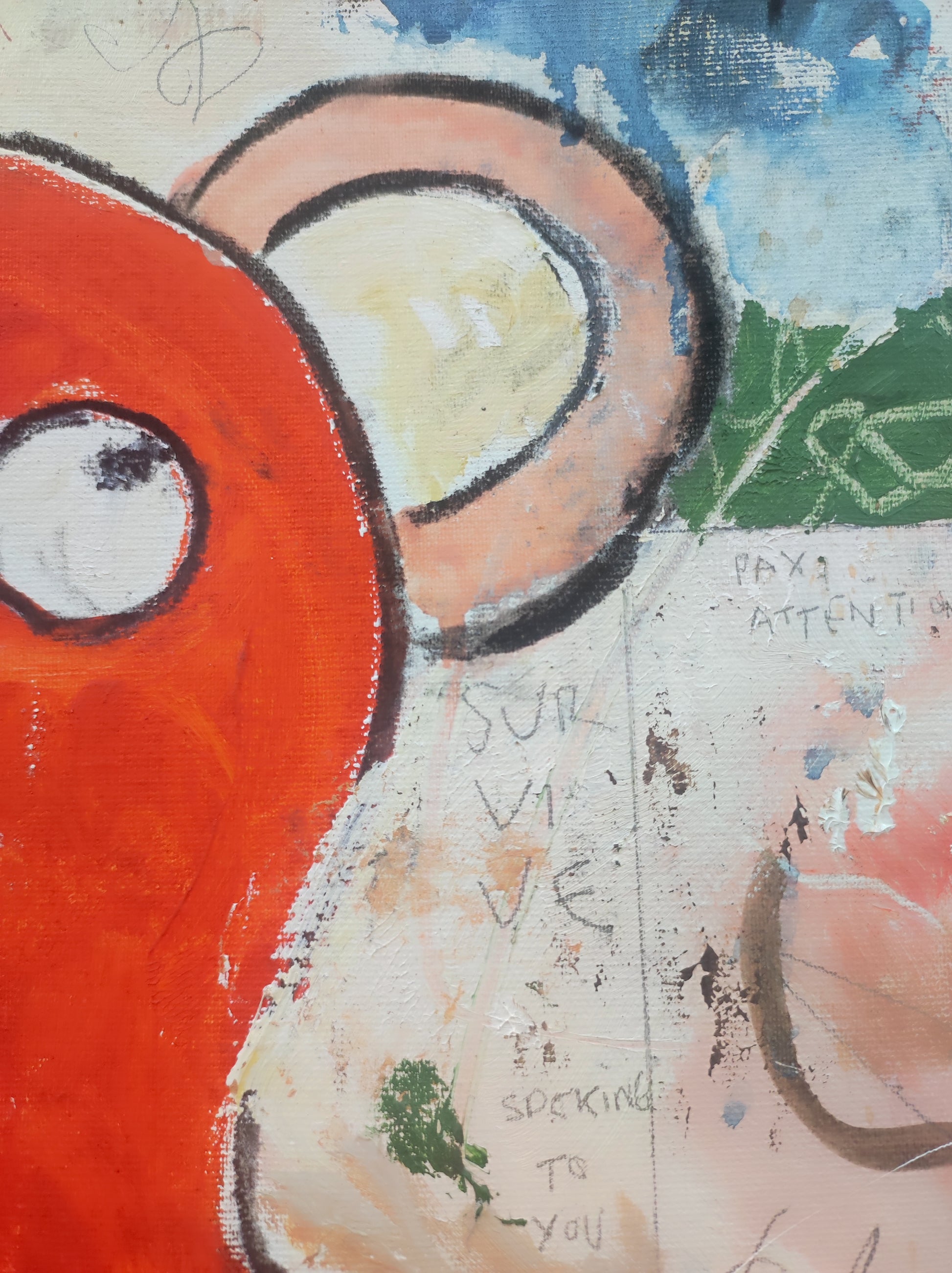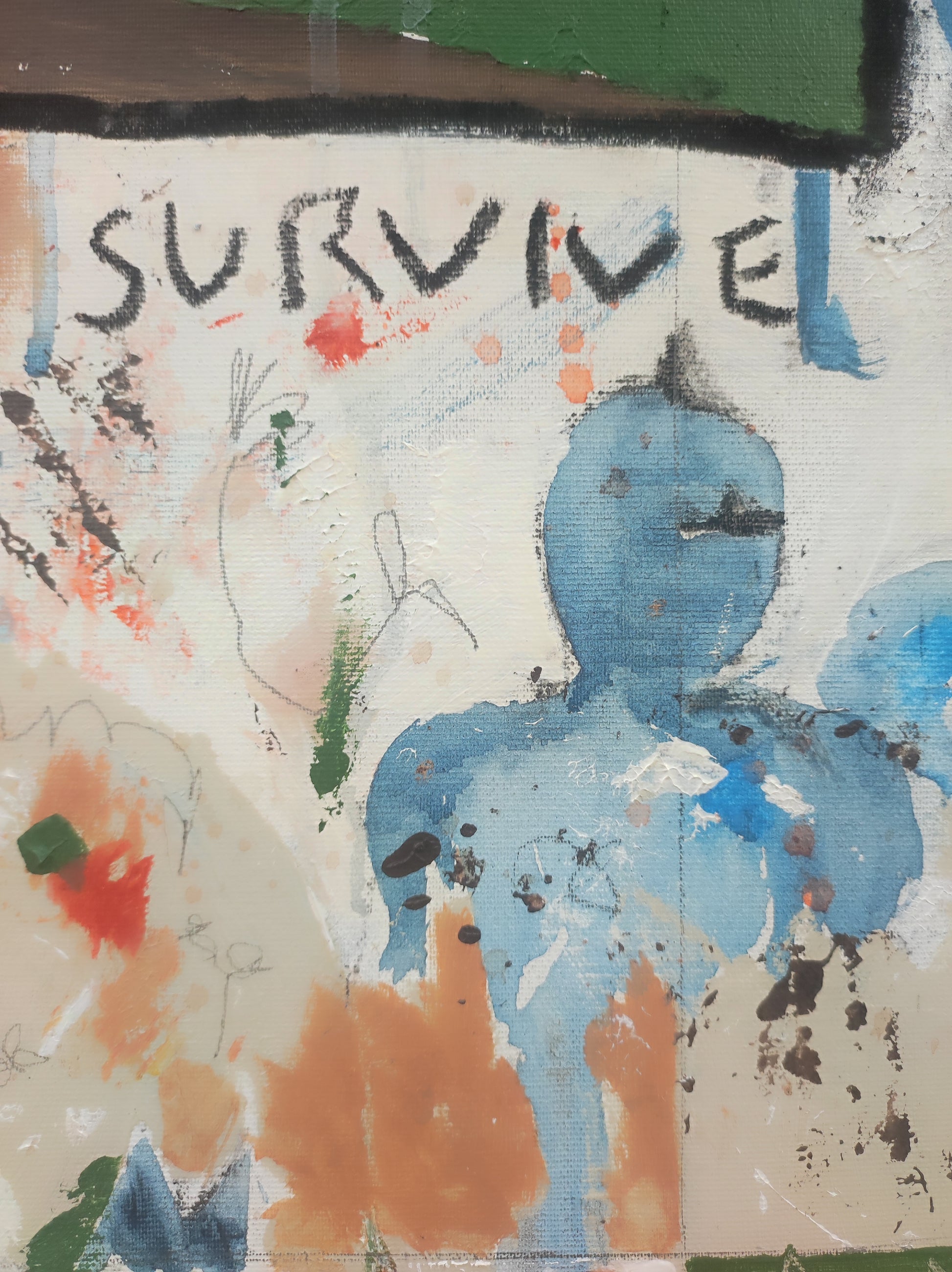 Pintura gestual, intuitiva, que deja que las cosas pasen y se apoya sobre lo que aparece. Aprovechando el accidente y aceptando las consecuencias.