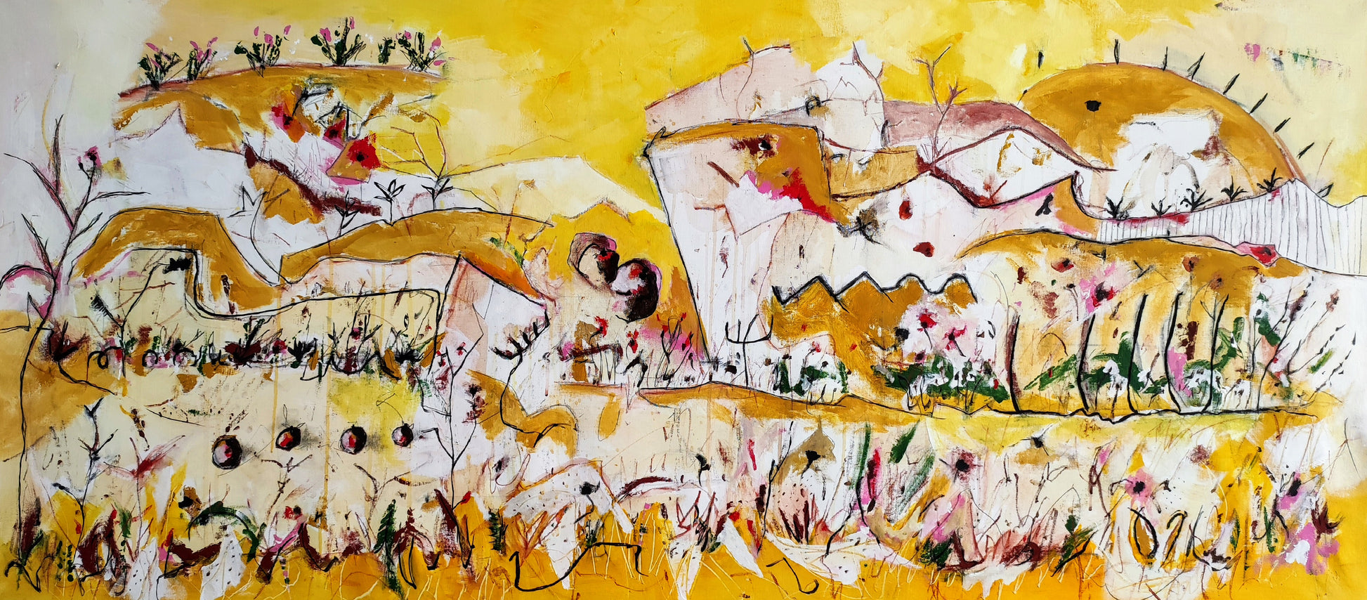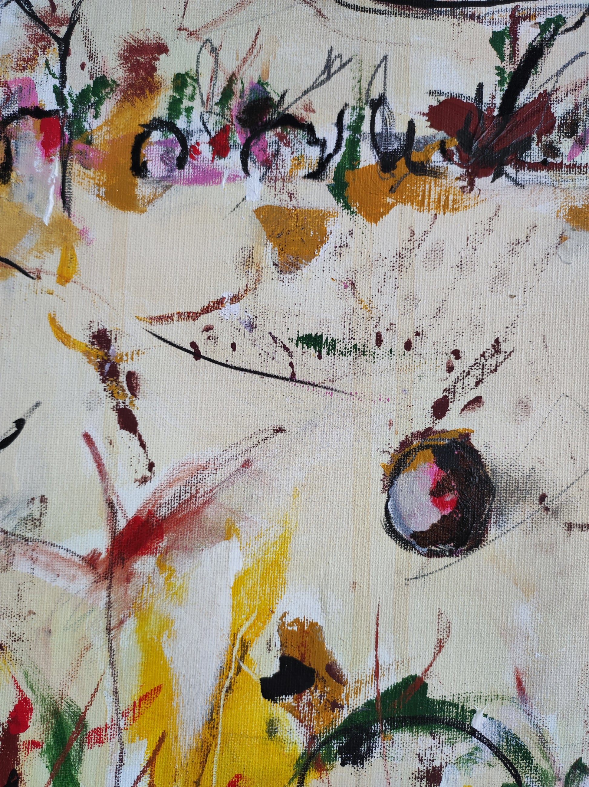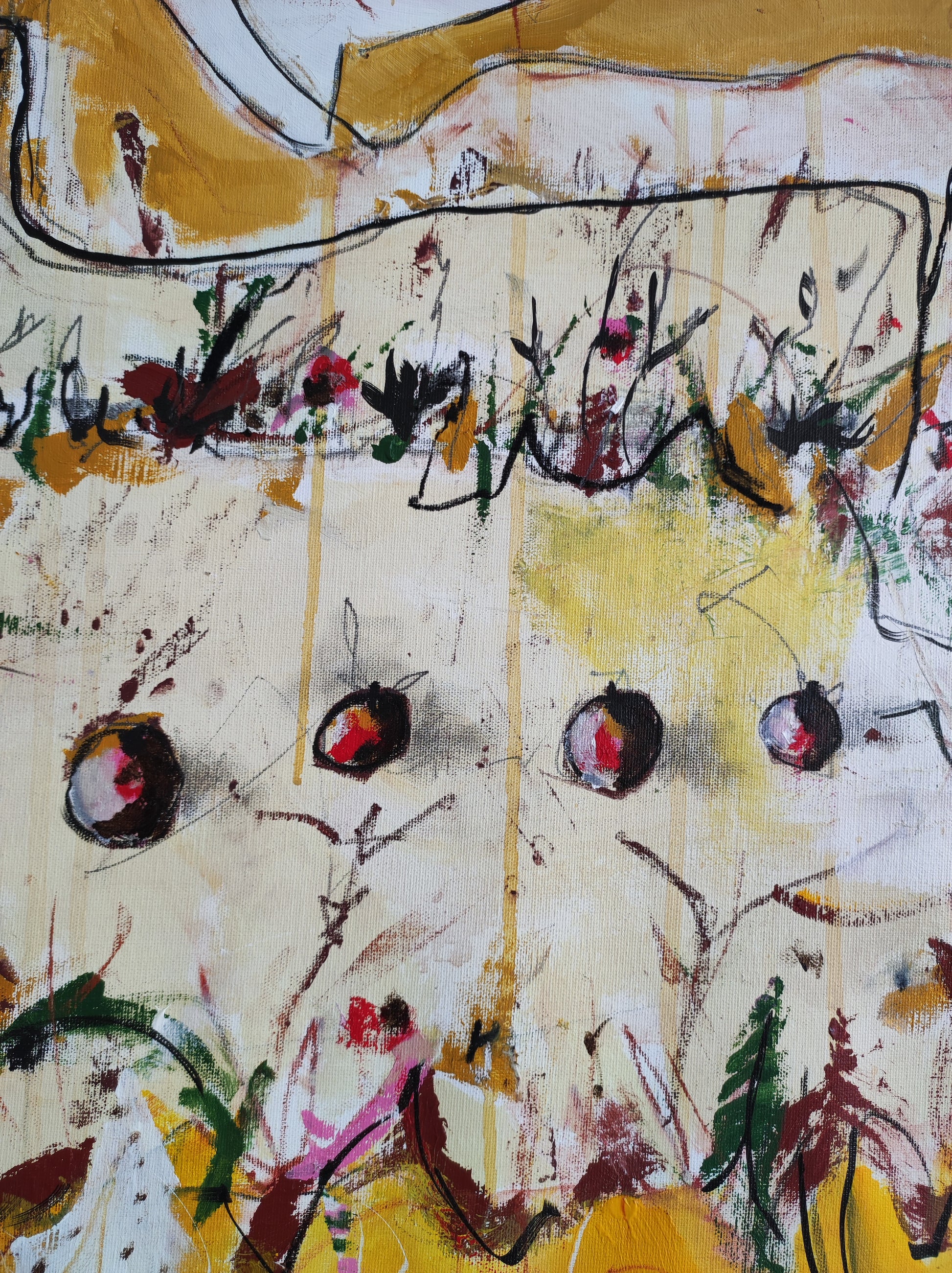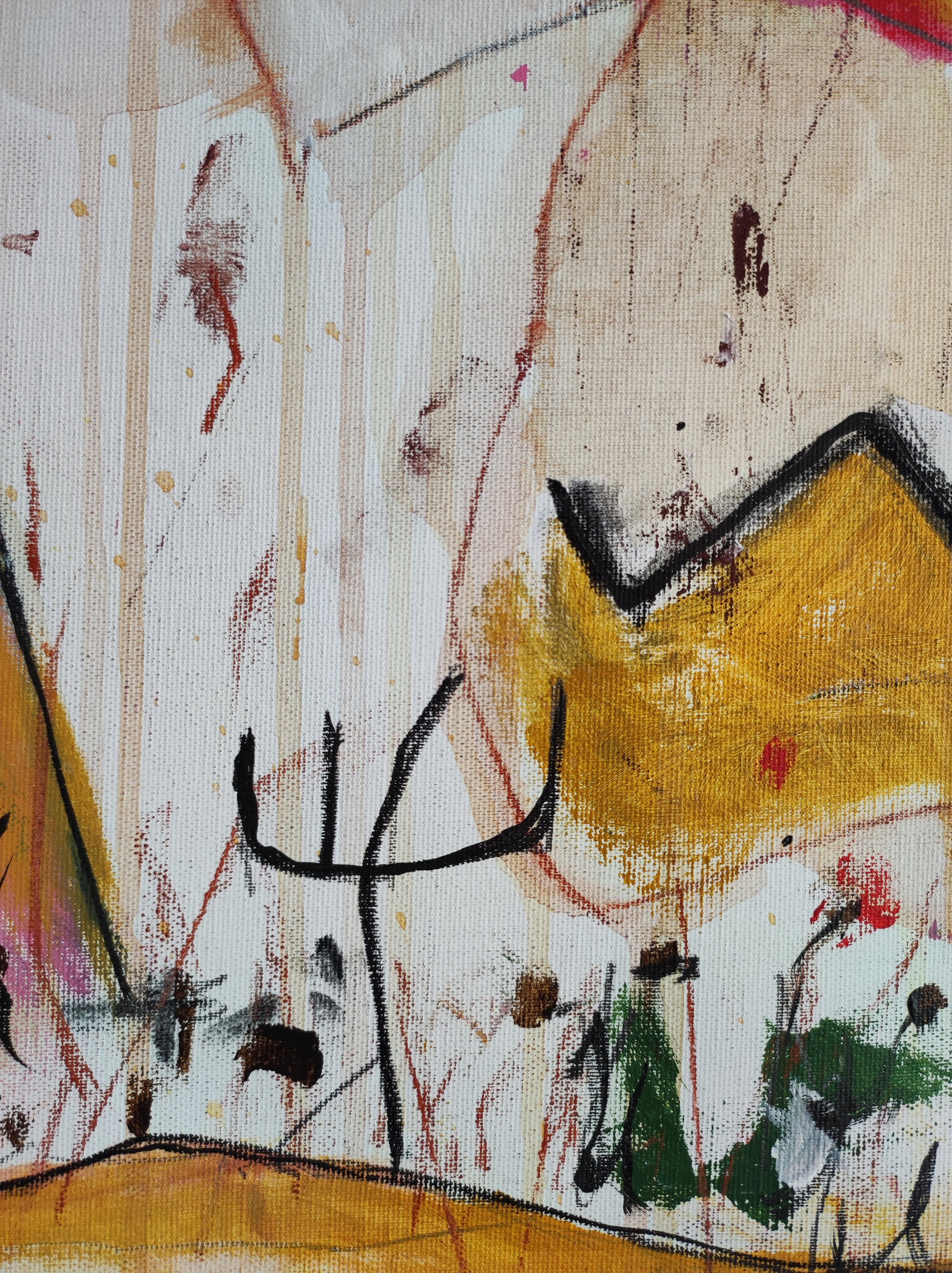 Pintura gestual, intuitiva, que deja que las cosas pasen y se apoya sobre lo que aparece. Aprovechando el accidente y aceptando las consecuencias.