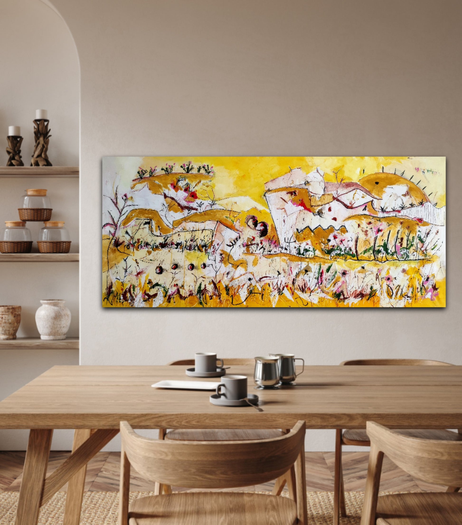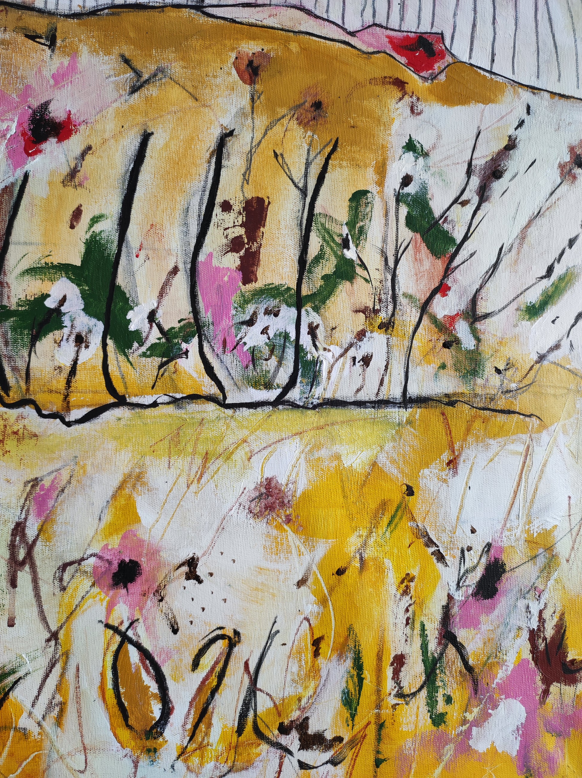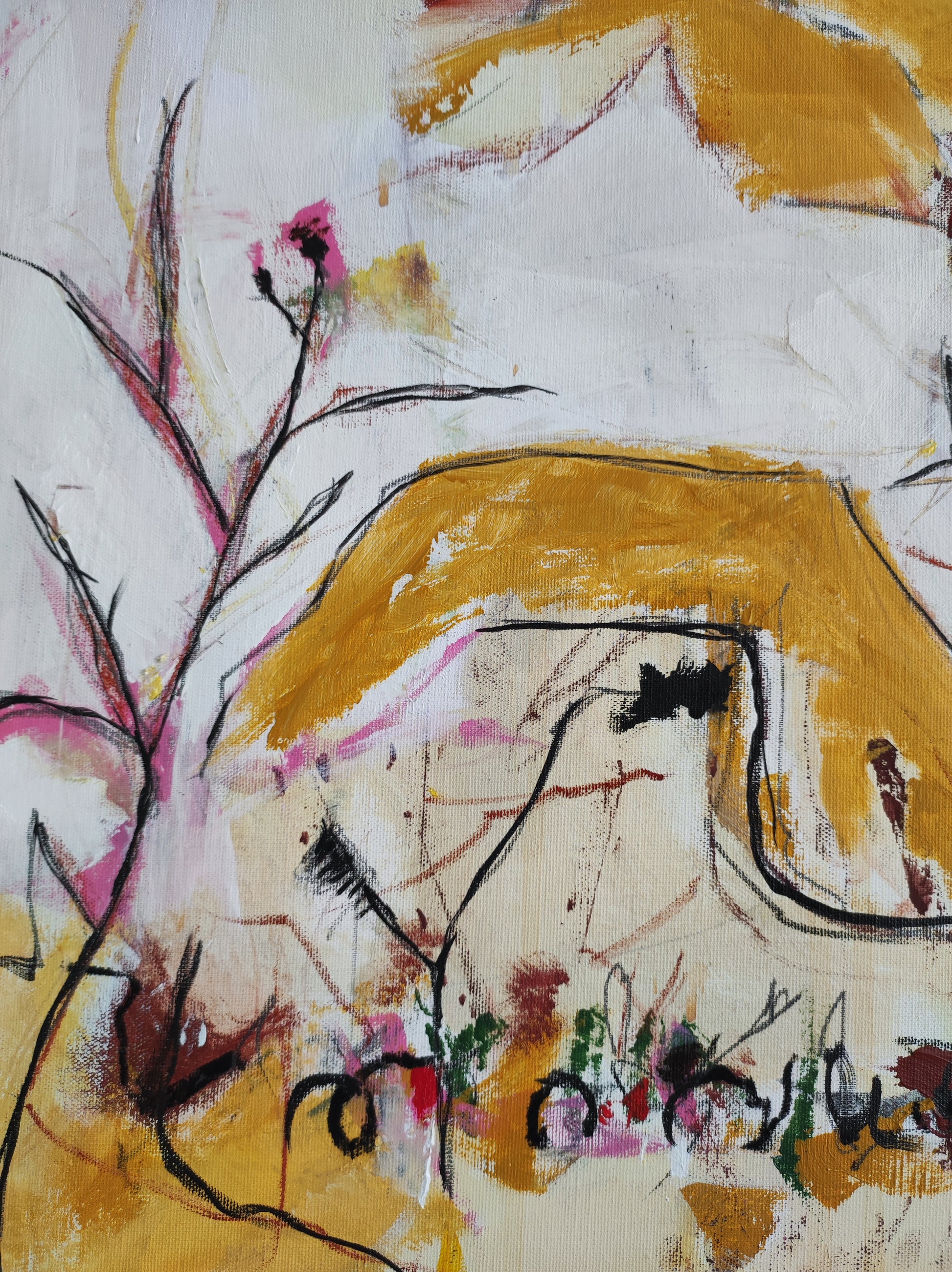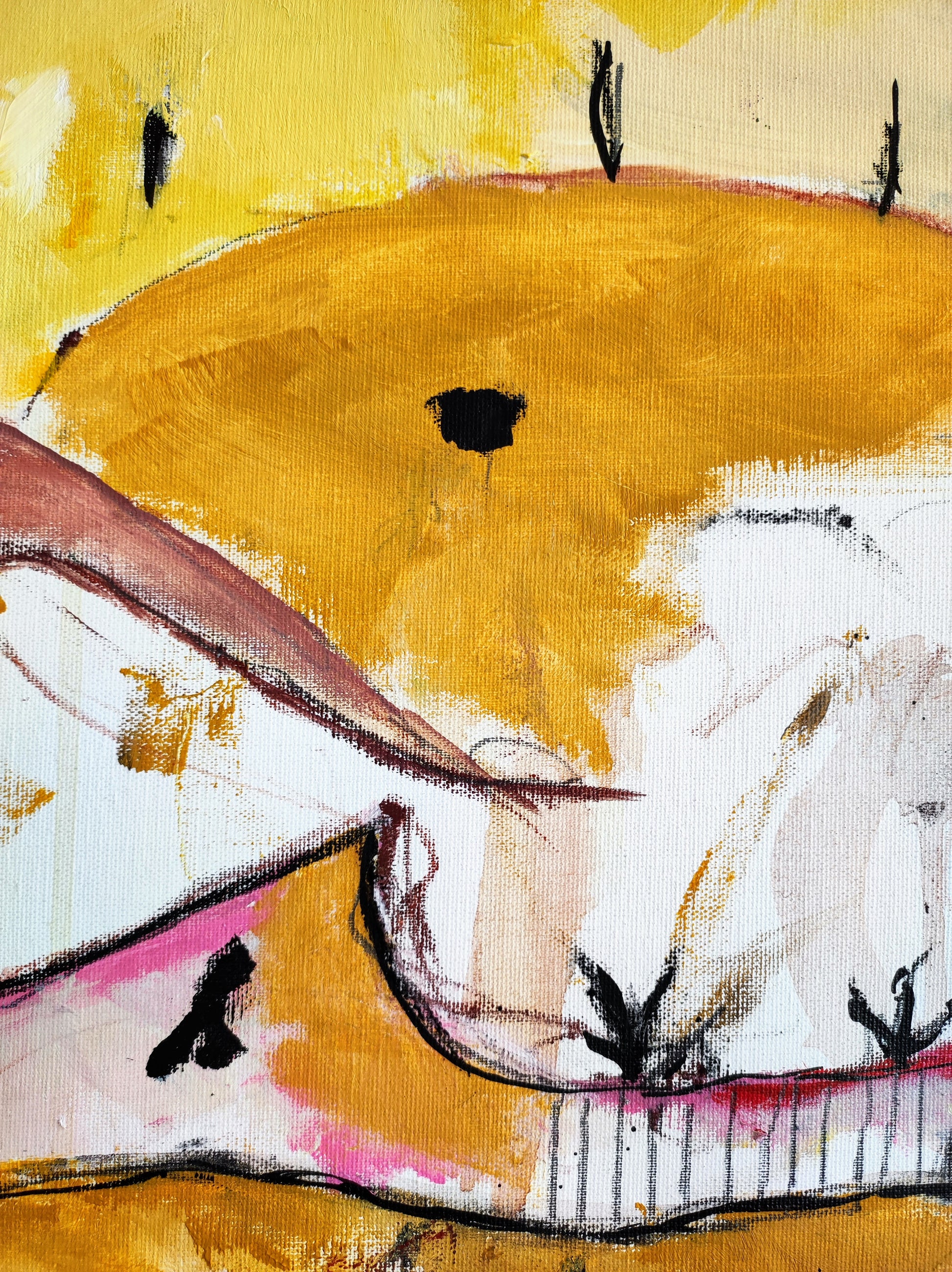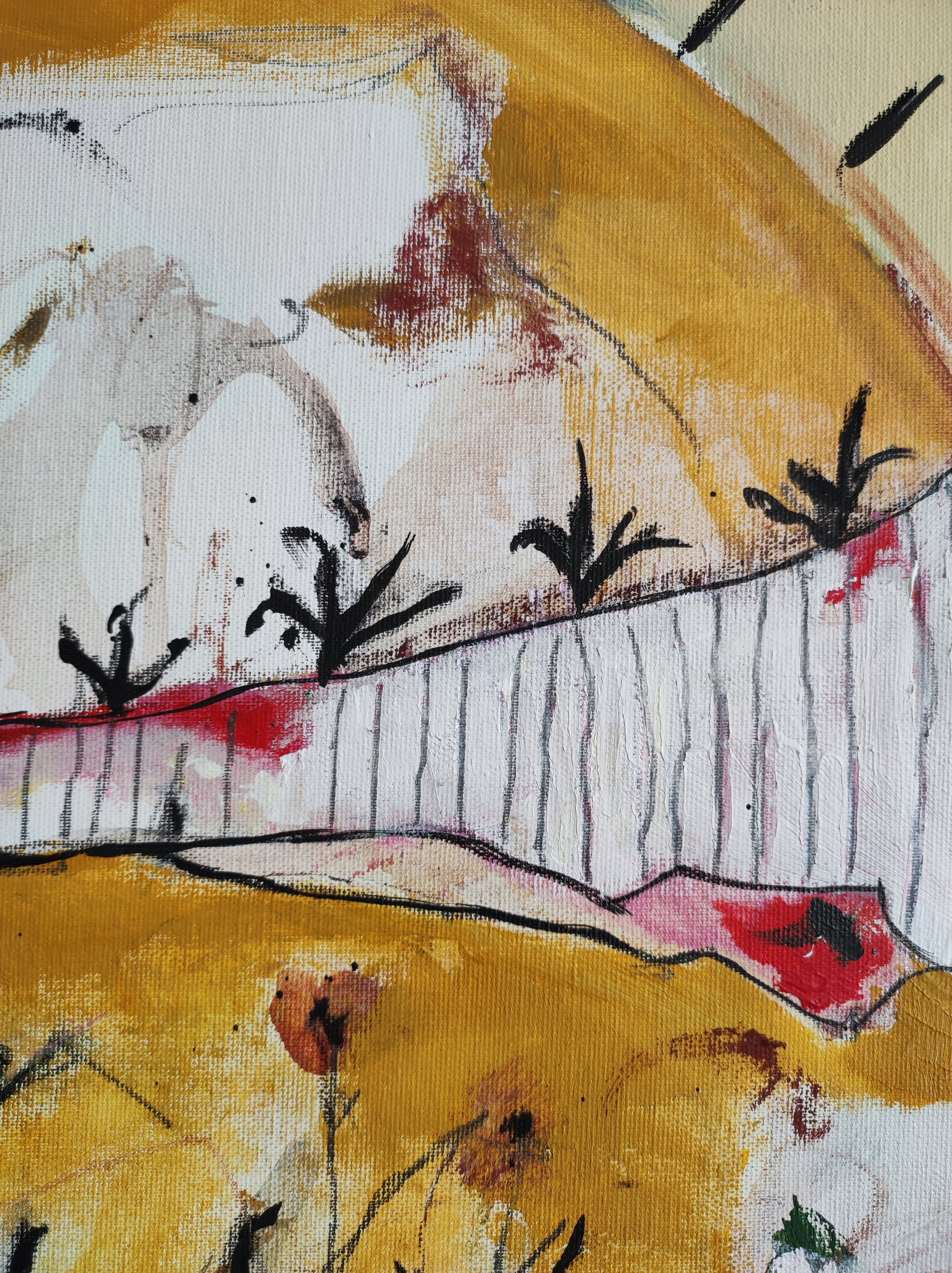 Pintura gestual, intuitiva, que deja que las cosas pasen y se apoya sobre lo que aparece. Aprovechando el accidente y aceptando las consecuencias.