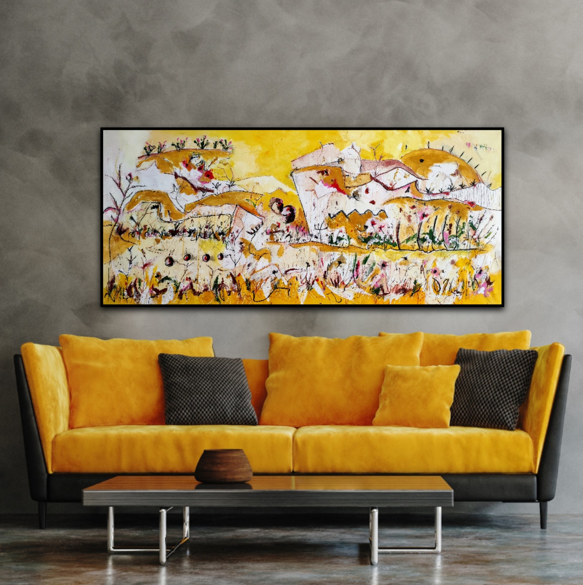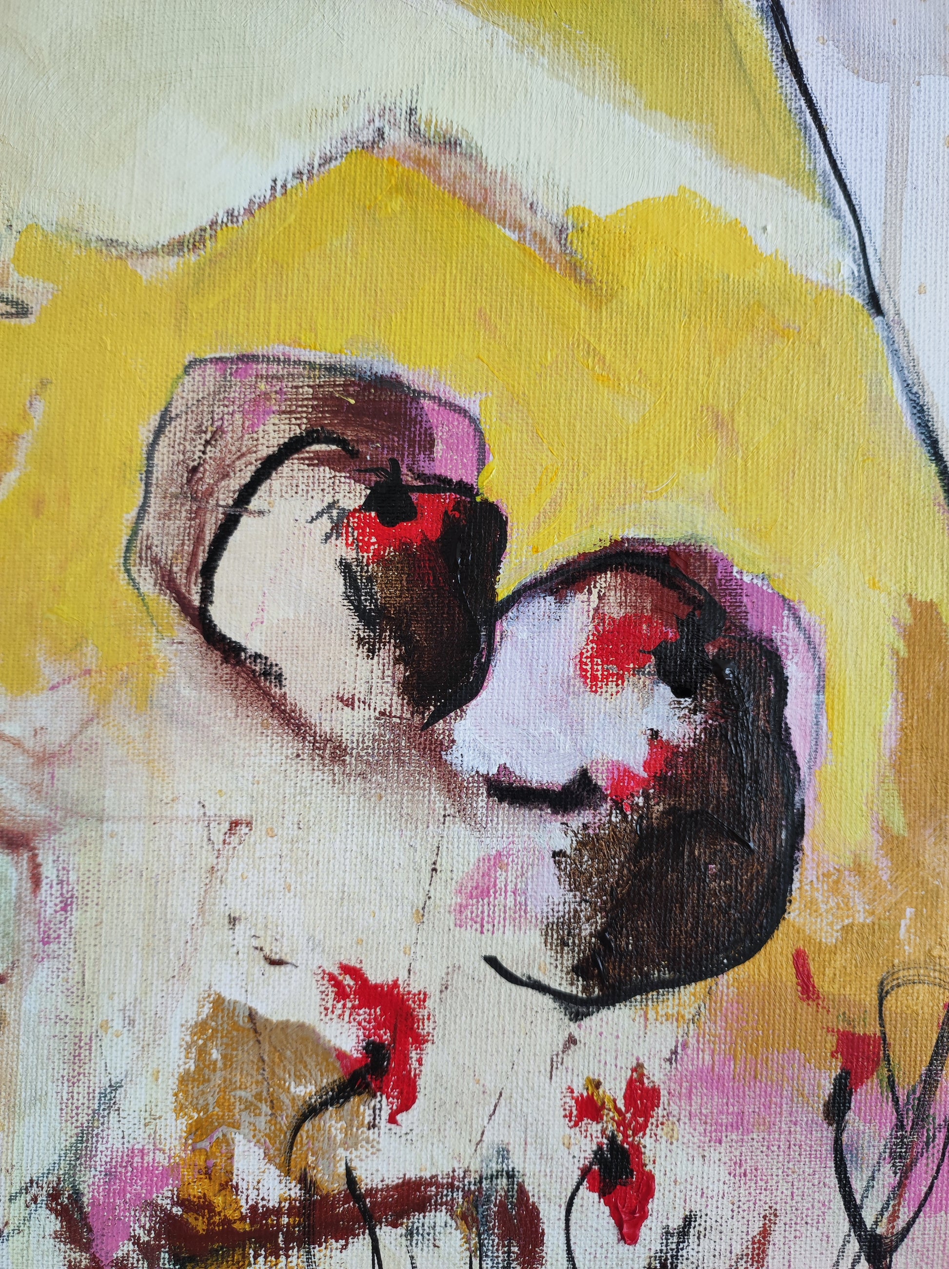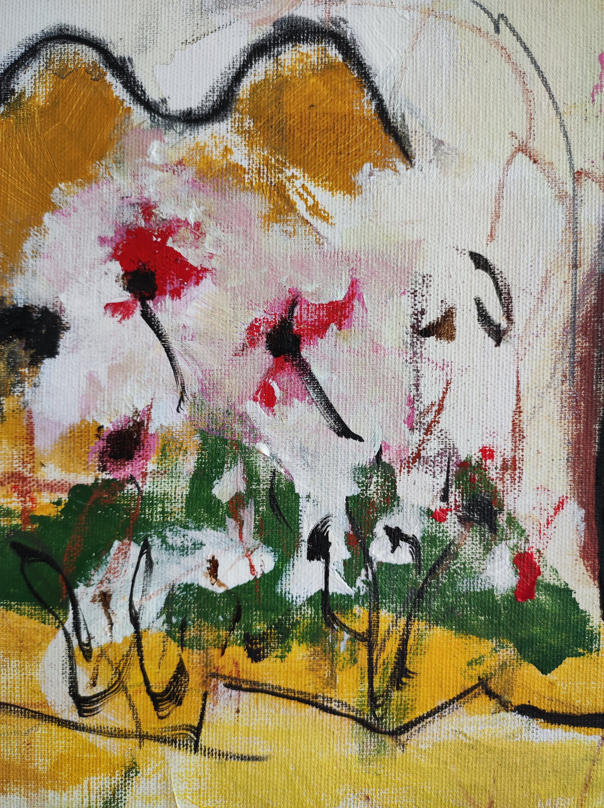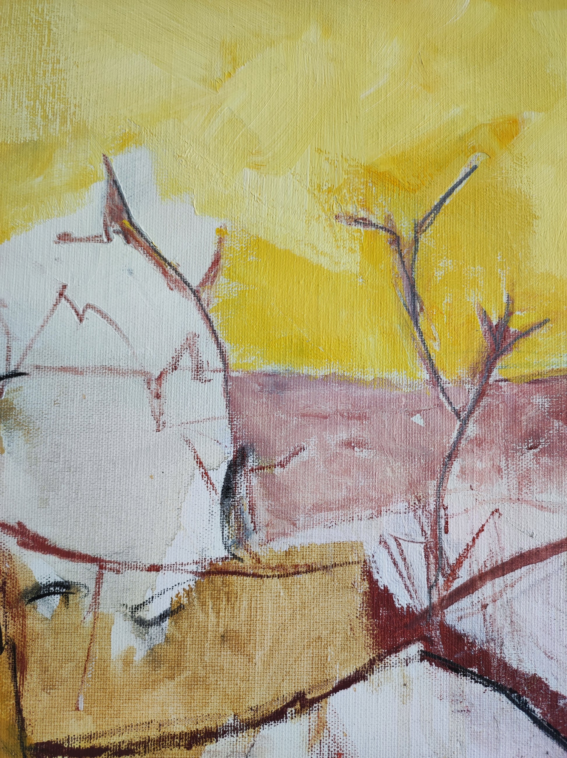 Pintura gestual, intuitiva, que deja que las cosas pasen y se apoya sobre lo que aparece. Aprovechando el accidente y aceptando las consecuencias.
