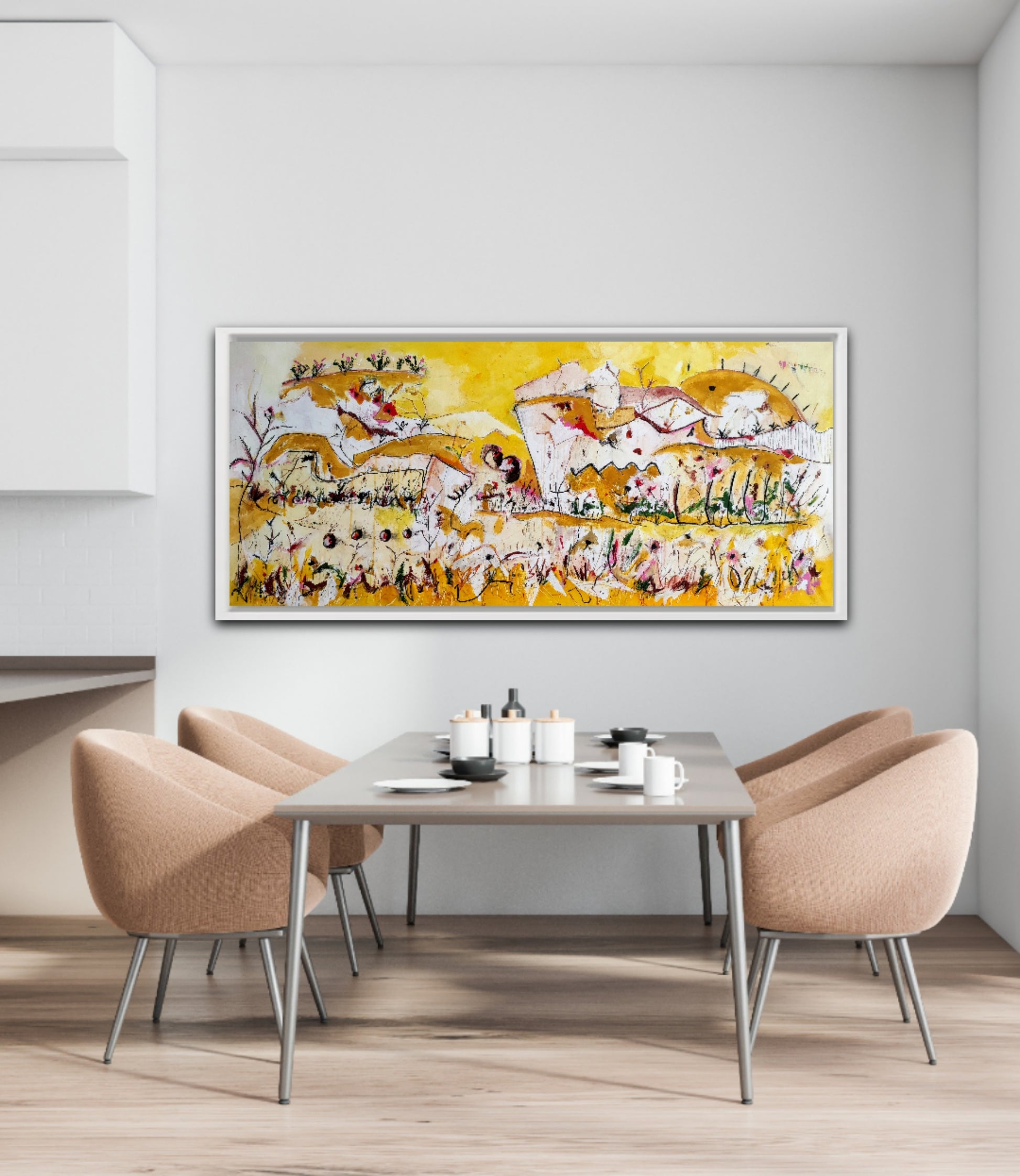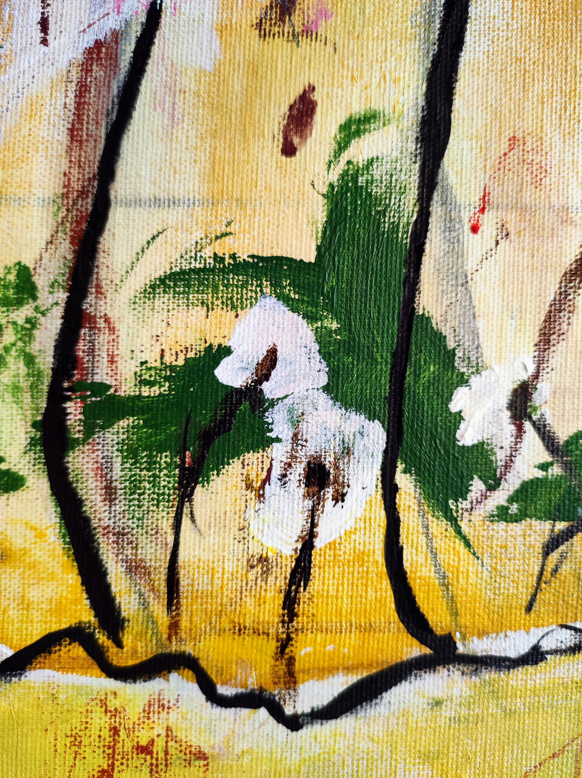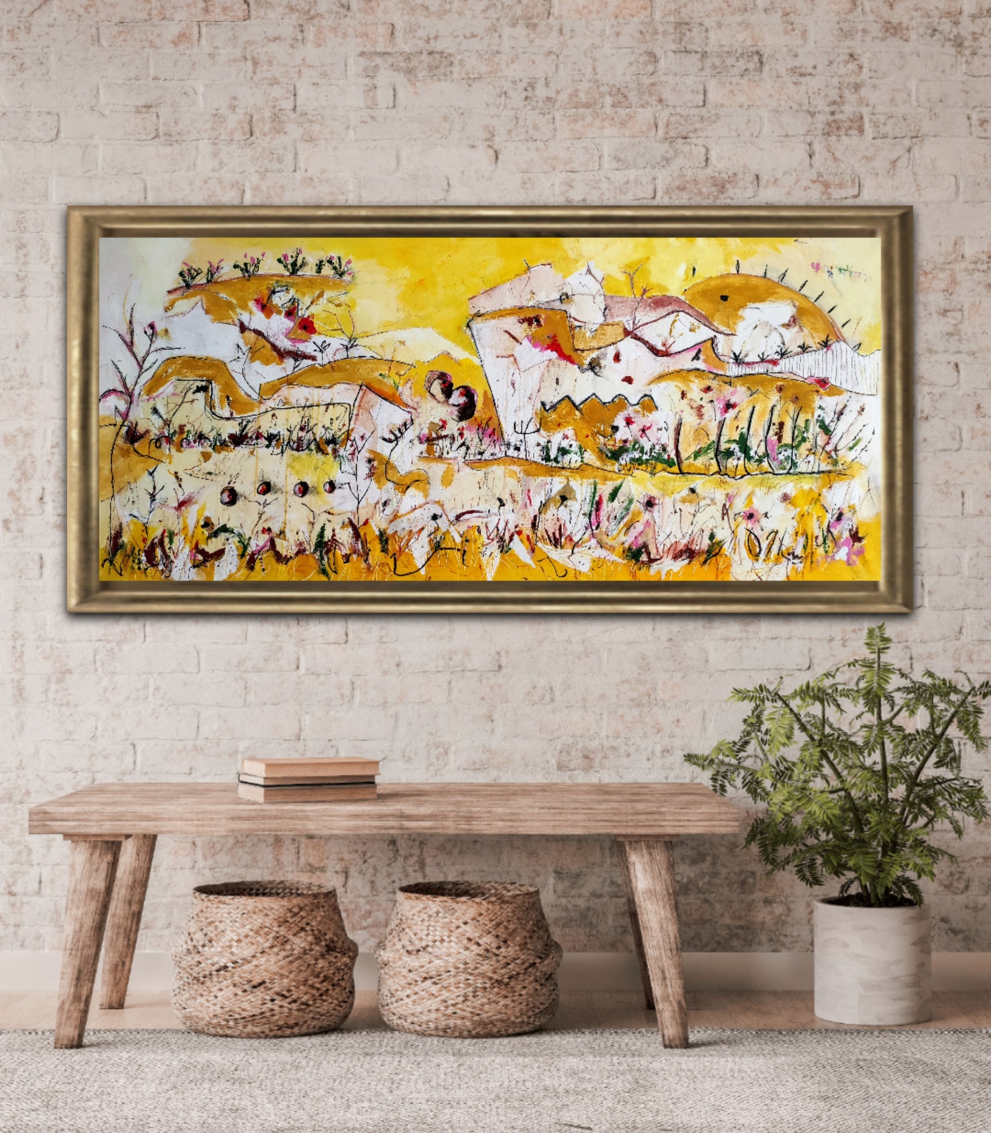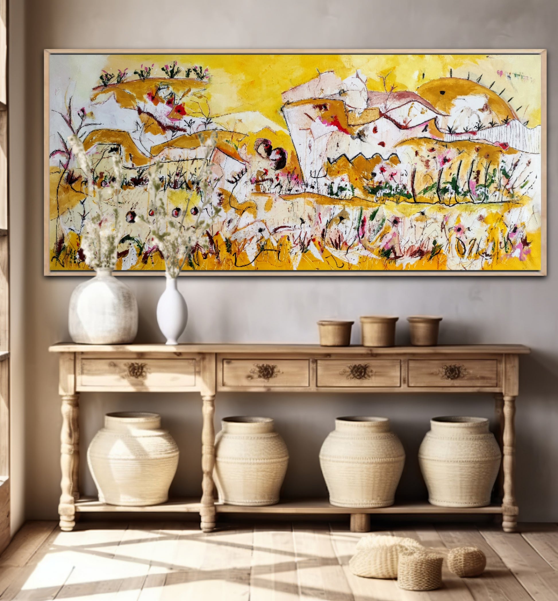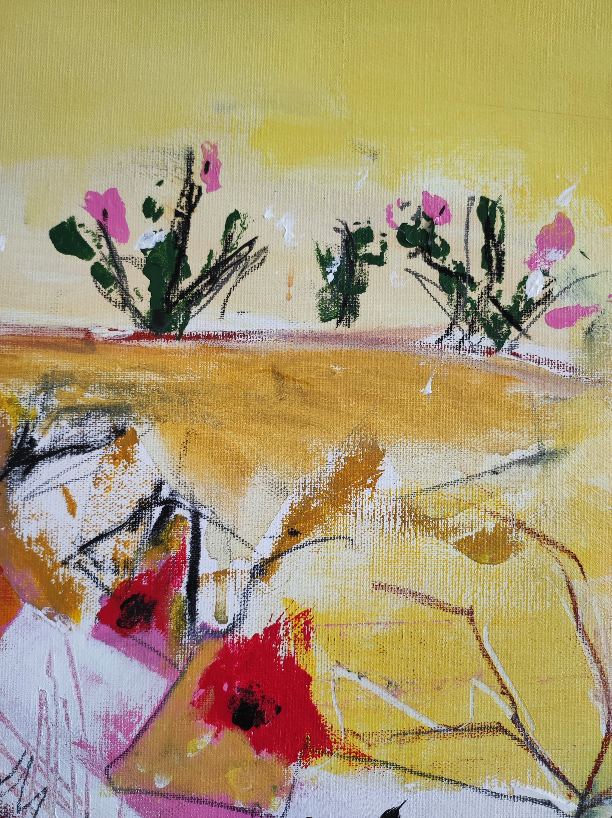 Pintura gestual, intuitiva, que deja que las cosas pasen y se apoya sobre lo que aparece. Aprovechando el accidente y aceptando las consecuencias.