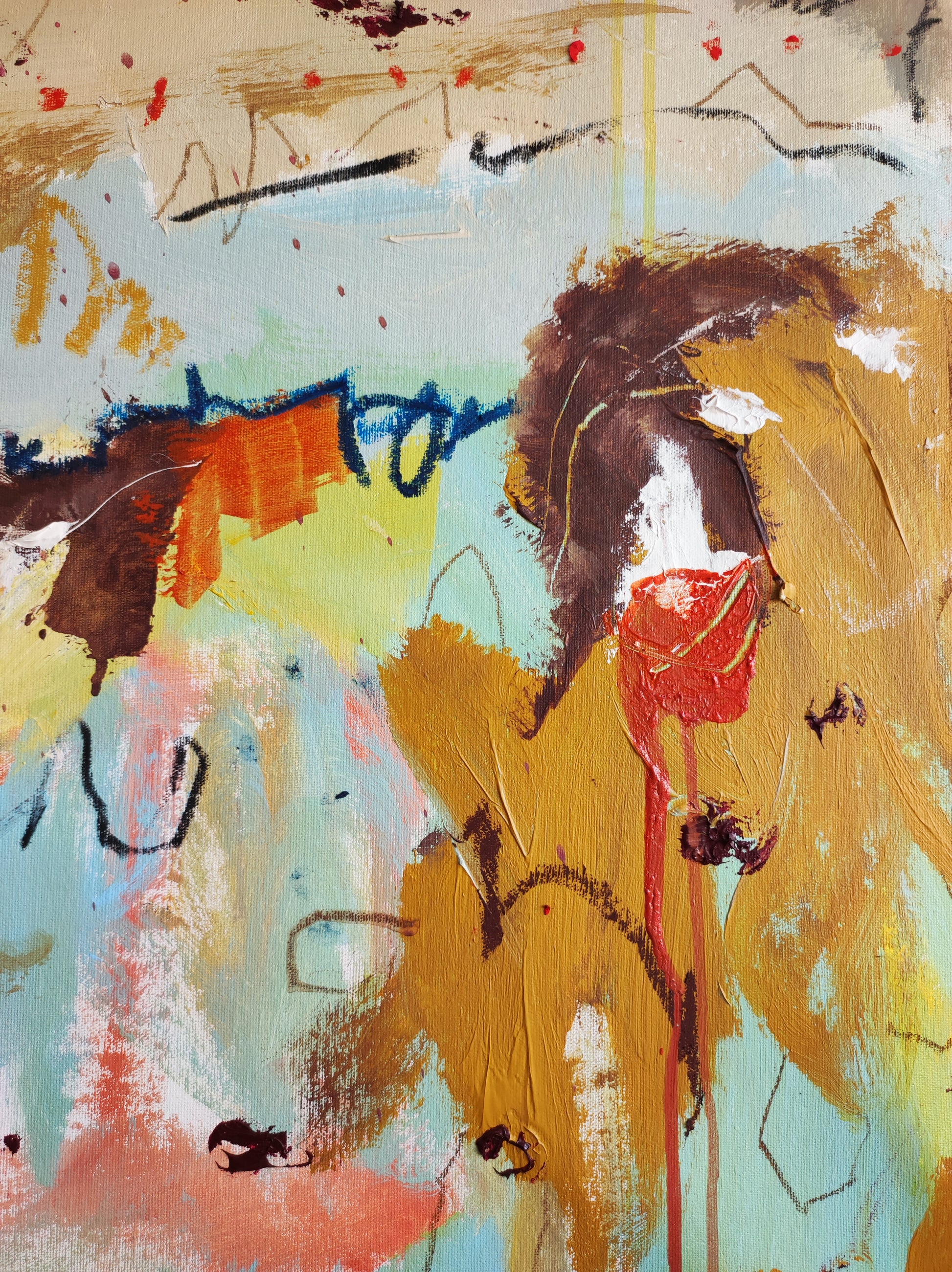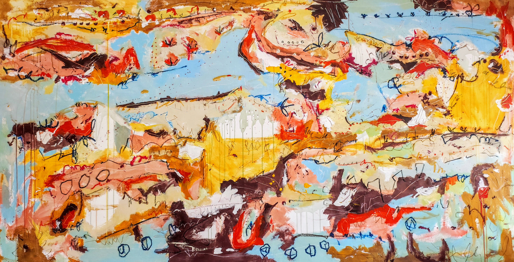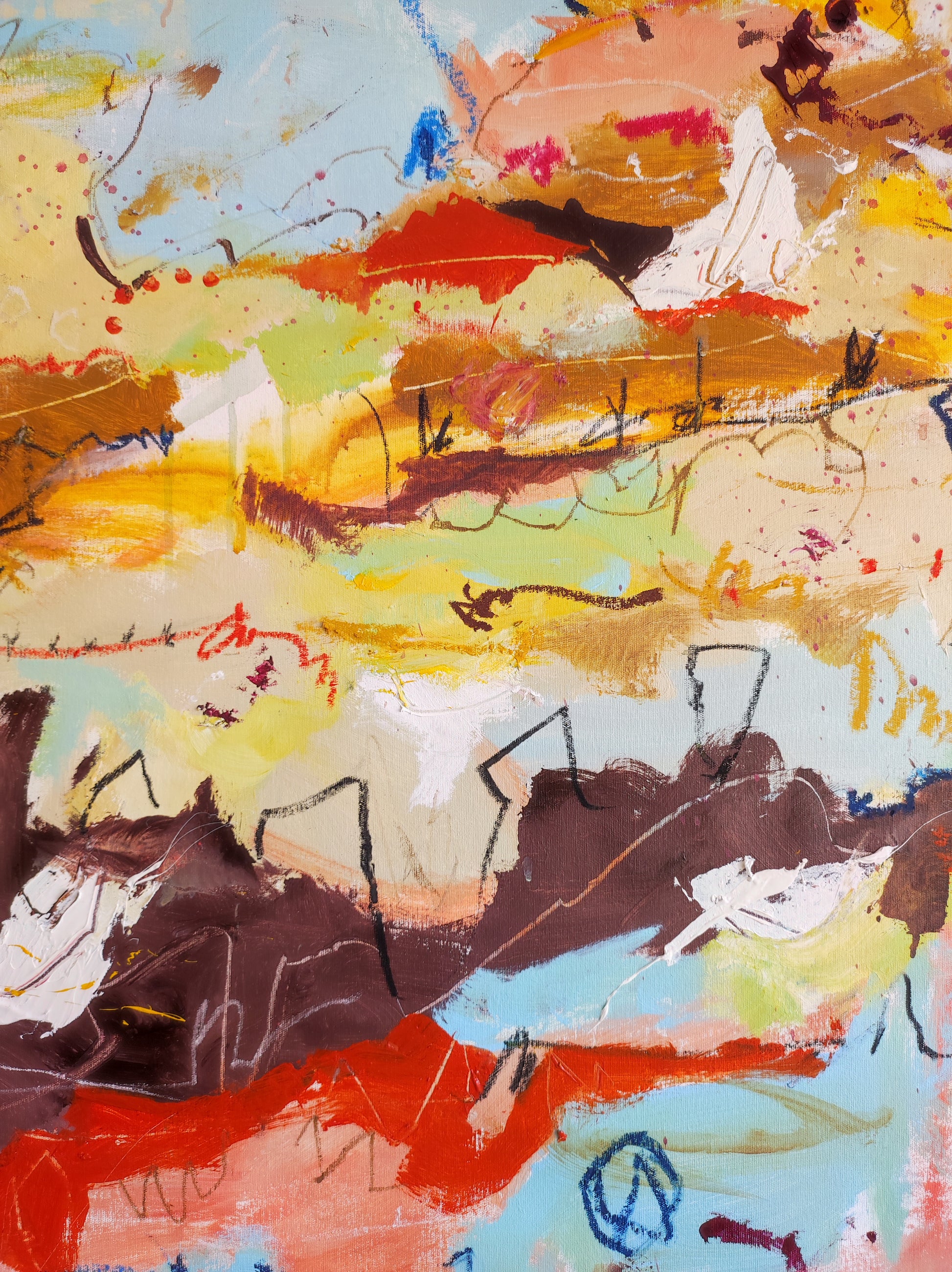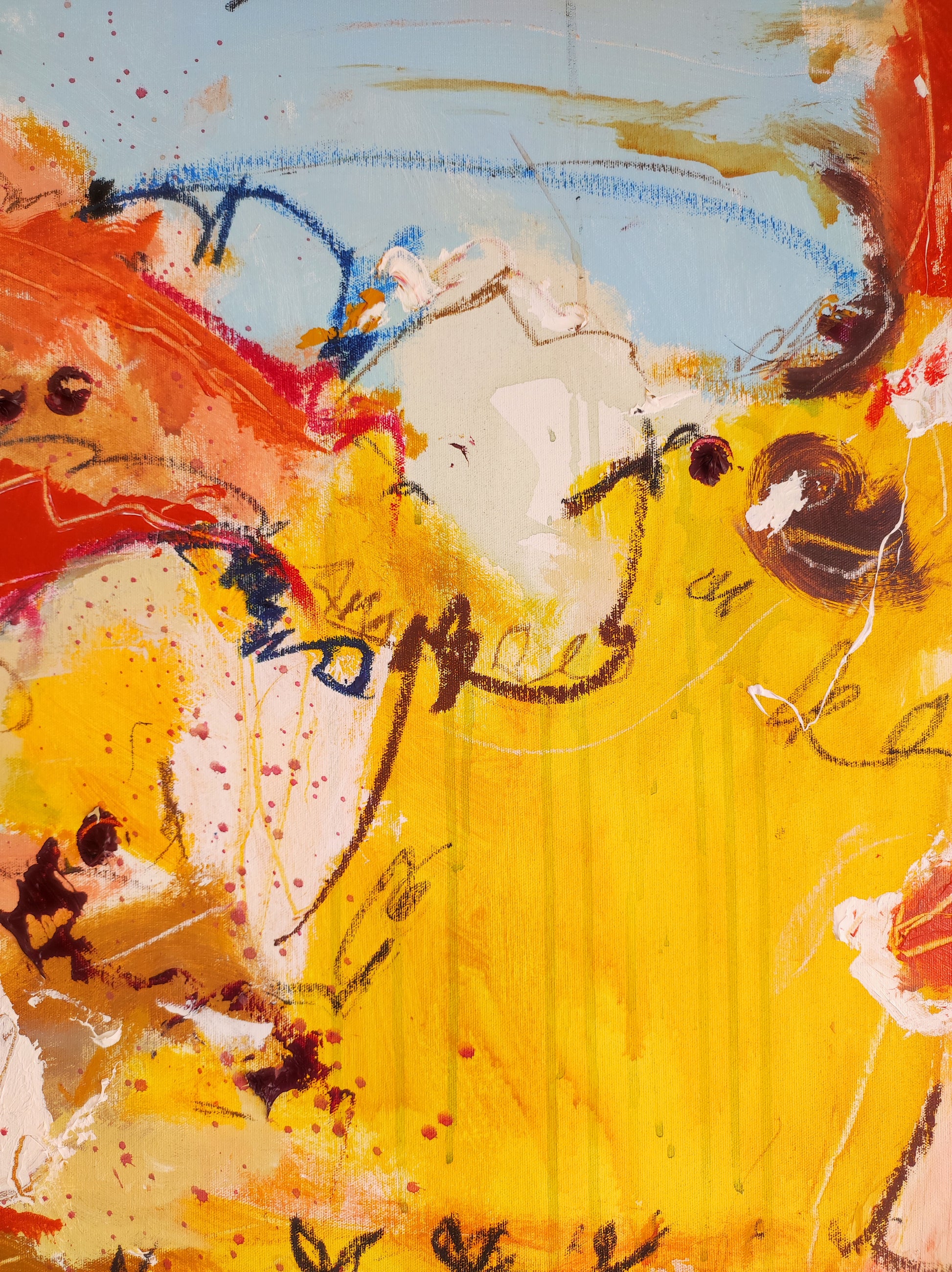 Pintura gestual e intuitiva, que deja que pasen cosas no previstas, acepta el accidente y lo aprovecha.