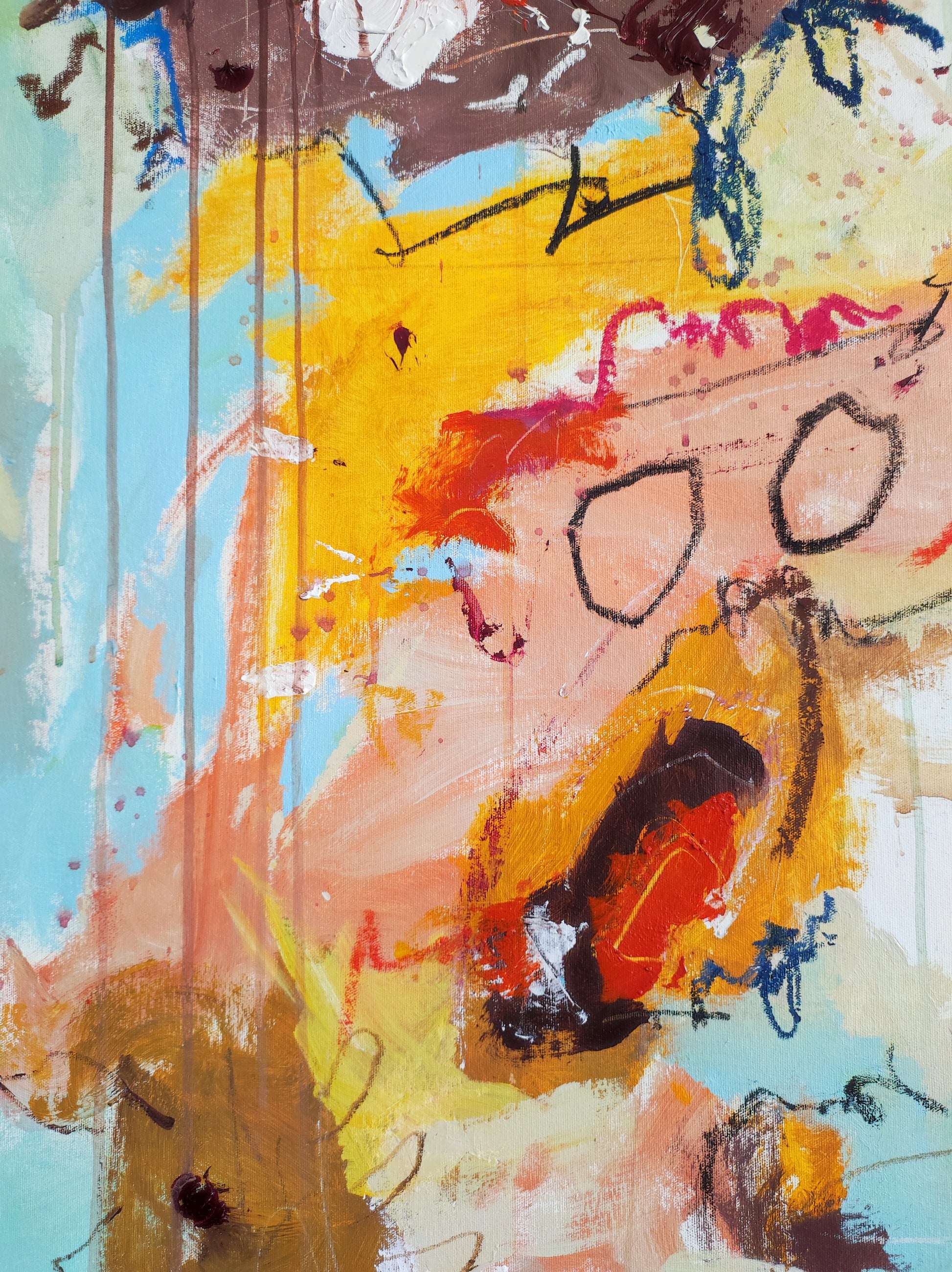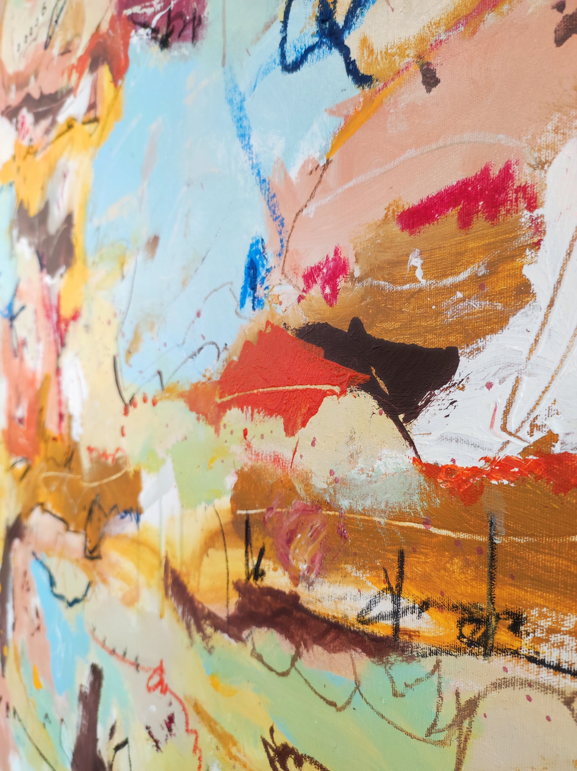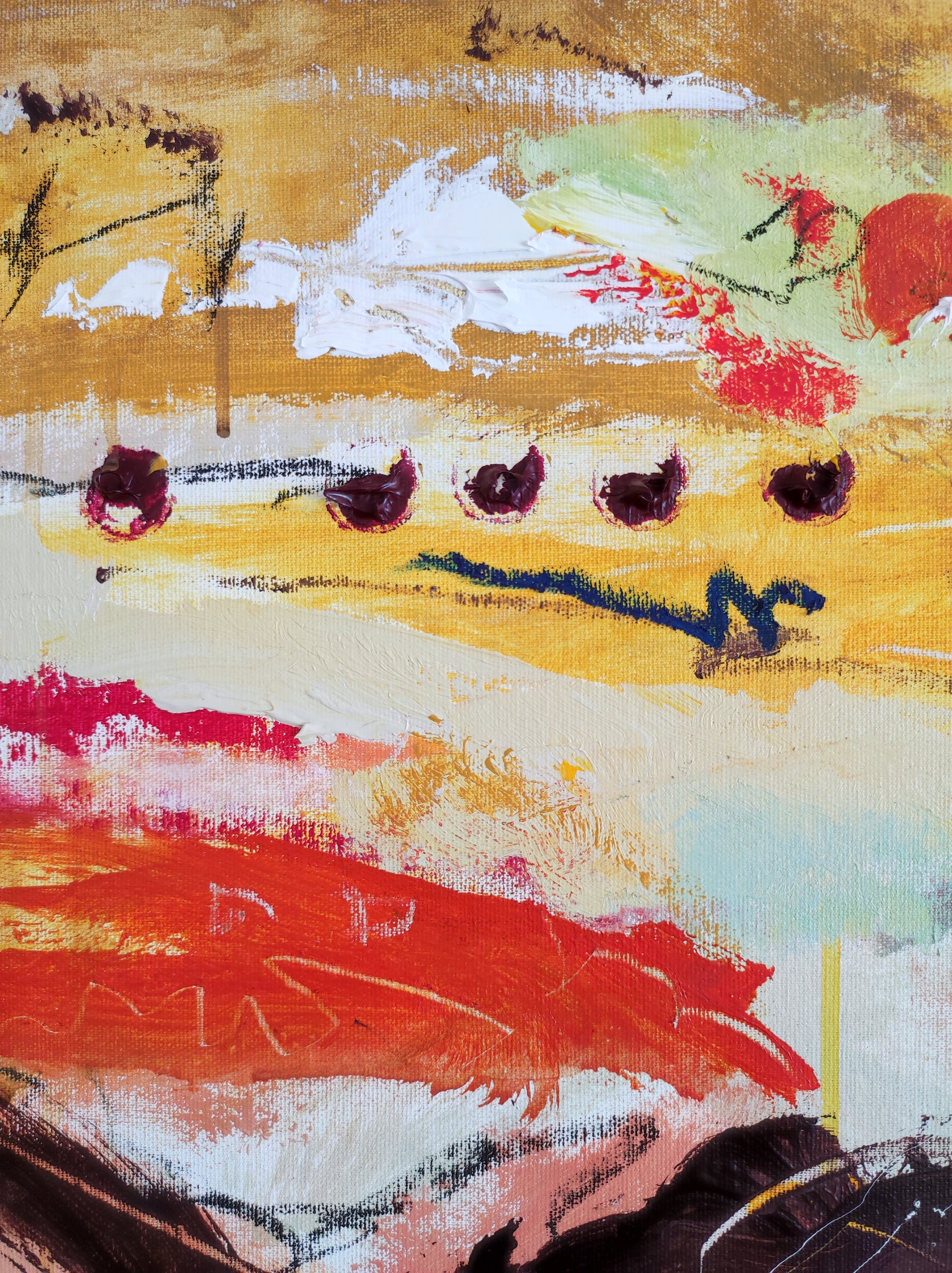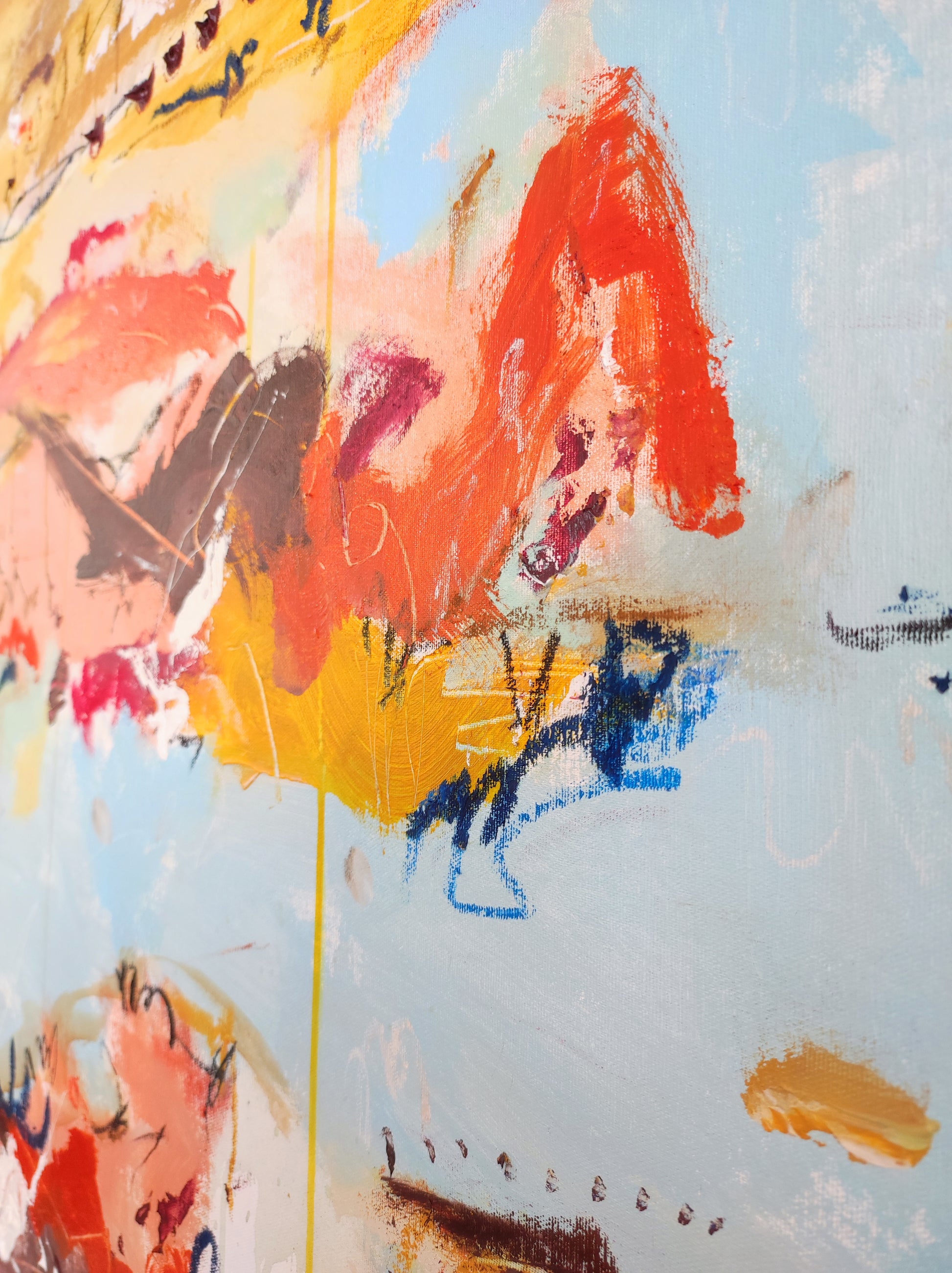 Pintura gestual e intuitiva, que deja que pasen cosas no previstas, acepta el accidente y lo aprovecha.