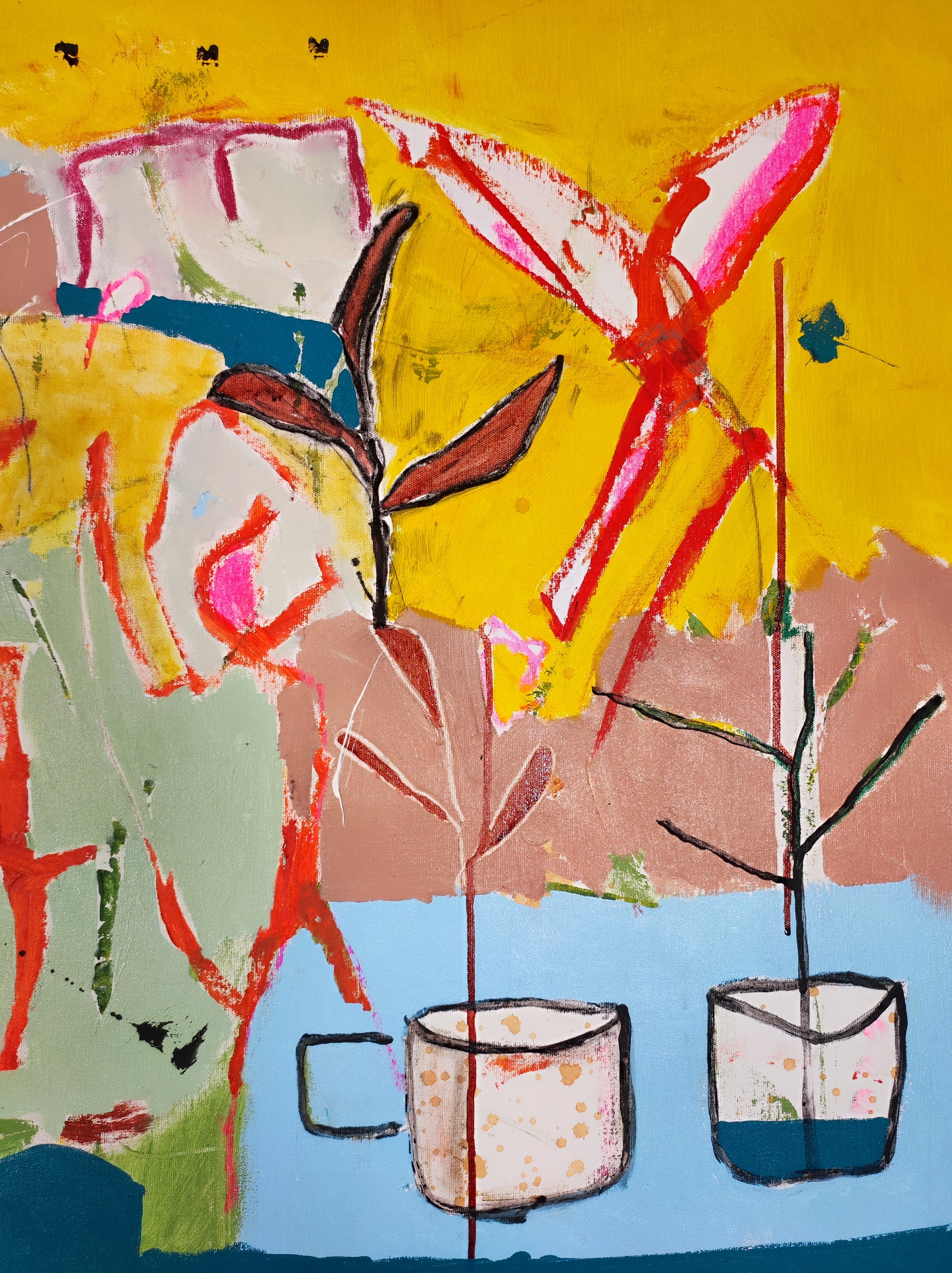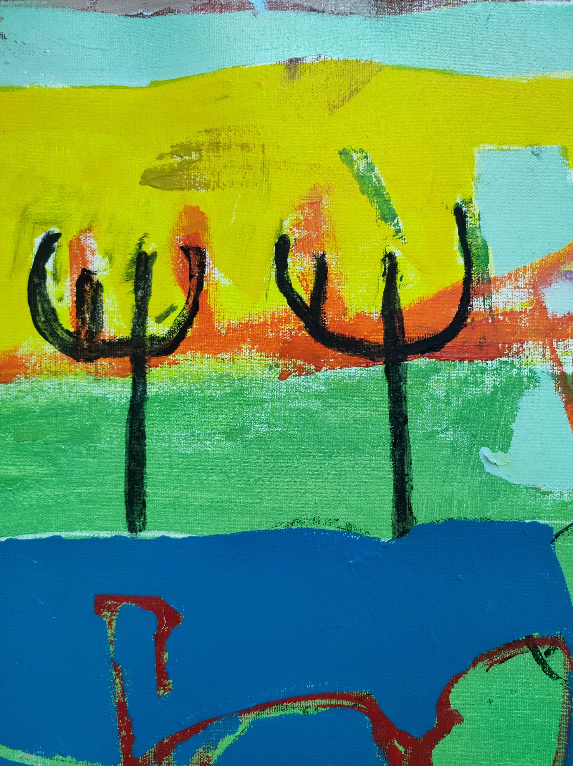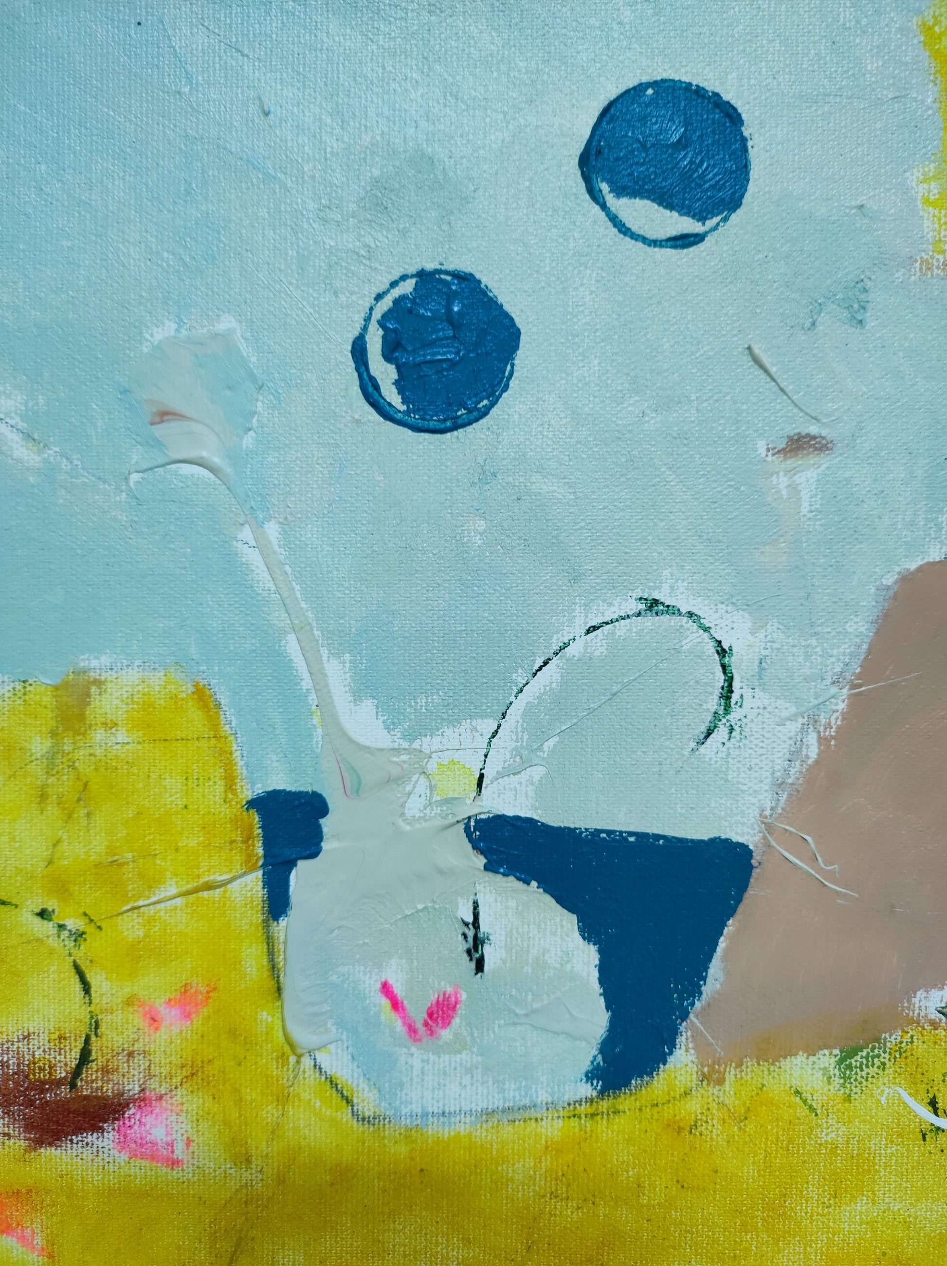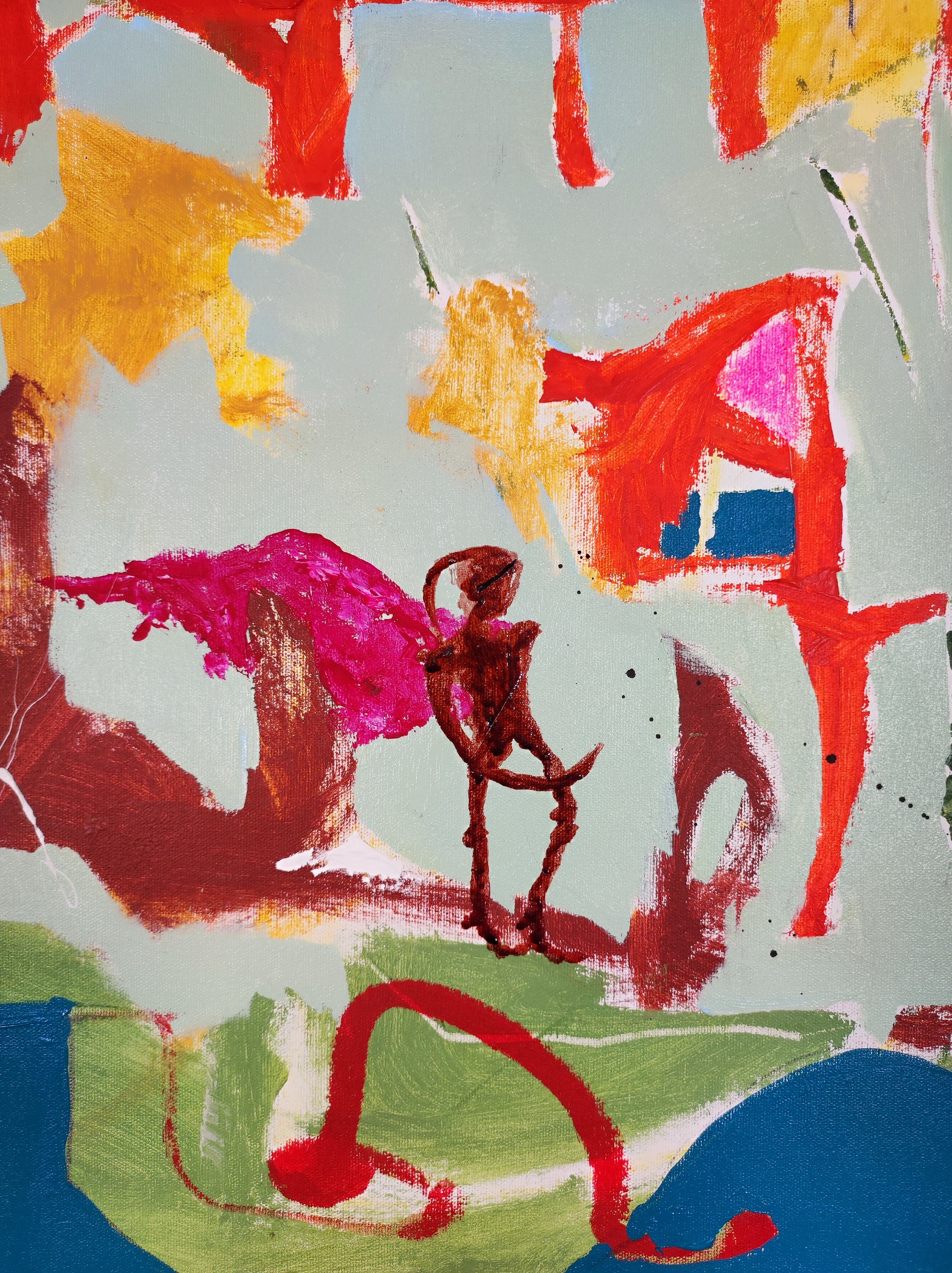 Pintura gestual, intuitiva, que deja que las cosas pasen y se apoya sobre lo que aparece. Aprovechando el accidente y aceptando las consecuencias.