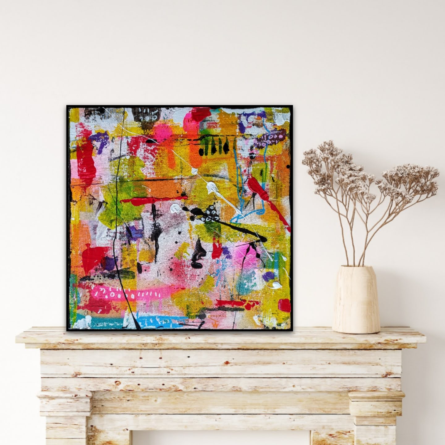 Obra perteneciente a la serie "Vivo". 4 obras creadas con múltiples capas, sobre una base de colores ocres, rosas y rojos. Marcas, driping y simbología variada dan forma a composiciones cálidas y contundentes.