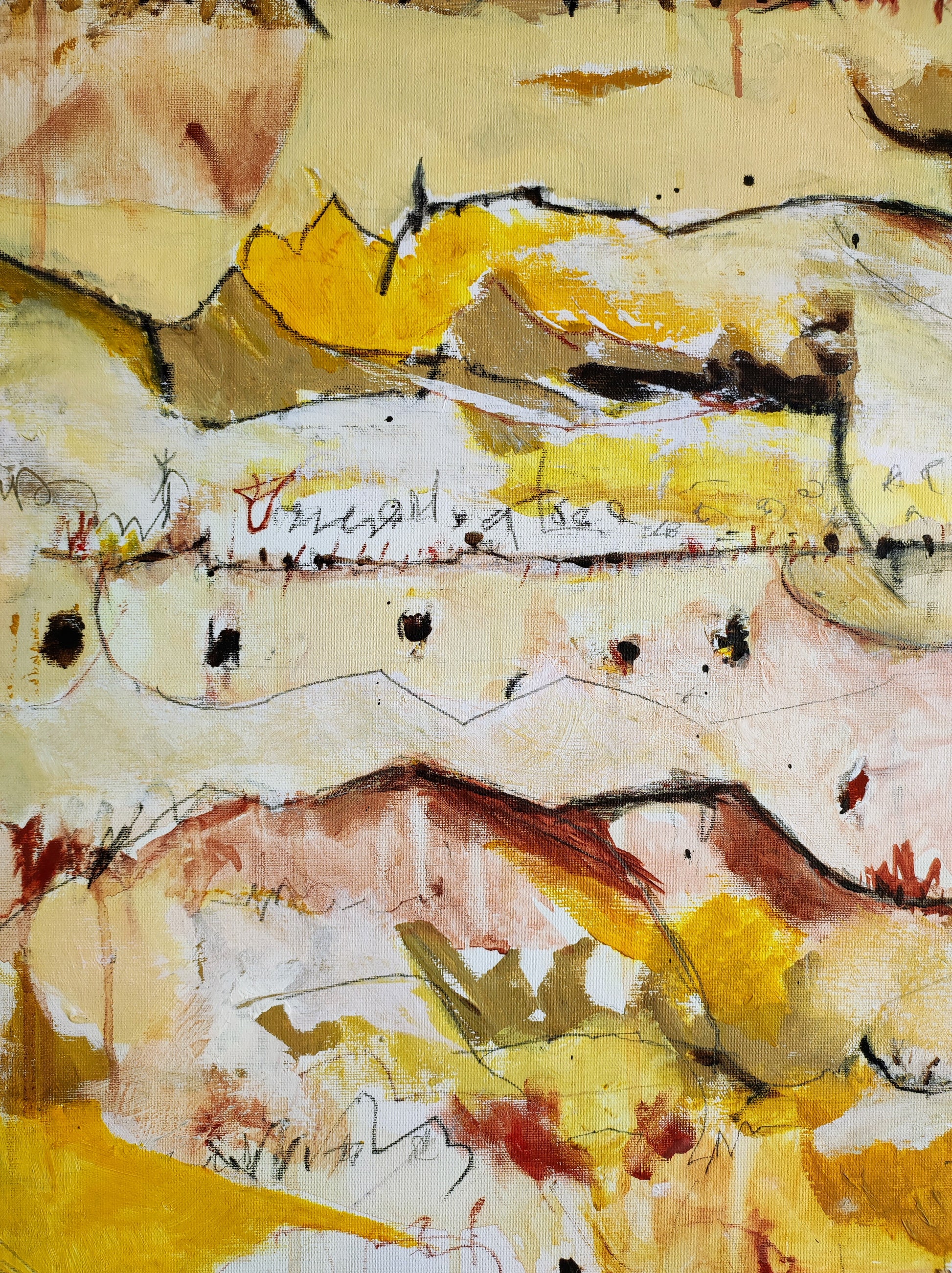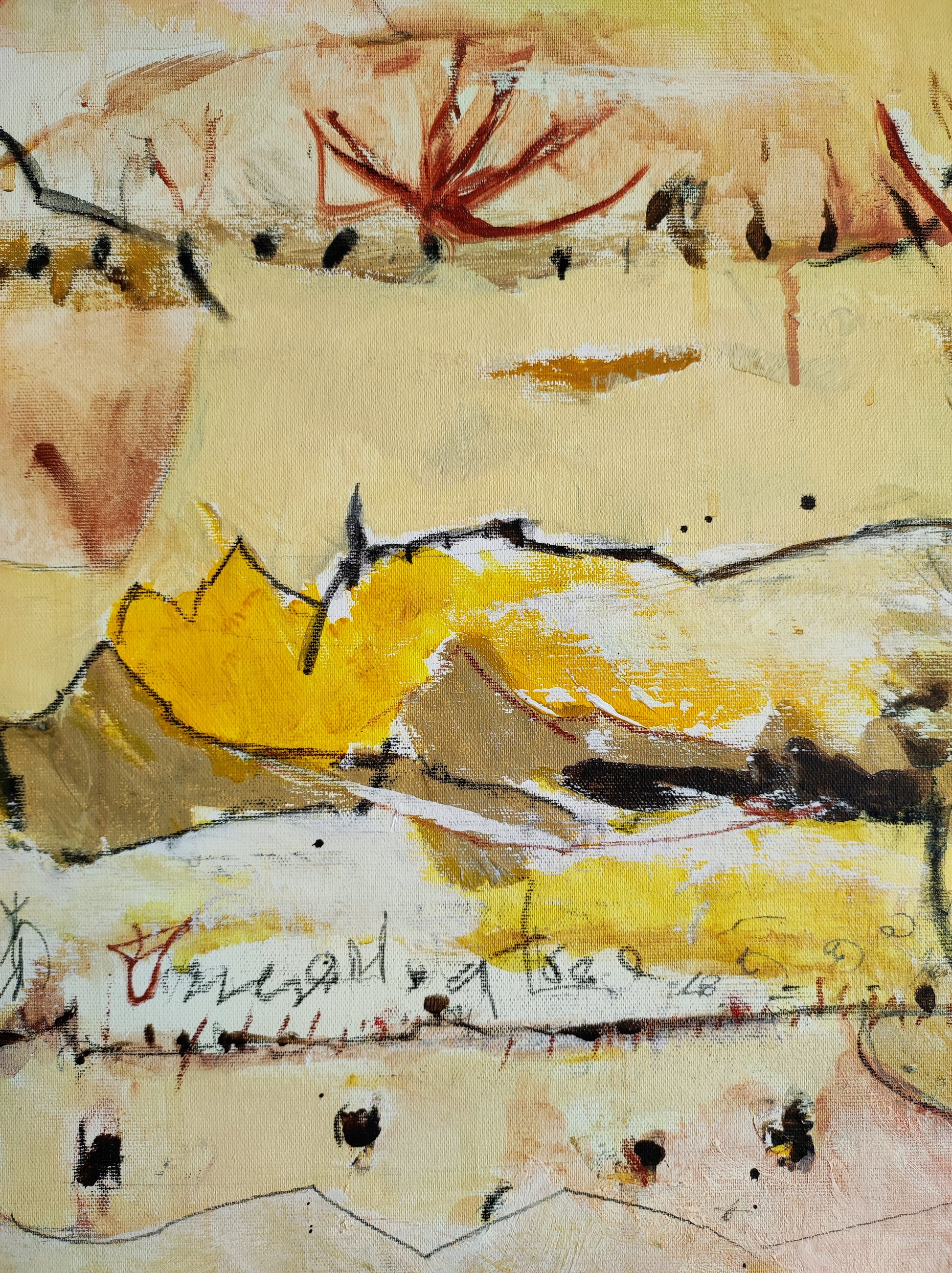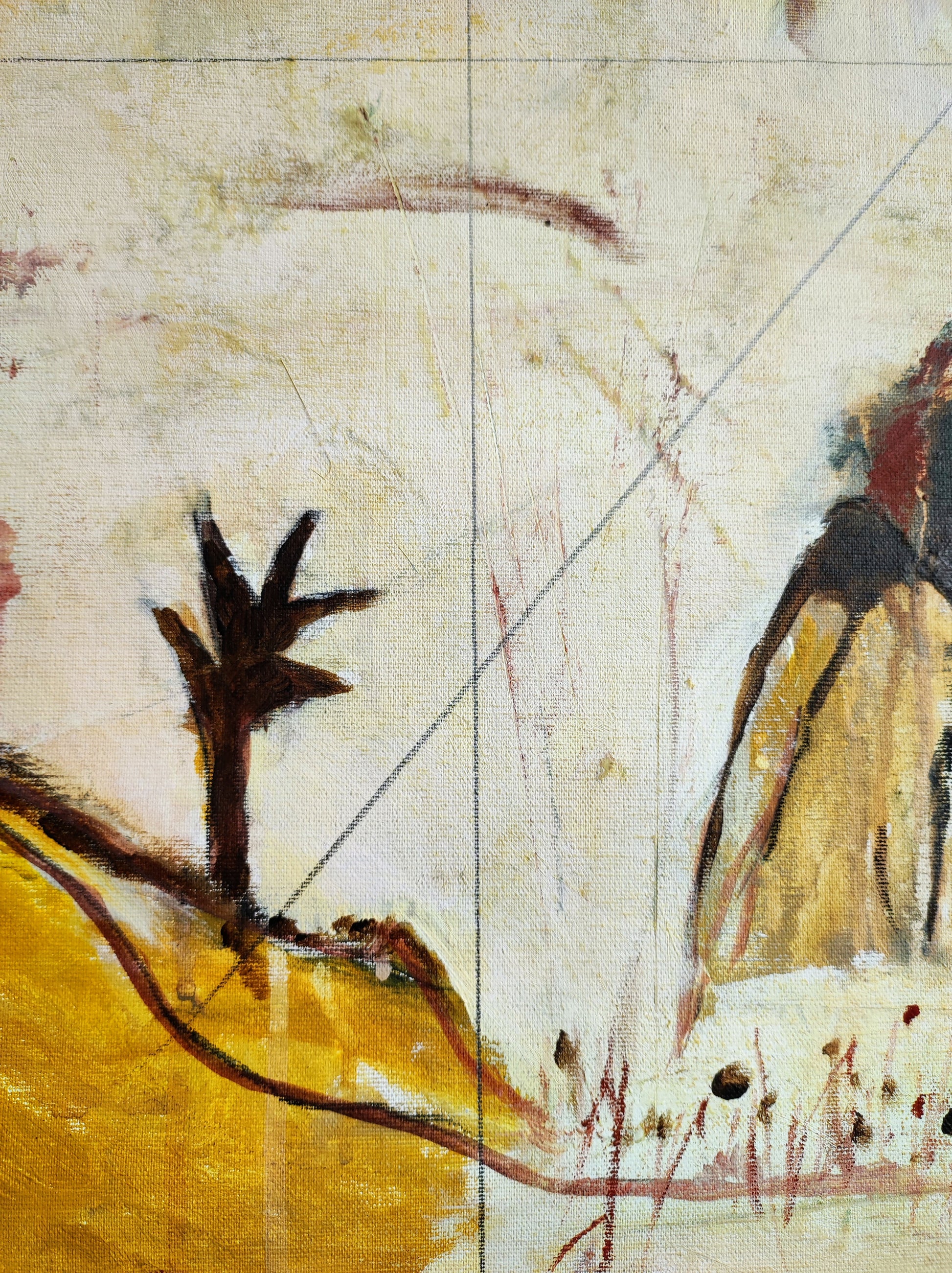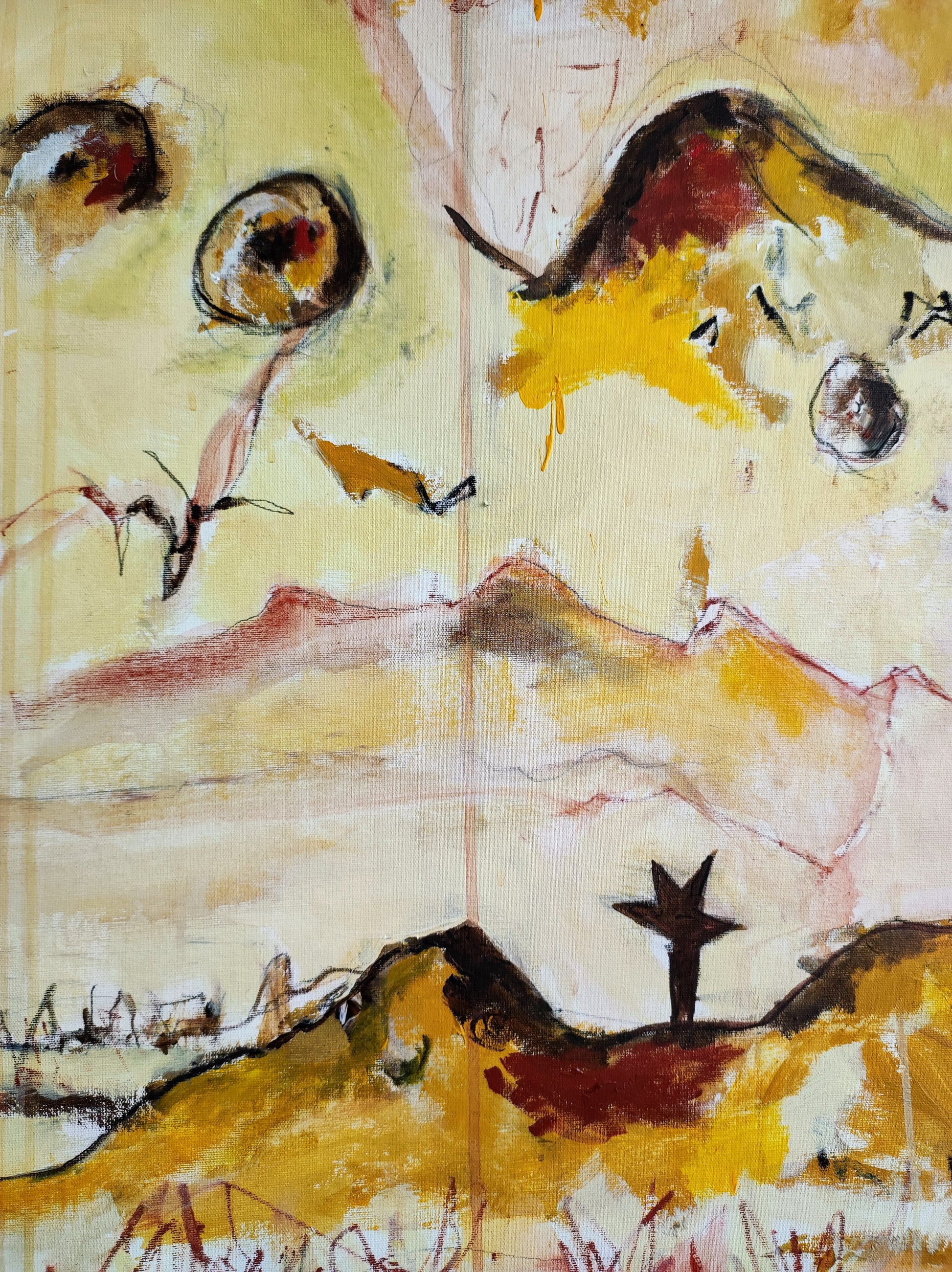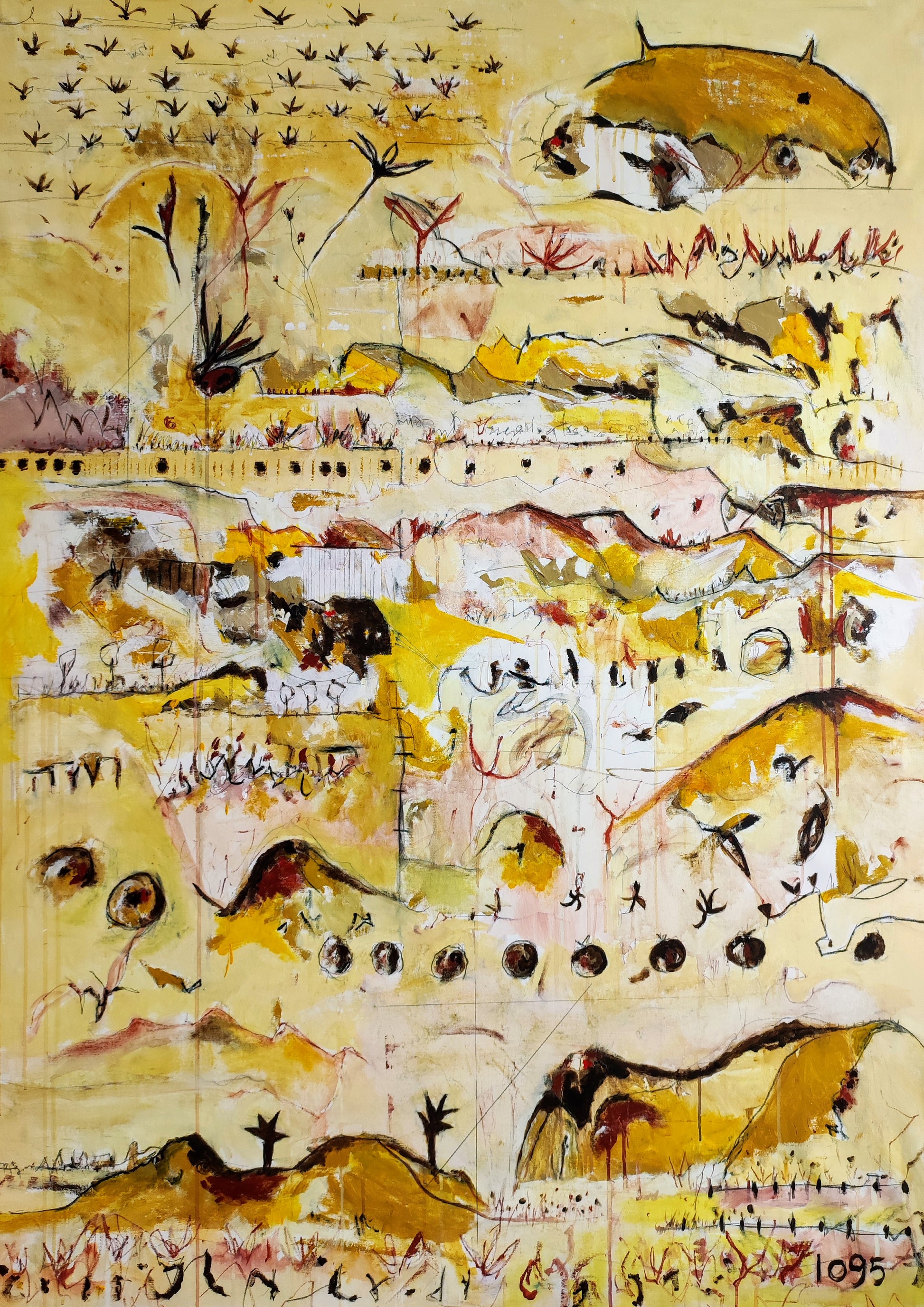Abstracción hecha con fragmentos de paisajes a modo de estratos. Montañas, semillas, frutos, plantas, seres, símbolos... Todo fuera de sitio, aleatorio, con la mirada perdida...