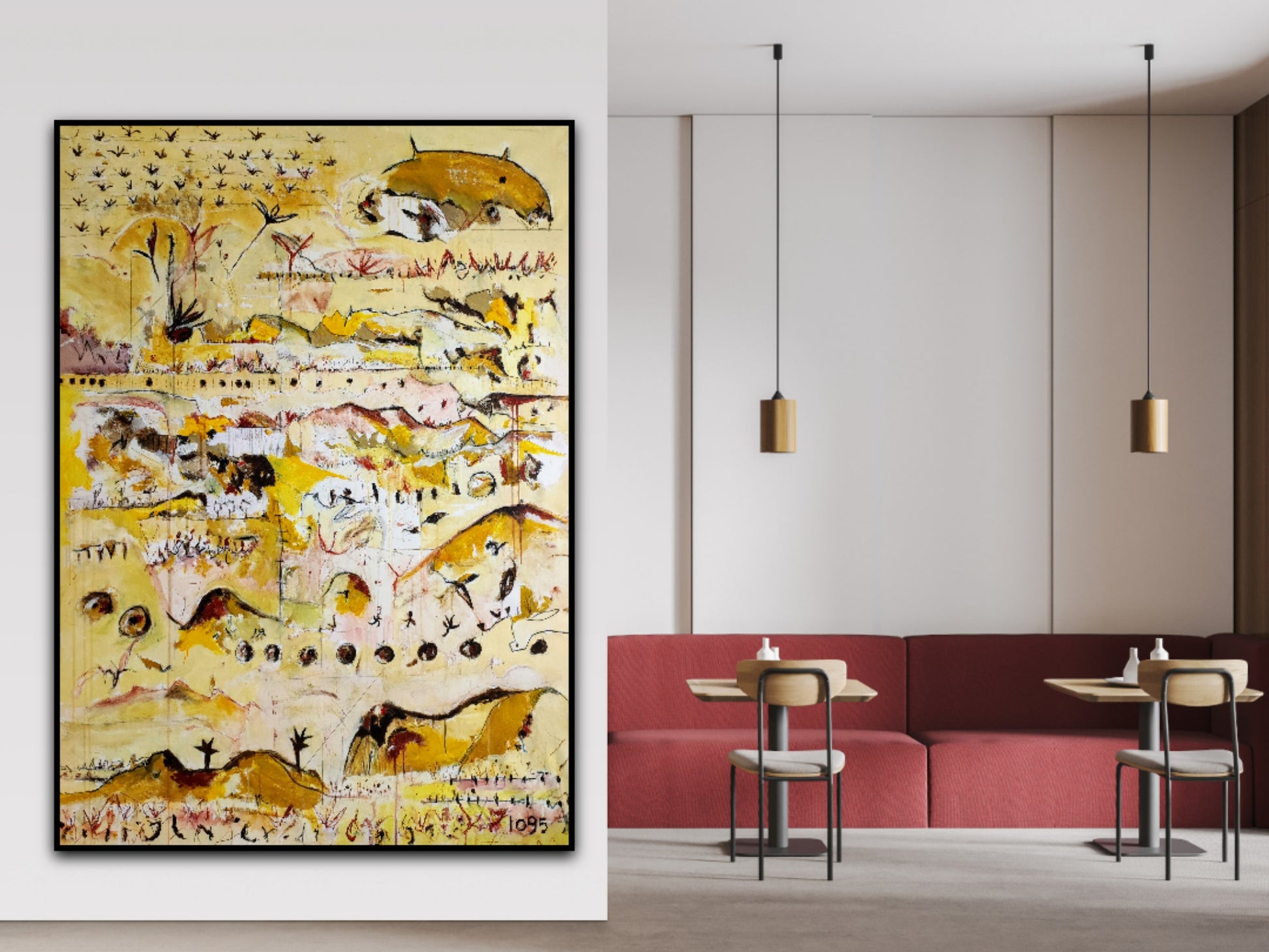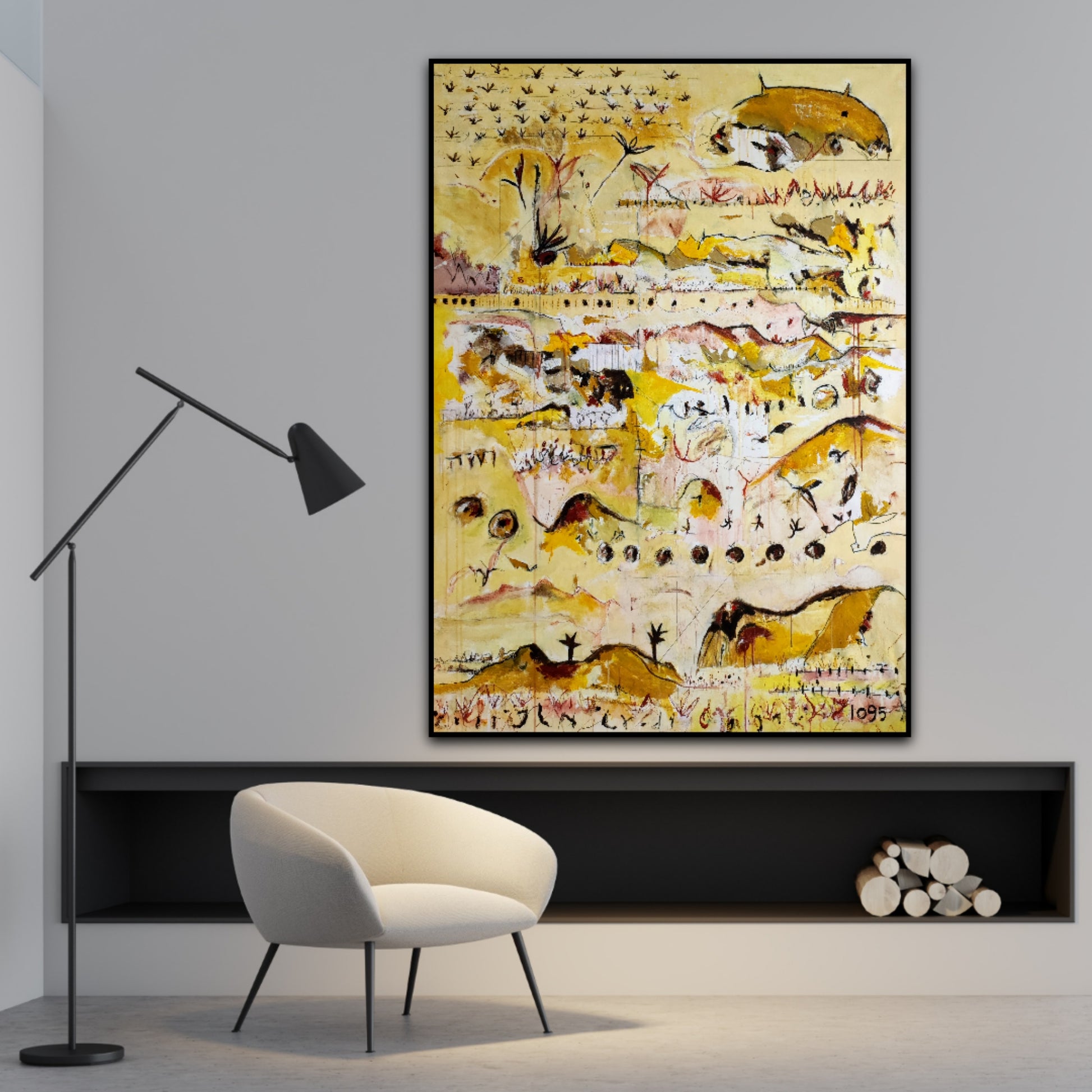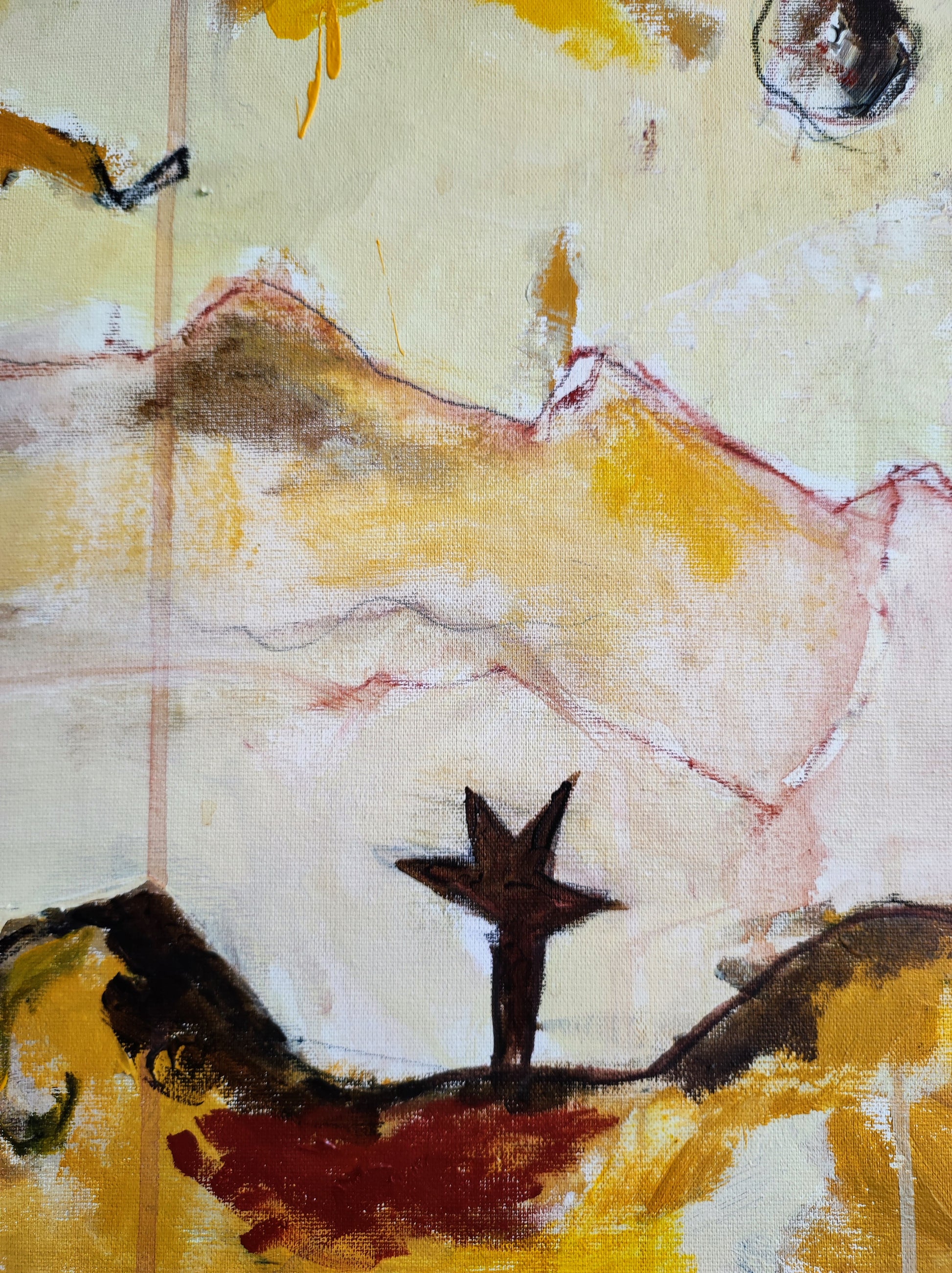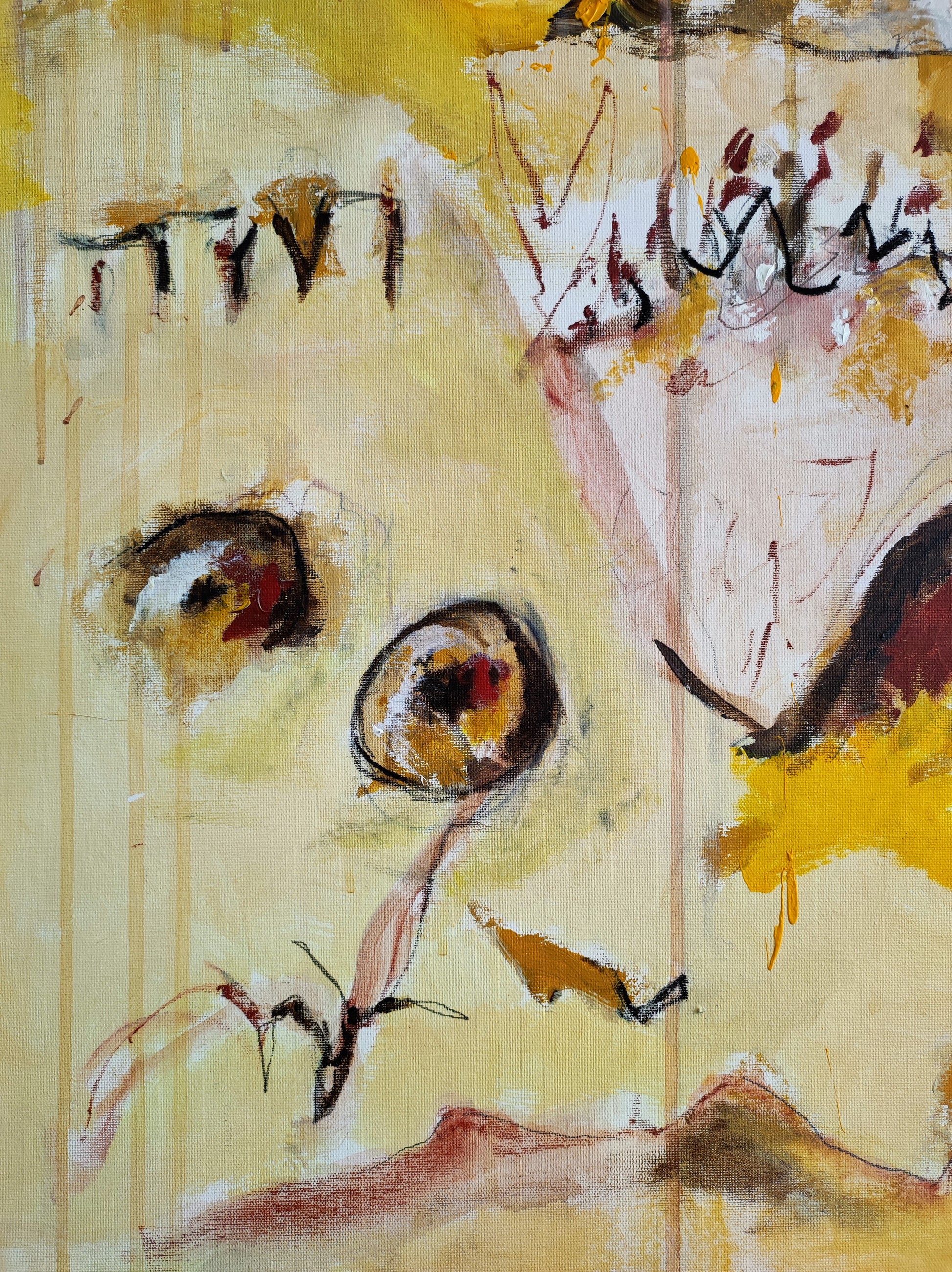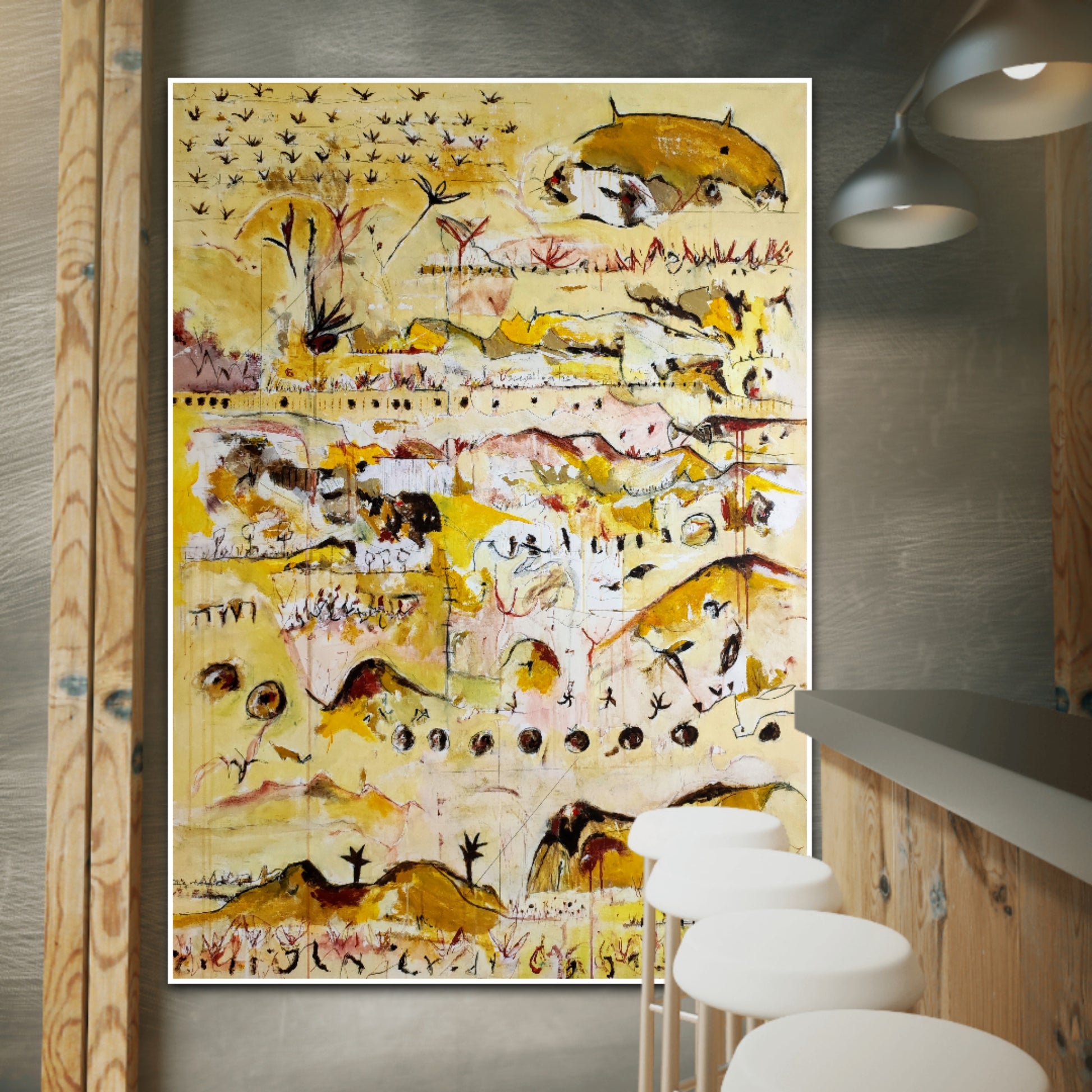 Abstracción hecha con fragmentos de paisajes a modo de estratos. Montañas, semillas, frutos, plantas, seres, símbolos... Todo fuera de sitio, aleatorio, con la mirada perdida...