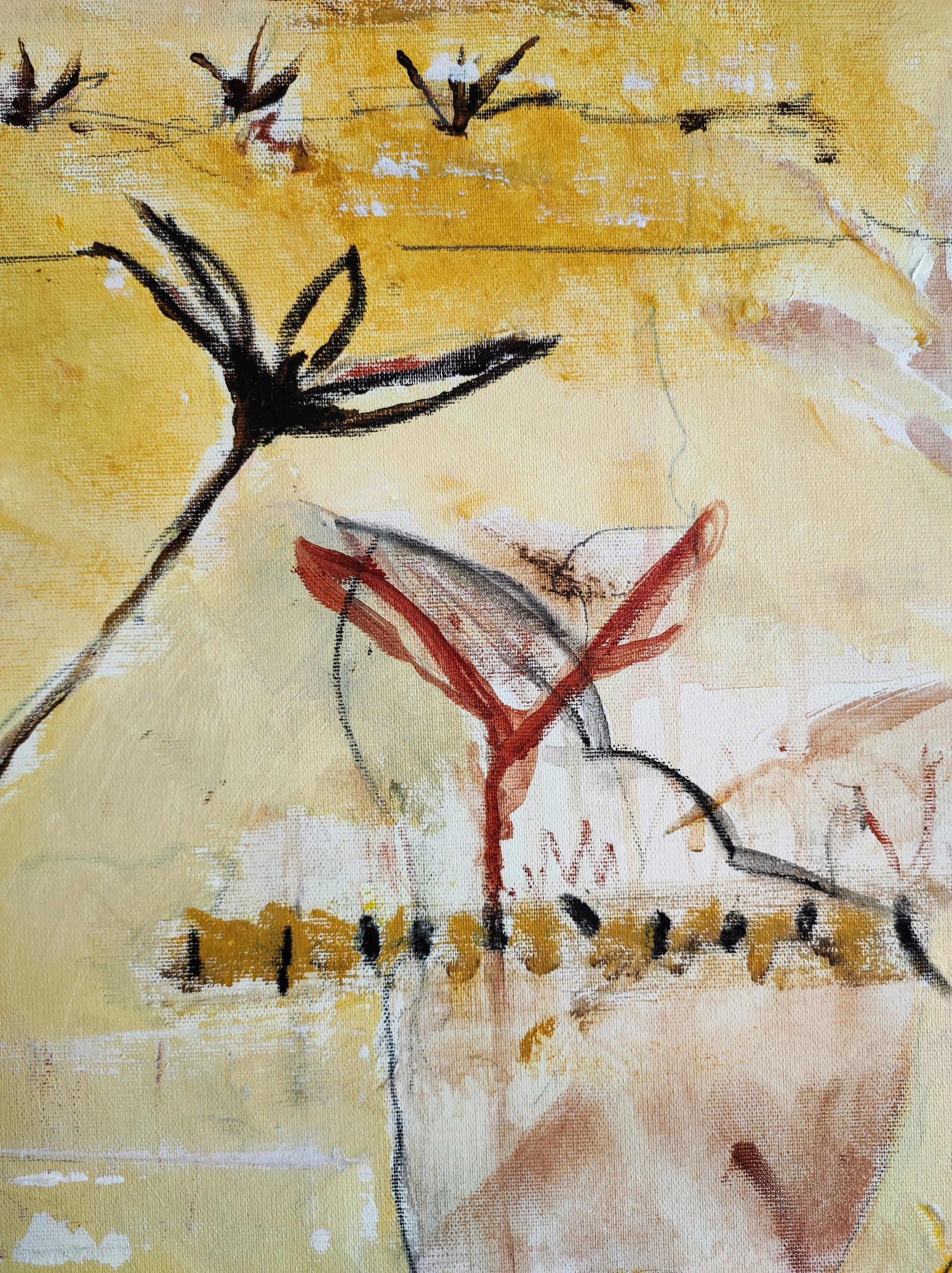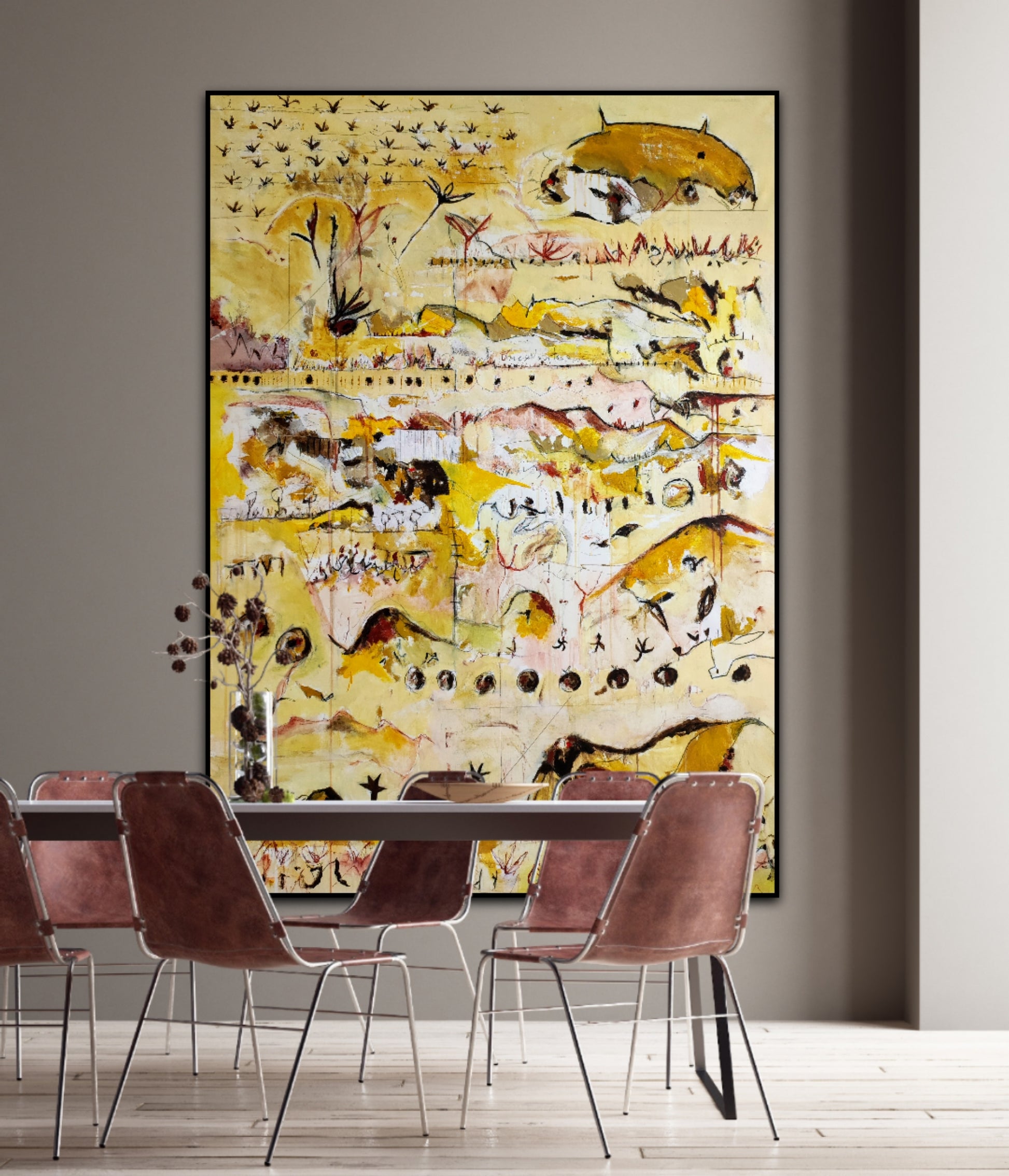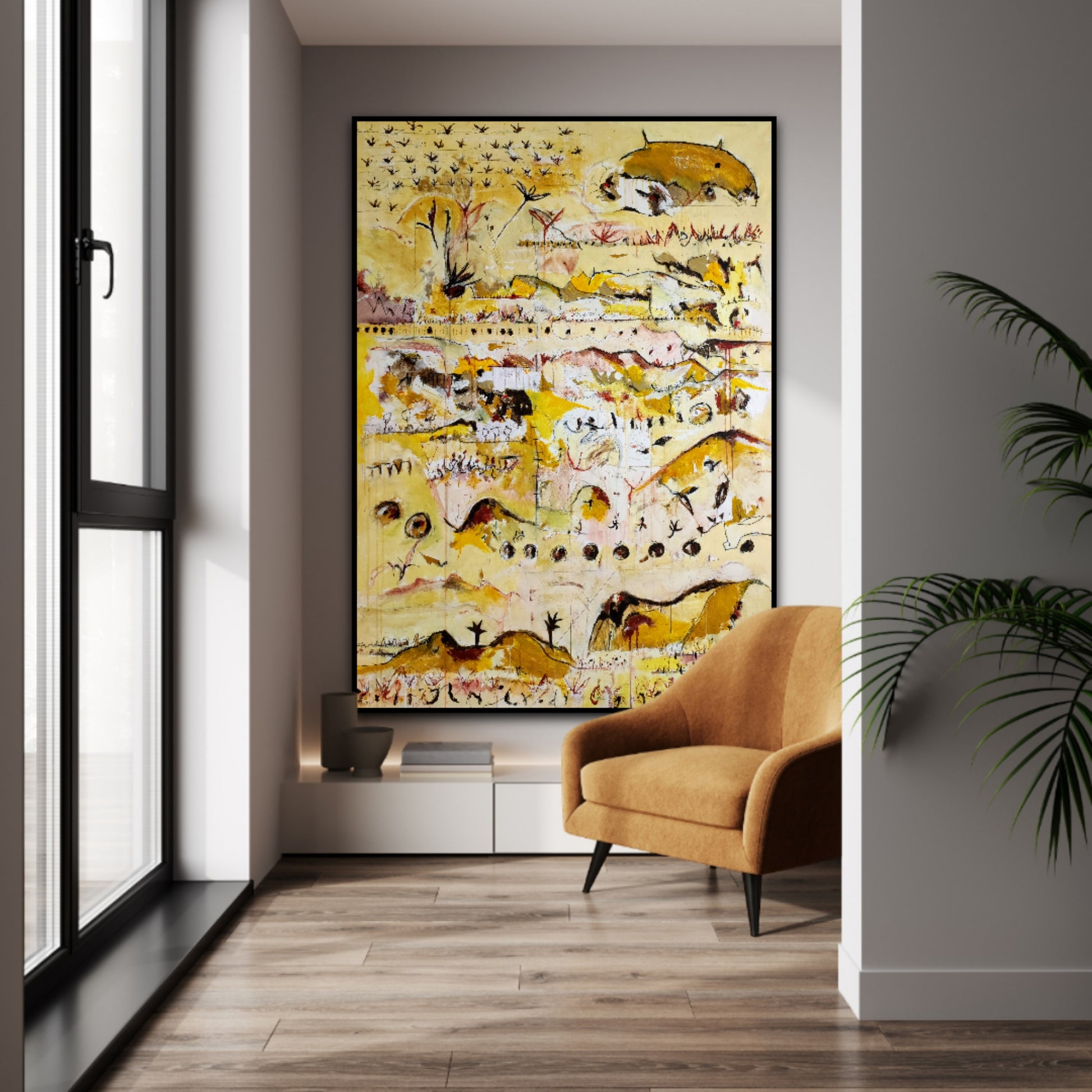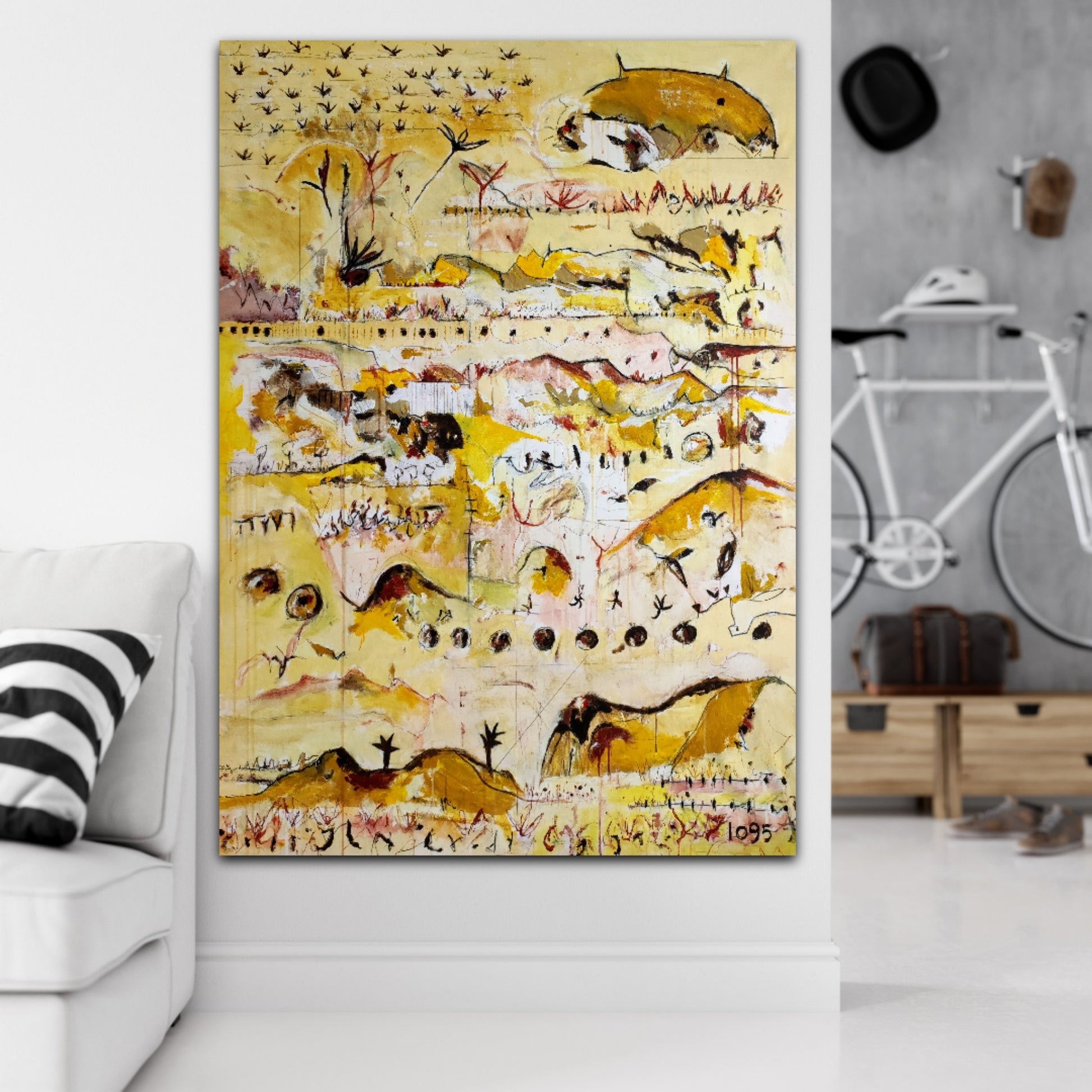 Abstracción hecha con fragmentos de paisajes a modo de estratos. Montañas, semillas, frutos, plantas, seres, símbolos... Todo fuera de sitio, aleatorio, con la mirada perdida...