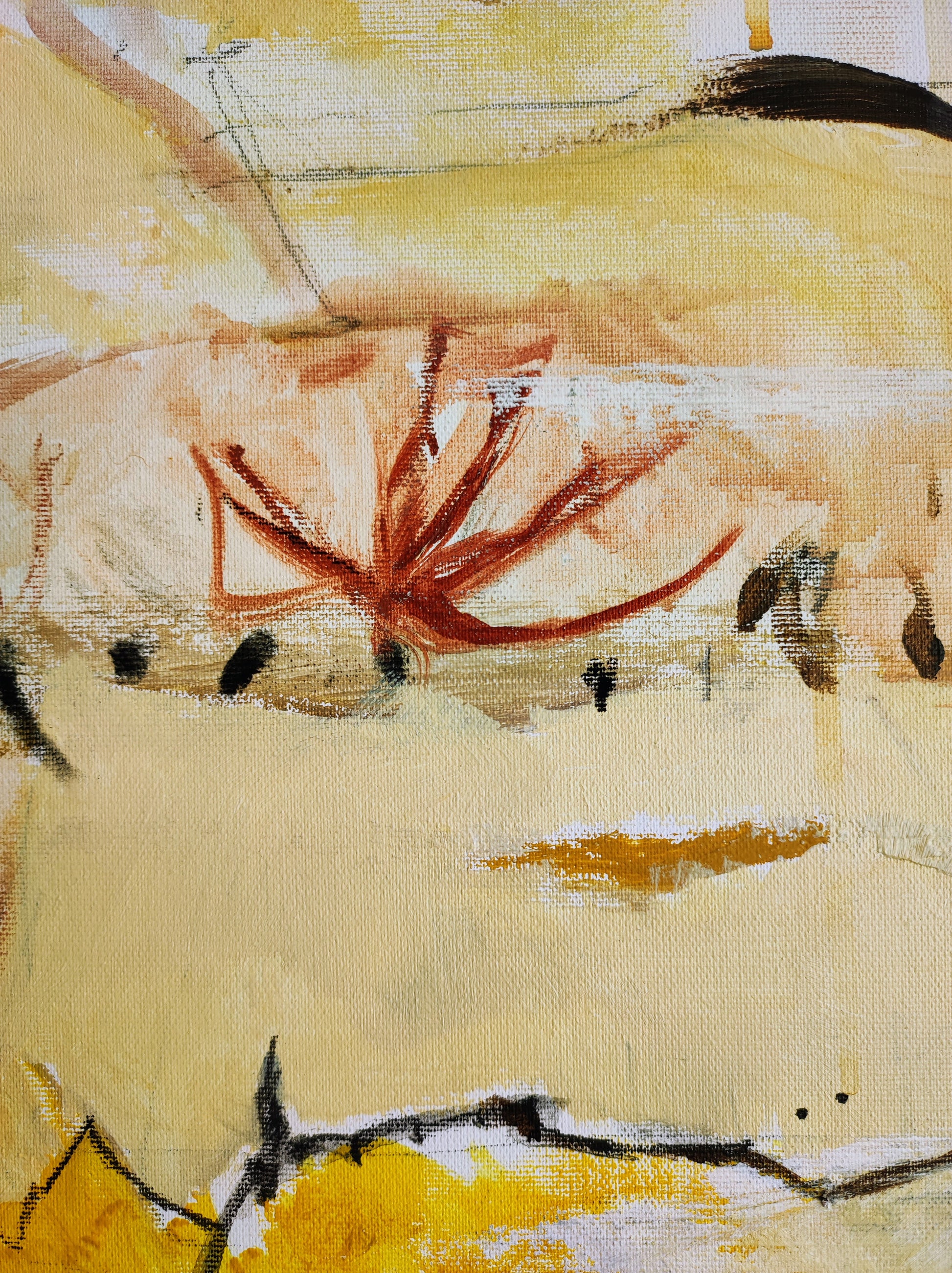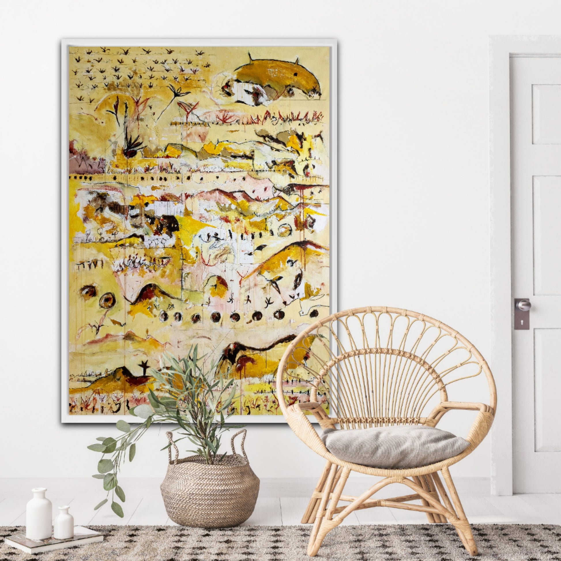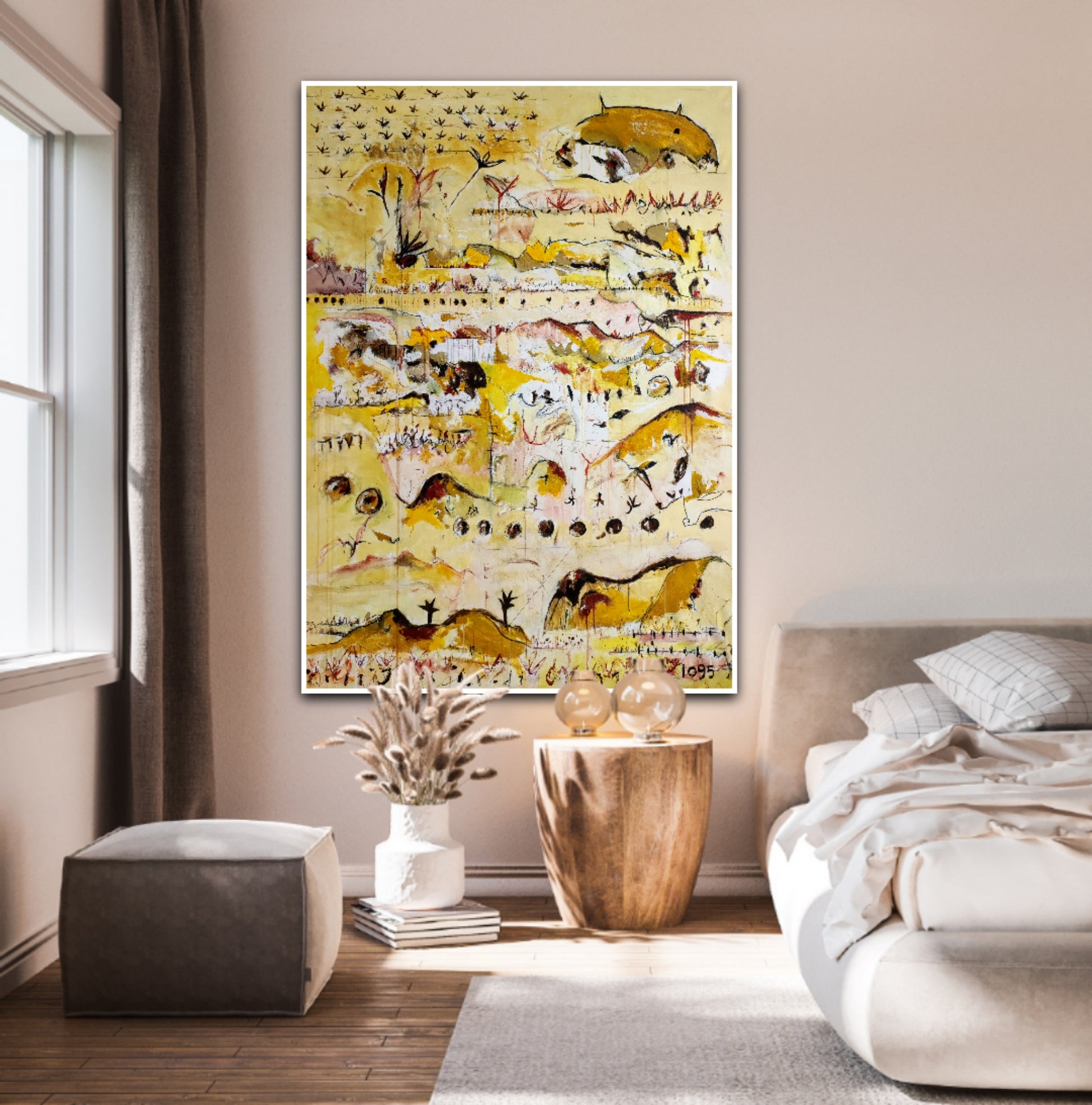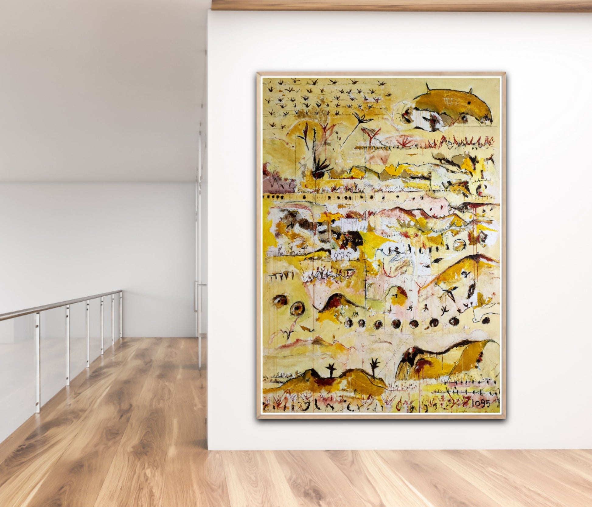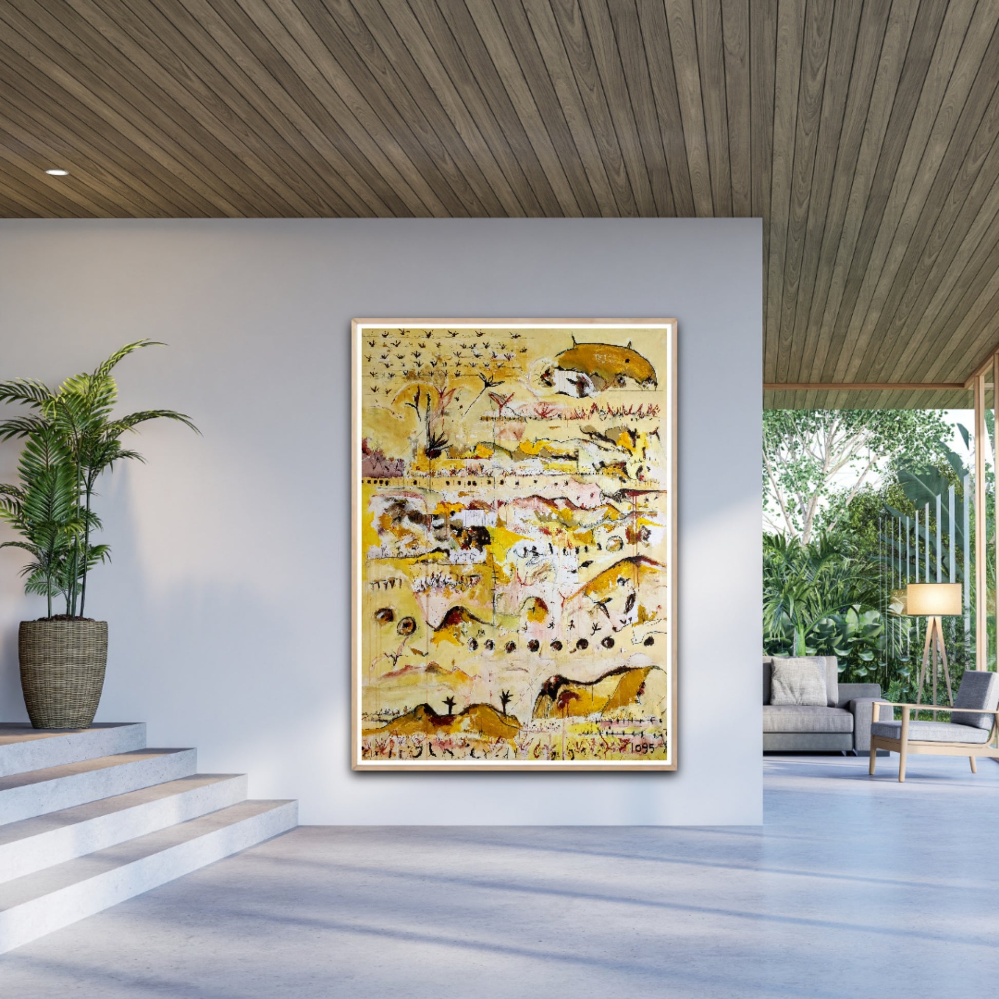 Abstracción hecha con fragmentos de paisajes a modo de estratos. Montañas, semillas, frutos, plantas, seres, símbolos... Todo fuera de sitio, aleatorio, con la mirada perdida...