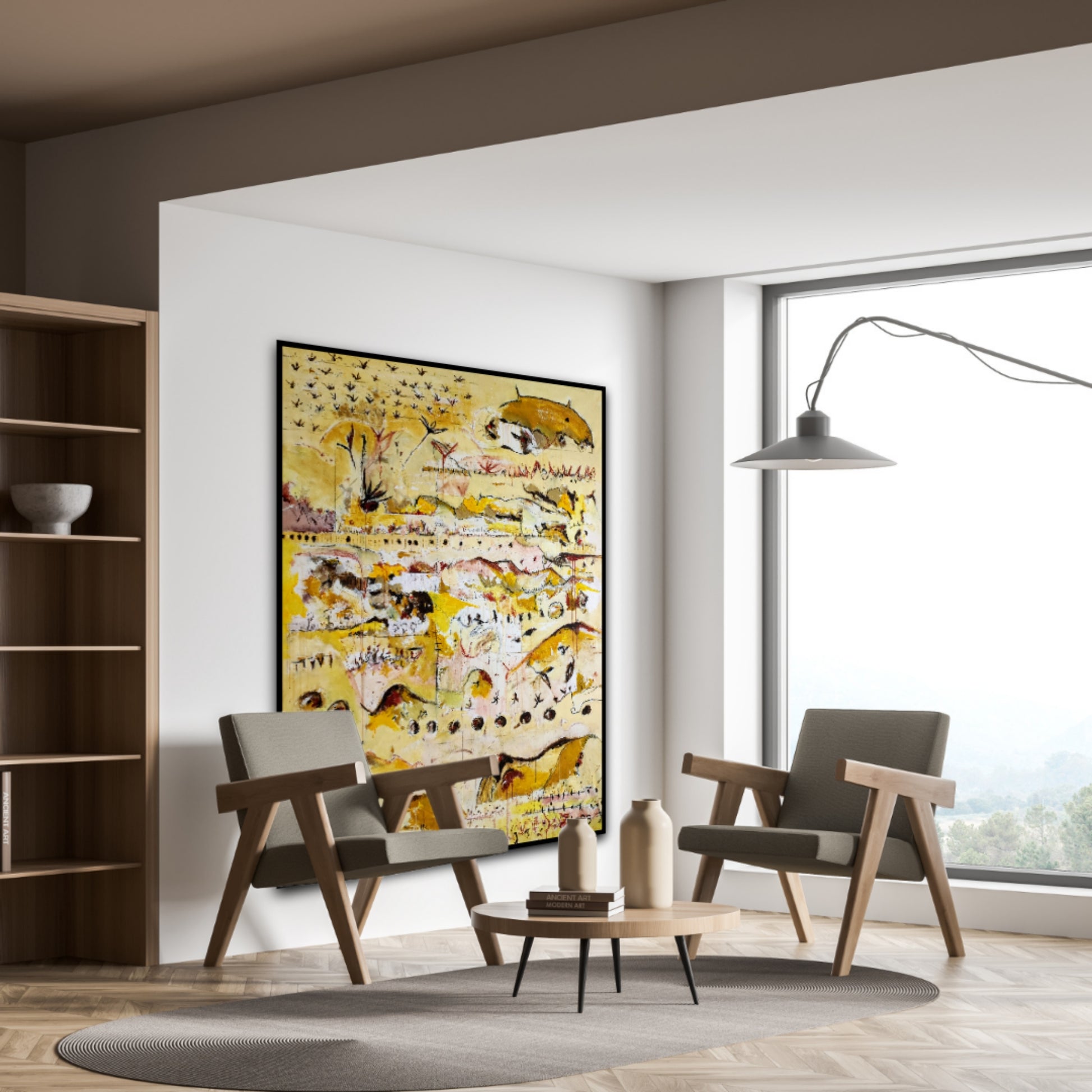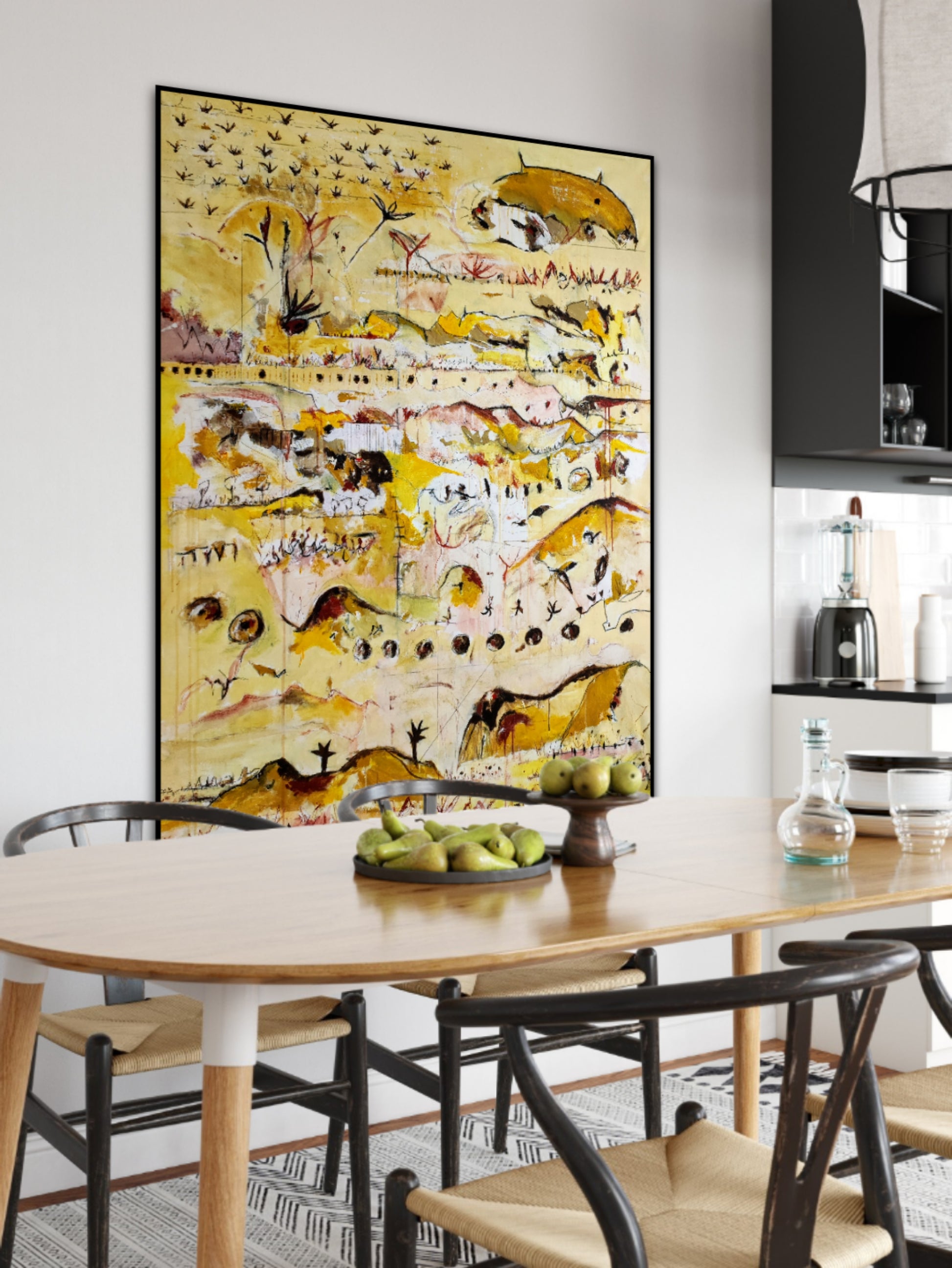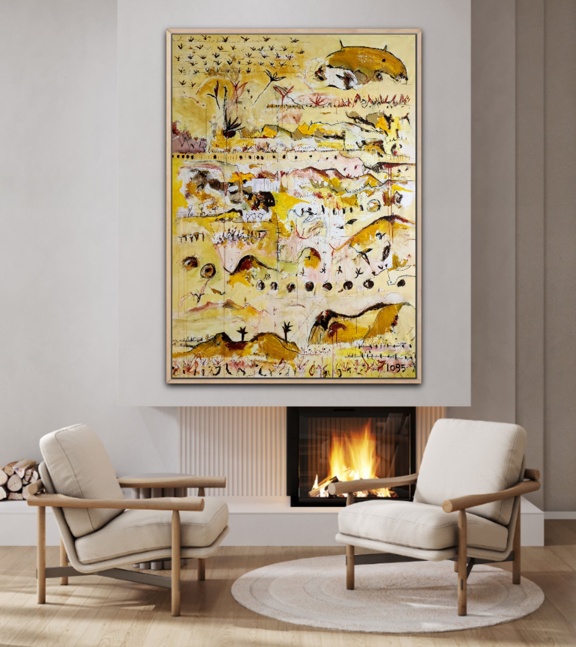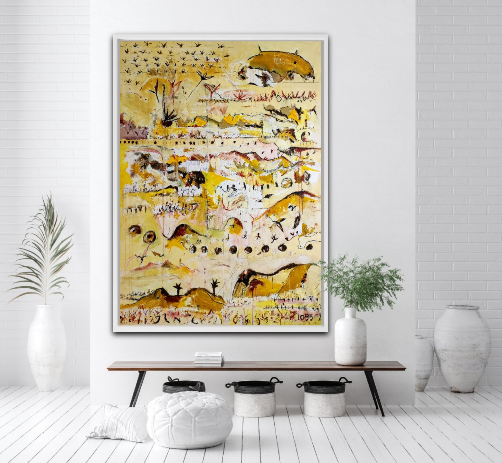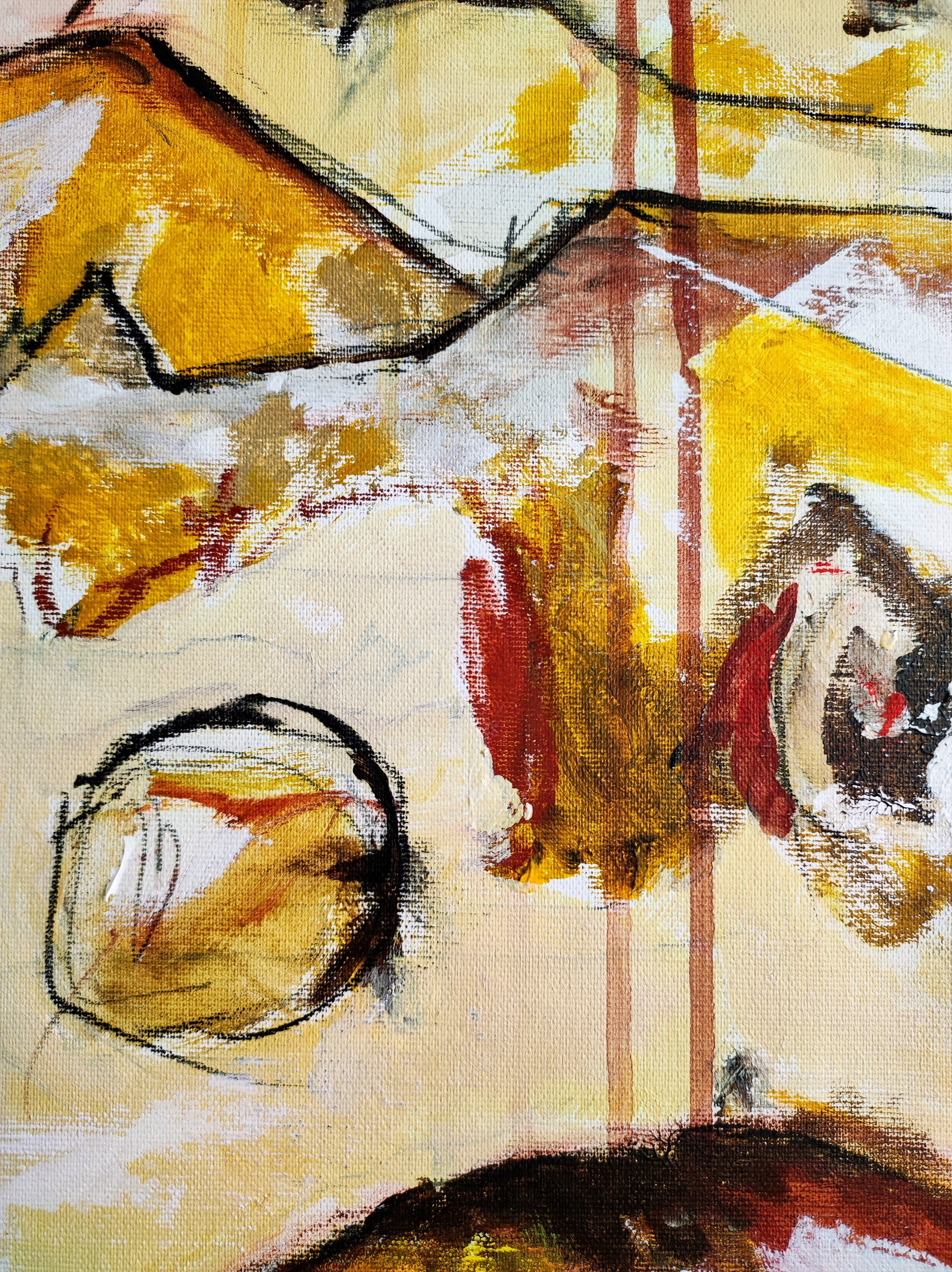 Abstracción hecha con fragmentos de paisajes a modo de estratos. Montañas, semillas, frutos, plantas, seres, símbolos... Todo fuera de sitio, aleatorio, con la mirada perdida...