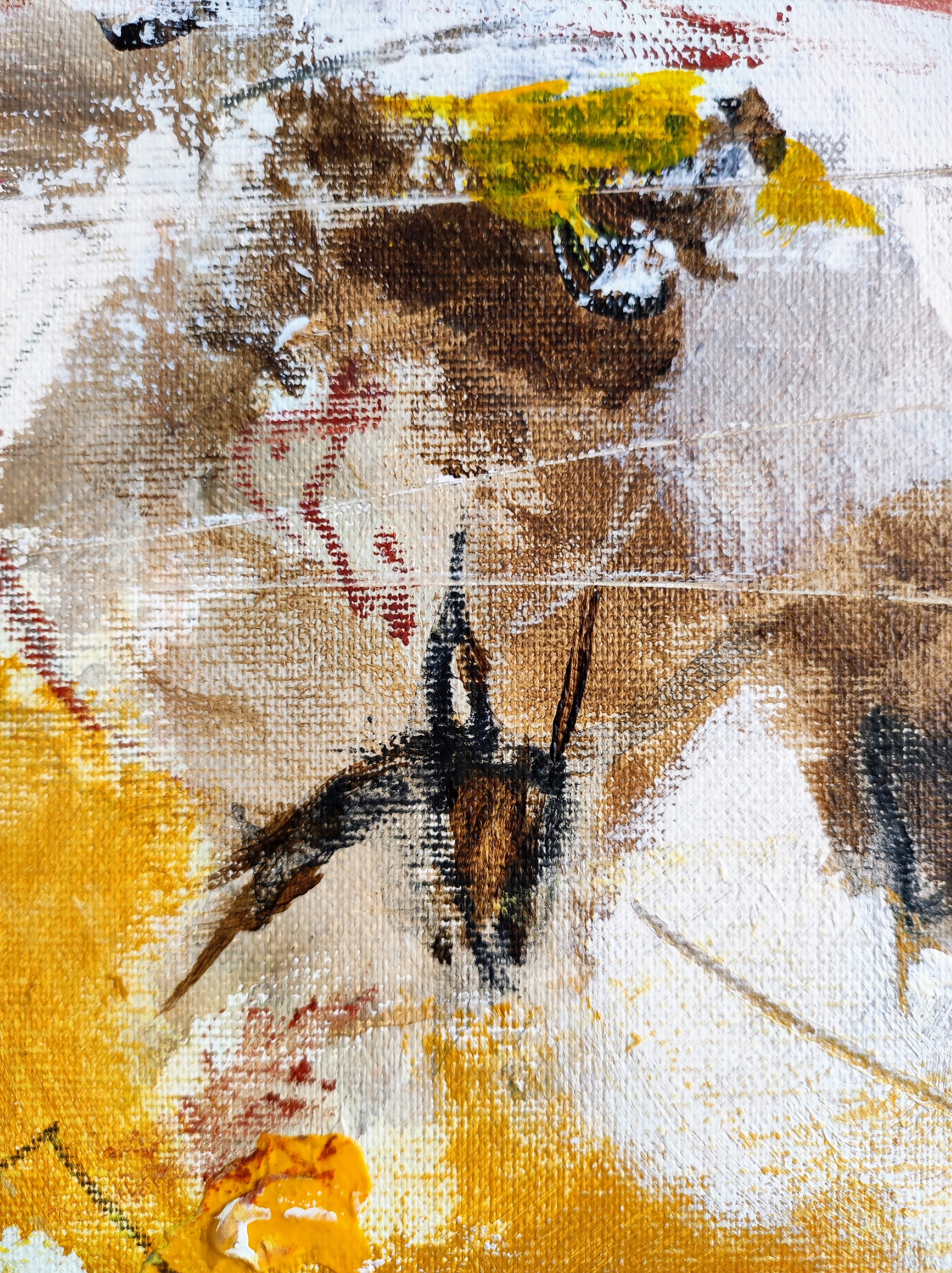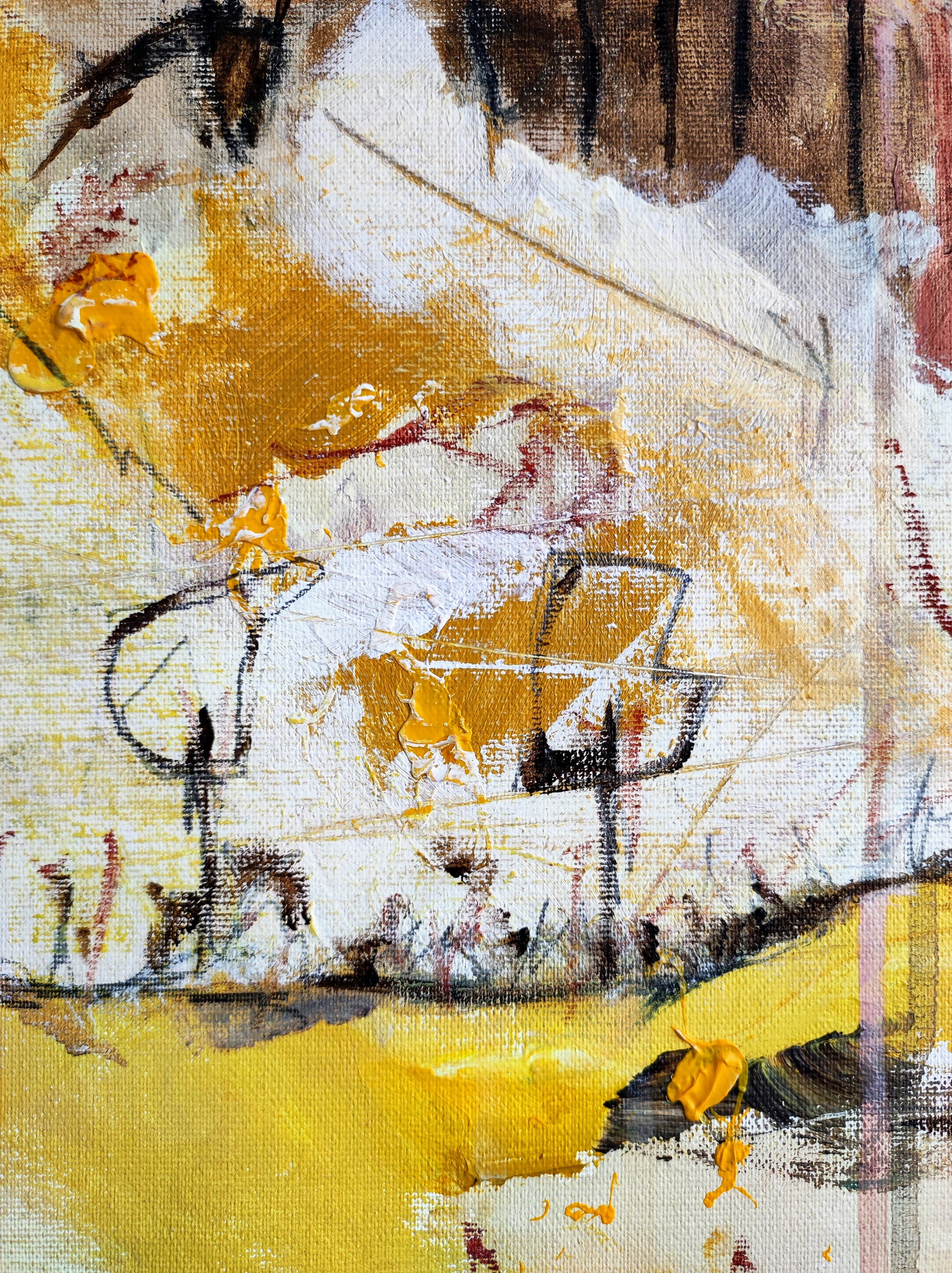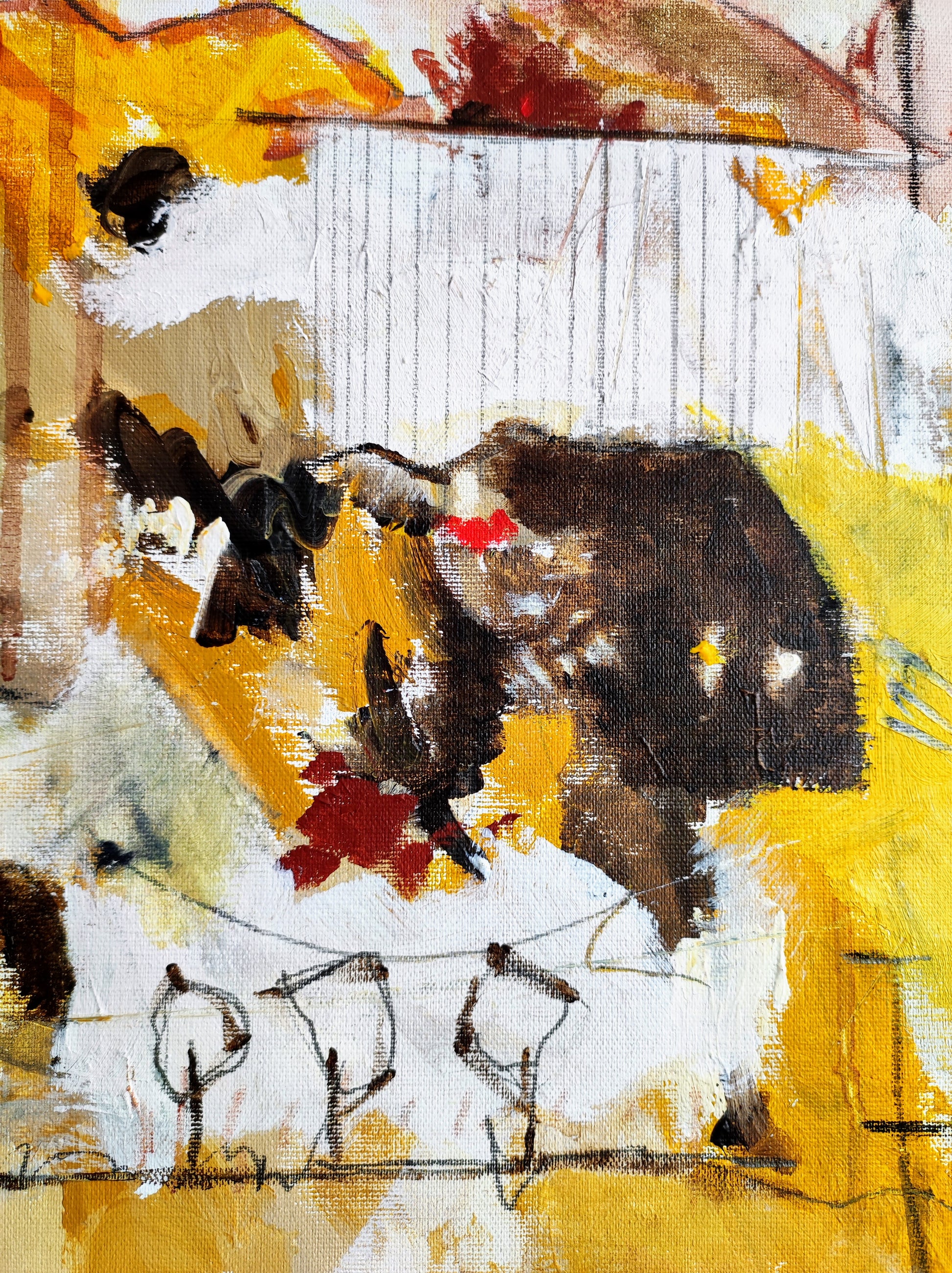 Pintura gestual, intuitiva, que deja que las cosas pasen y se apoya sobre lo que aparece. Aprovechando el accidente y aceptando las consecuencias.