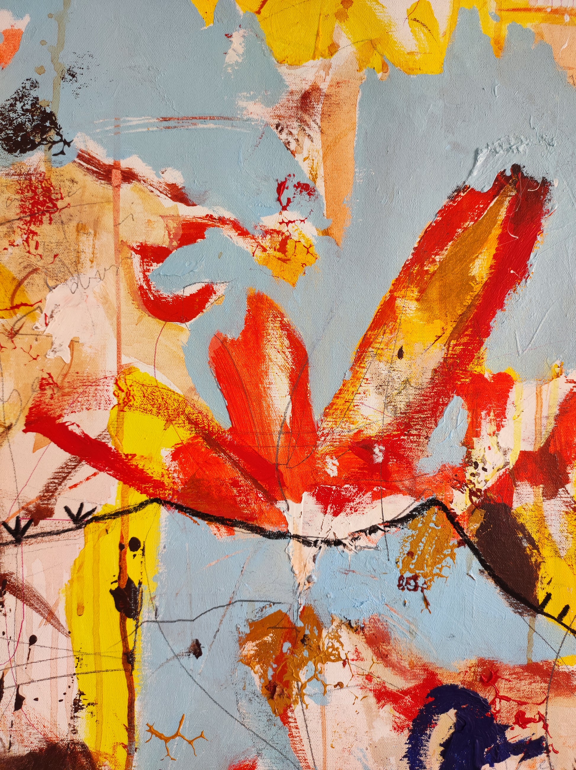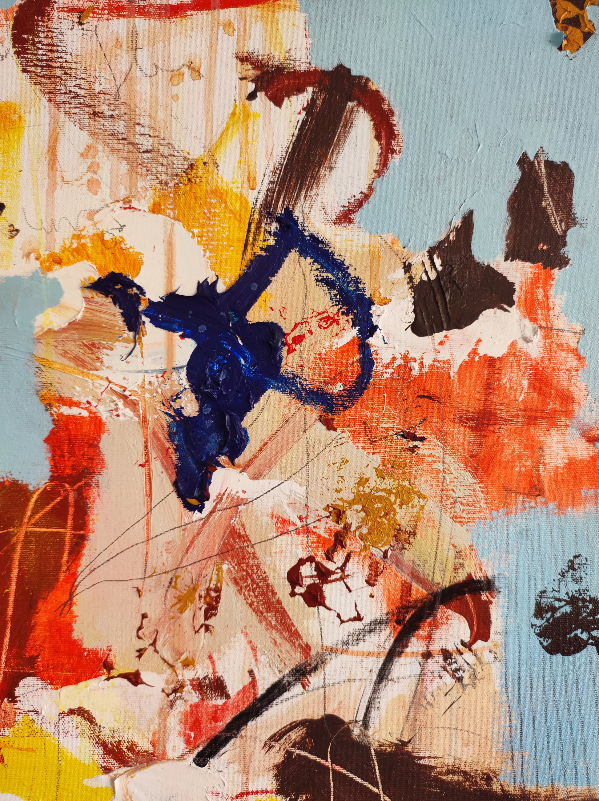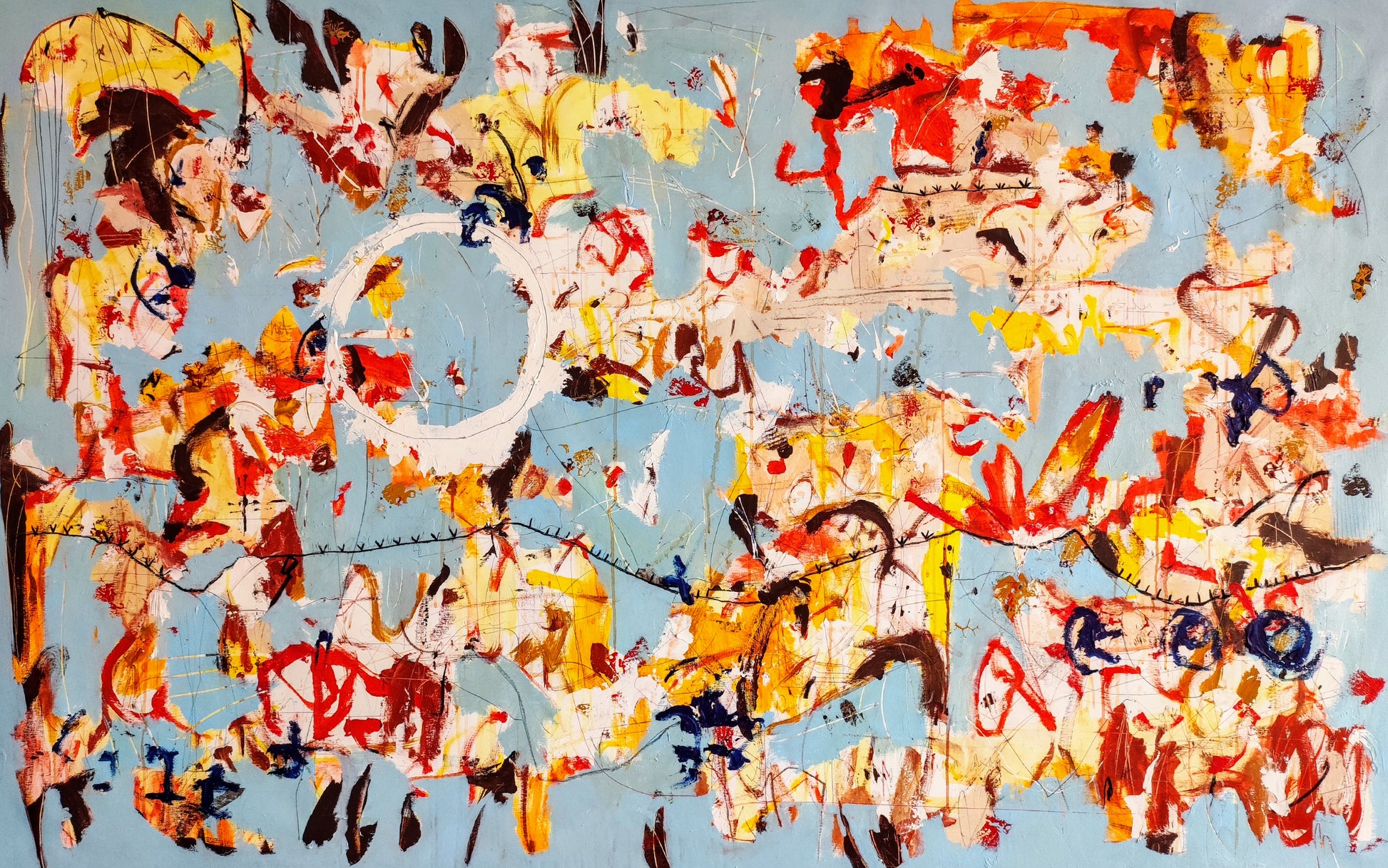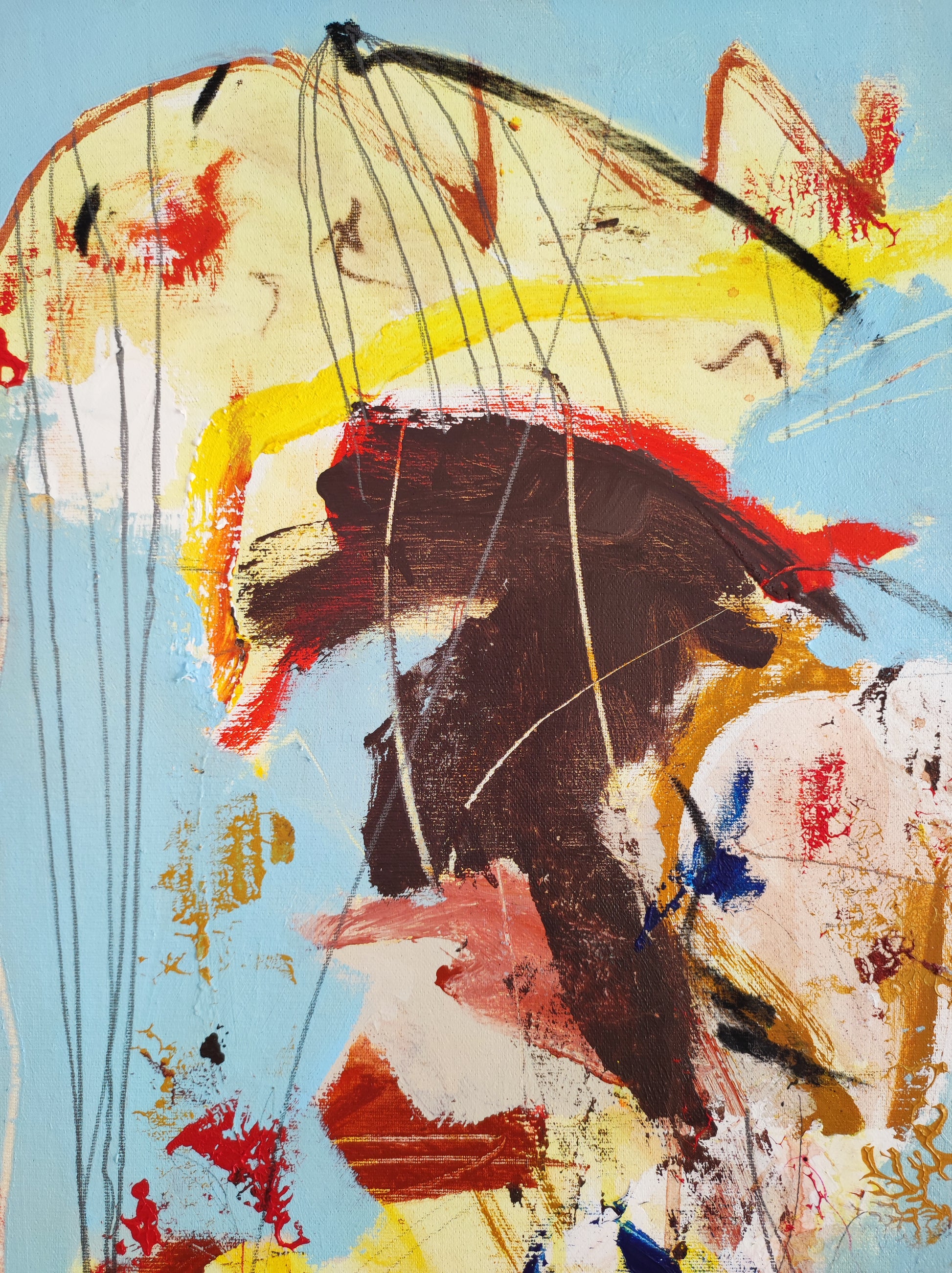 Pintura gestual, intuitiva, que deja que las cosas pasen y se apoya sobre lo que aparece. Aprovechando el accidente y aceptando las consecuencias.
