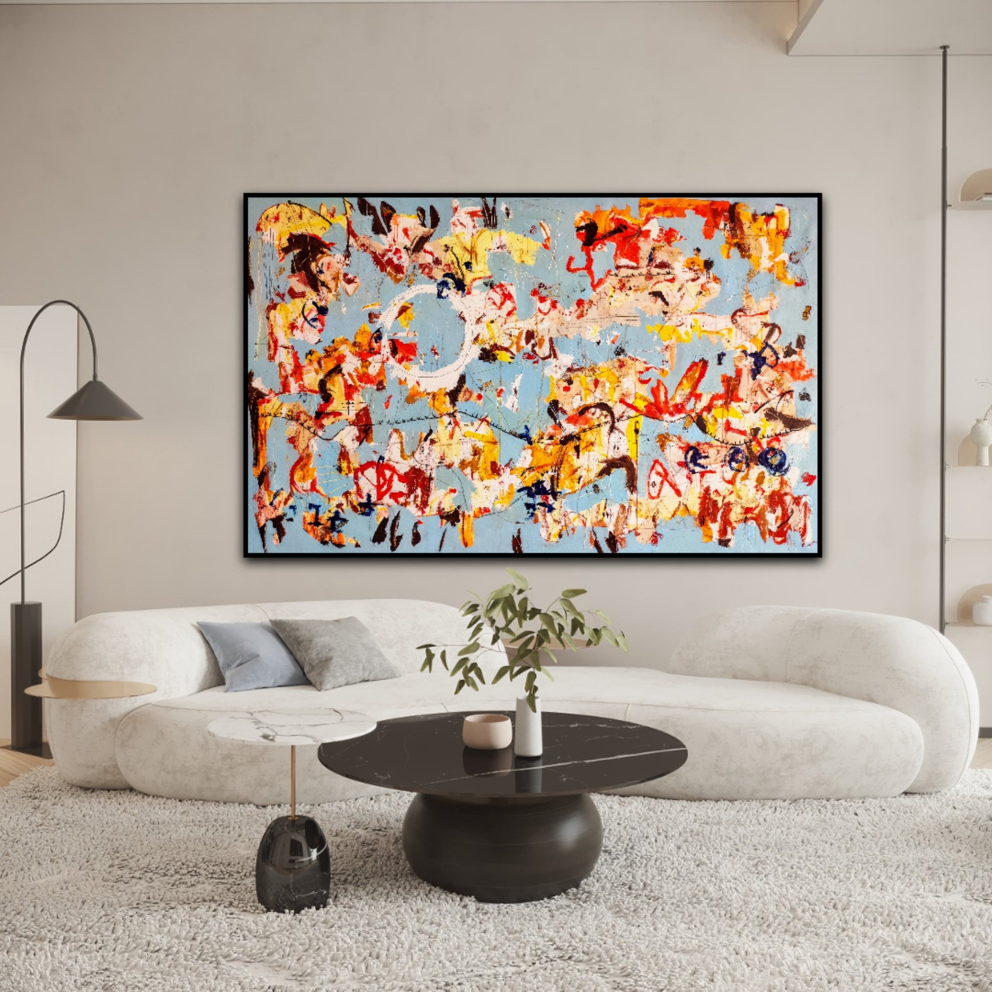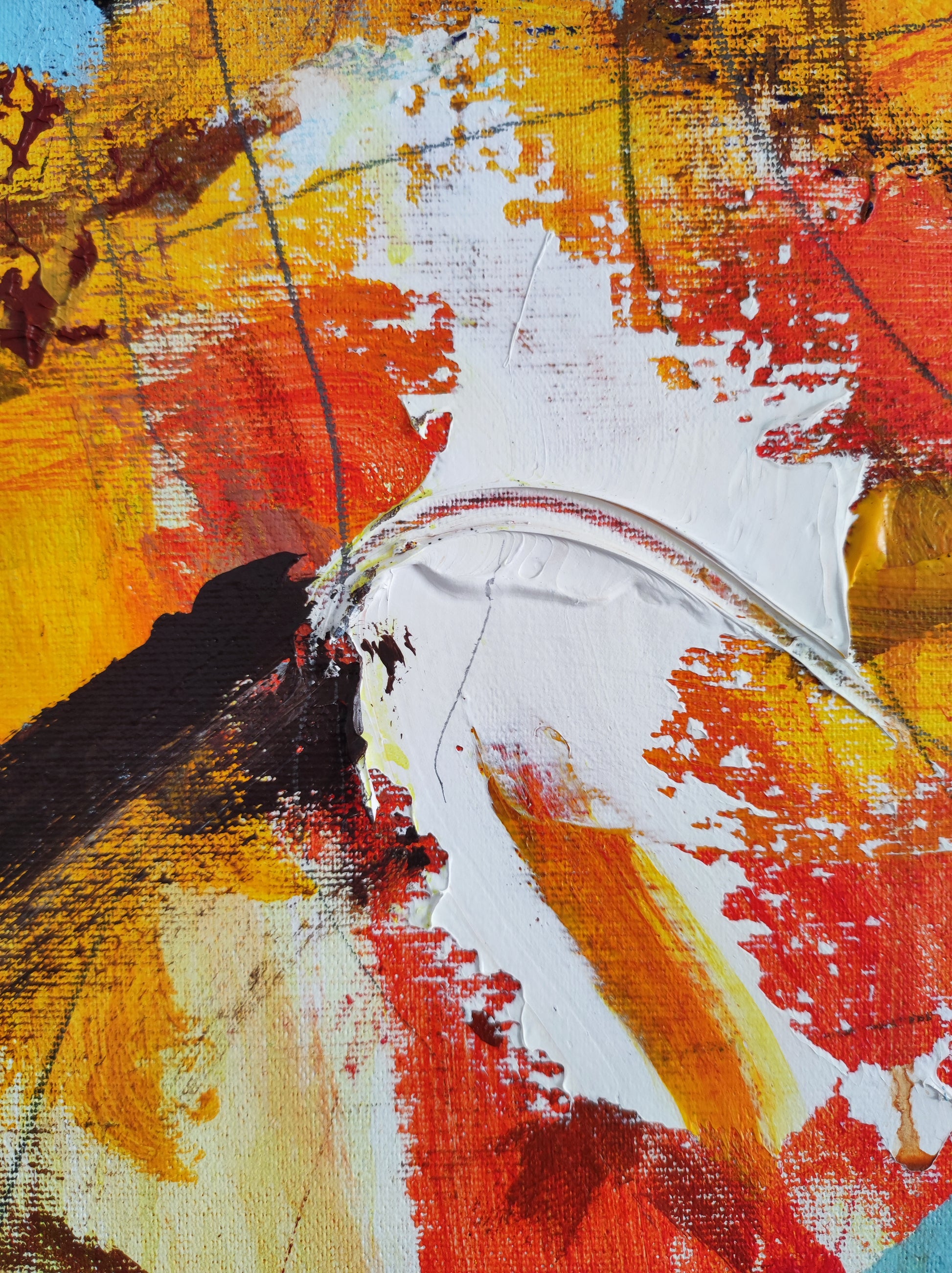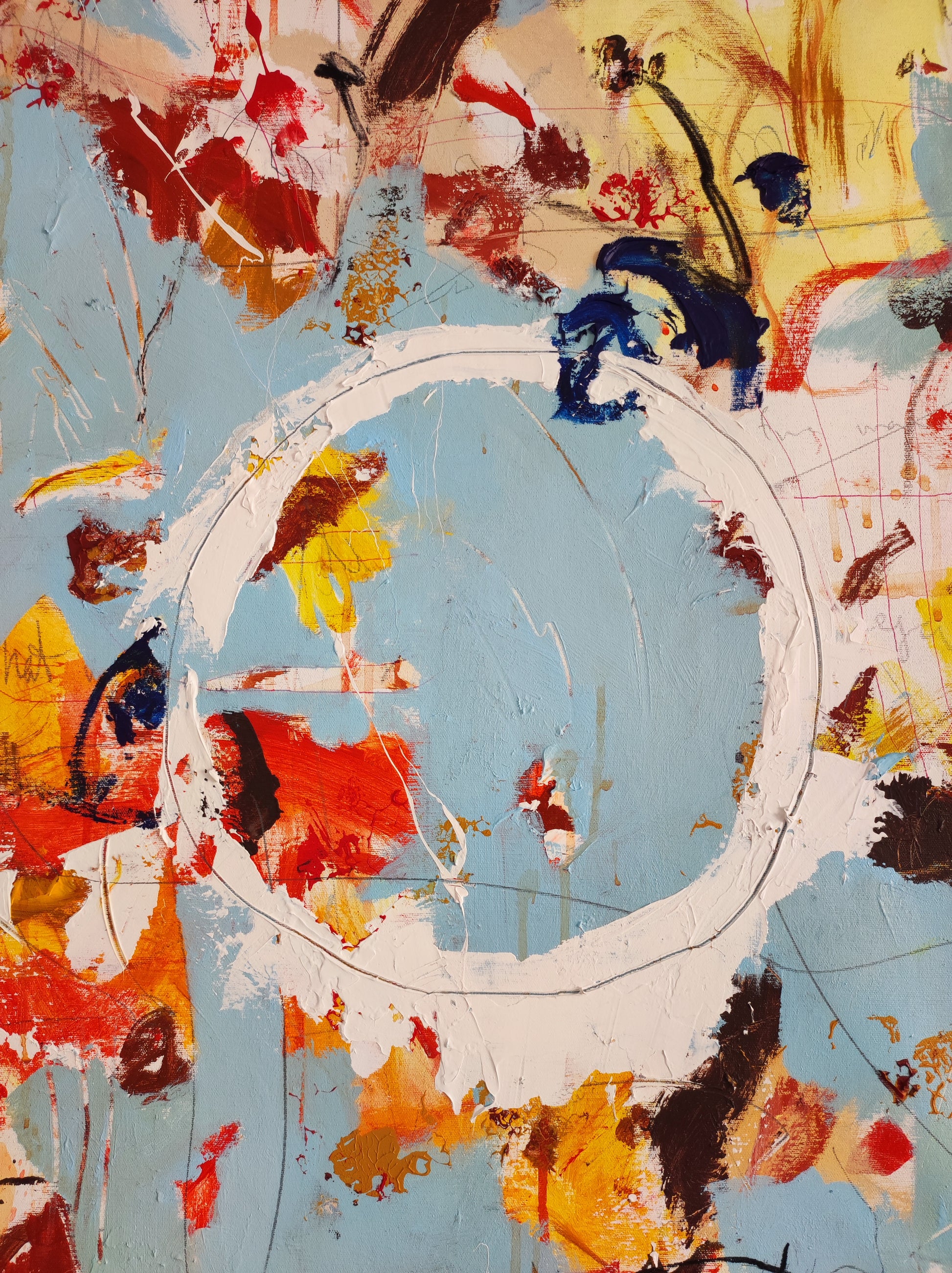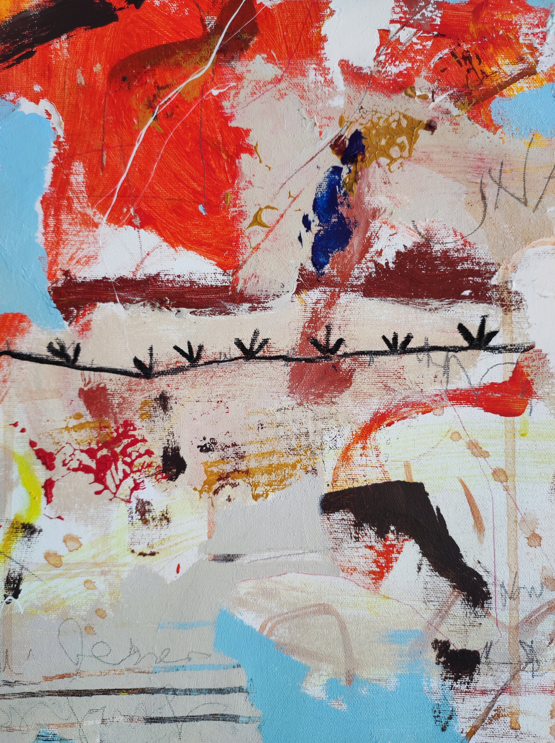 Pintura gestual, intuitiva, que deja que las cosas pasen y se apoya sobre lo que aparece. Aprovechando el accidente y aceptando las consecuencias.