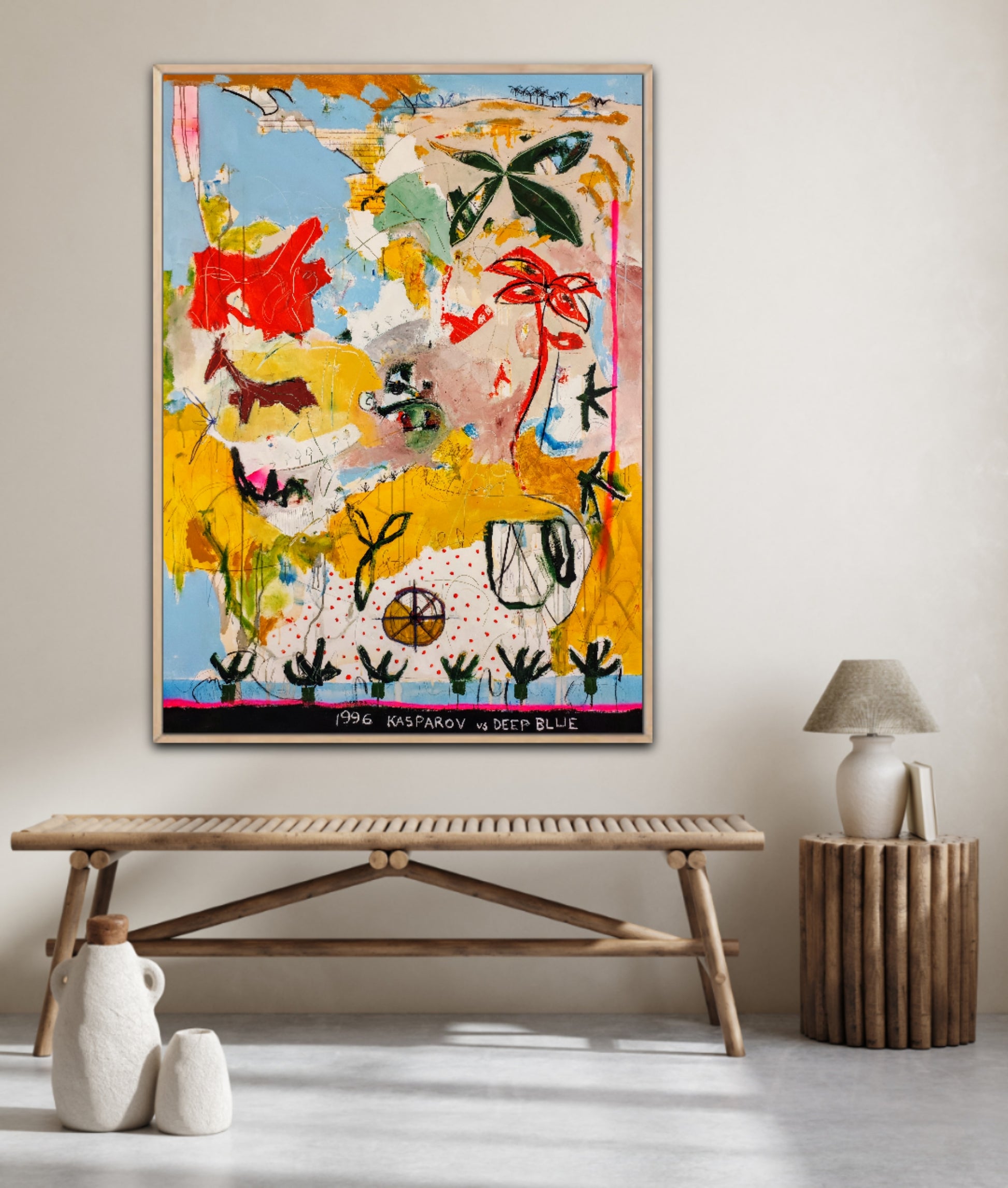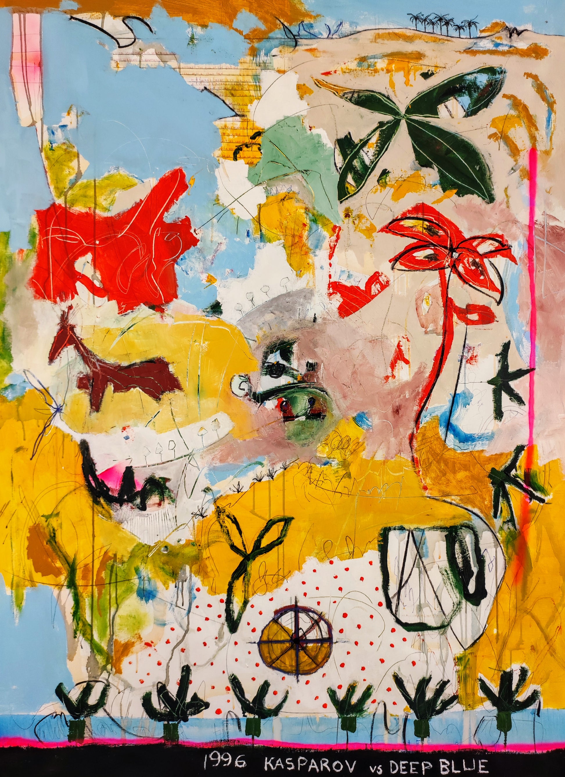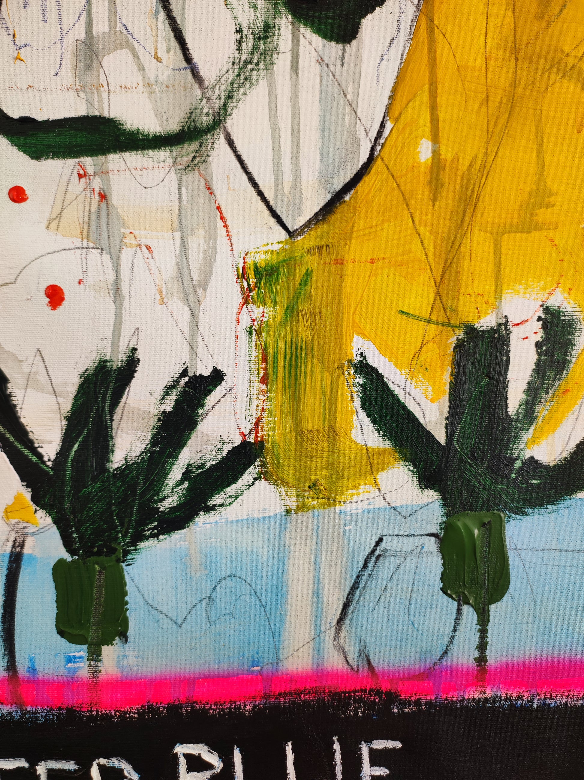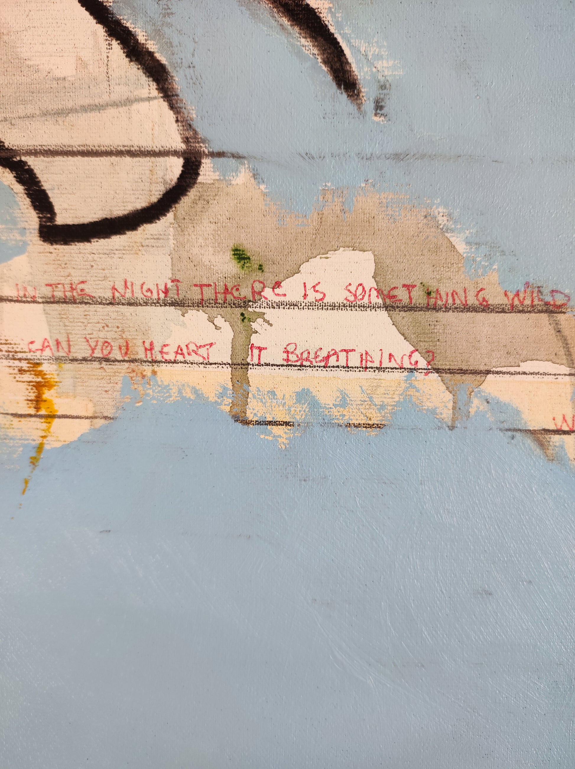 Técnica: acrílico, pigmentos, ceras, pintura en spray, tinta china, carboncillo y lápiz.