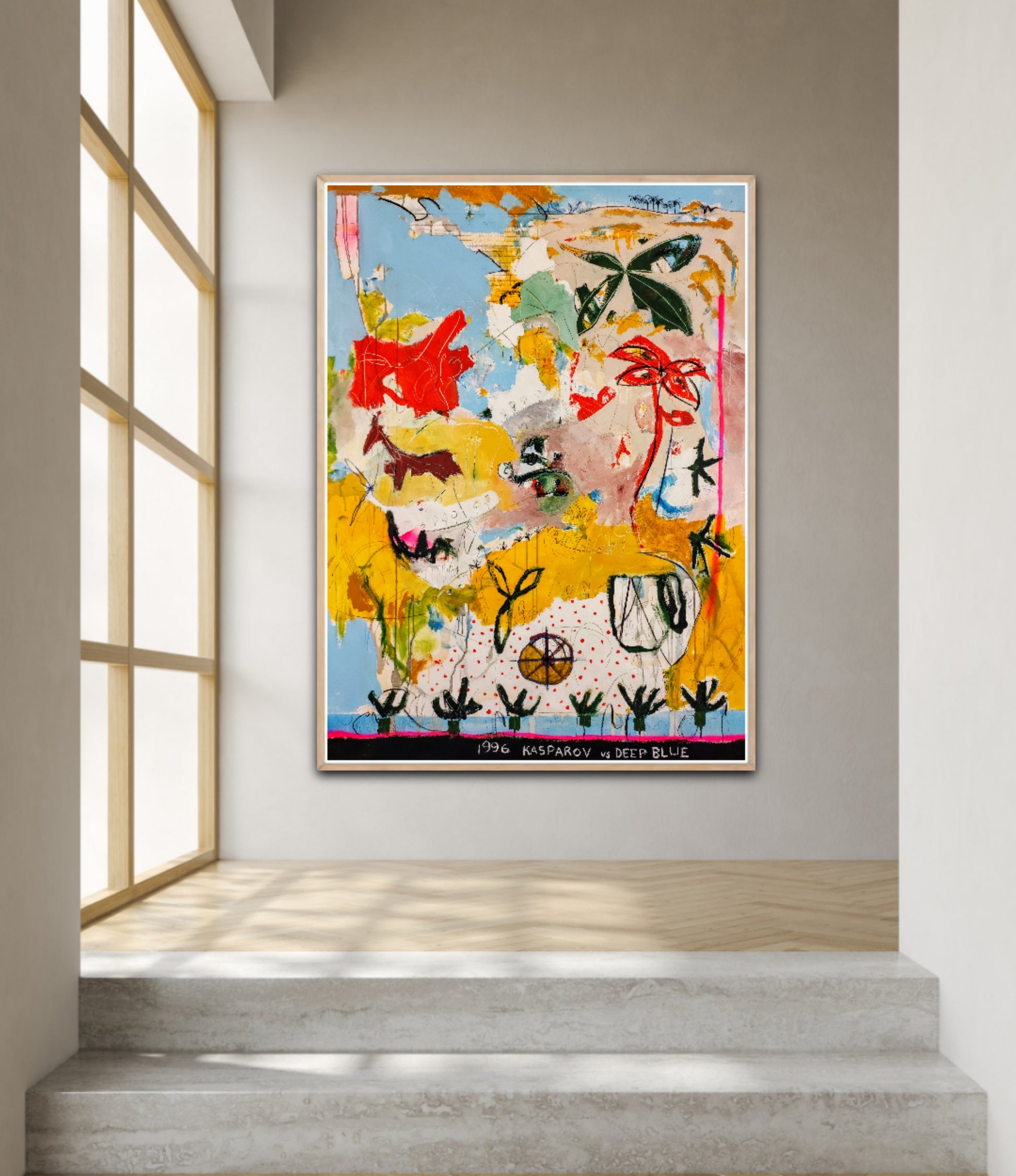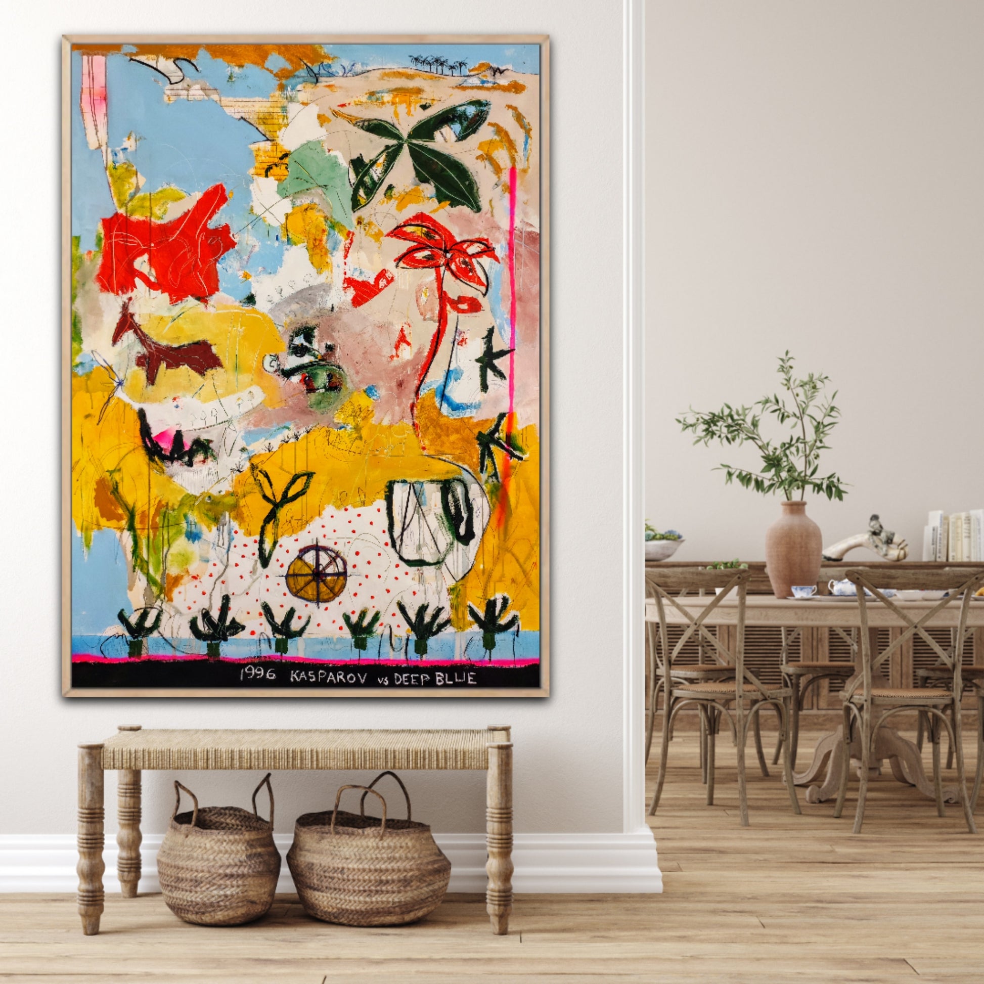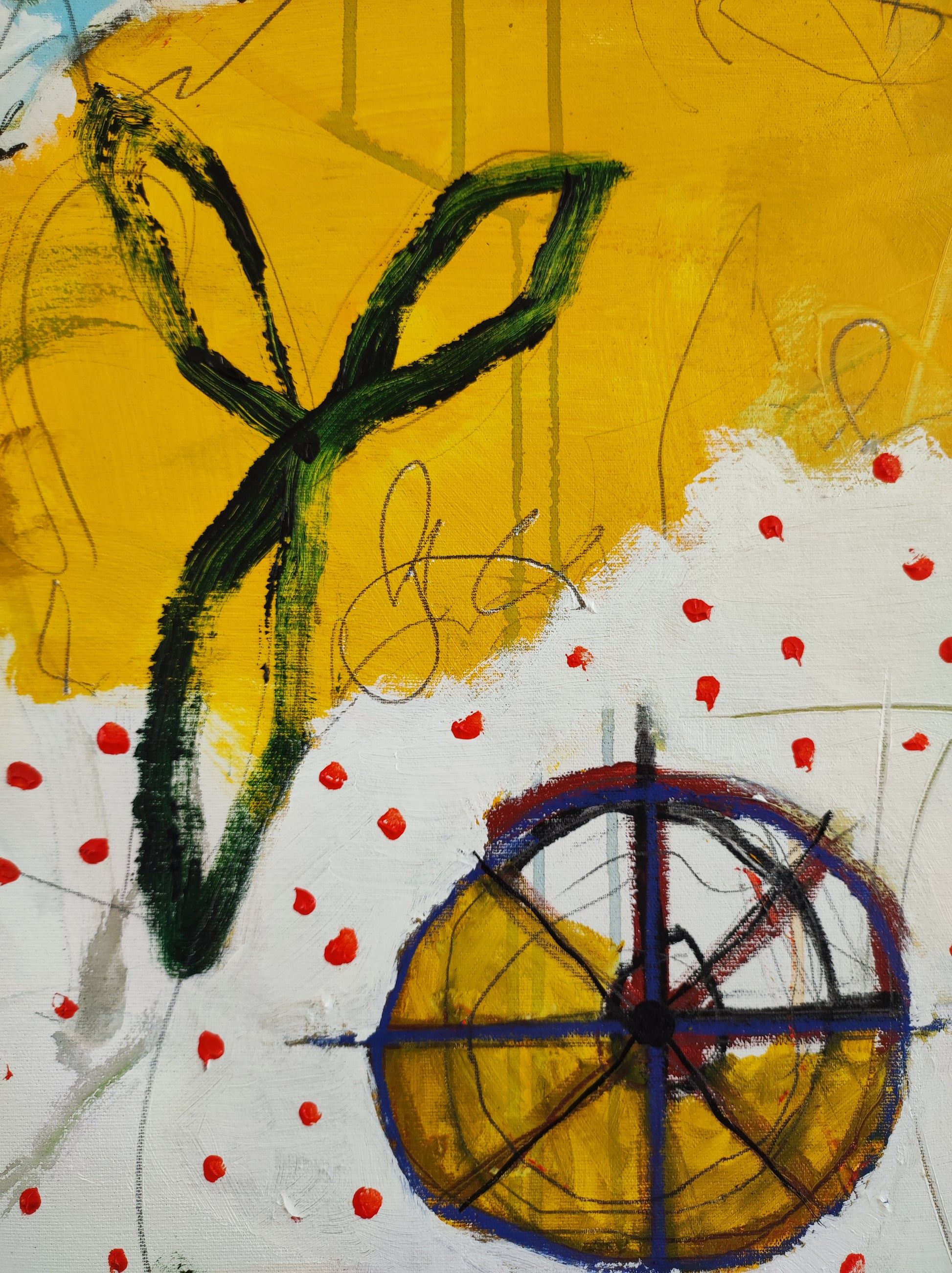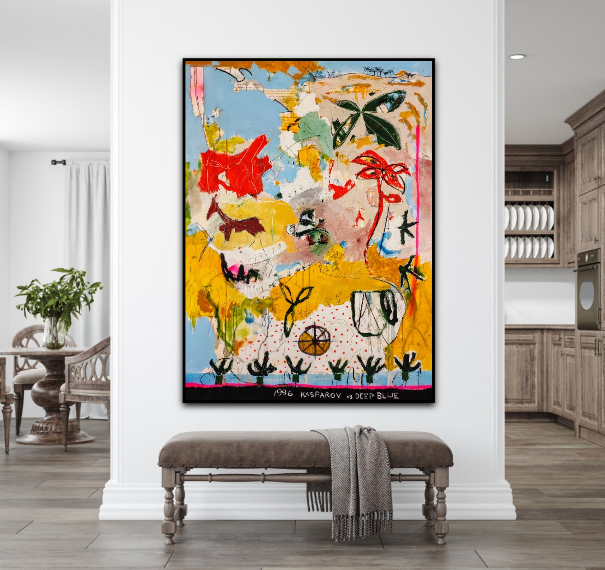 Técnica: acrílico, pigmentos, ceras, pintura en spray, tinta china, carboncillo y lápiz.