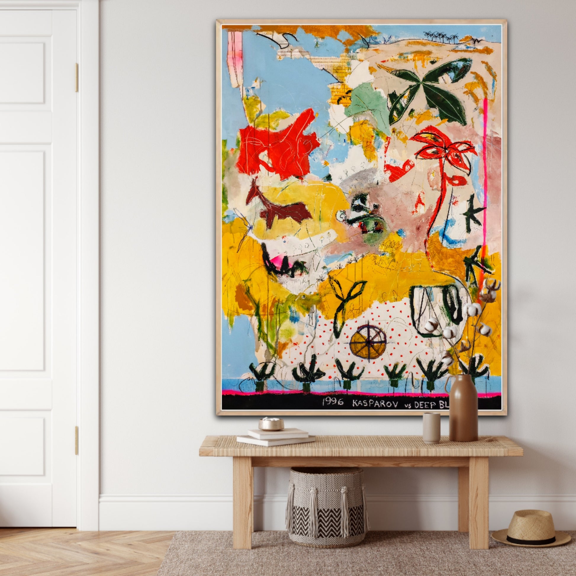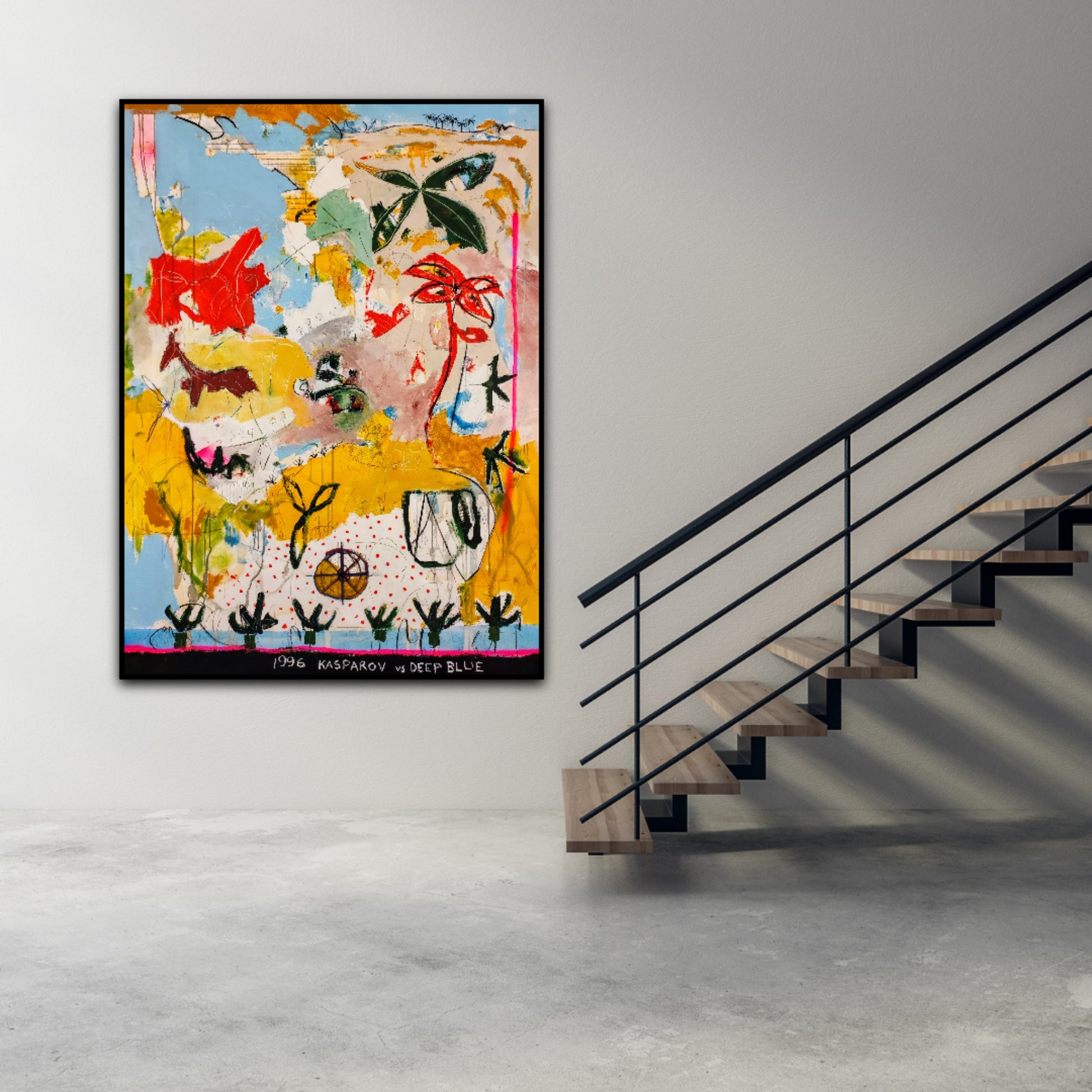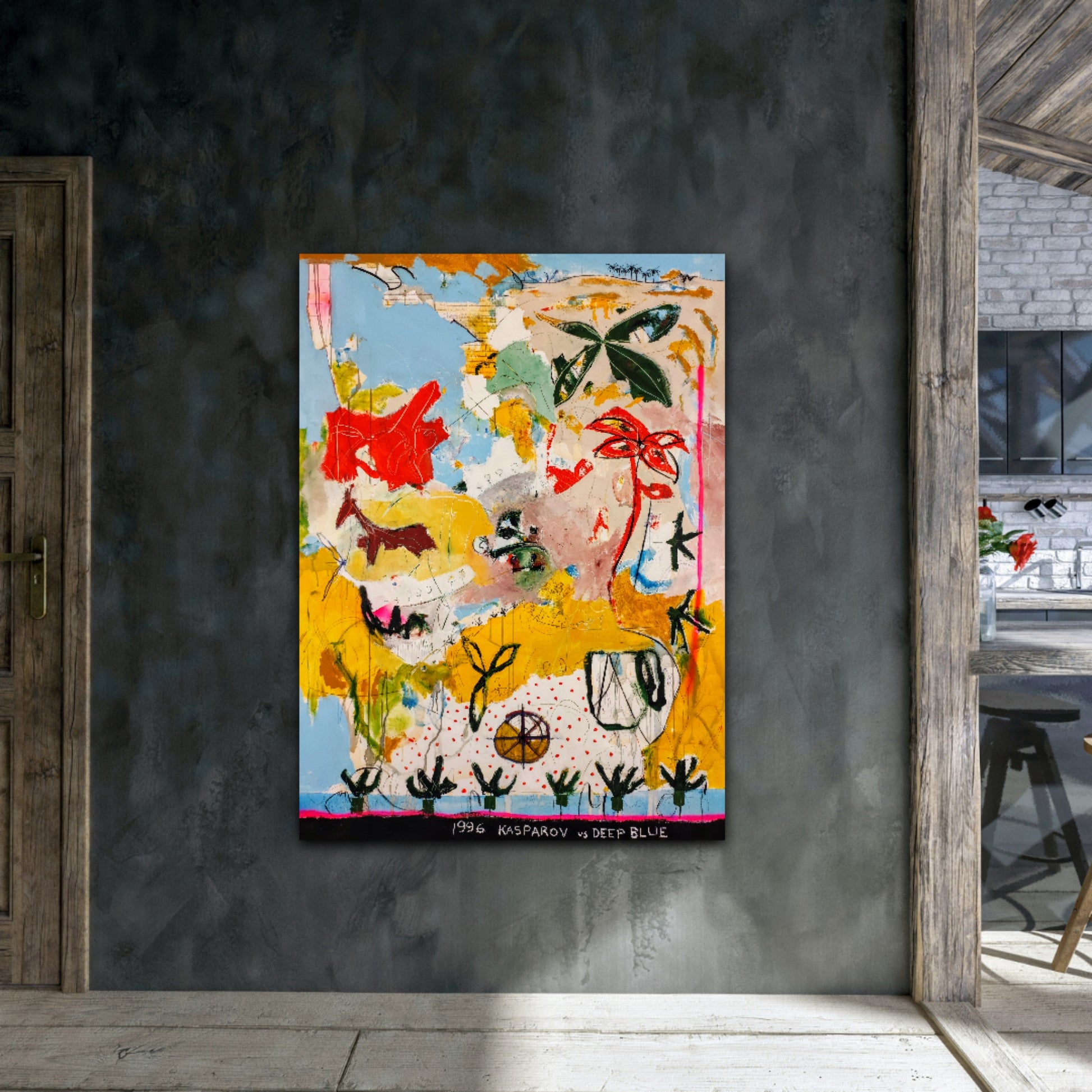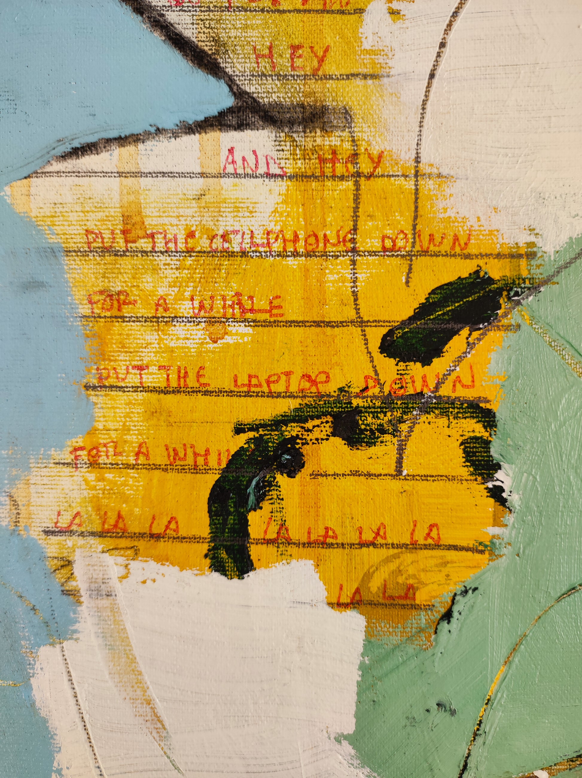 Técnica: acrílico, pigmentos, ceras, pintura en spray, tinta china, carboncillo y lápiz.