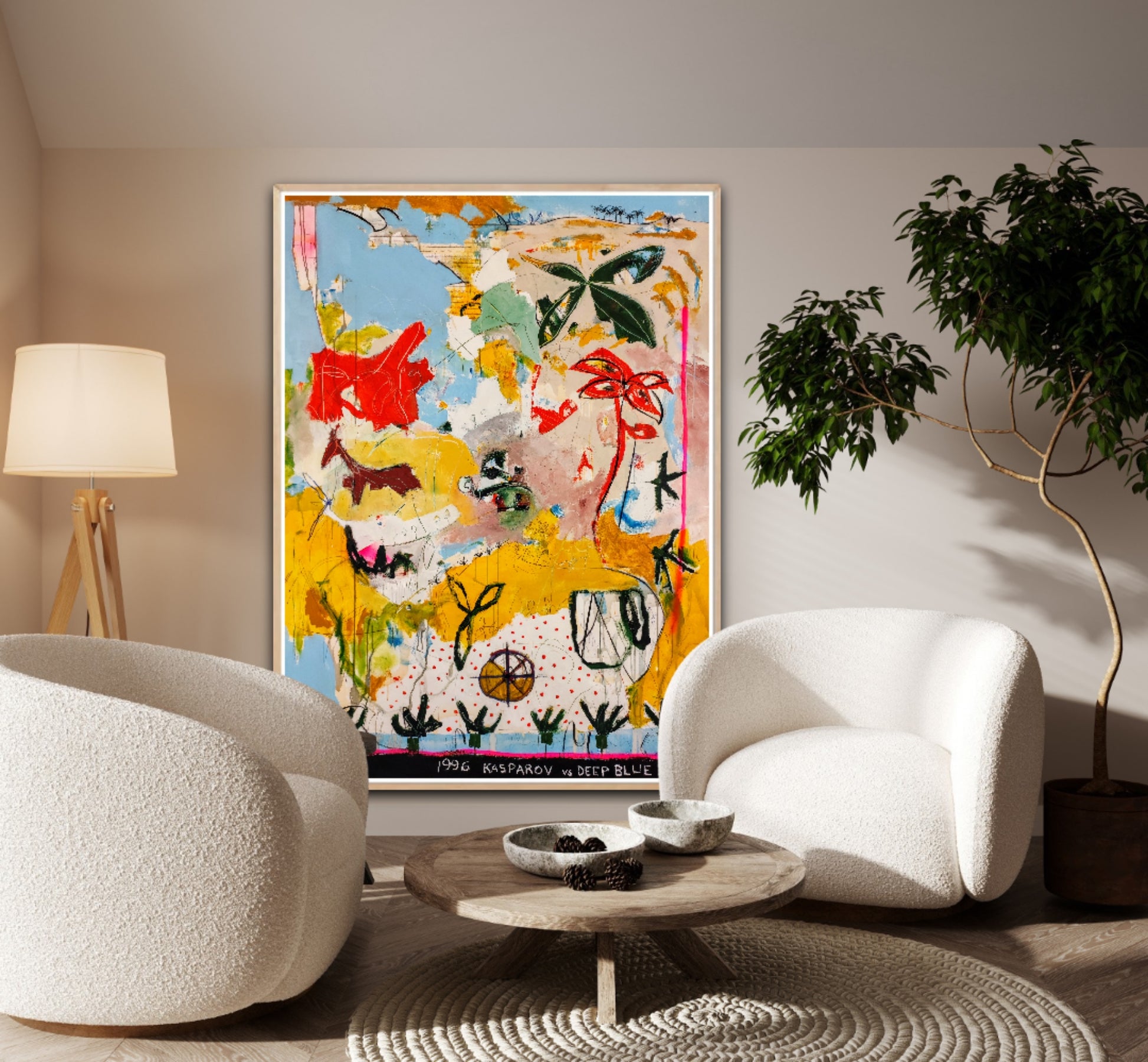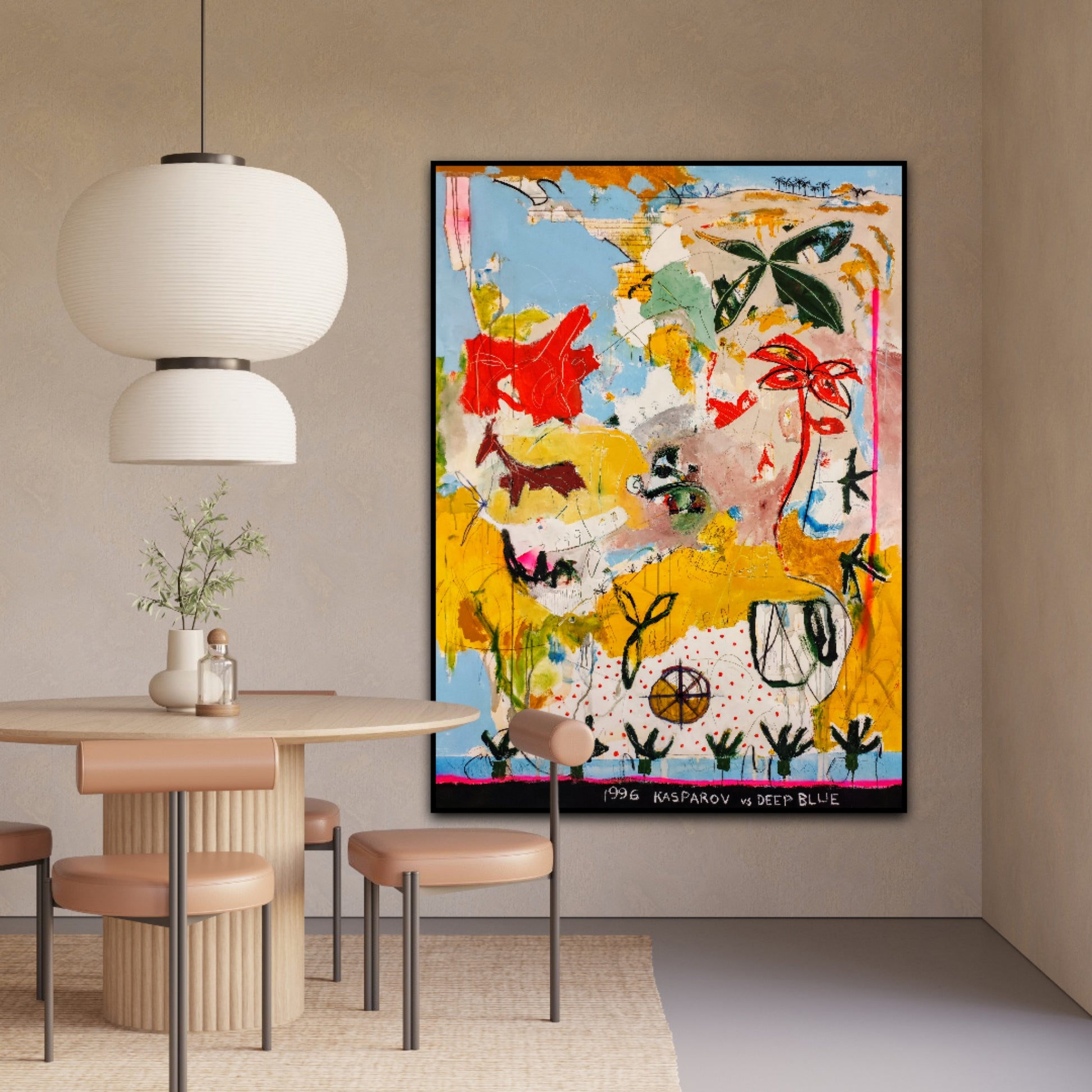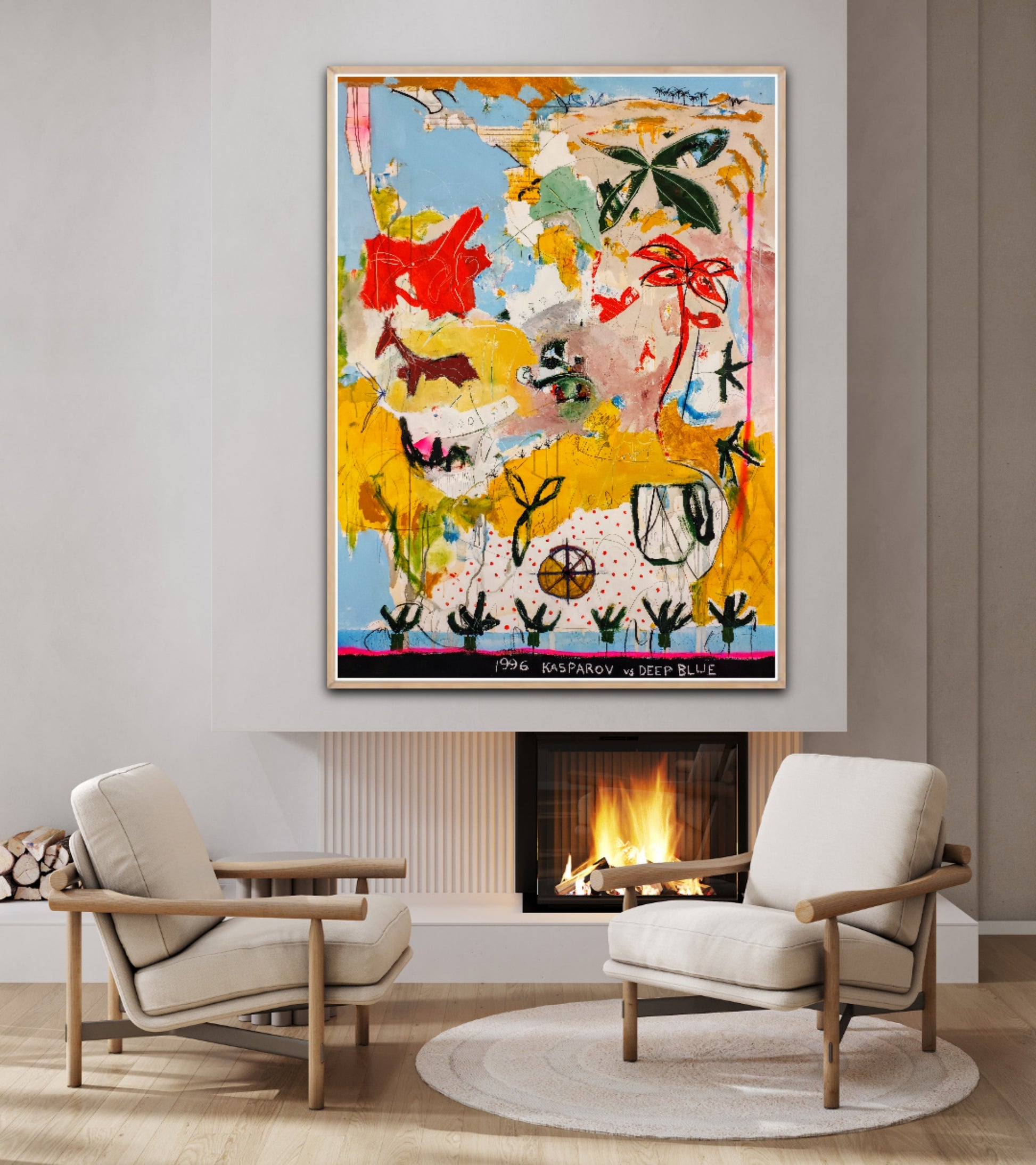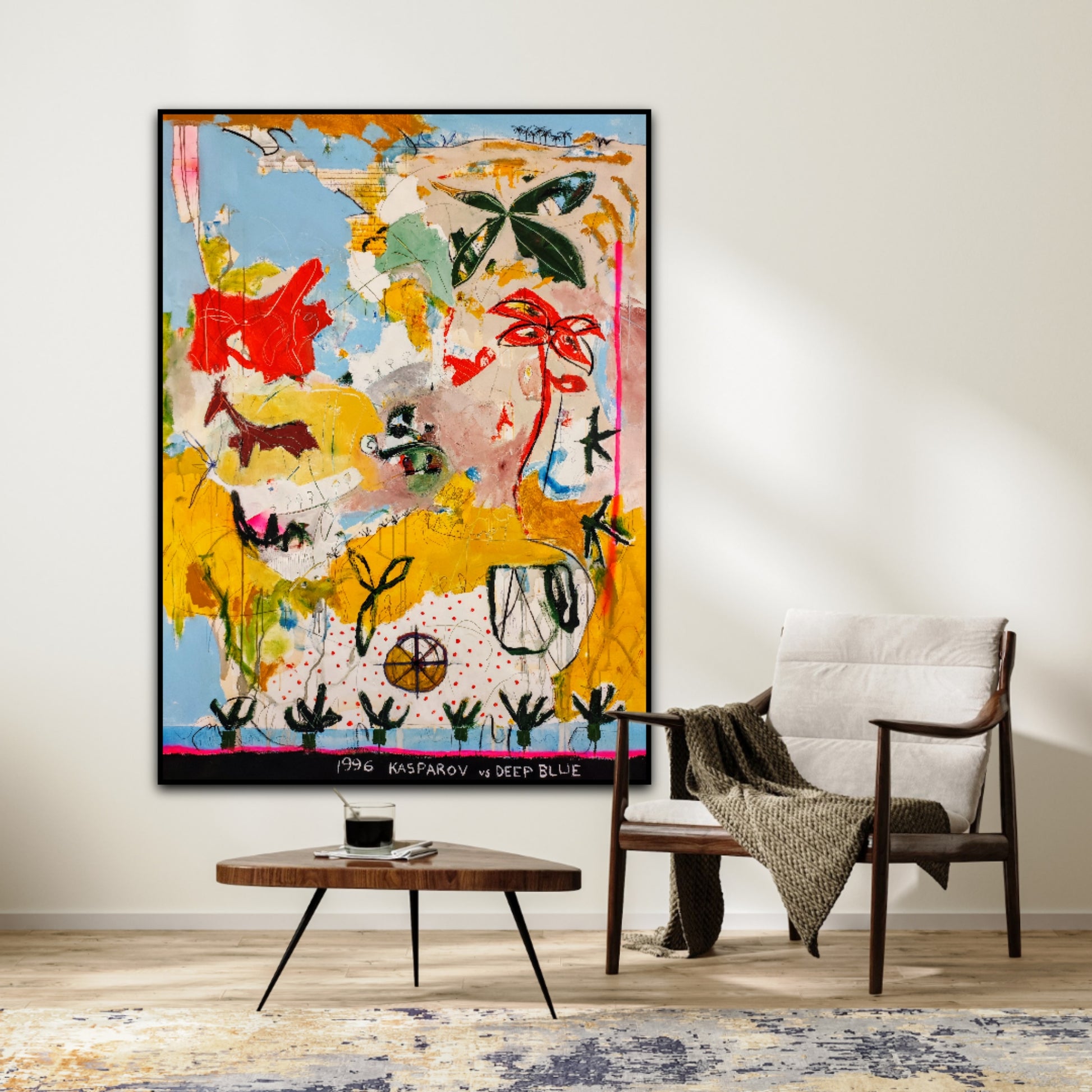 Técnica: acrílico, pigmentos, ceras, pintura en spray, tinta china, carboncillo y lápiz.