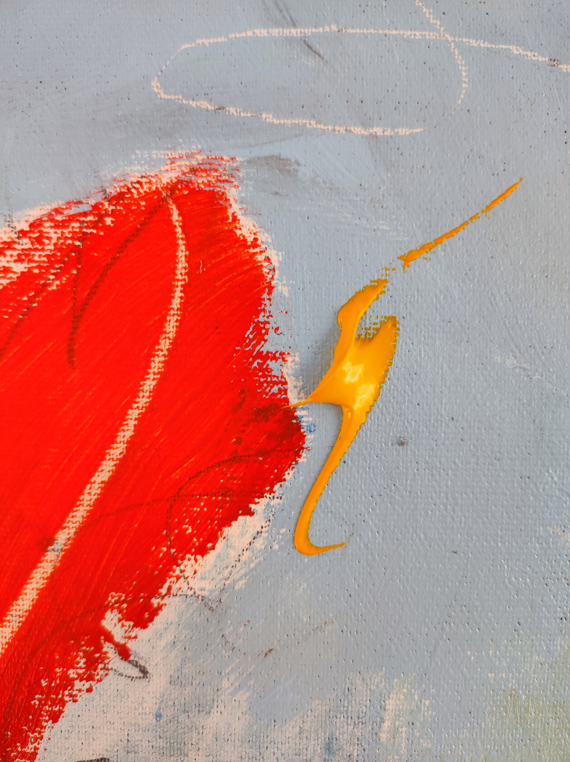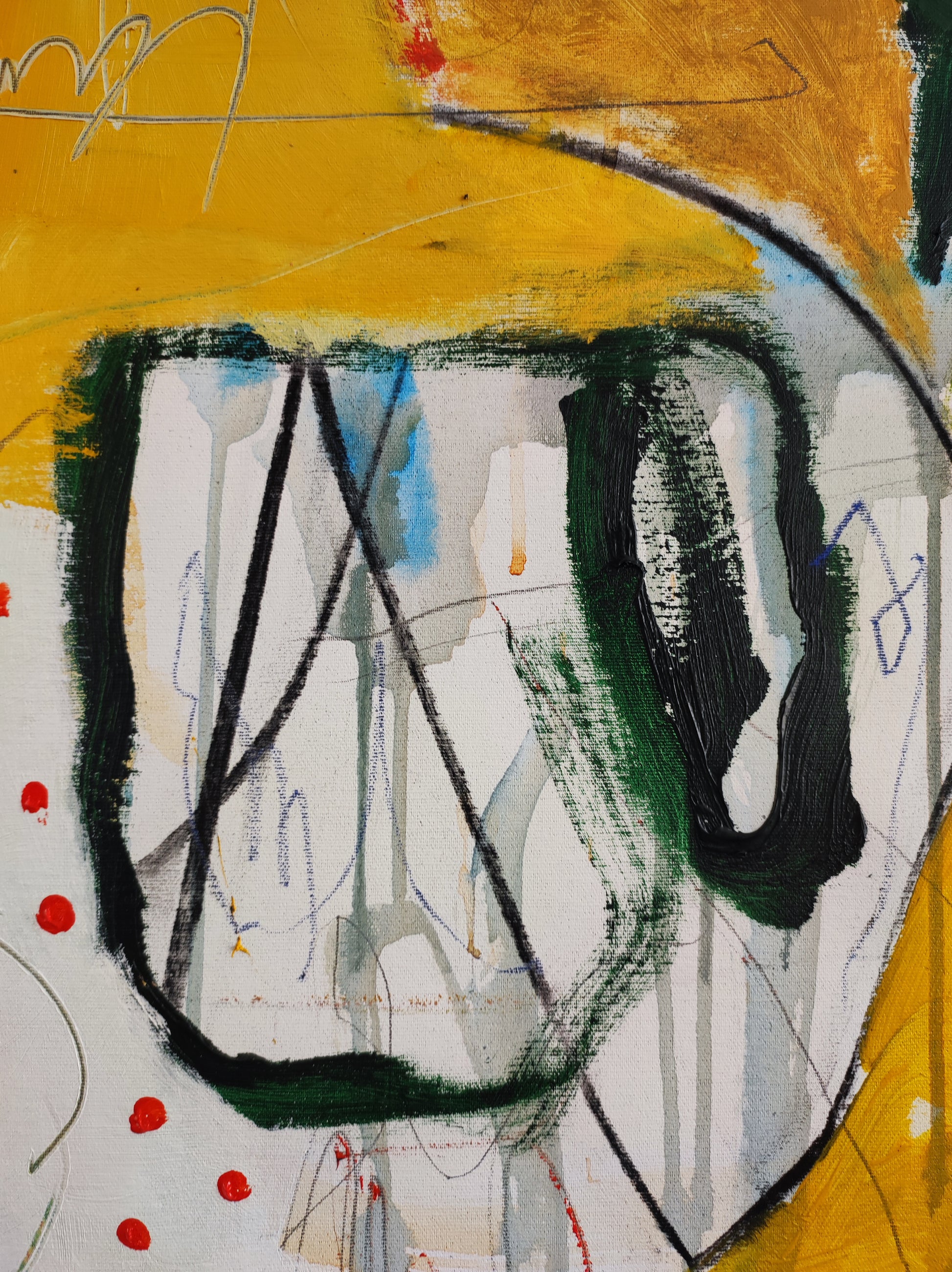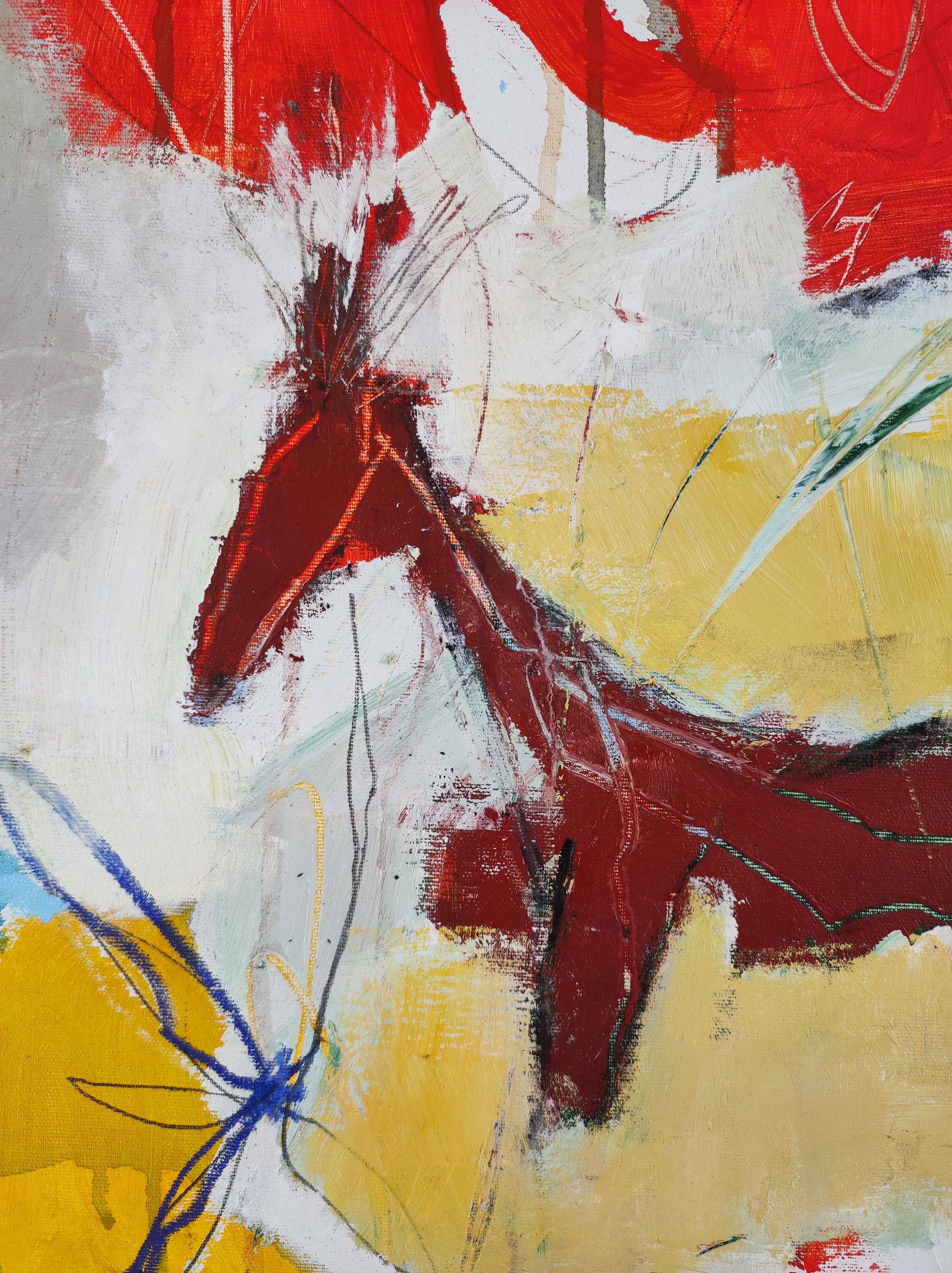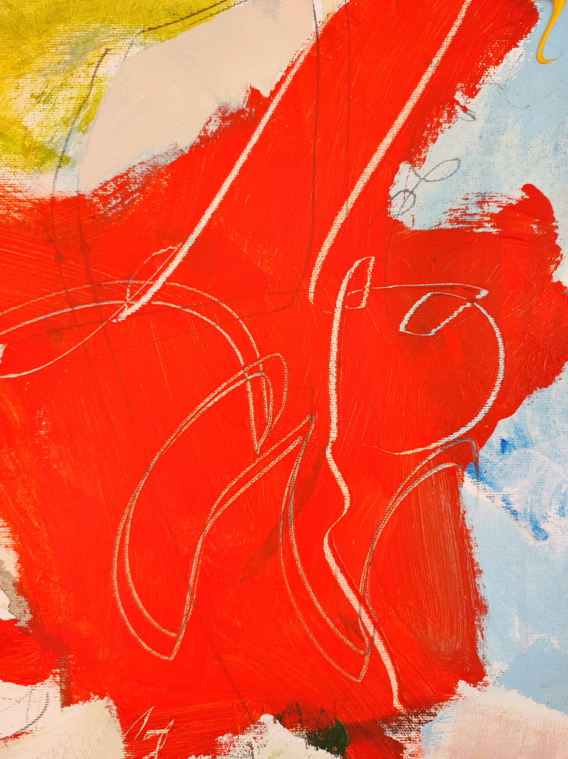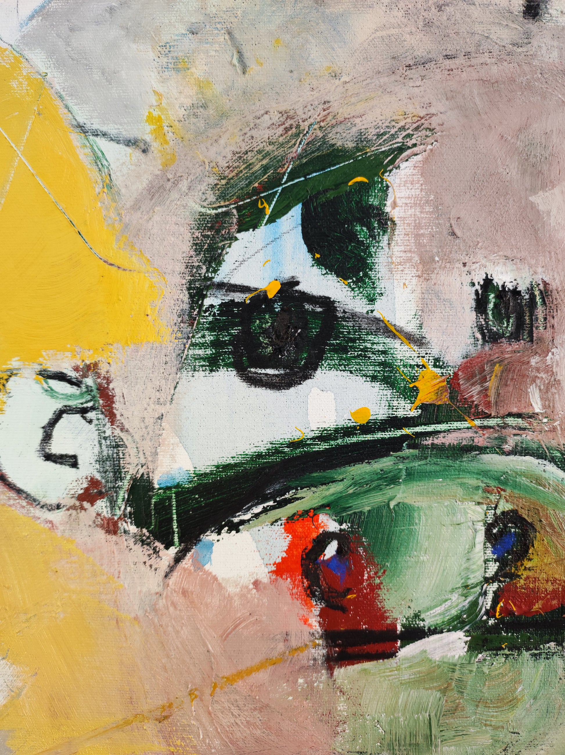 Pintura gestual, intuitiva, que deja que las cosas pasen y se apoya sobre lo que aparece. Aprovechando el accidente y aceptando las consecuencias.
