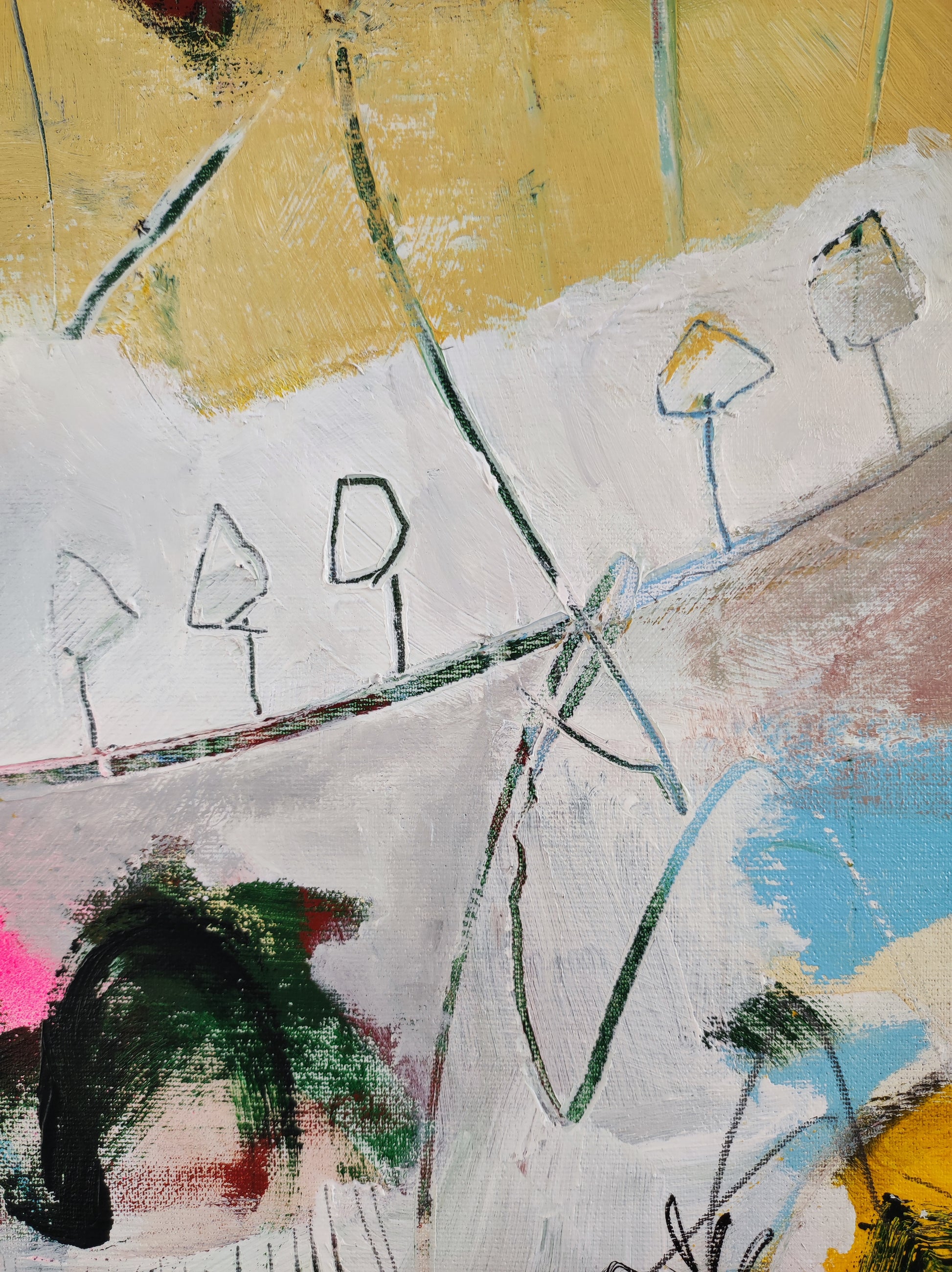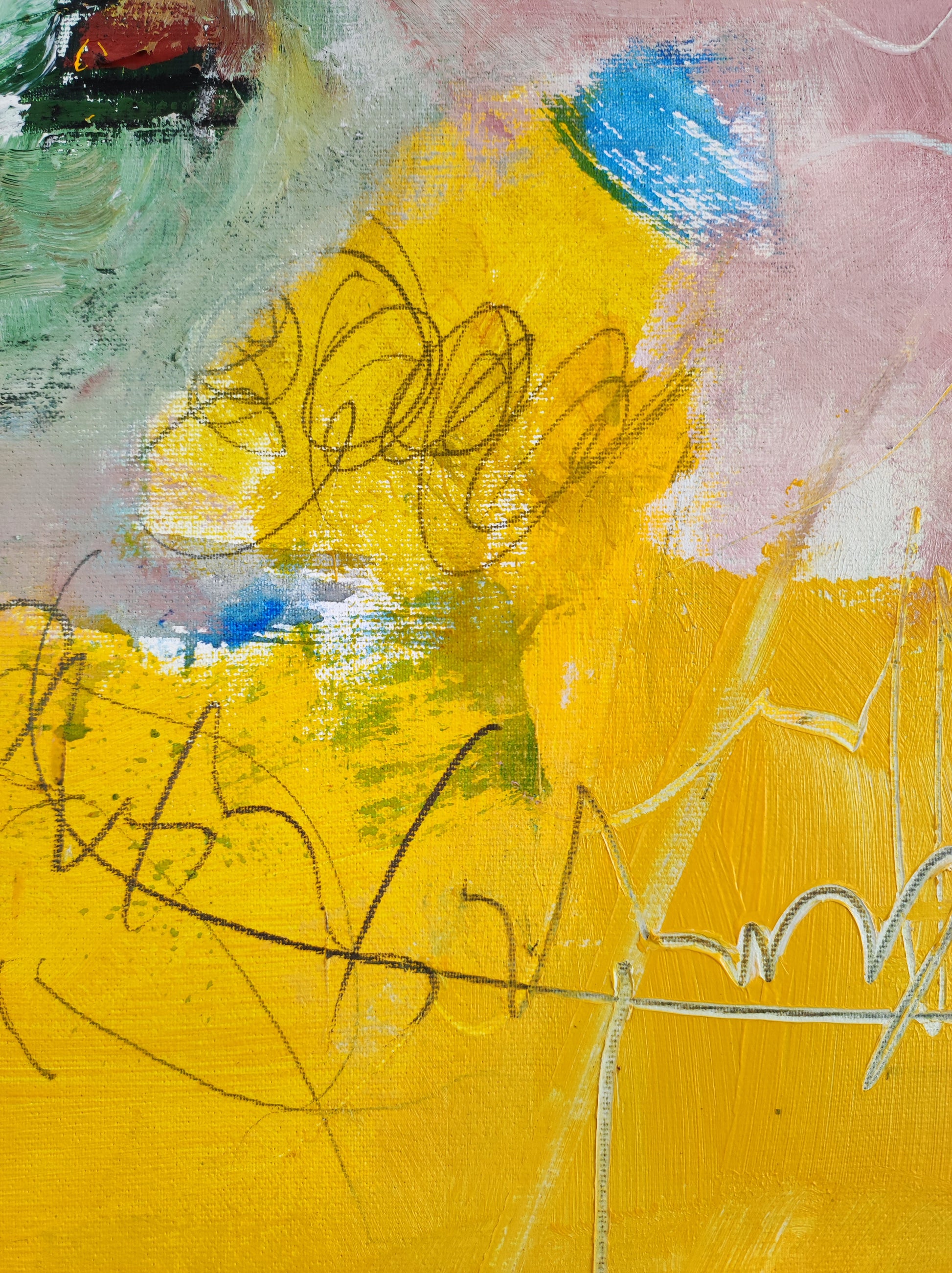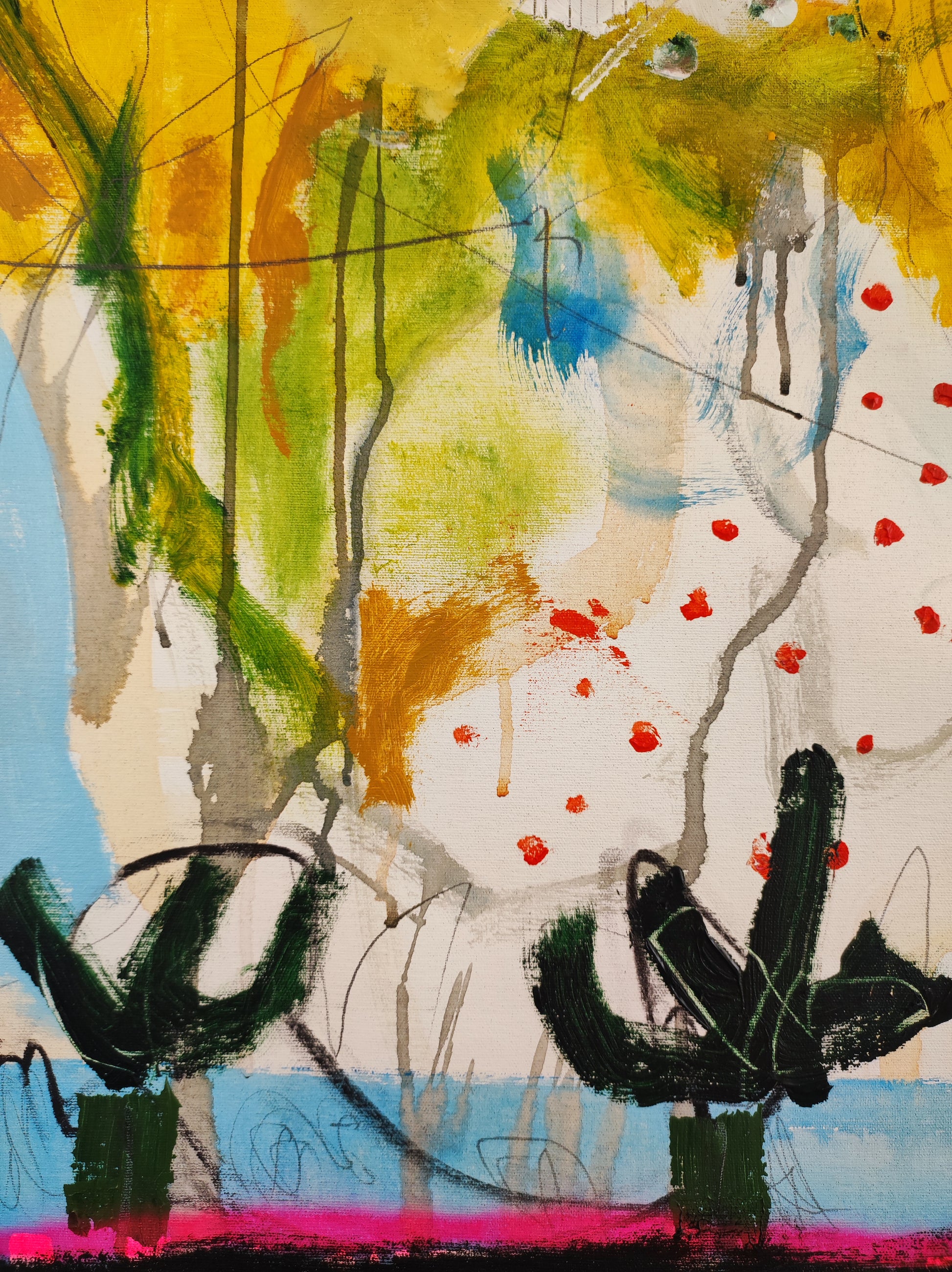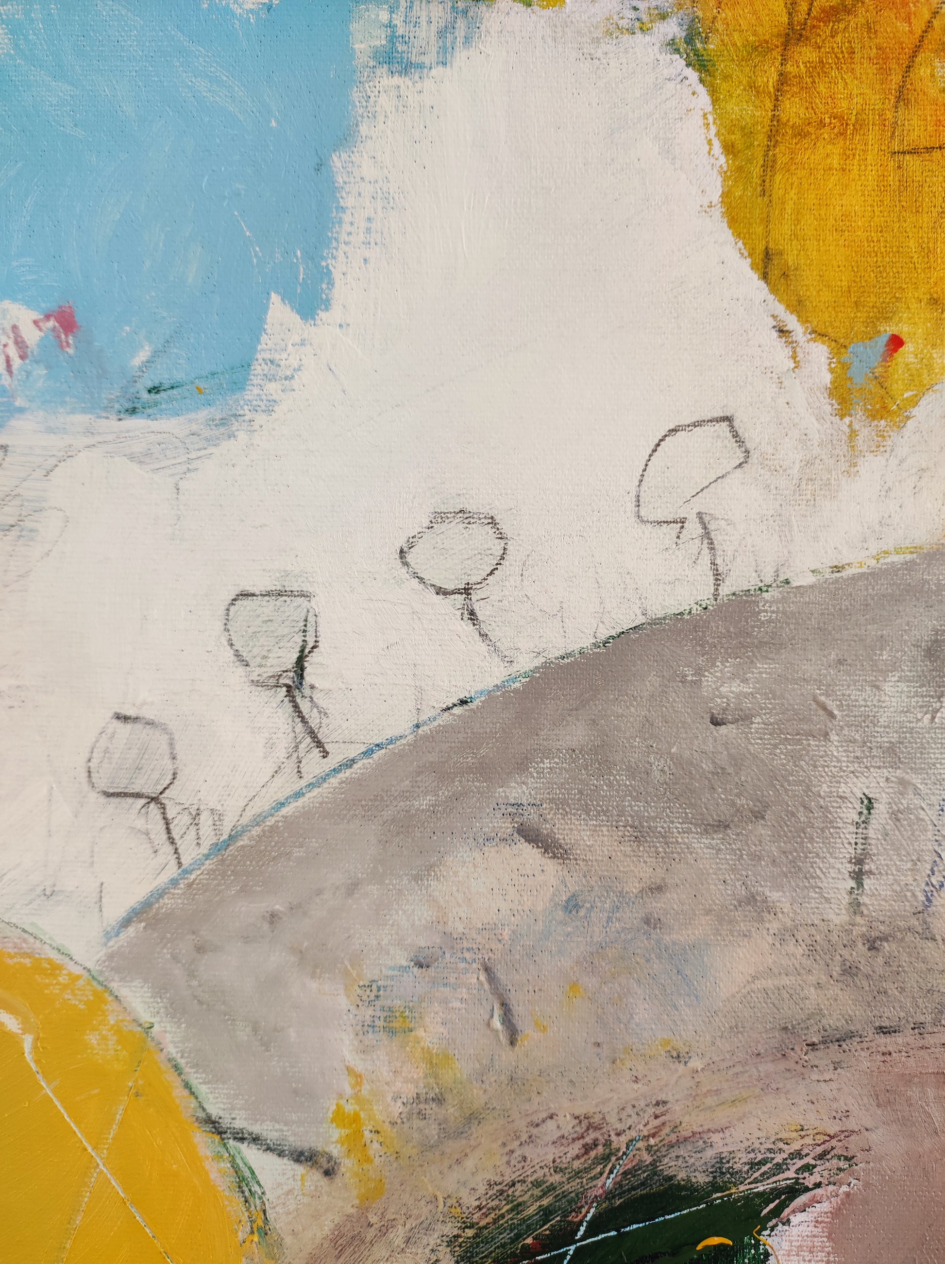 Pintura gestual, intuitiva, que deja que las cosas pasen y se apoya sobre lo que aparece. Aprovechando el accidente y aceptando las consecuencias.