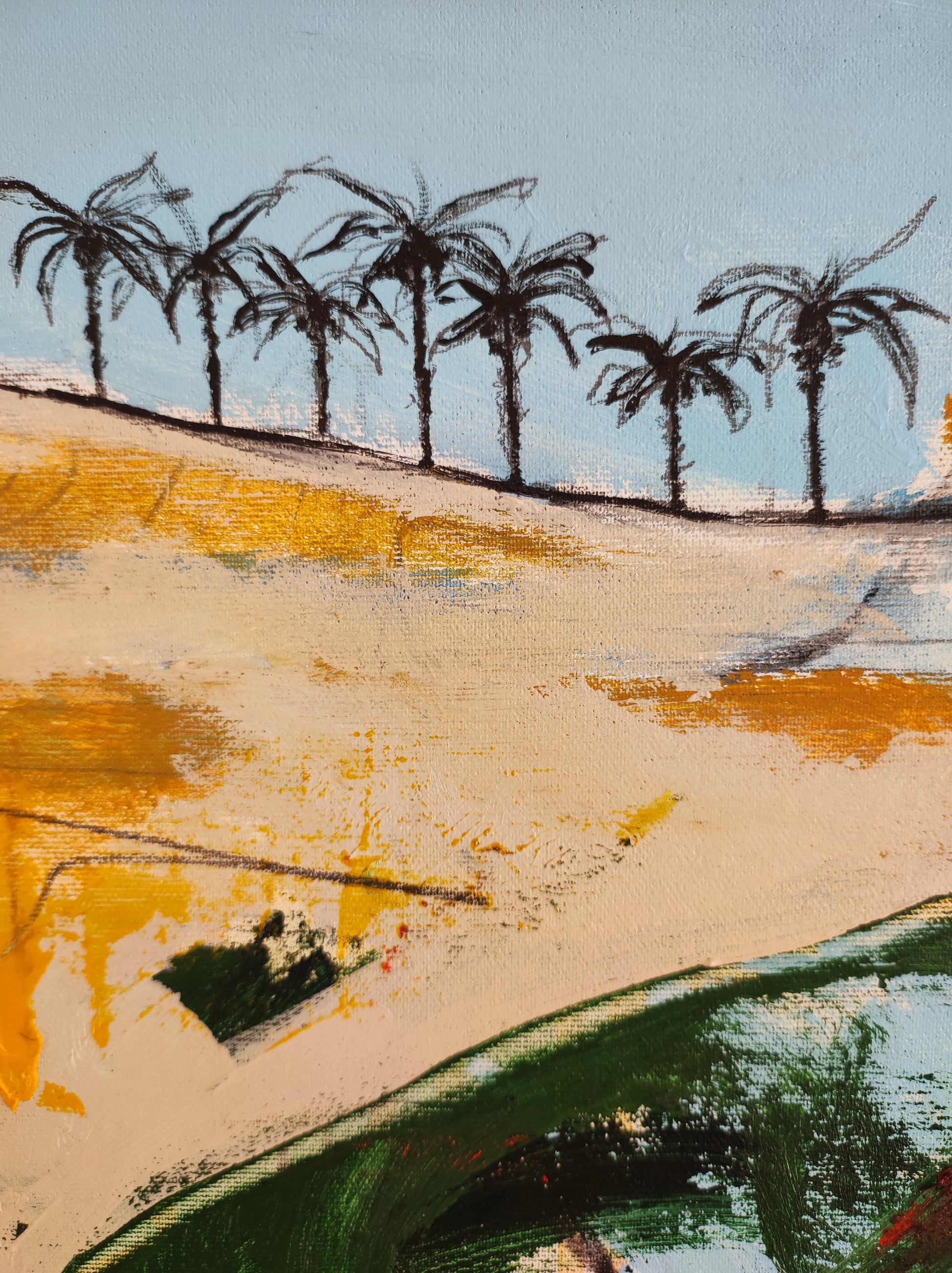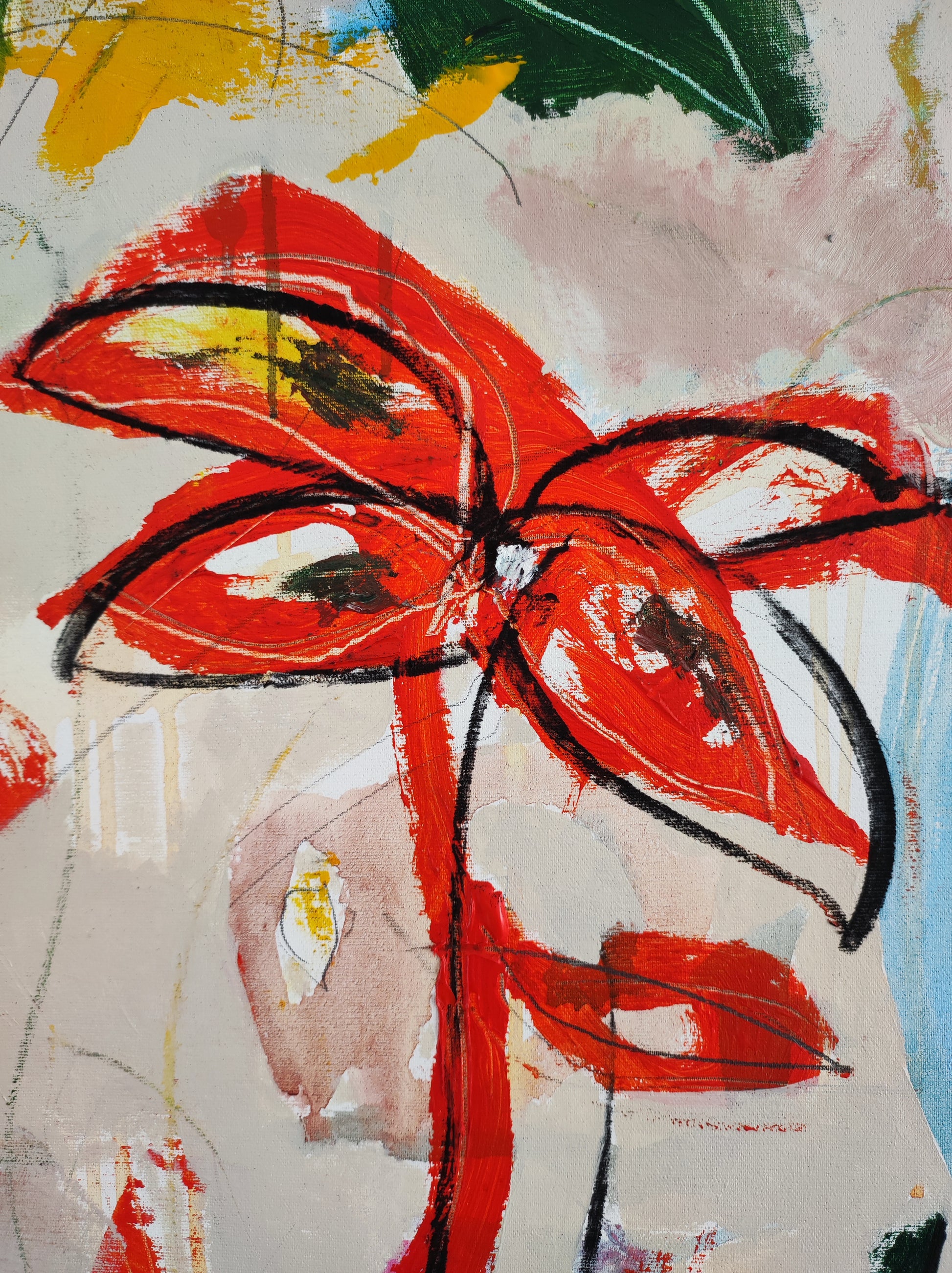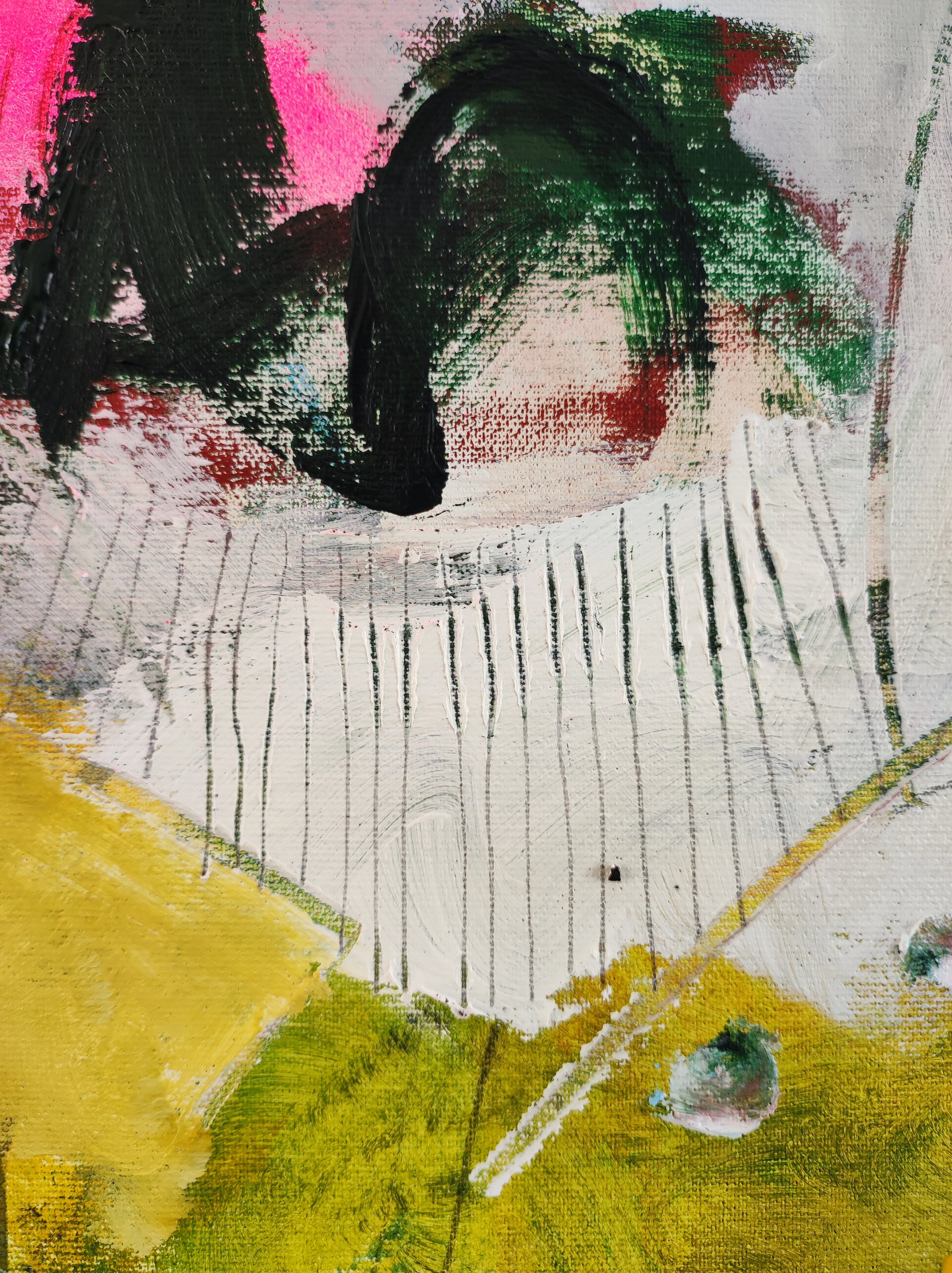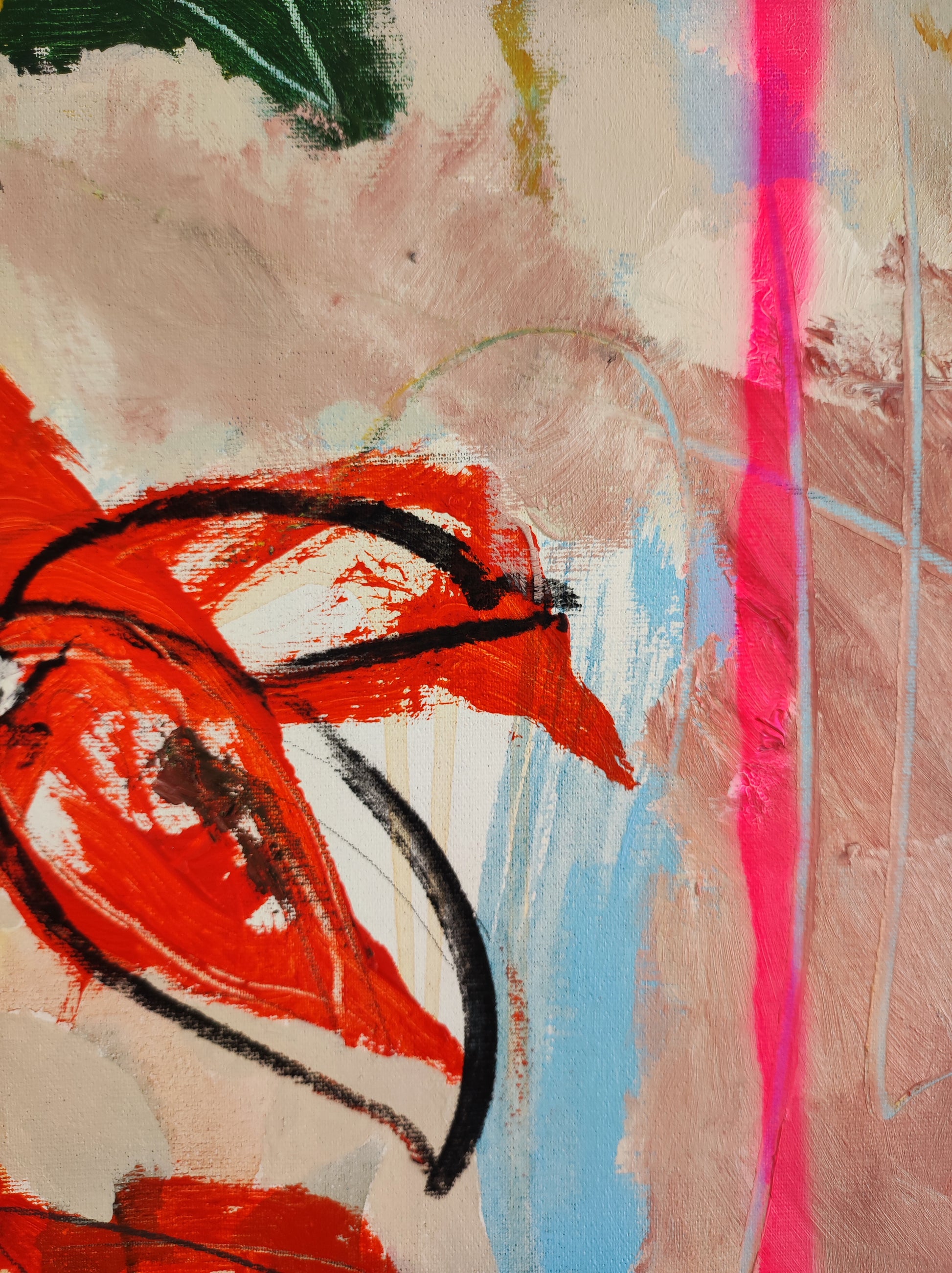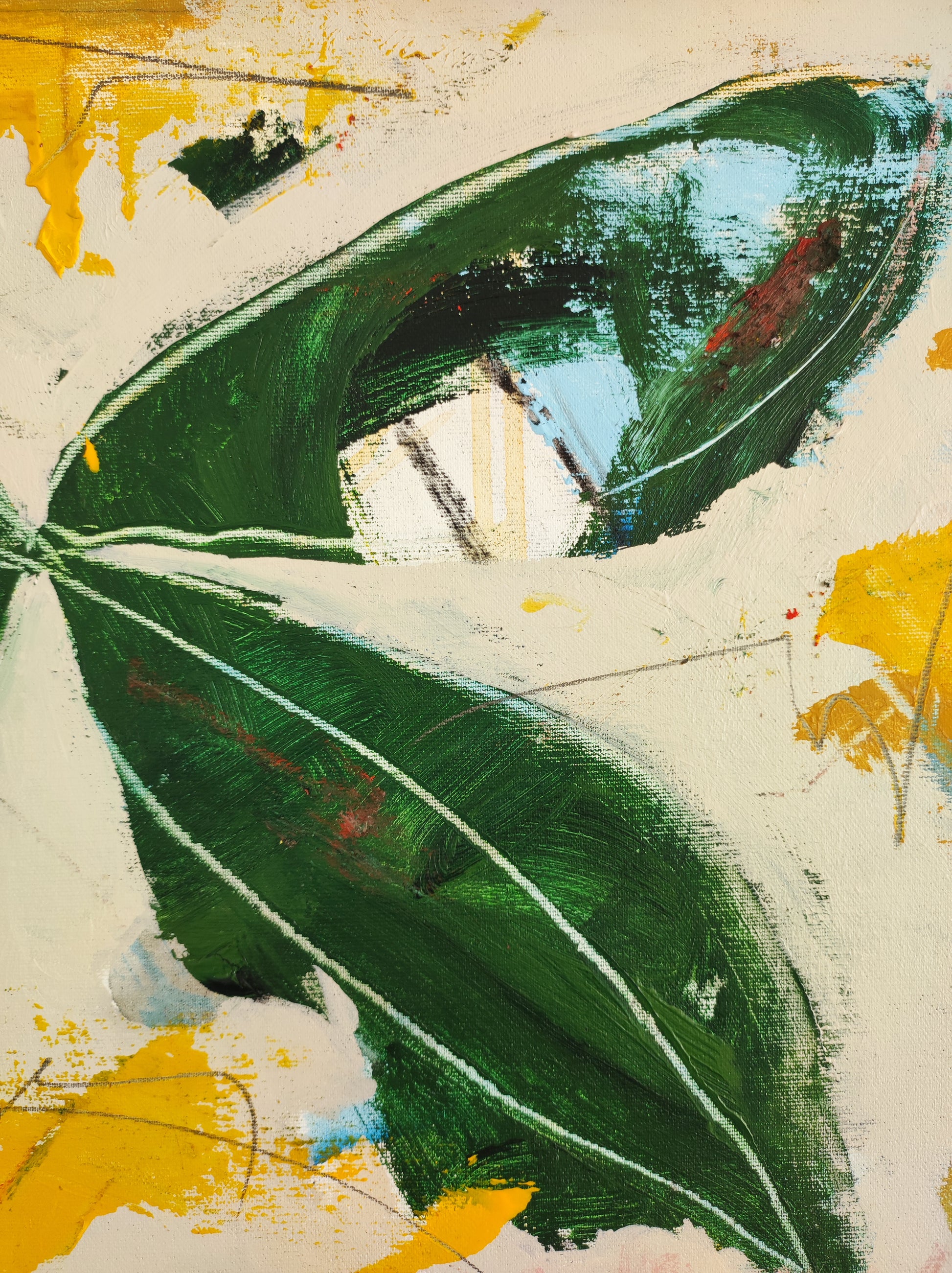 Pintura gestual, intuitiva, que deja que las cosas pasen y se apoya sobre lo que aparece. Aprovechando el accidente y aceptando las consecuencias.