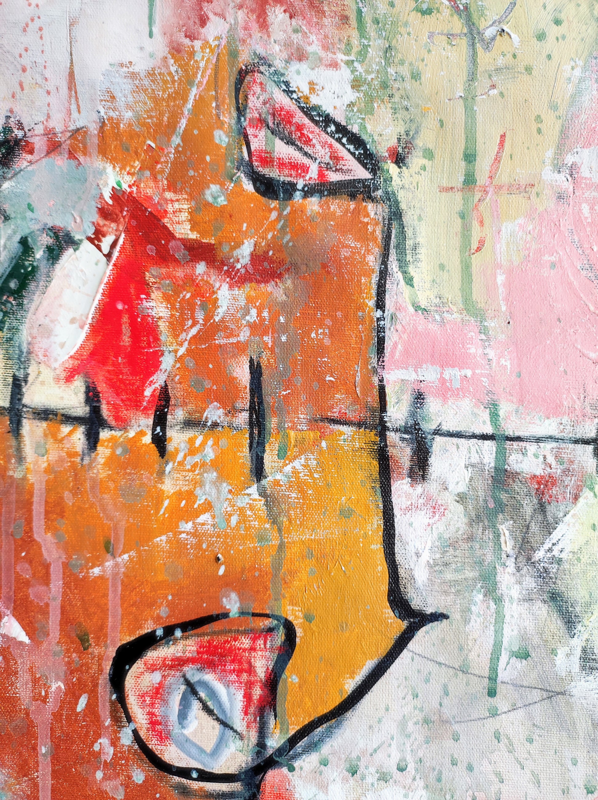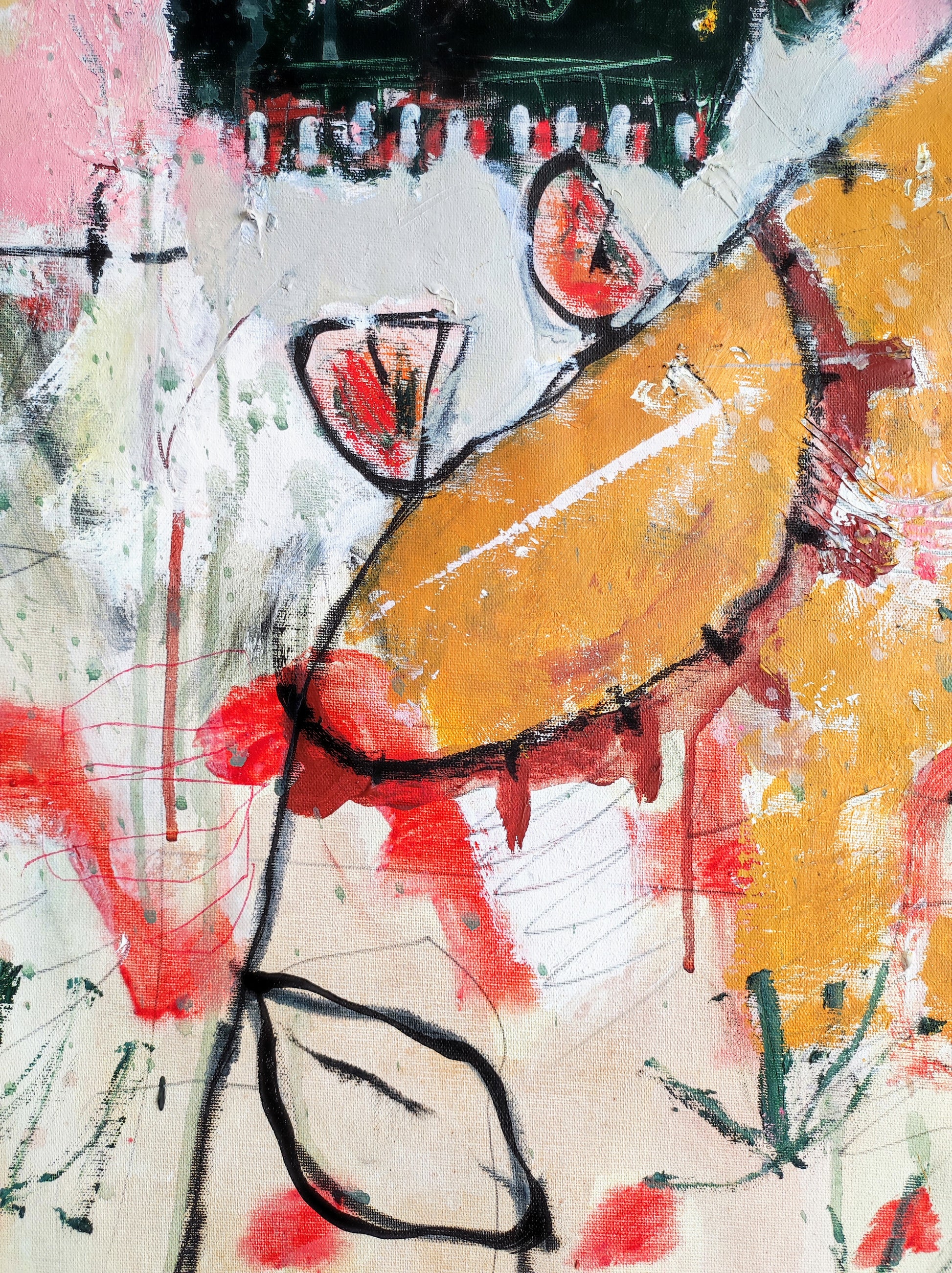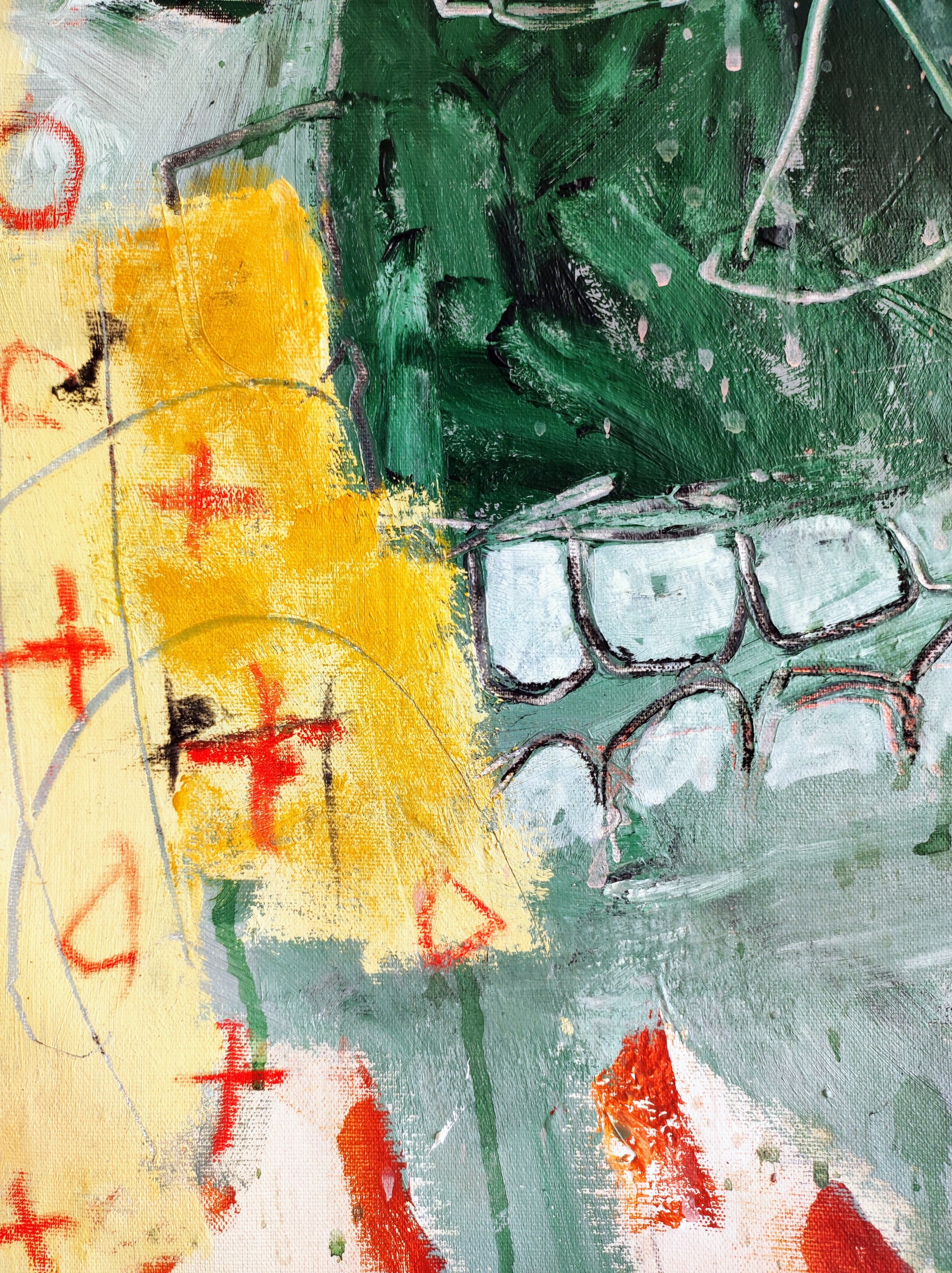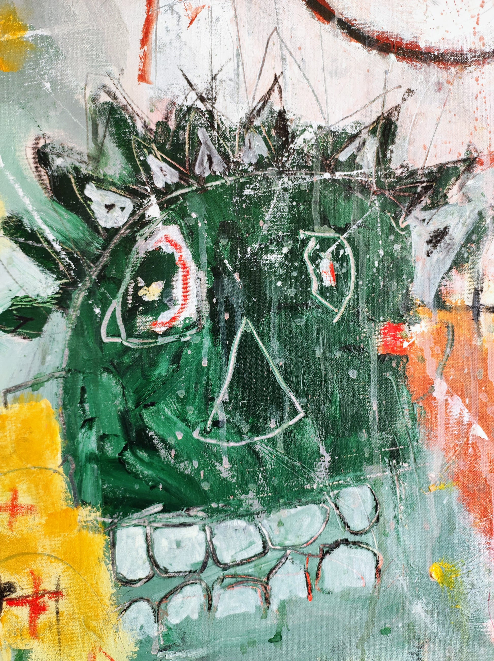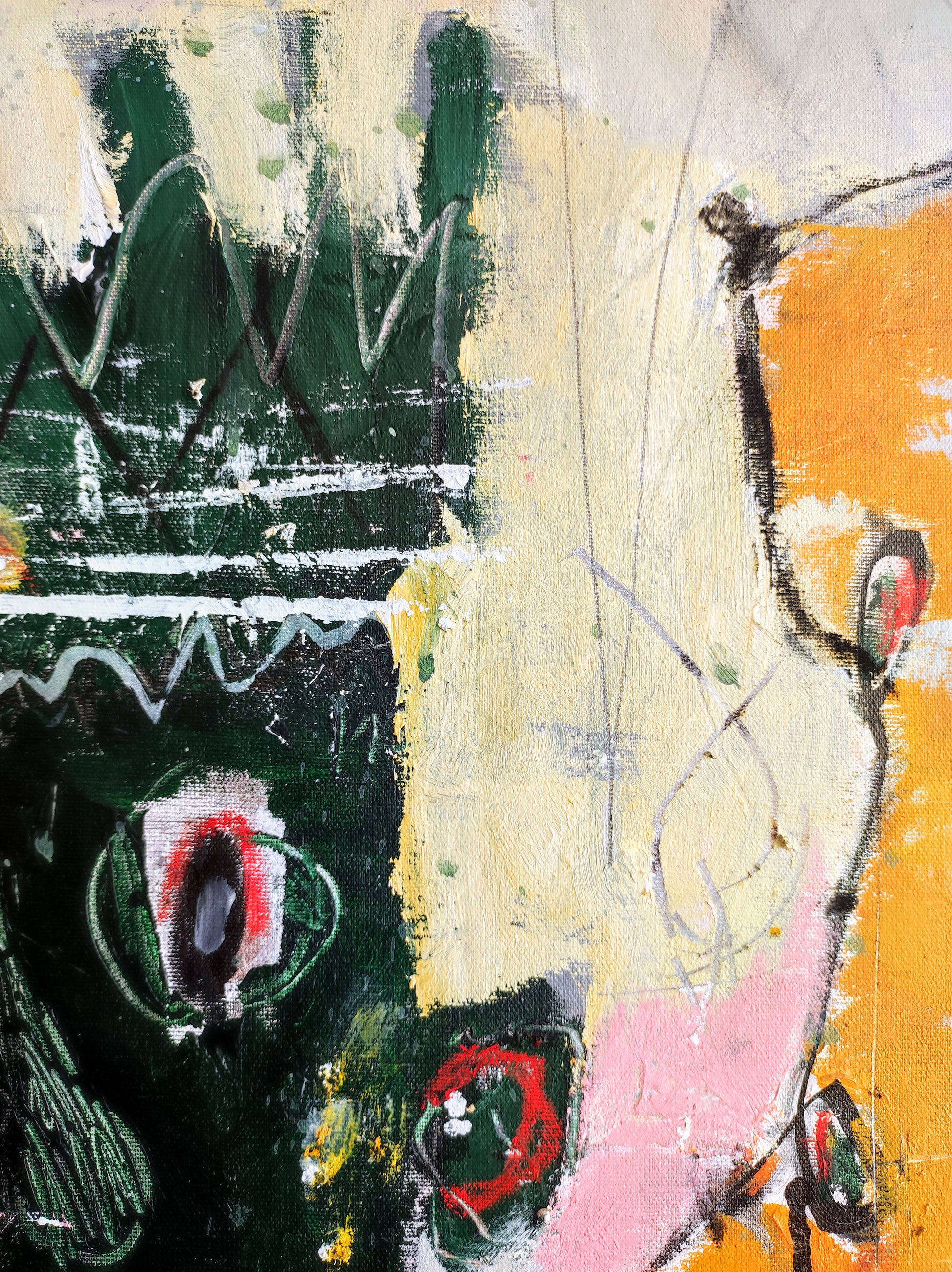 Pintura gestual e intuitiva que va generando marcas y manchas de color que se simplifican y se vuelven a complicar. Lo nuevo tapa a lo viejo, pero siempre queda algo.