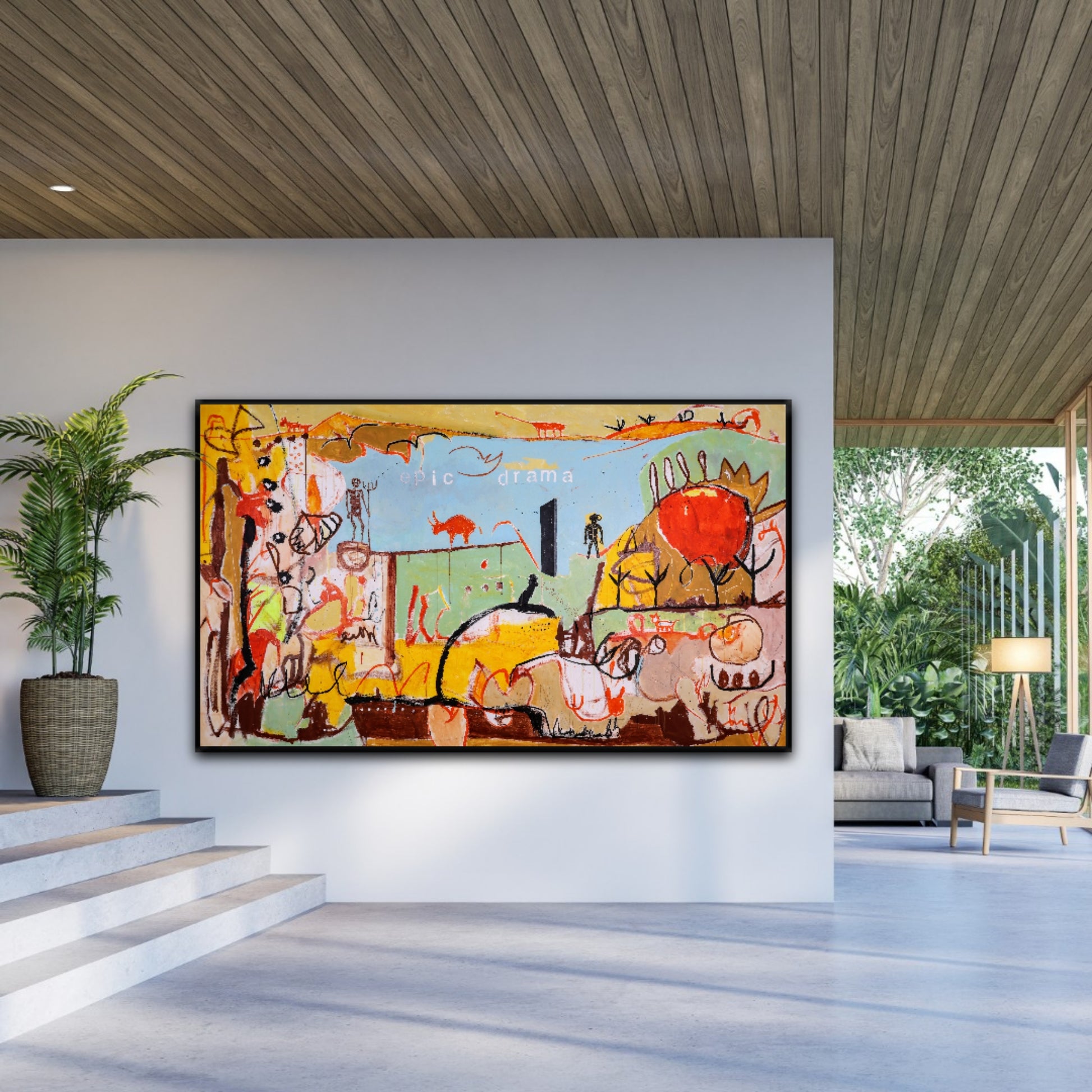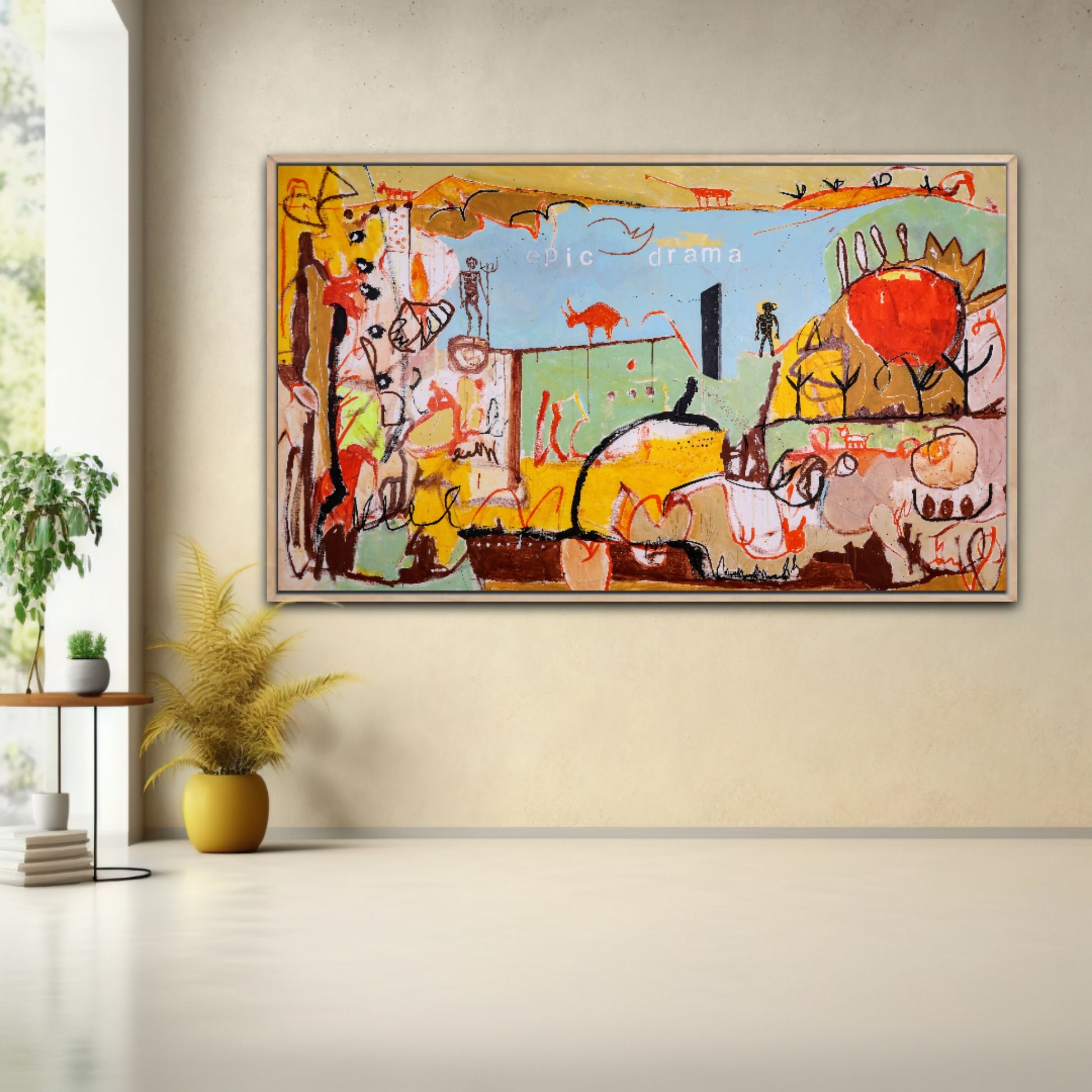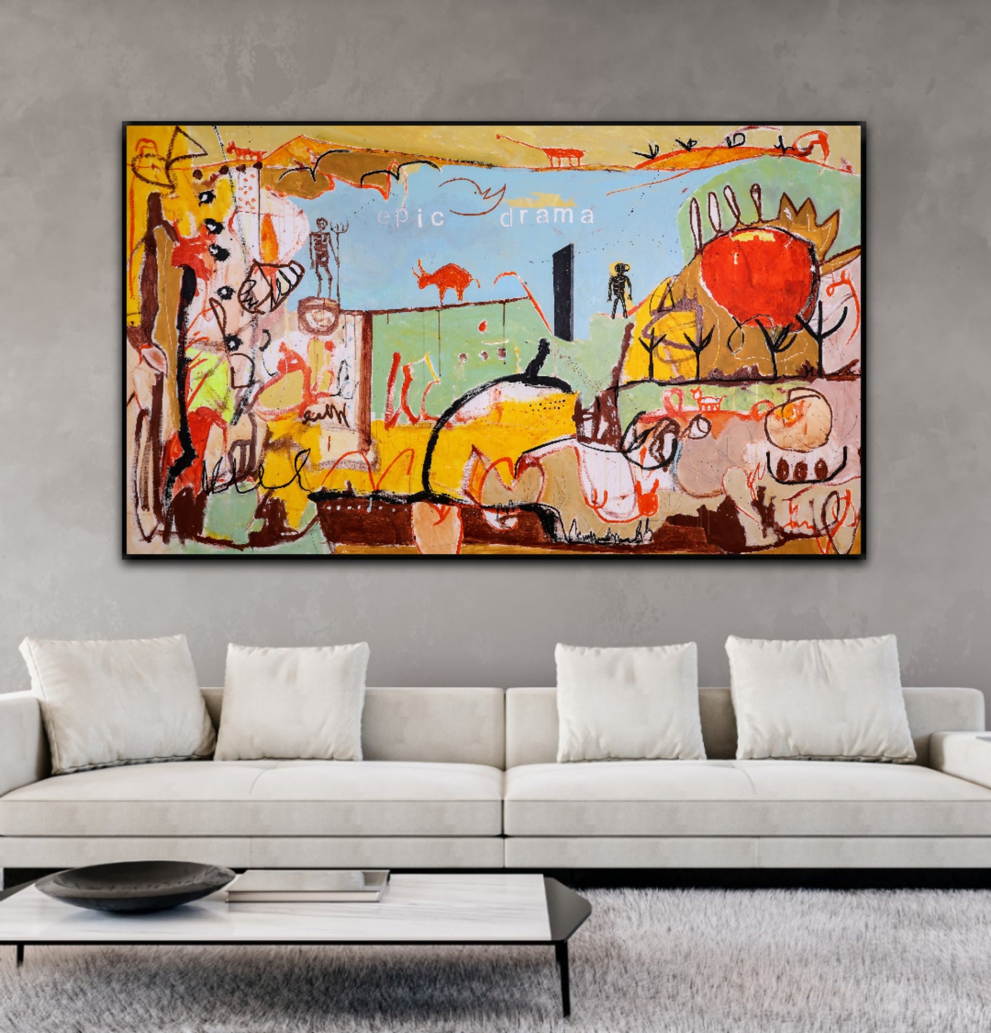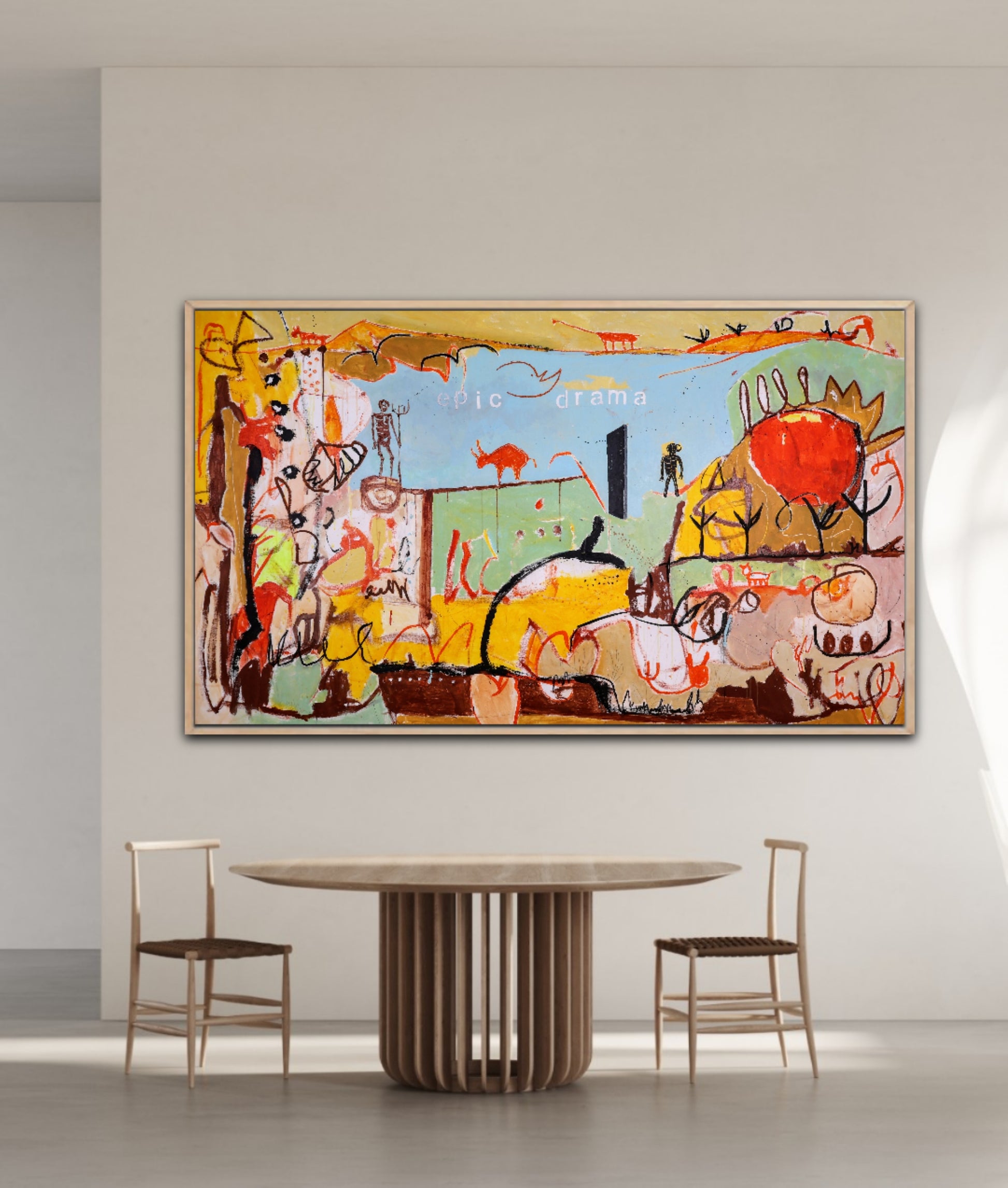 Técnica: acrílico, pigmentos, ceras, tempera, gesso, pastel, carboncillo y lápiz.