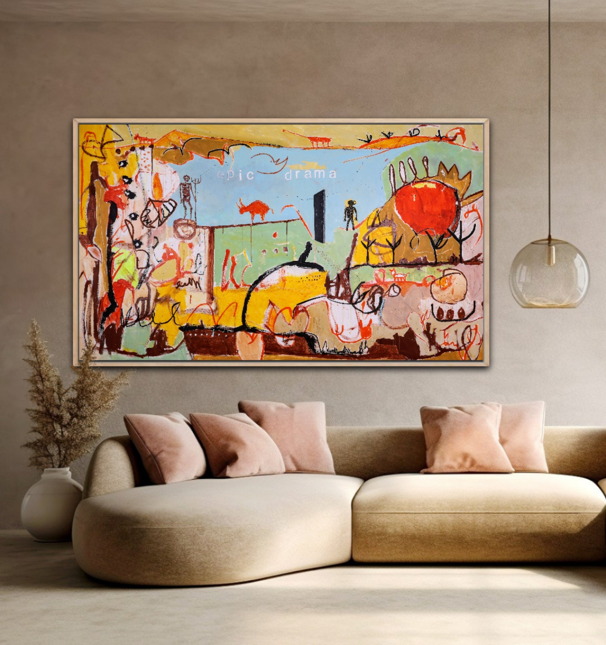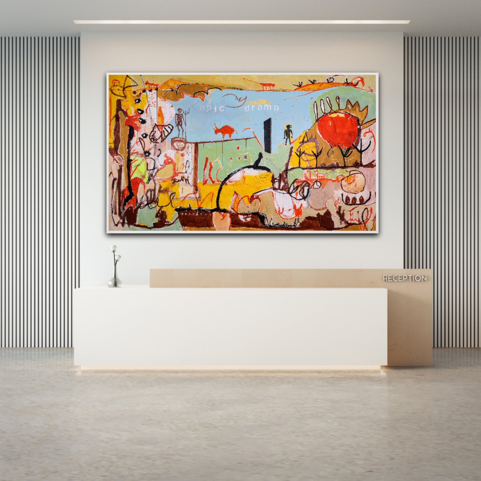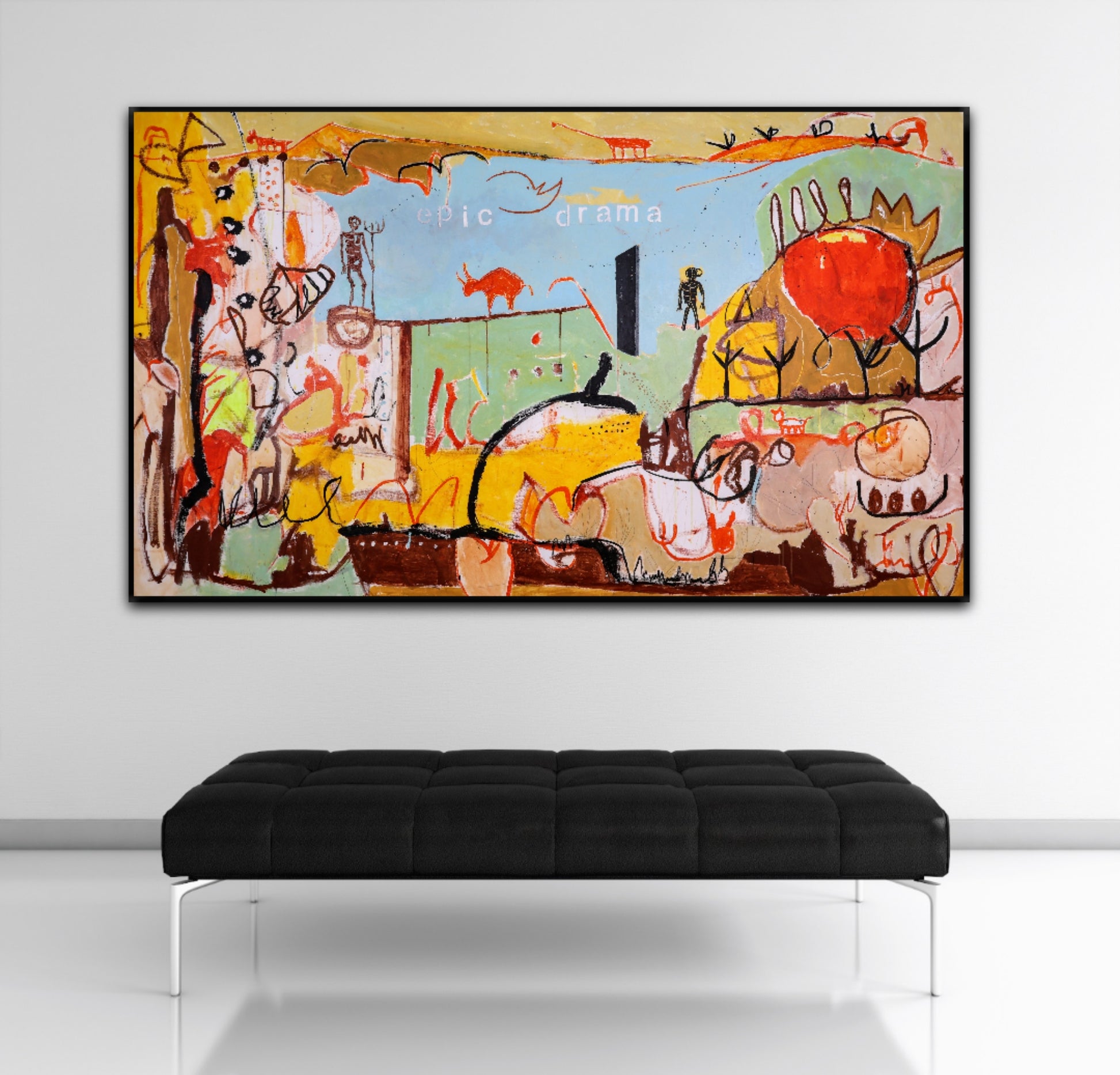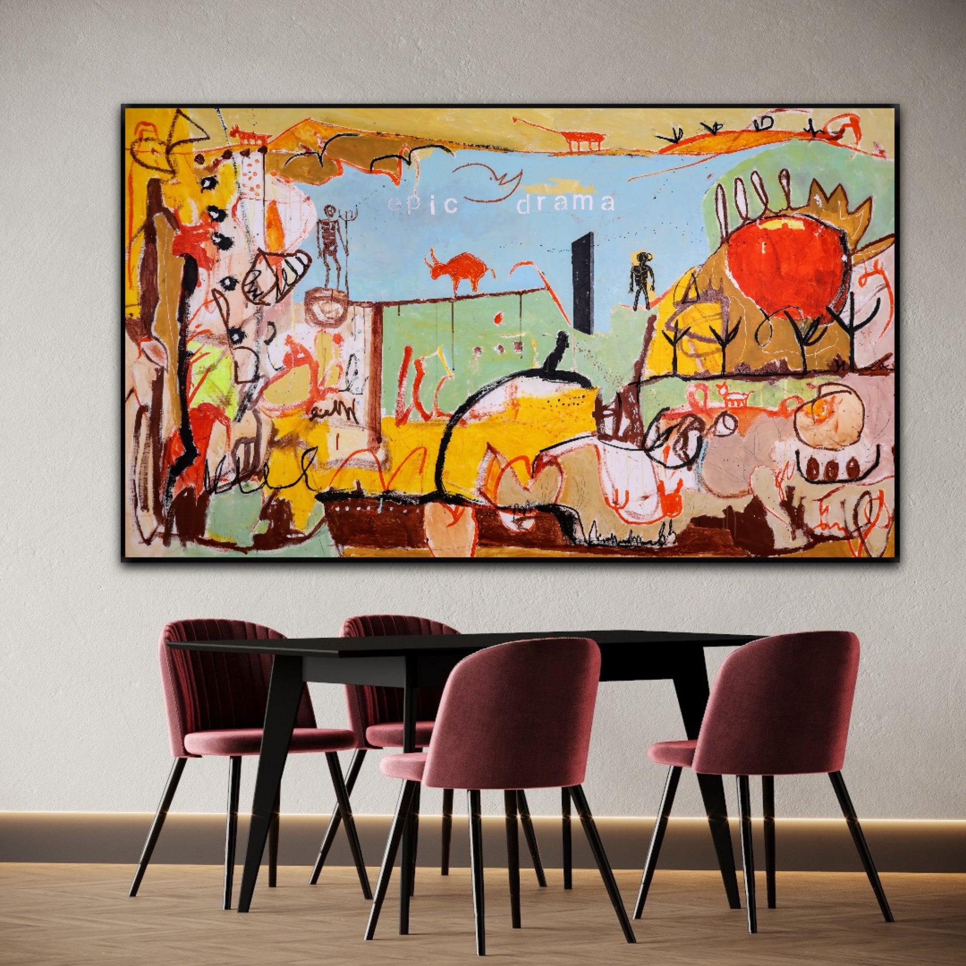 Técnica: acrílico, pigmentos, ceras, tempera, gesso, pastel, carboncillo y lápiz.