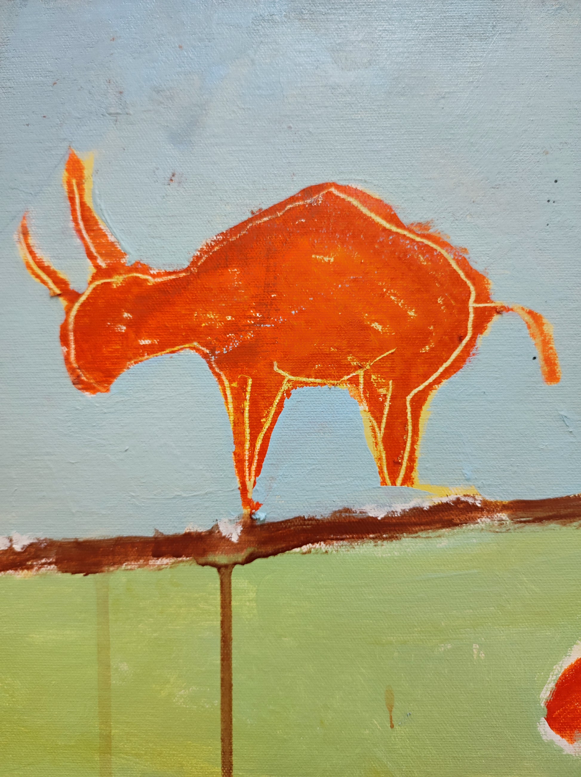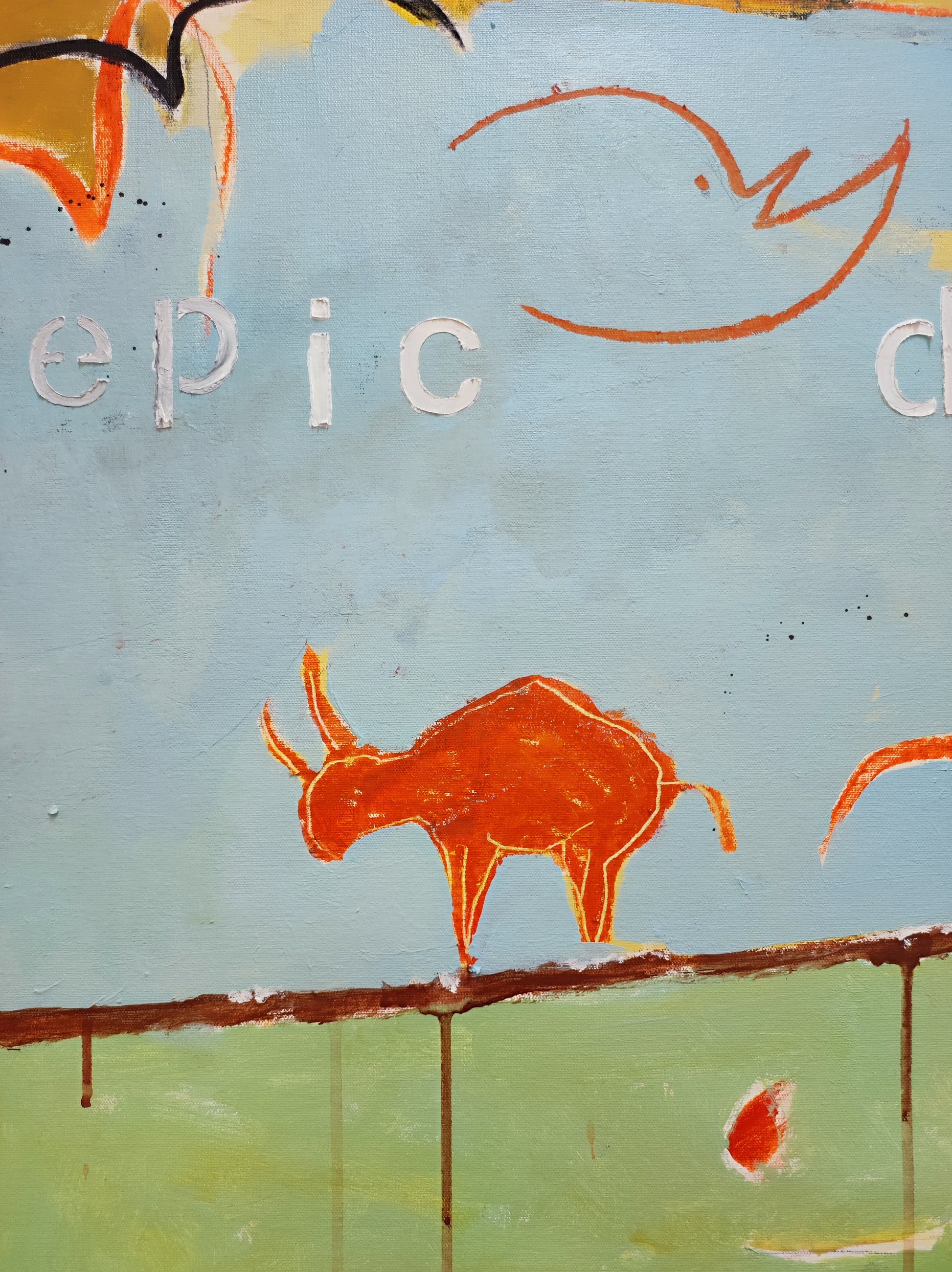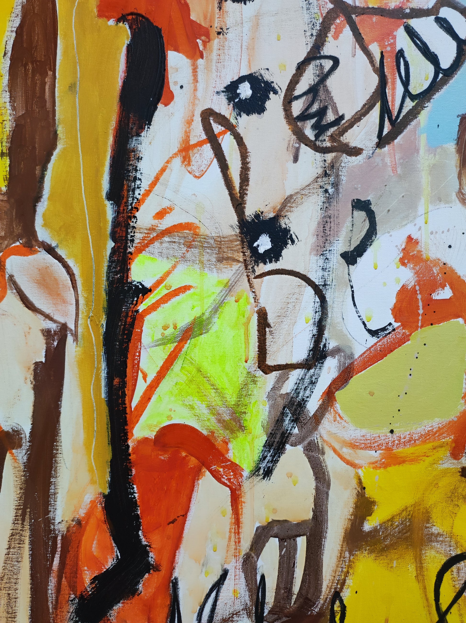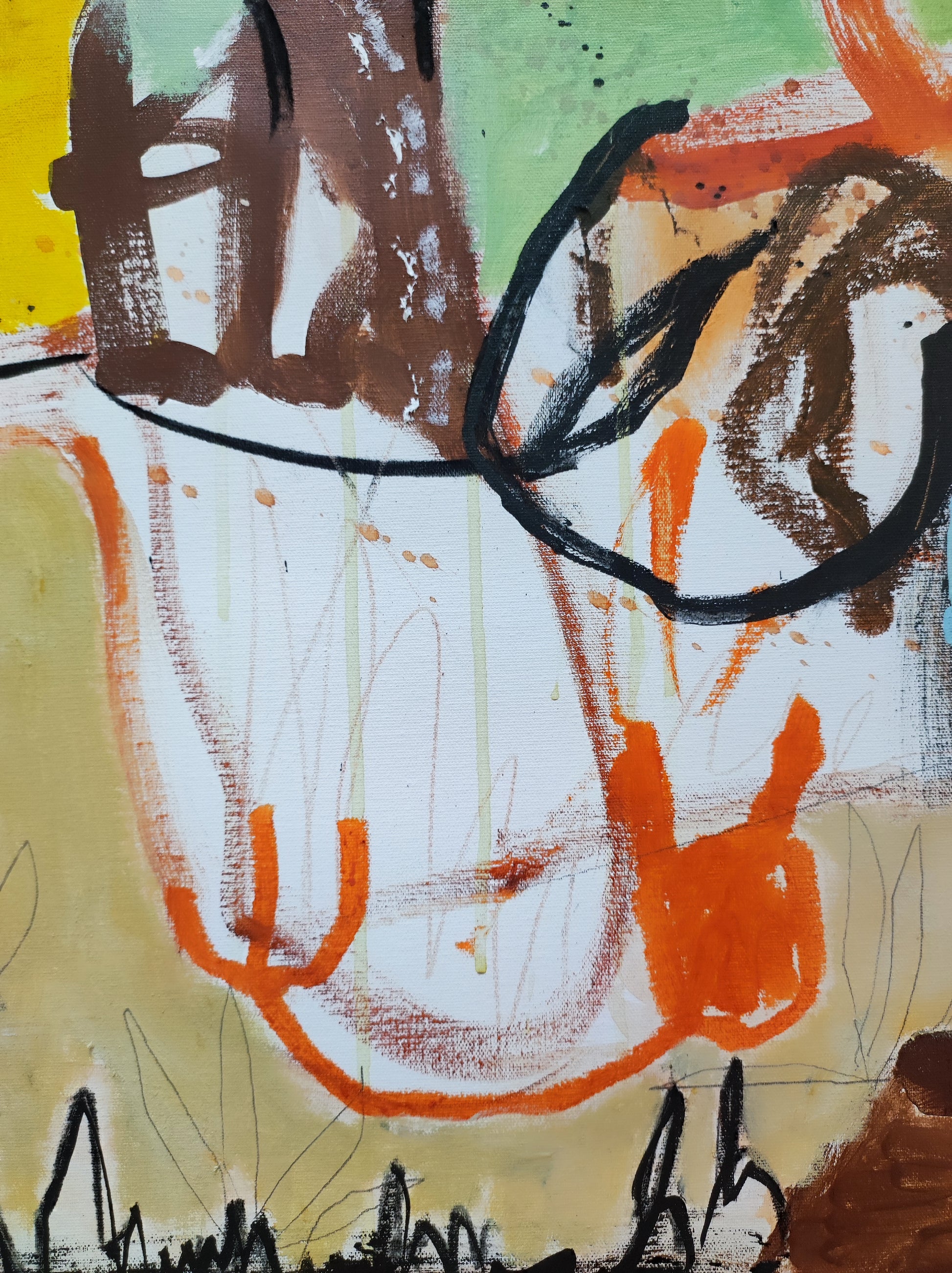 Pintura gestual, intuitiva, que deja que las cosas pasen y se apoya sobre lo que aparece. Aprovechando el accidente y aceptando las consecuencias.