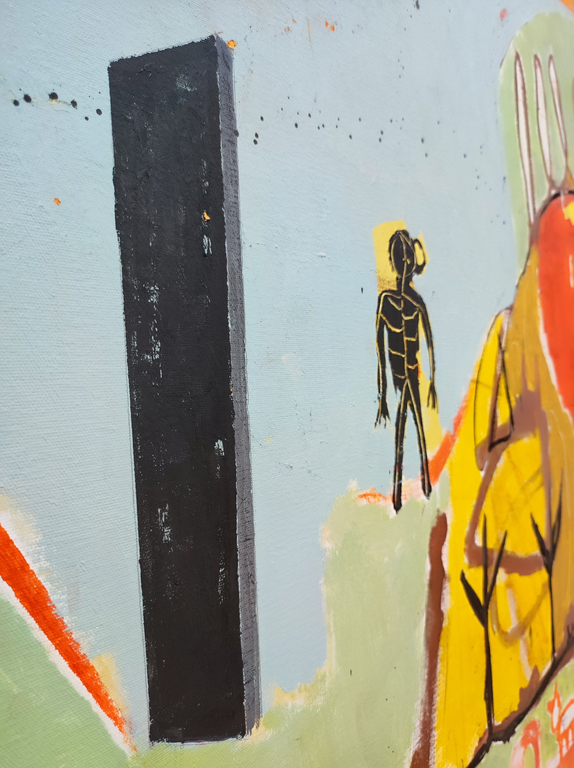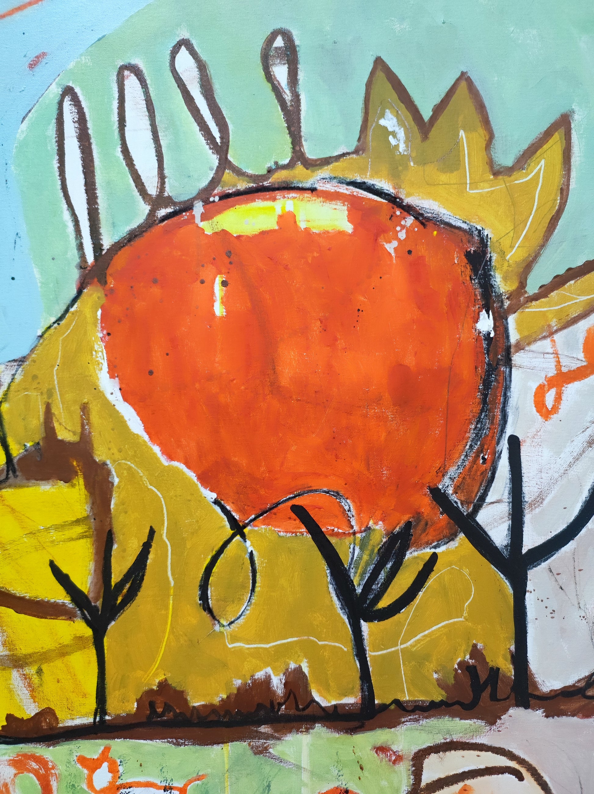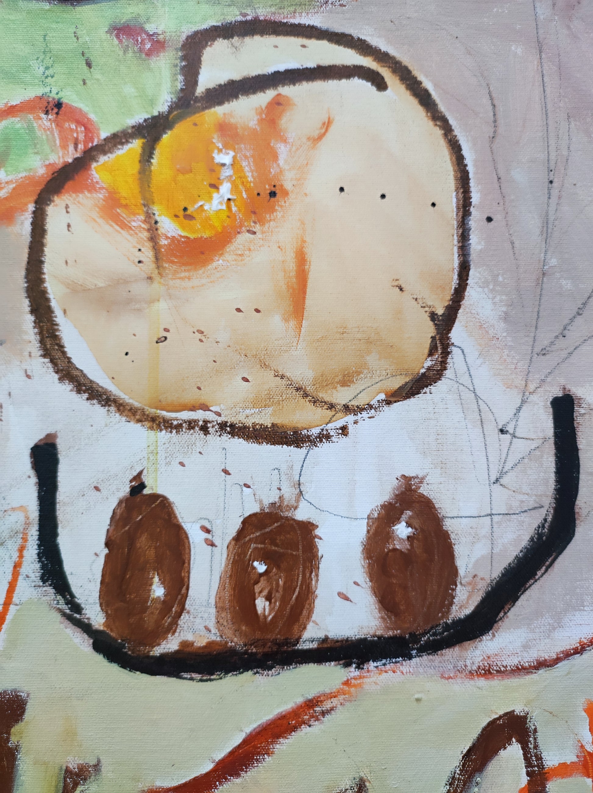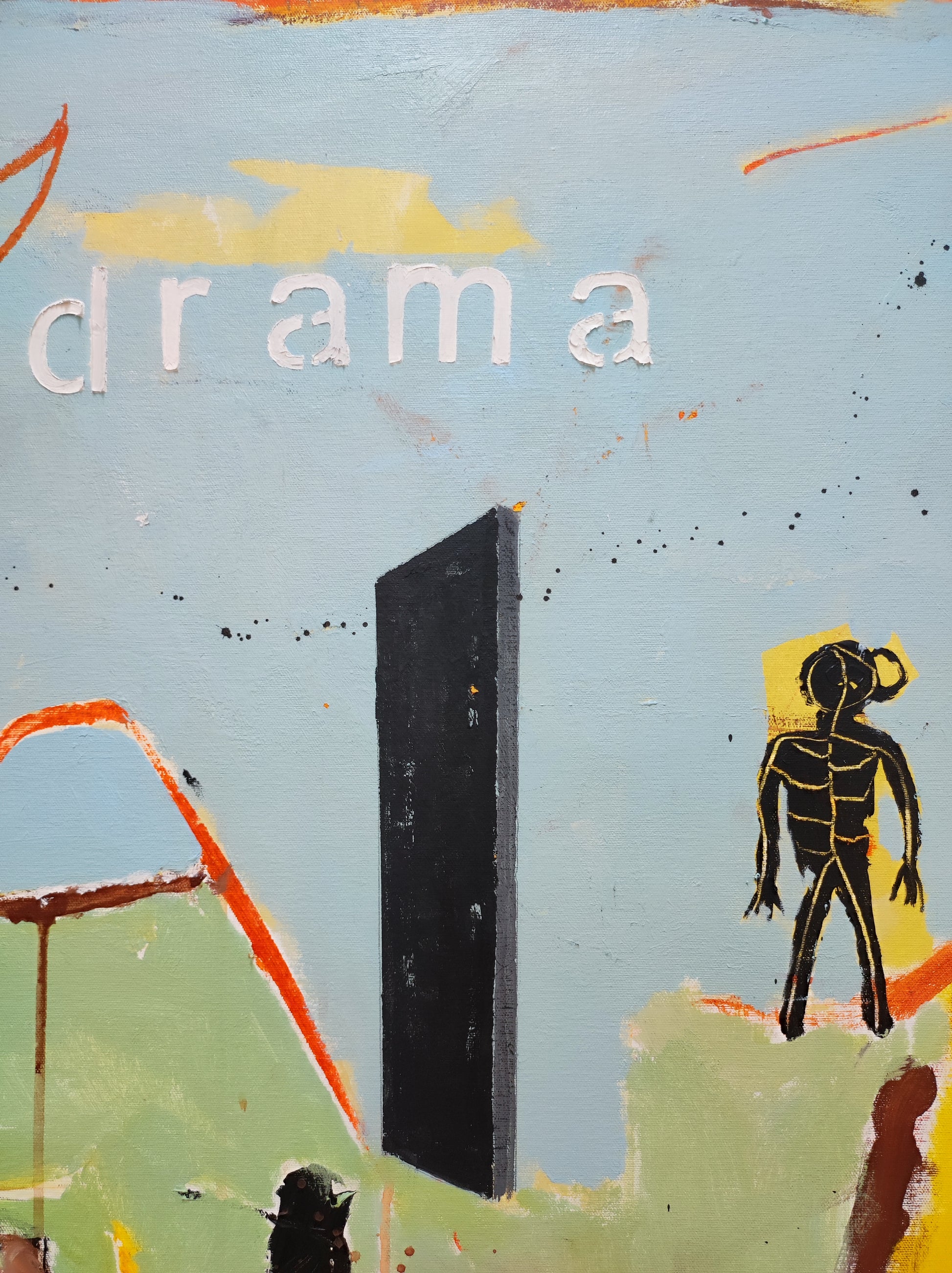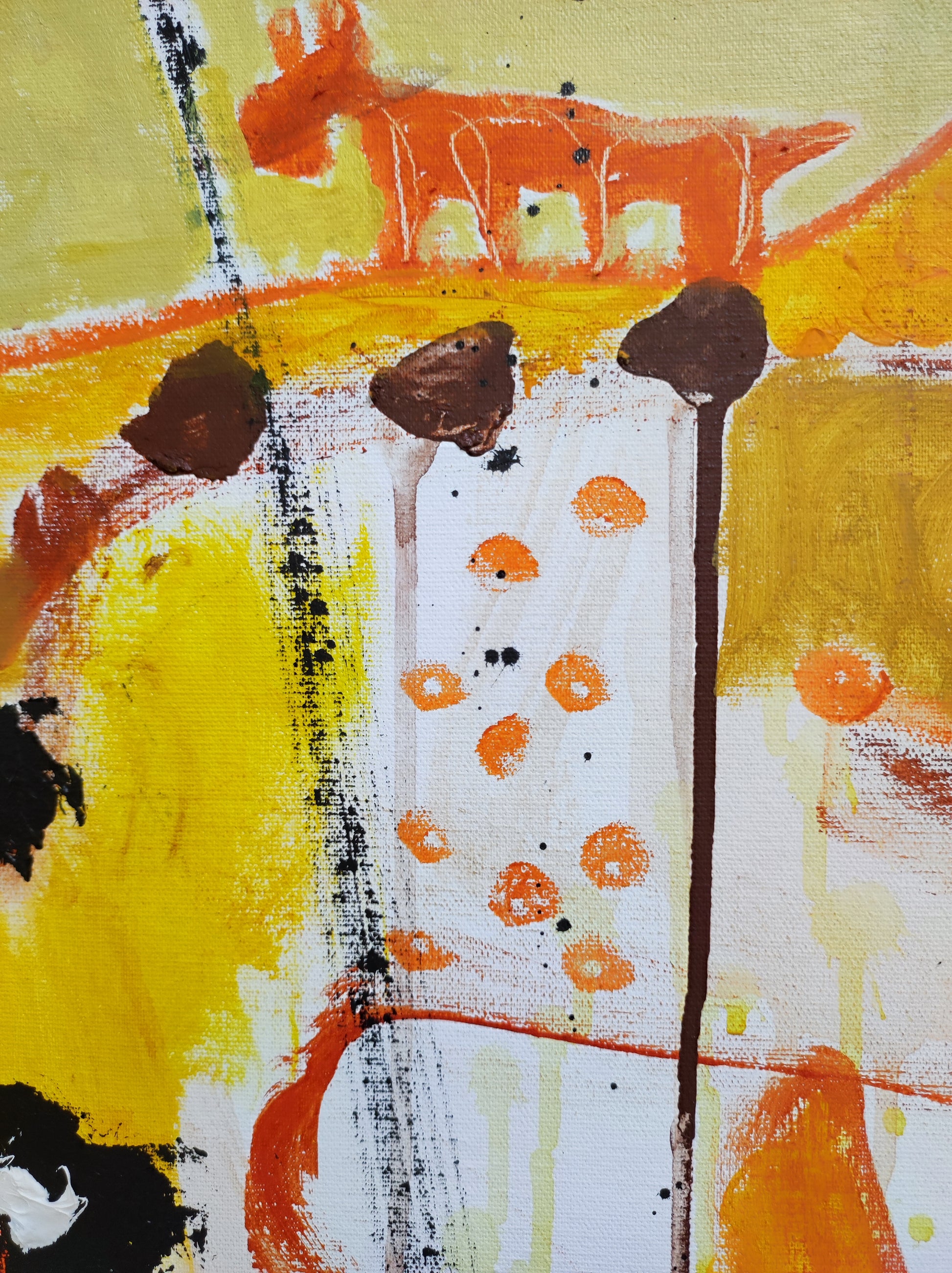 Pintura gestual, intuitiva, que deja que las cosas pasen y se apoya sobre lo que aparece. Aprovechando el accidente y aceptando las consecuencias.