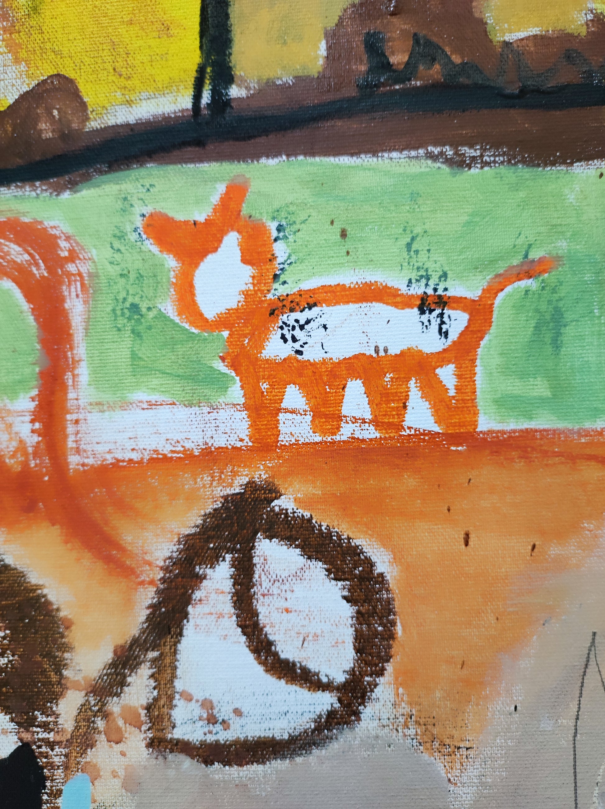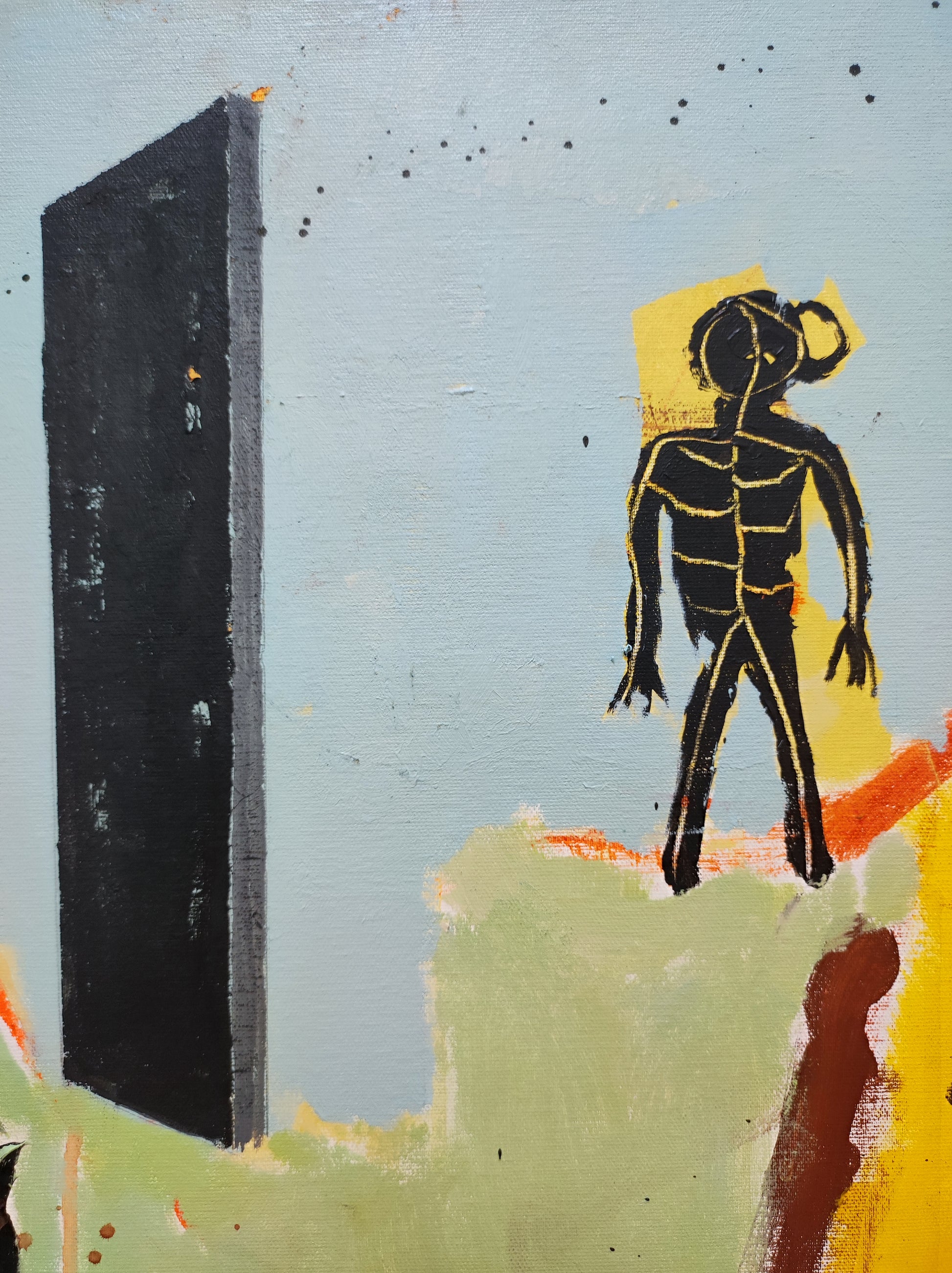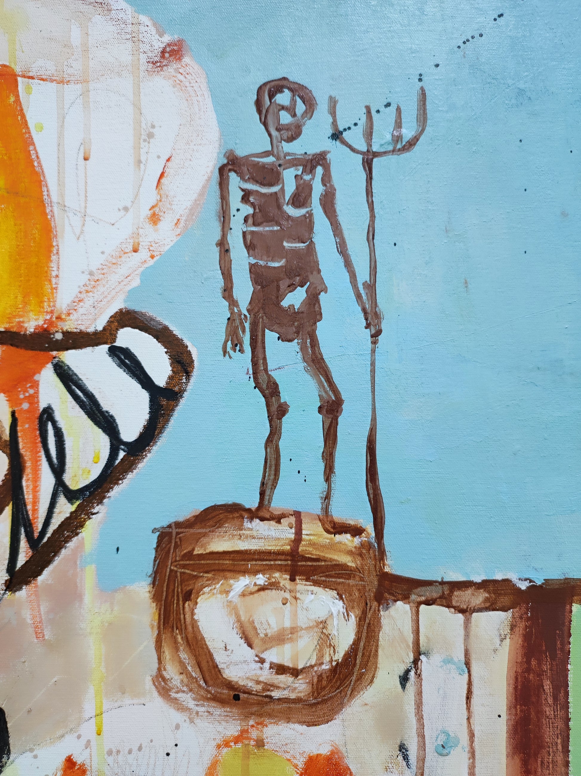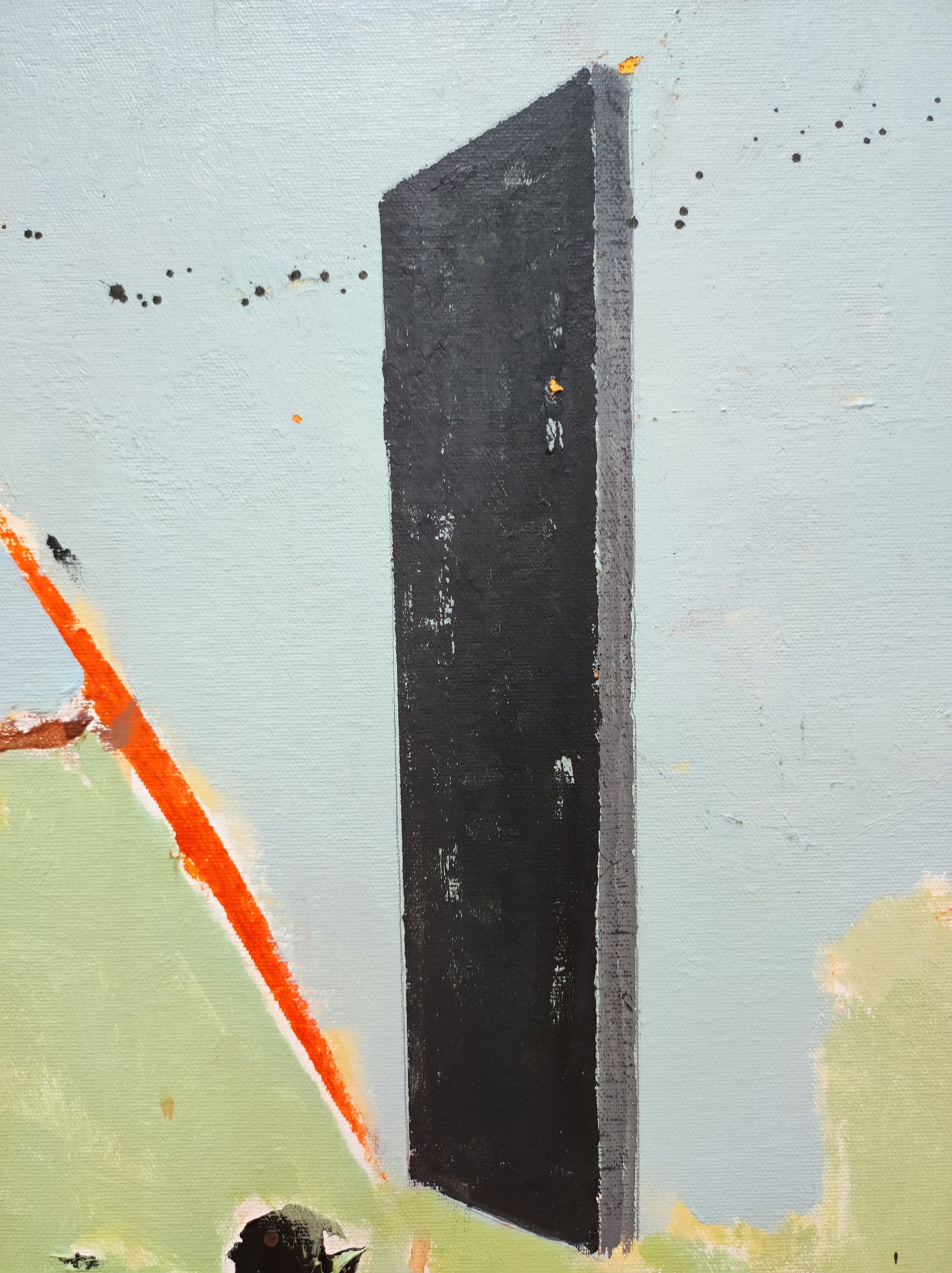 Pintura gestual, intuitiva, que deja que las cosas pasen y se apoya sobre lo que aparece. Aprovechando el accidente y aceptando las consecuencias.