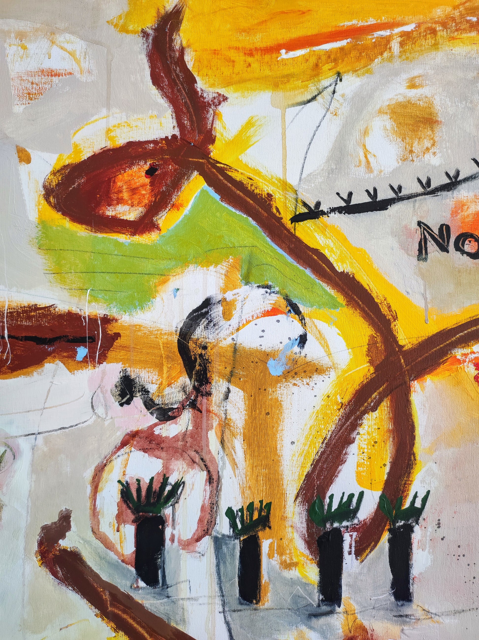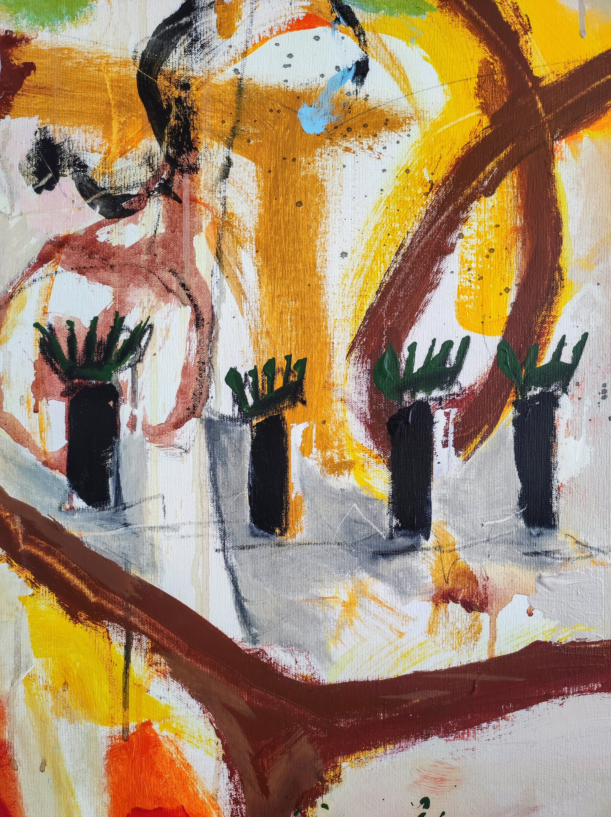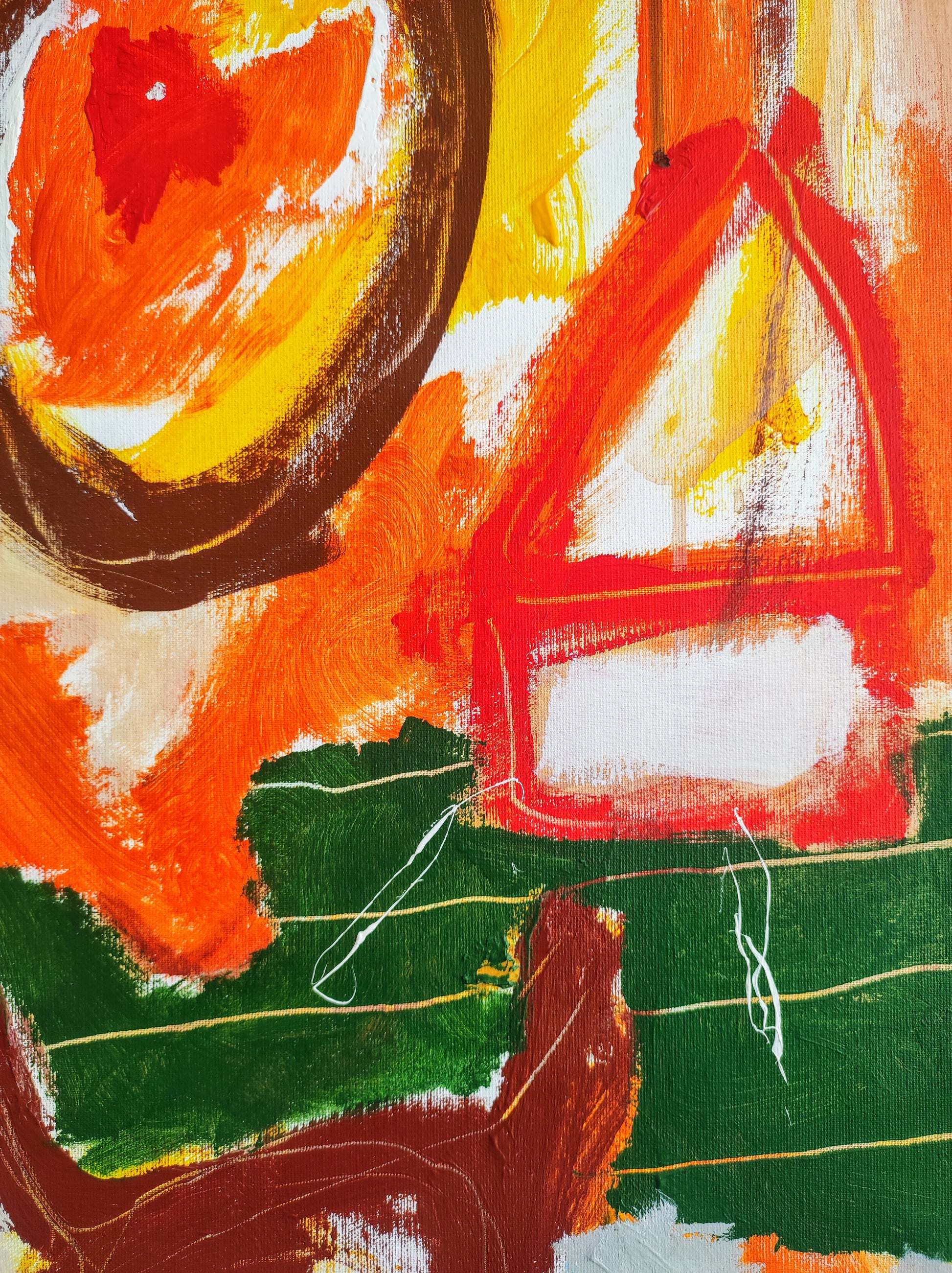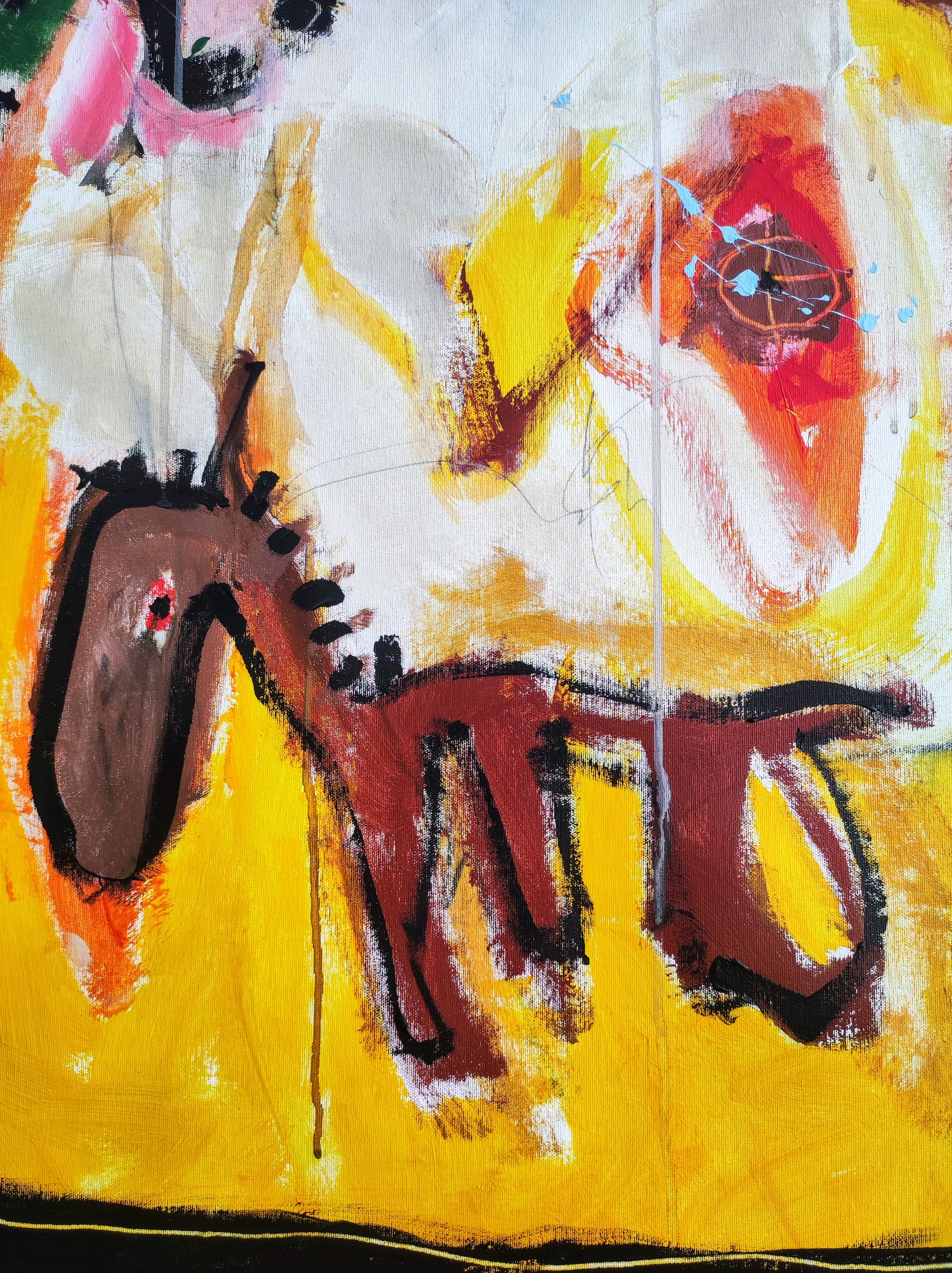 Pintura gestual, intuitiva, que deja que las cosas pasen y se apoya sobre lo que aparece. Aprovechando el accidente y aceptando las consecuencias.