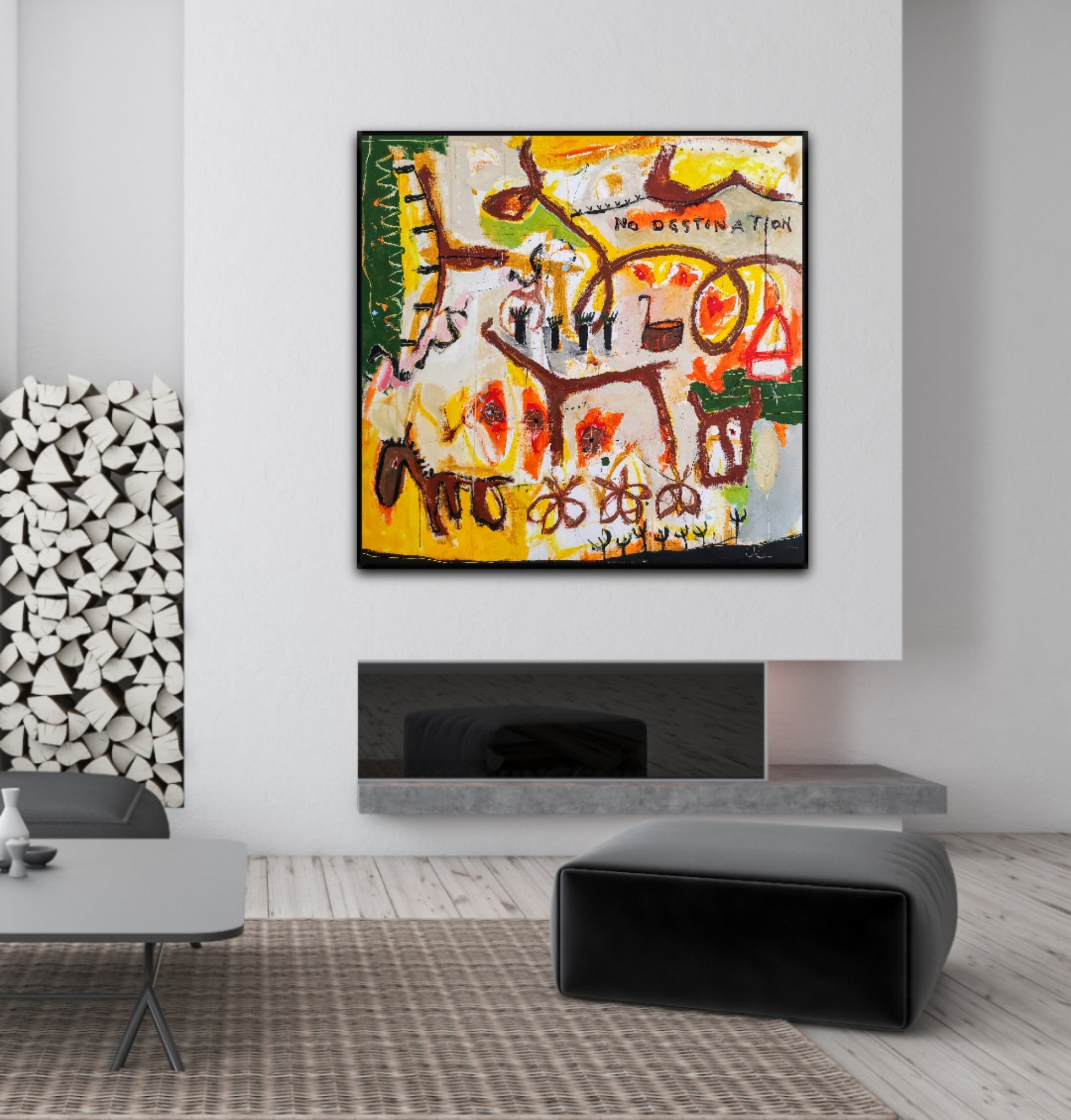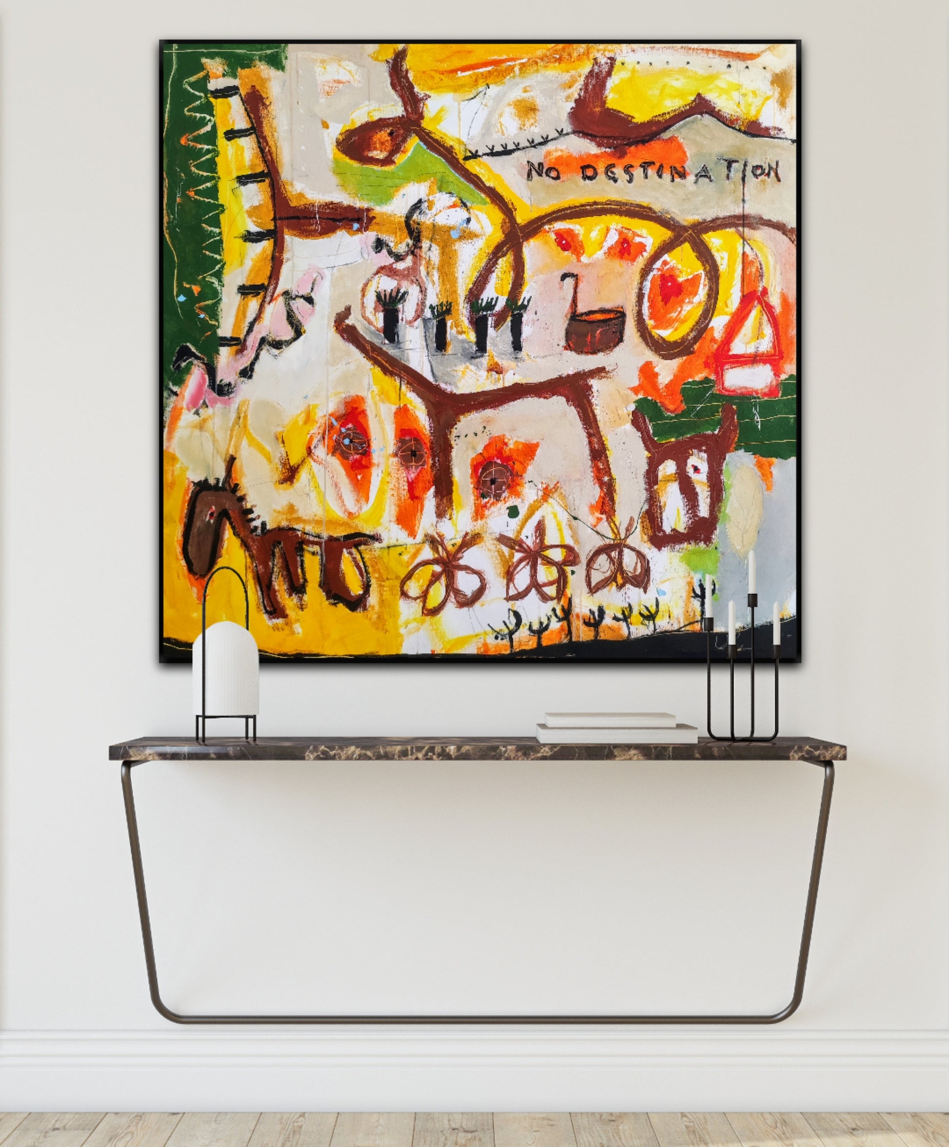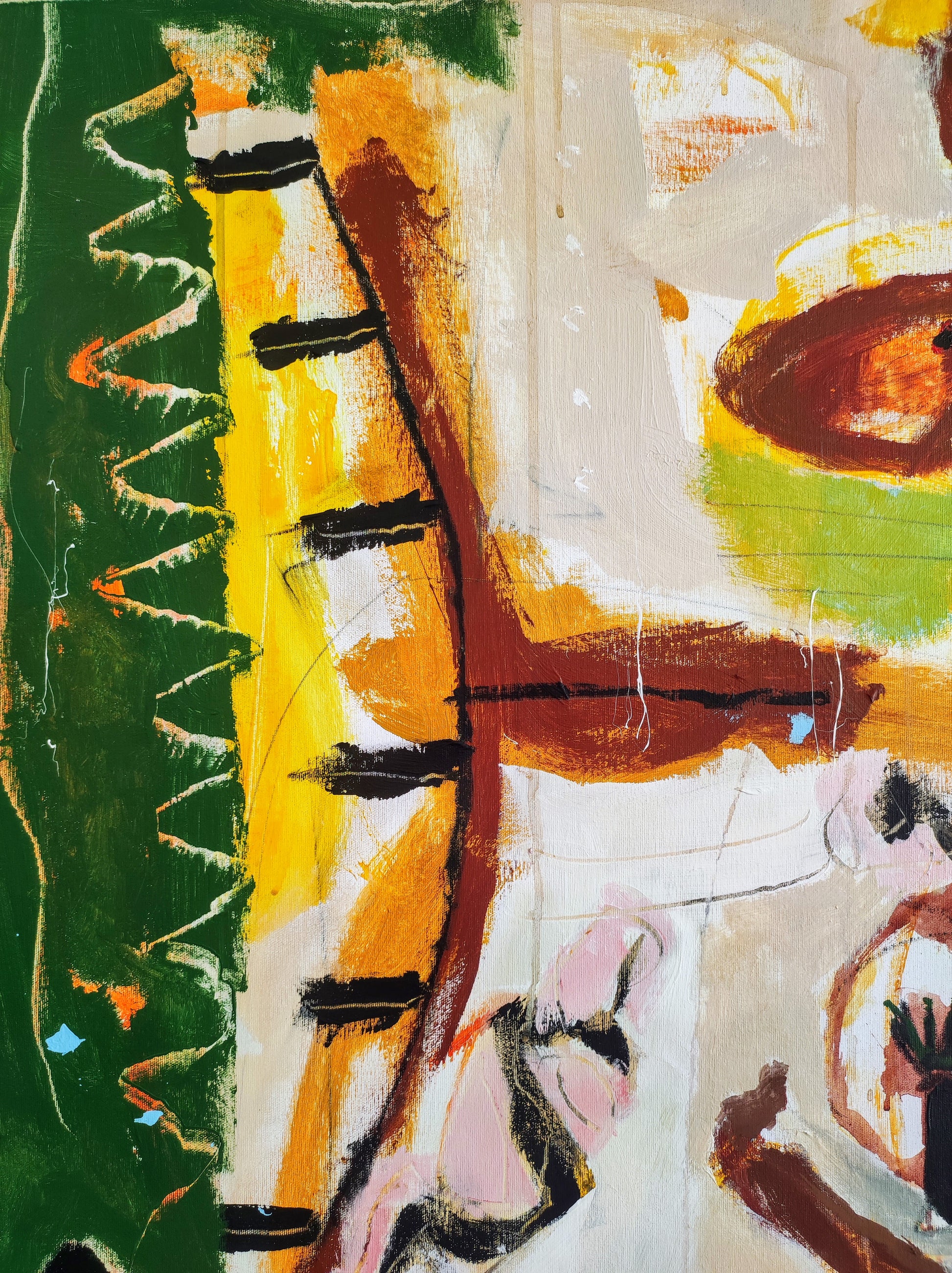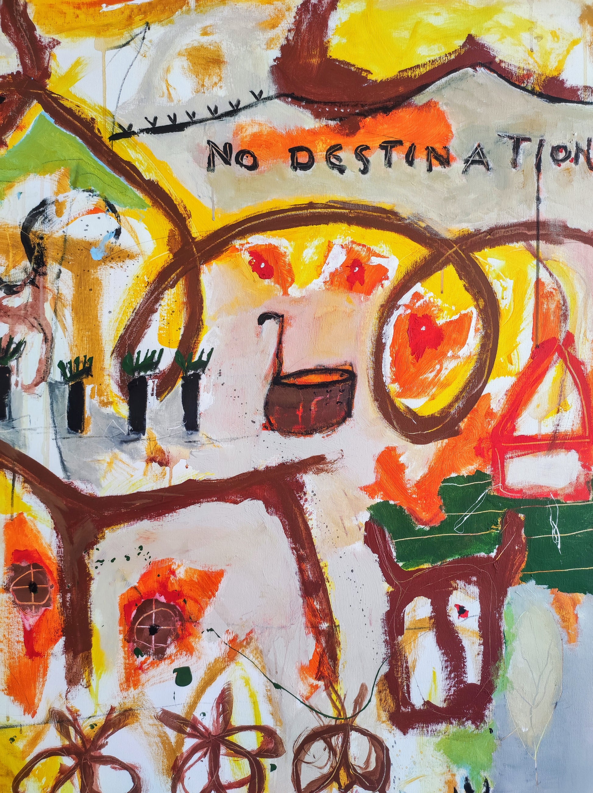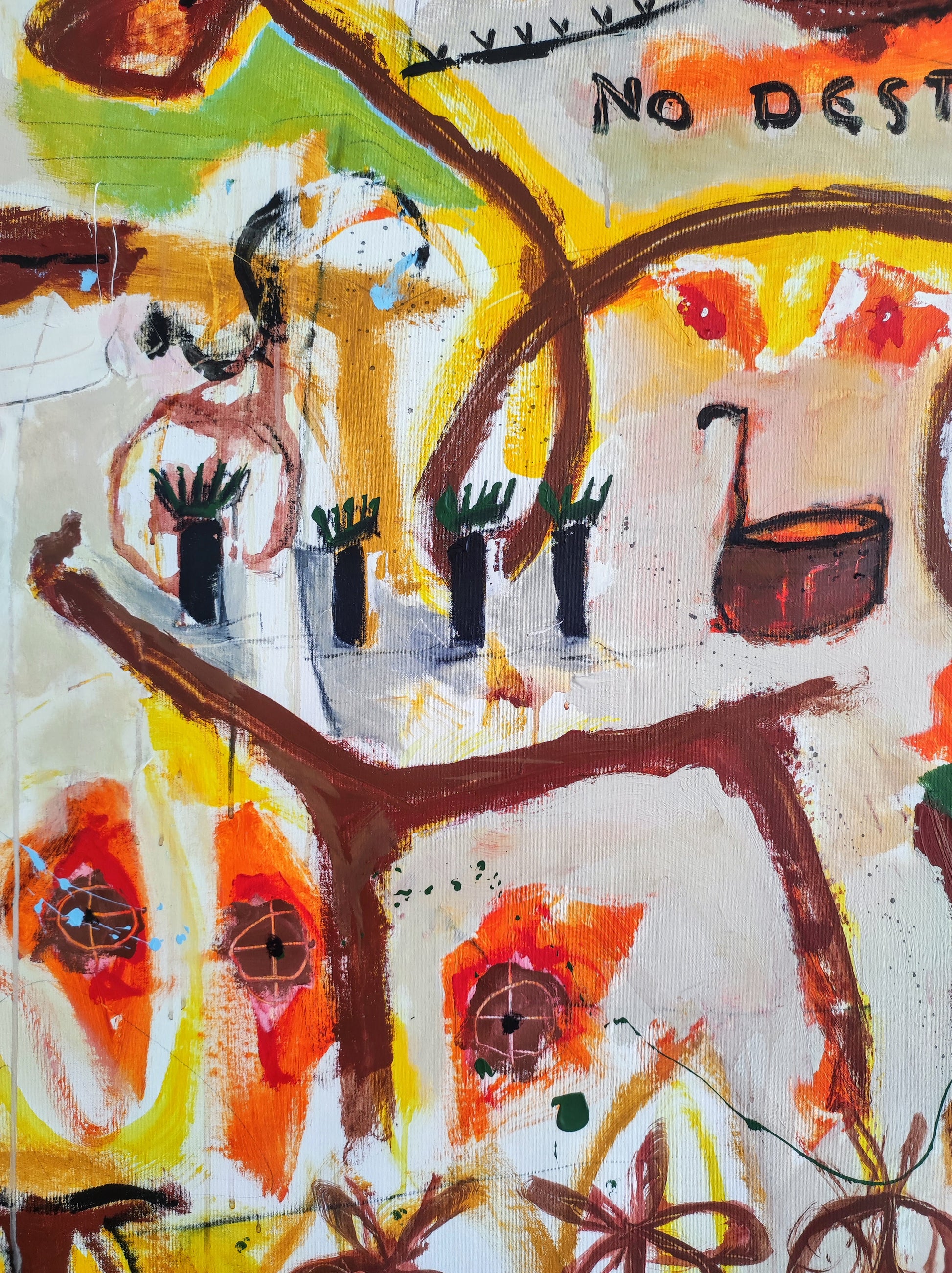 Pintura gestual, intuitiva, que deja que las cosas pasen y se apoya sobre lo que aparece. Aprovechando el accidente y aceptando las consecuencias.