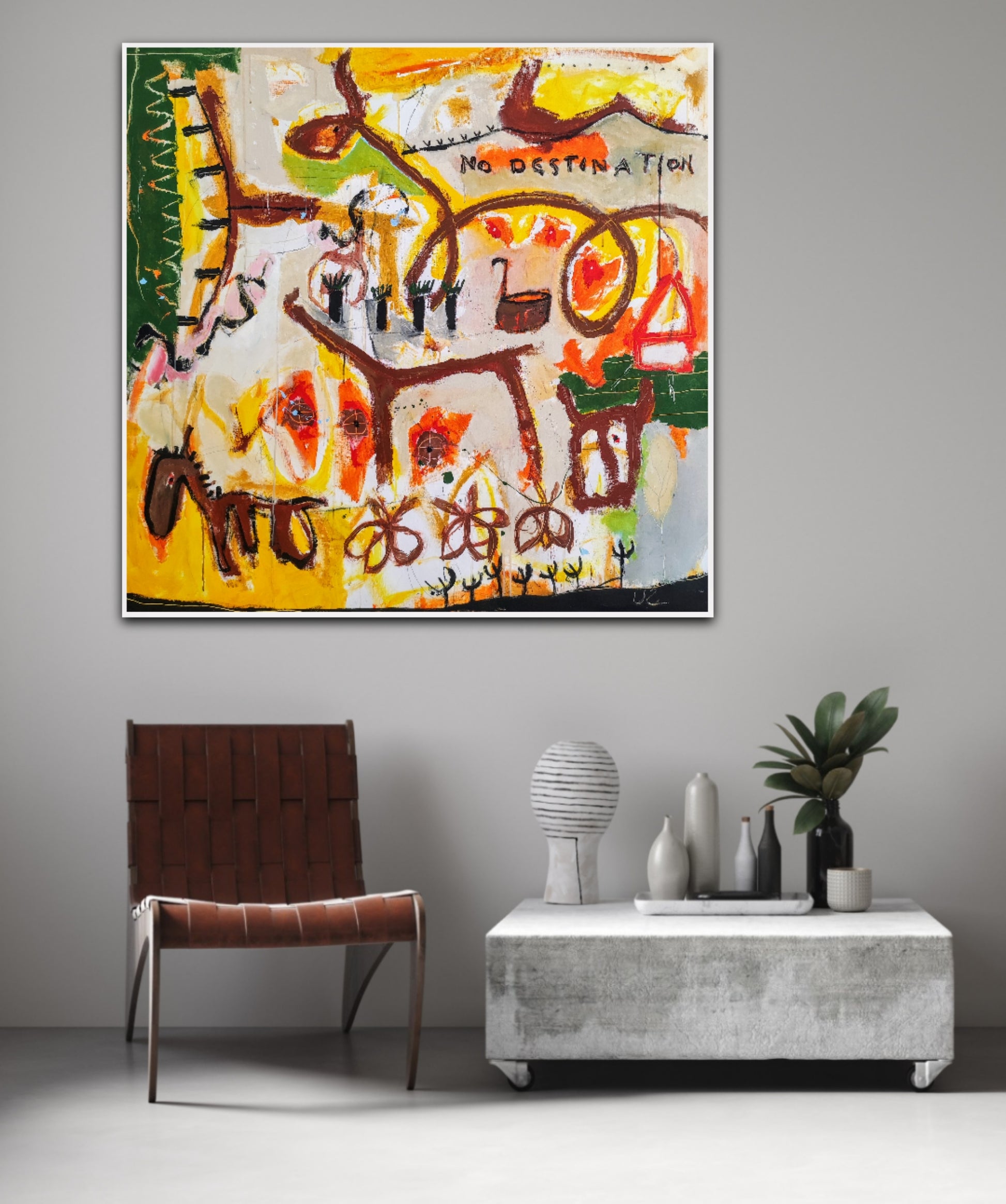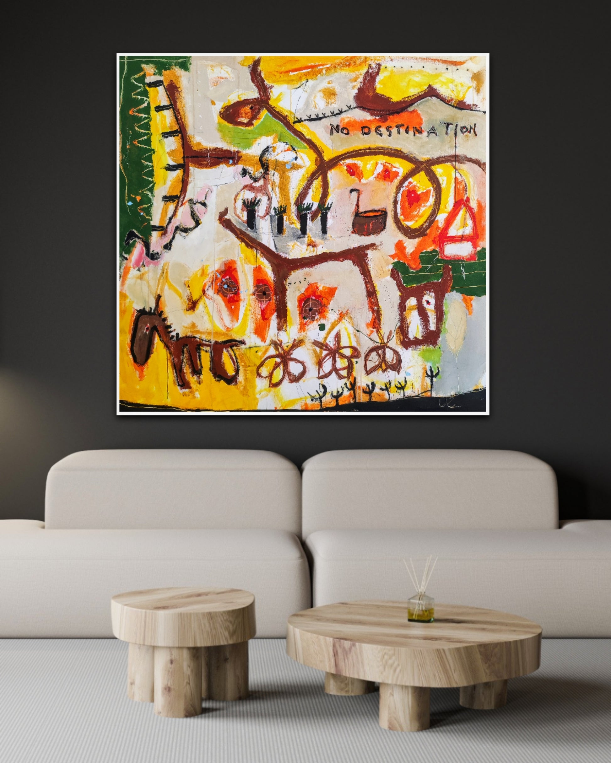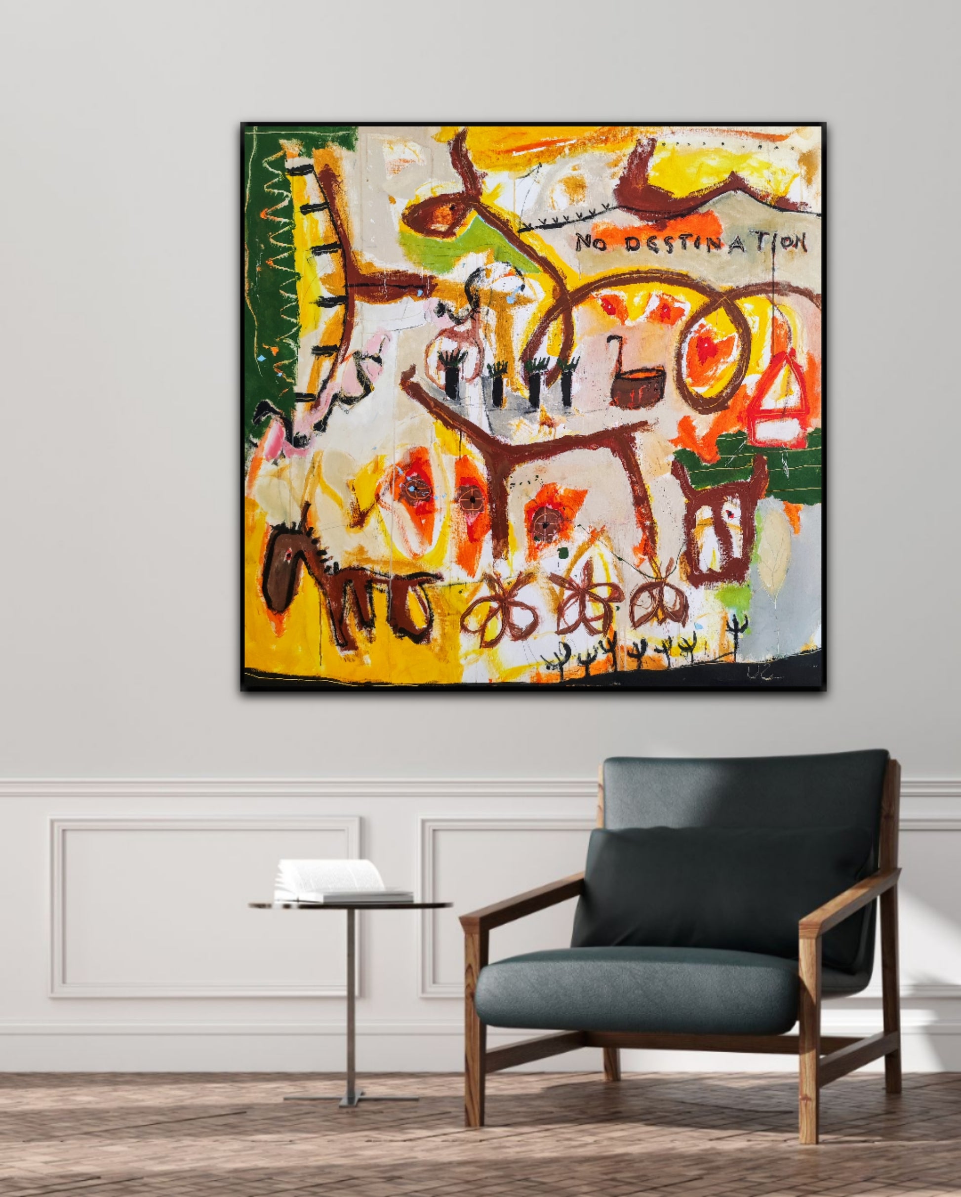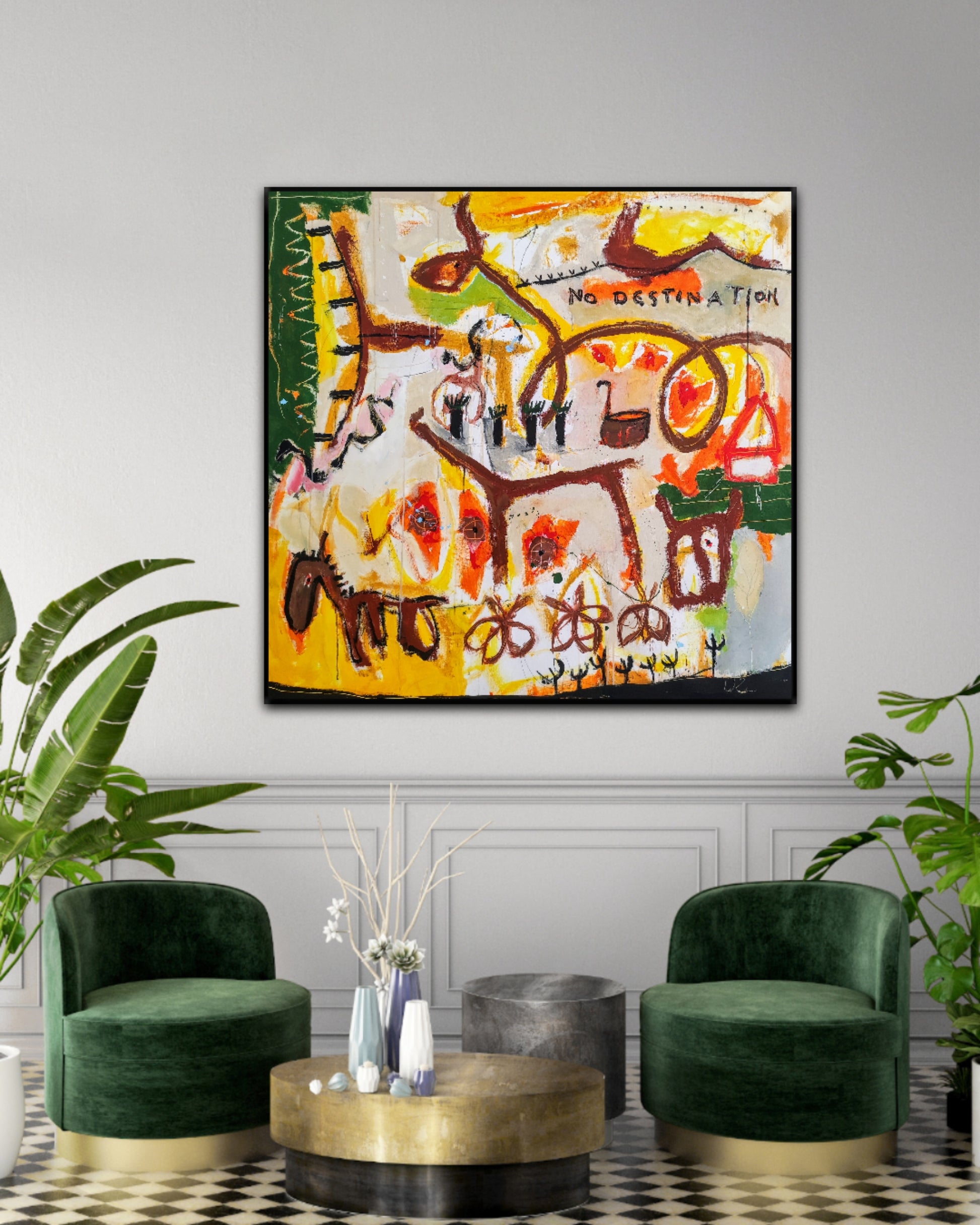 Pintura gestual, intuitiva, que deja que las cosas pasen y se apoya sobre lo que aparece. Aprovechando el accidente y aceptando las consecuencias.
