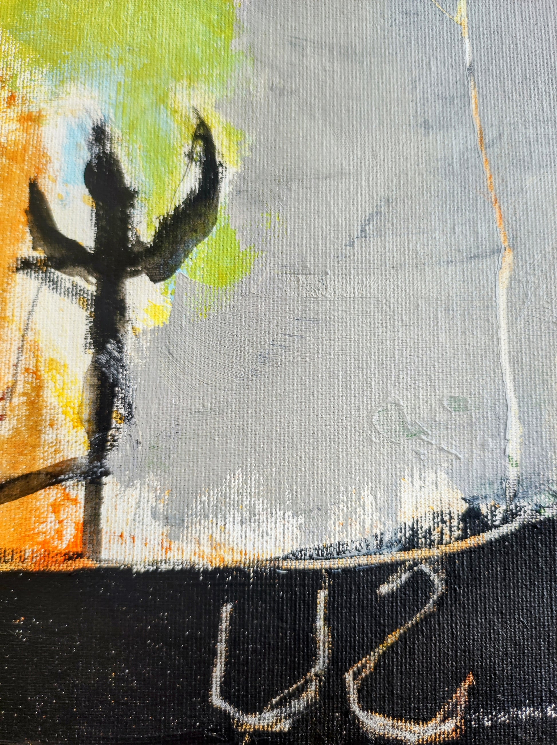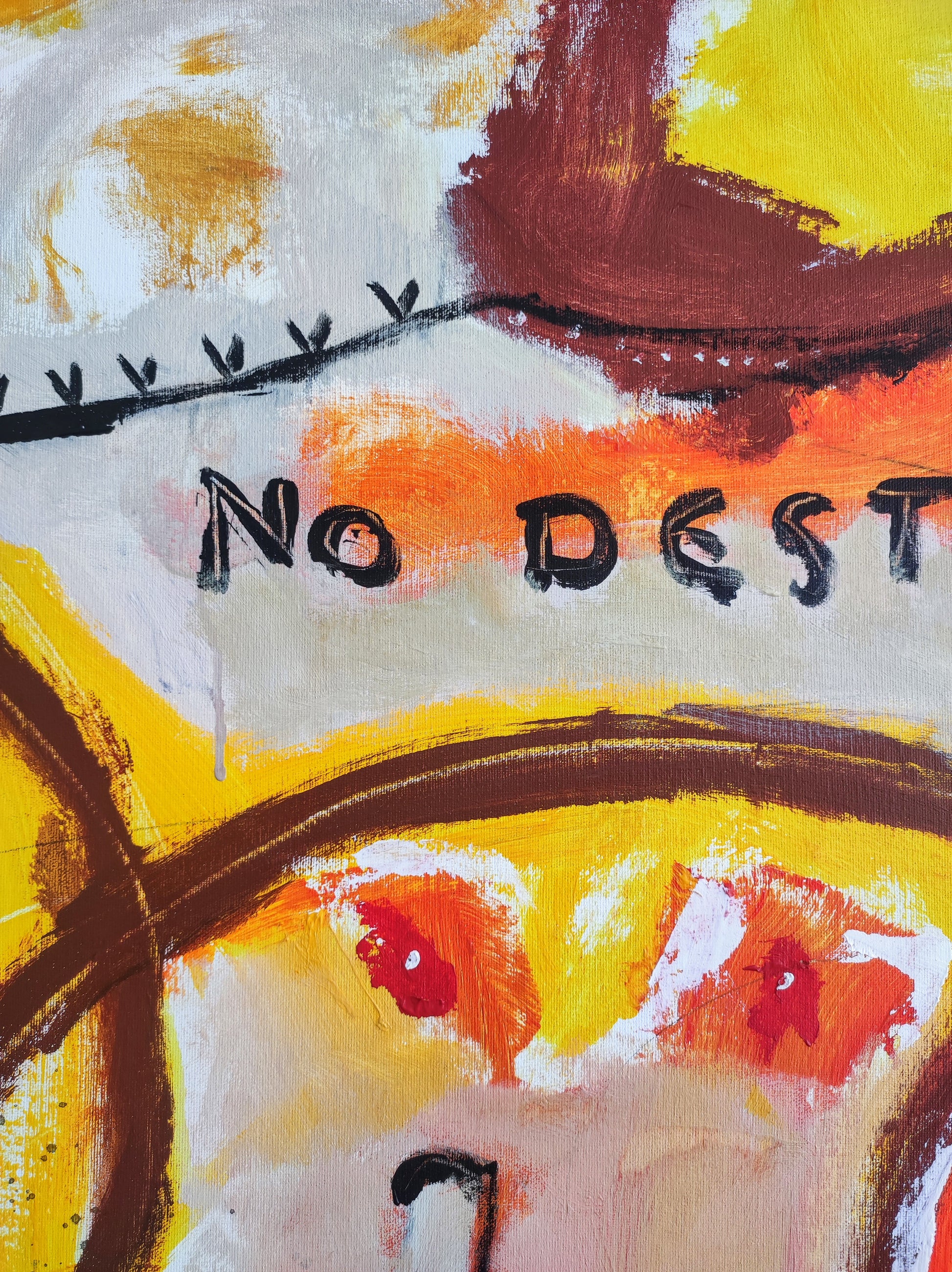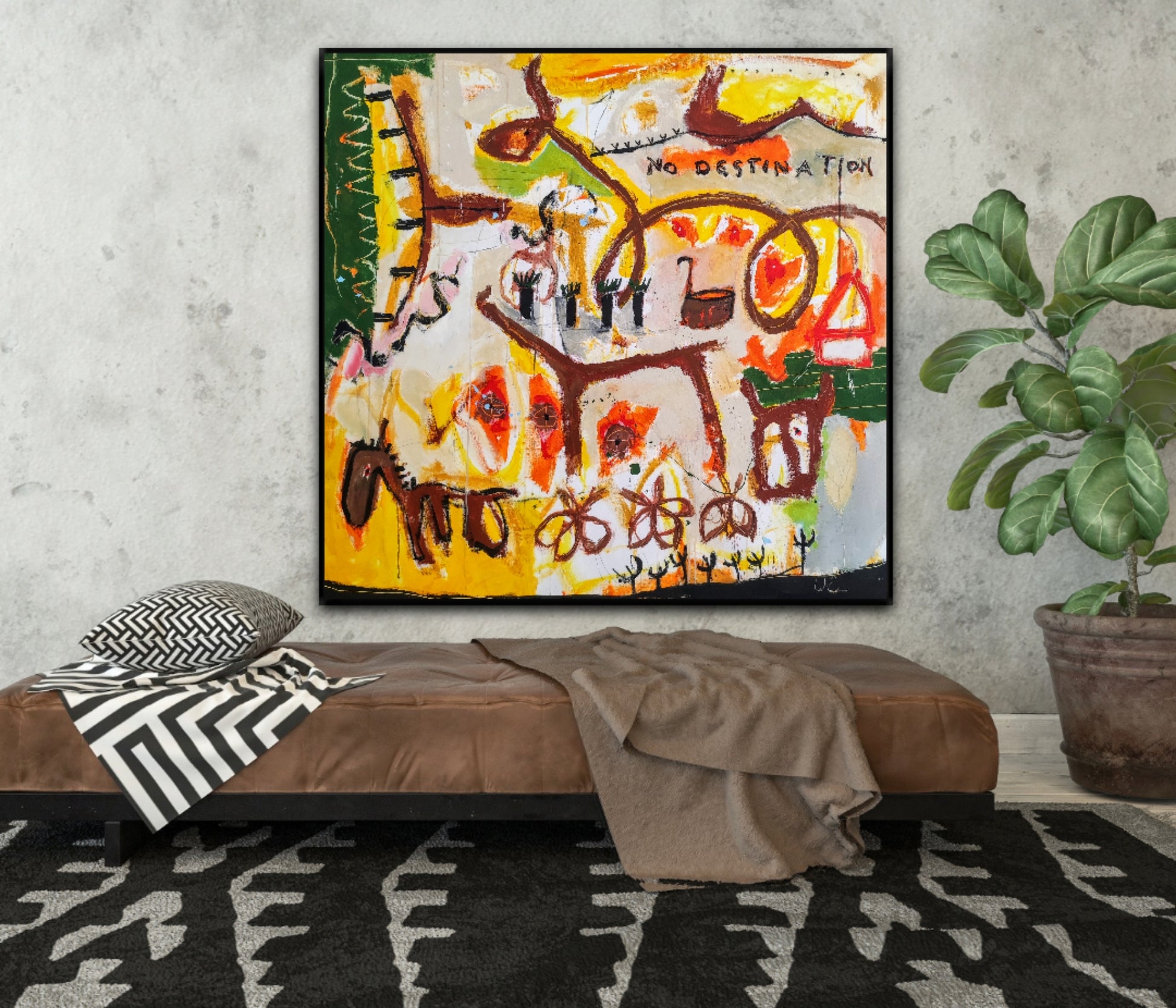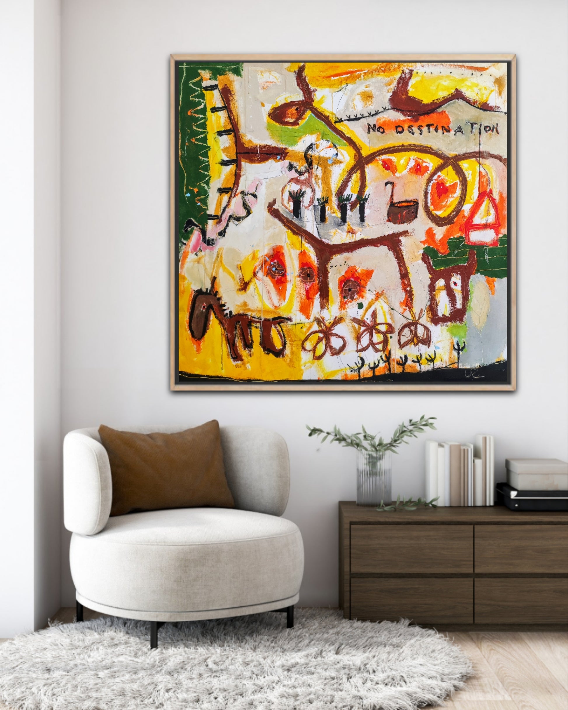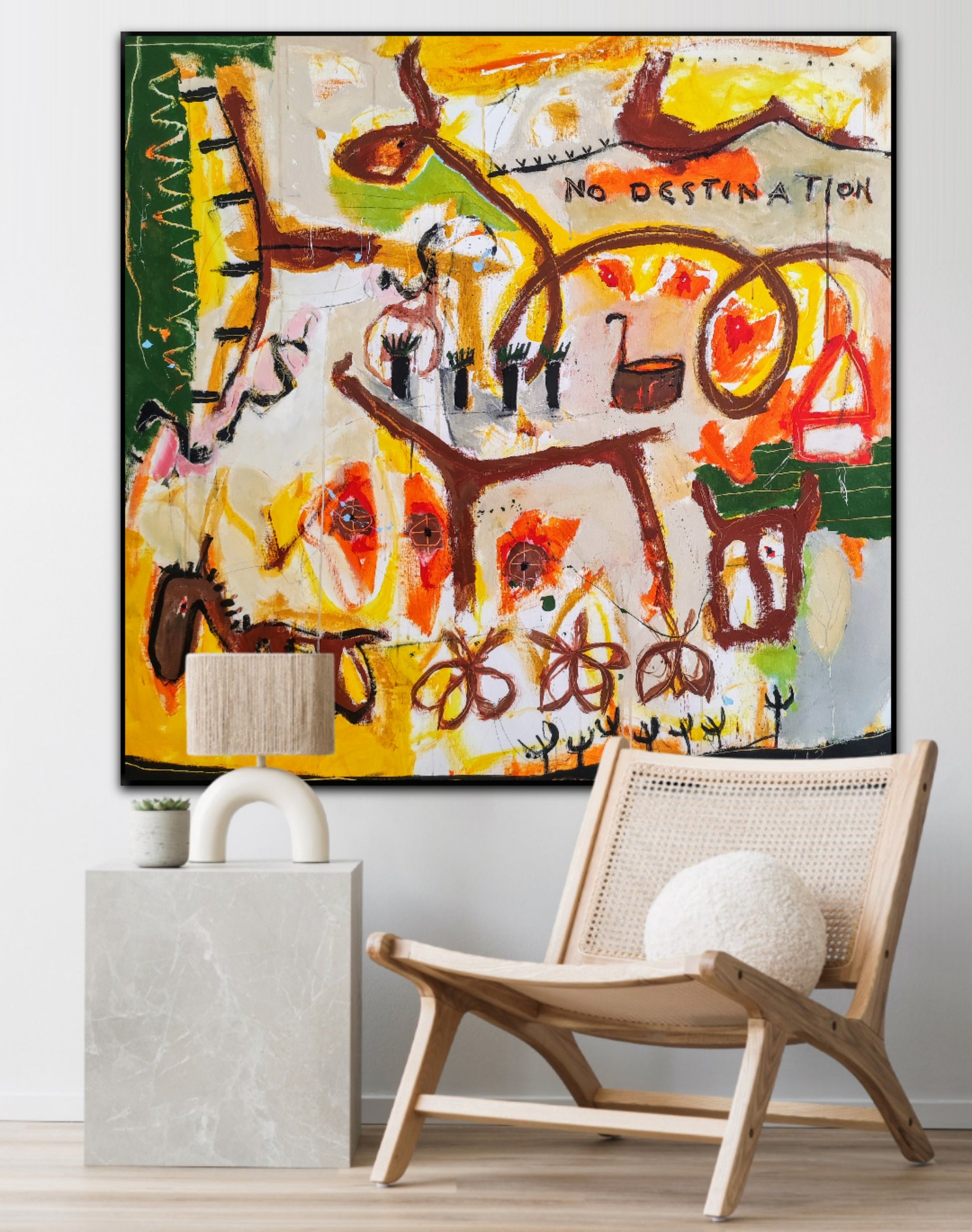 Pintura gestual, intuitiva, que deja que las cosas pasen y se apoya sobre lo que aparece. Aprovechando el accidente y aceptando las consecuencias.