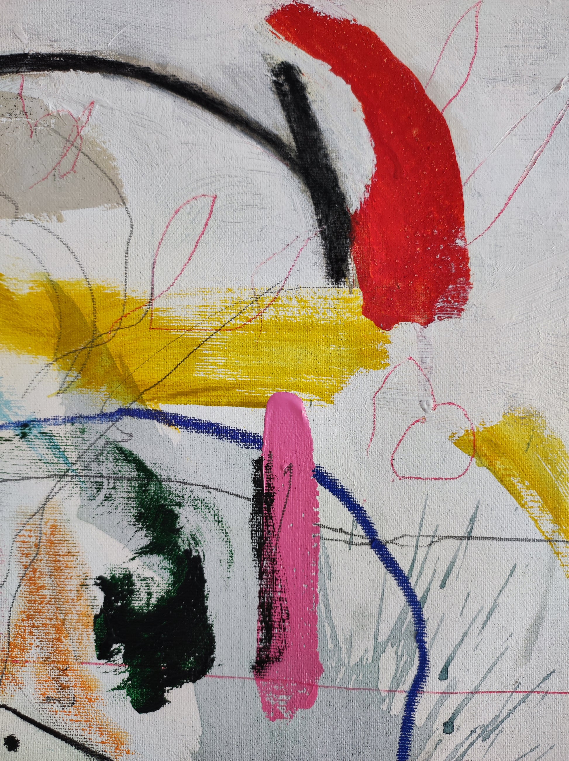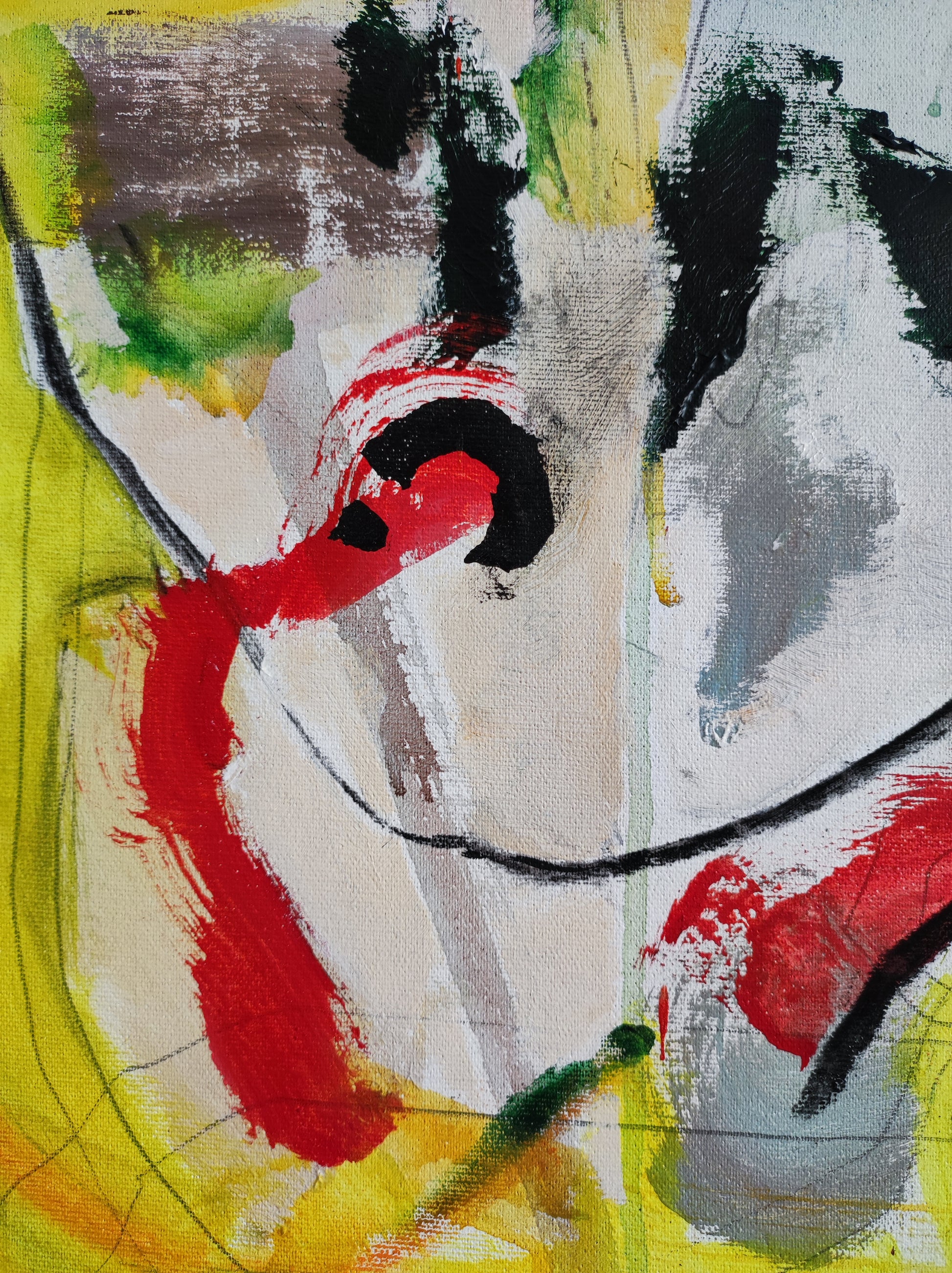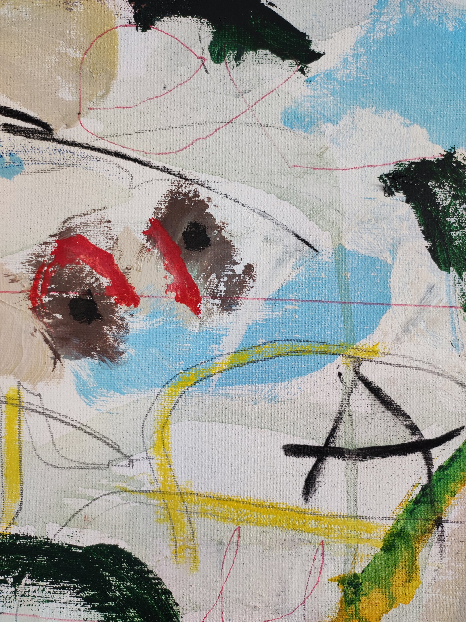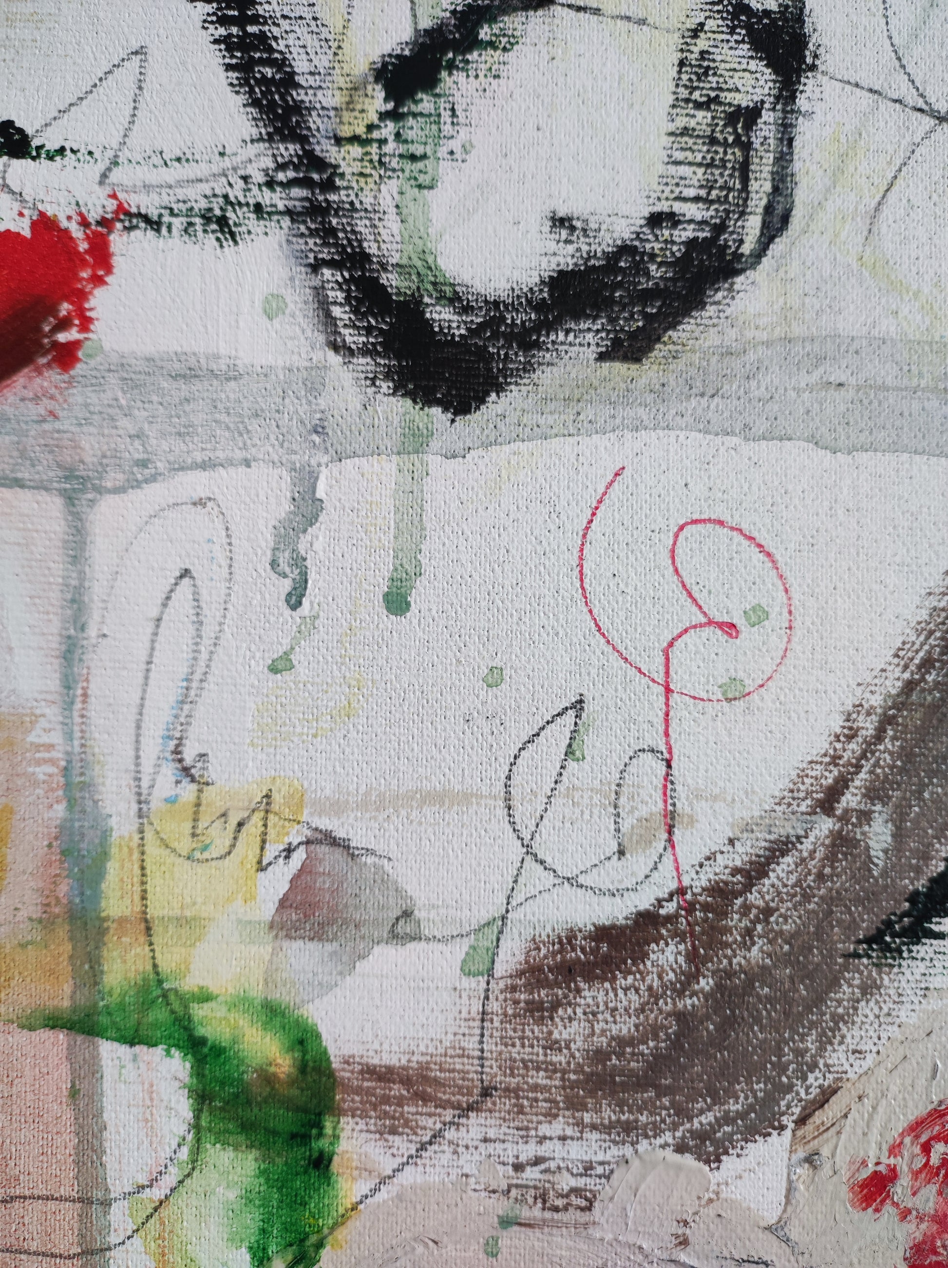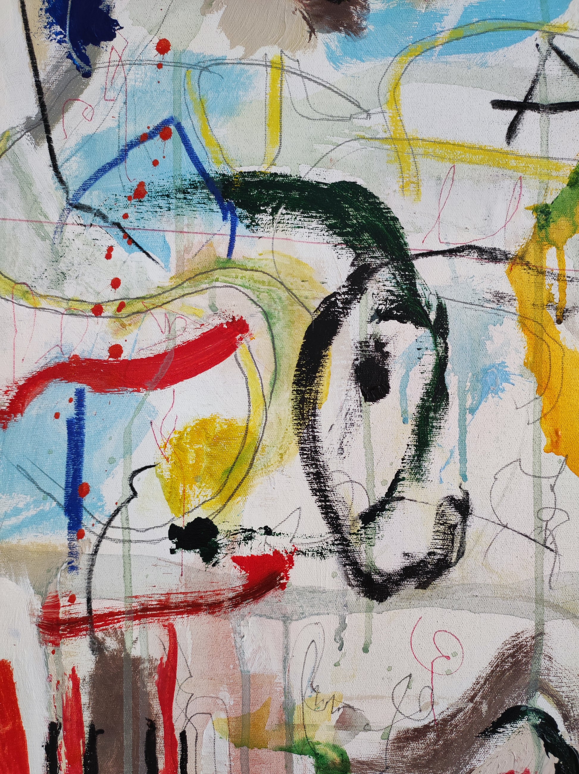 Pintura gestual, intuitiva, que deja que las cosas pasen y se apoya sobre lo que aparece. Aprovechando el accidente y aceptando las consecuencias.