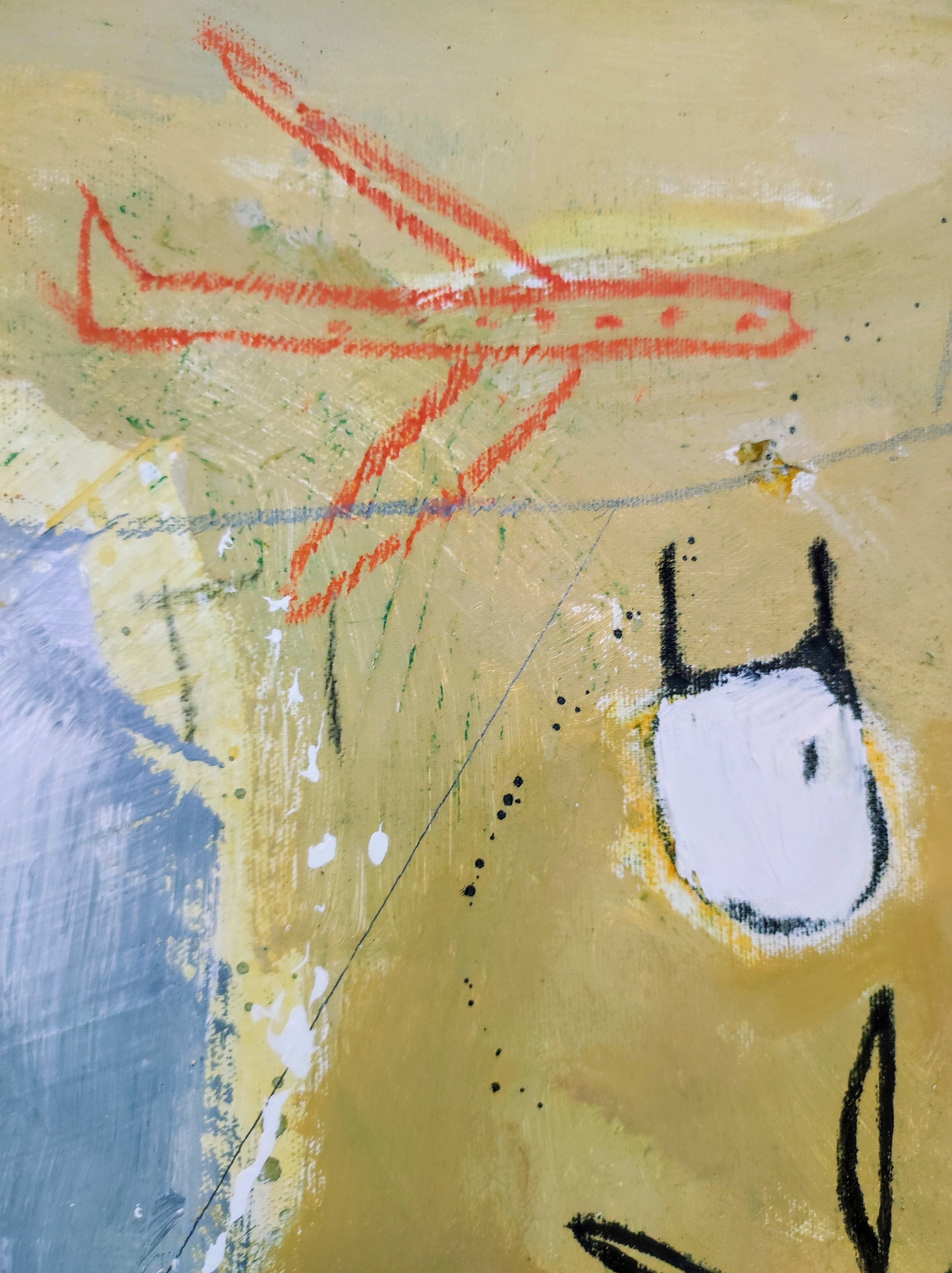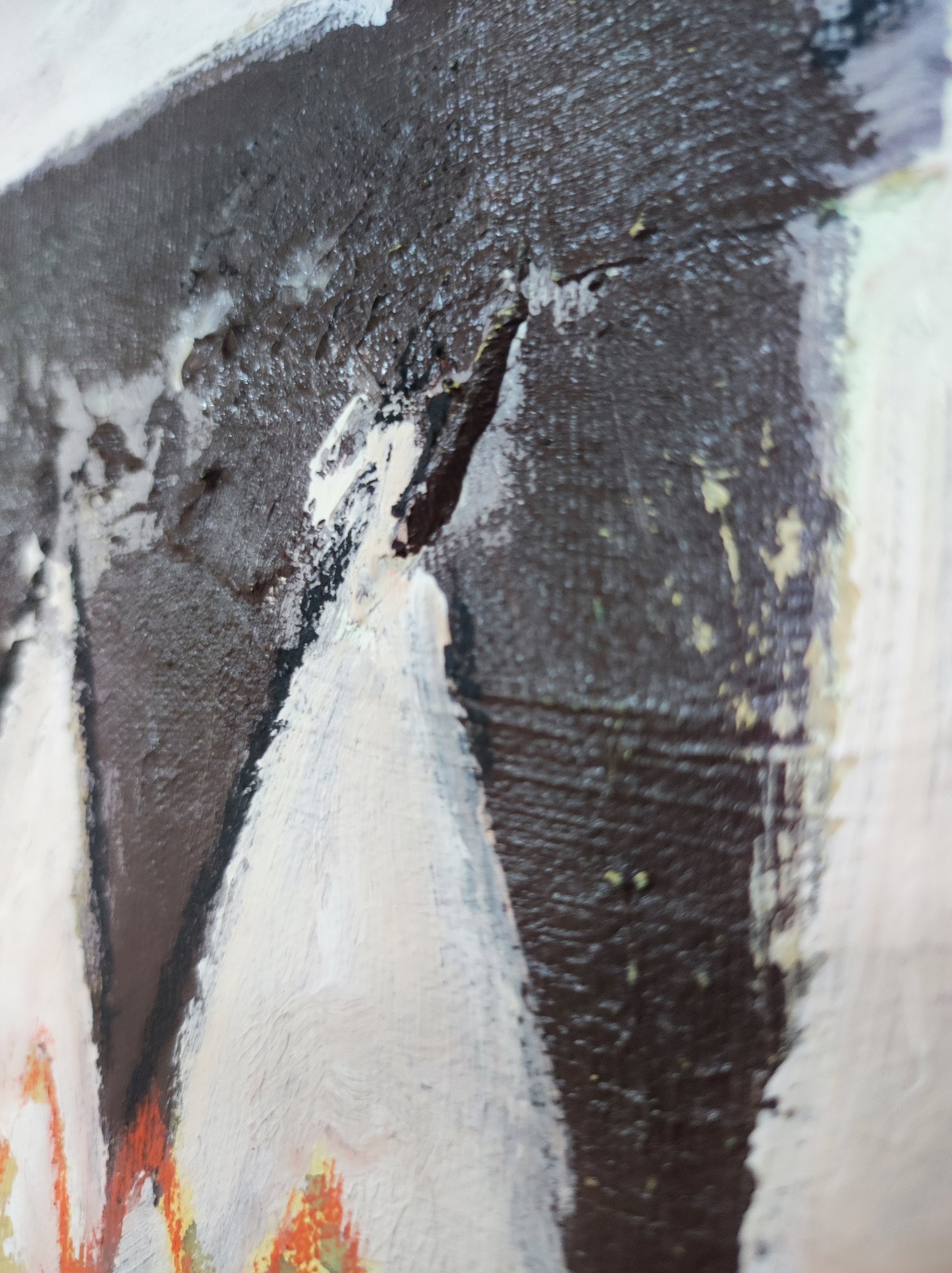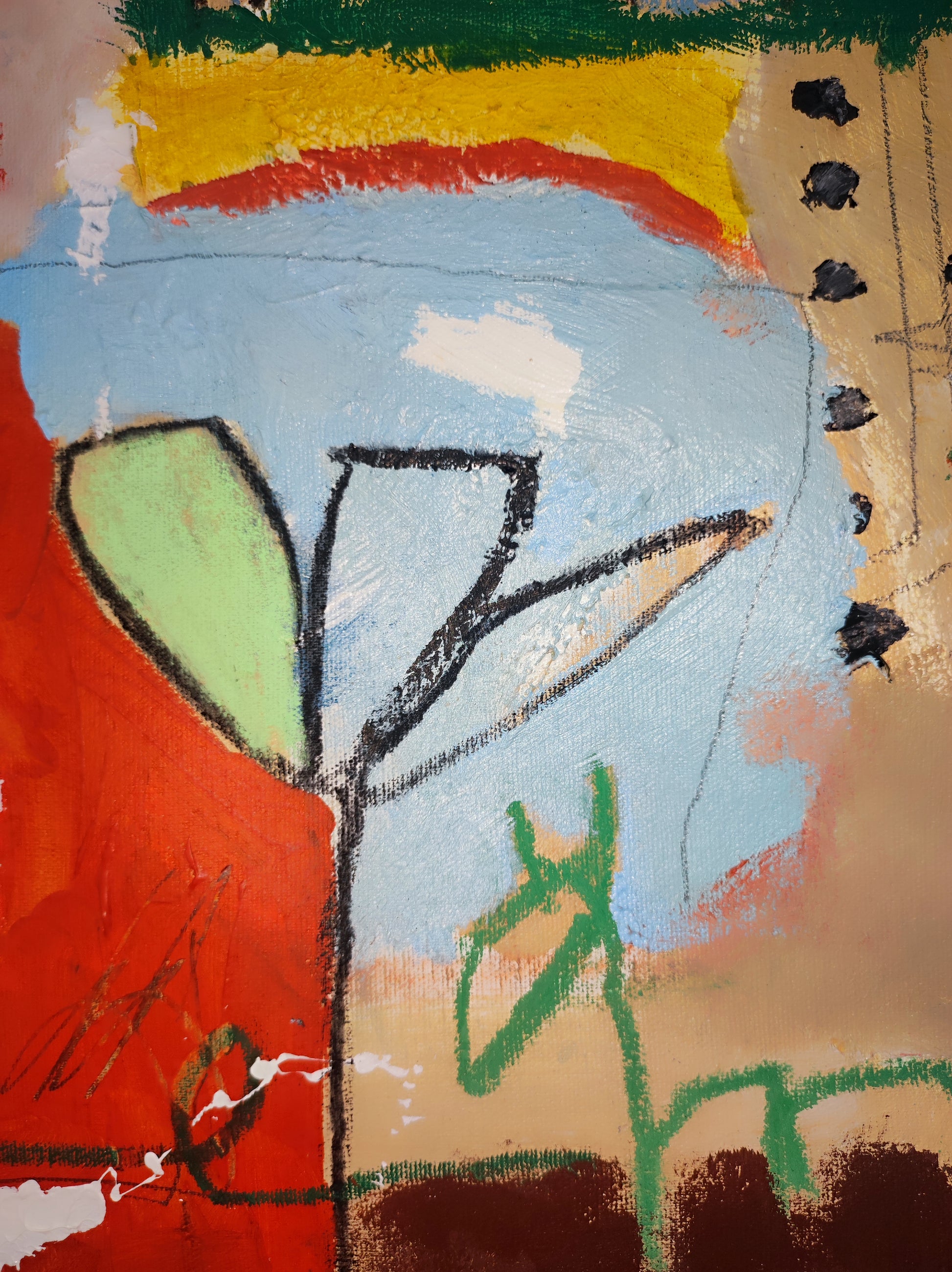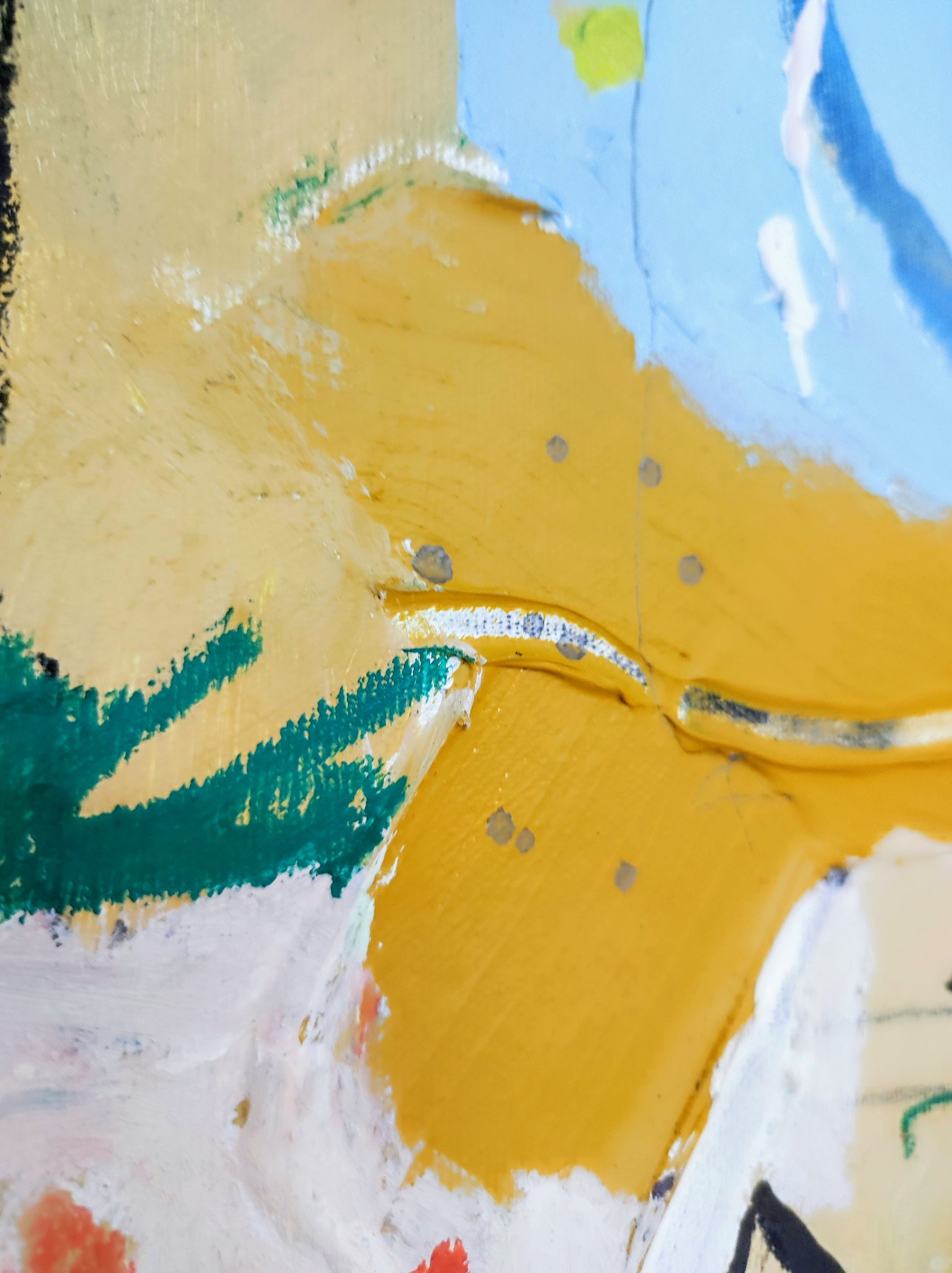 Pintura gestual, intuitiva, que deja que las cosas pasen y se apoya sobre lo que aparece. Aprovechando el accidente y aceptando las consecuencias.
