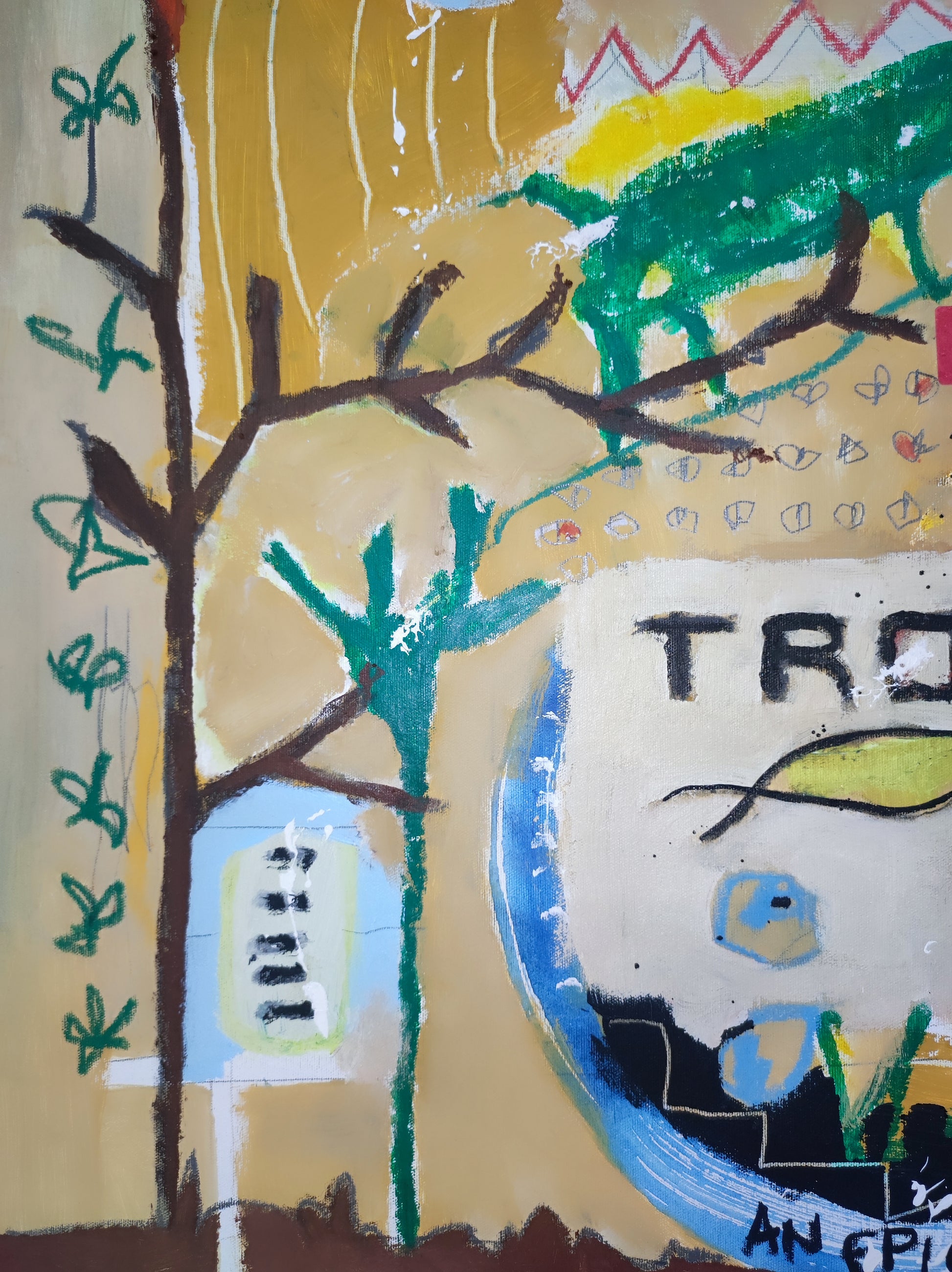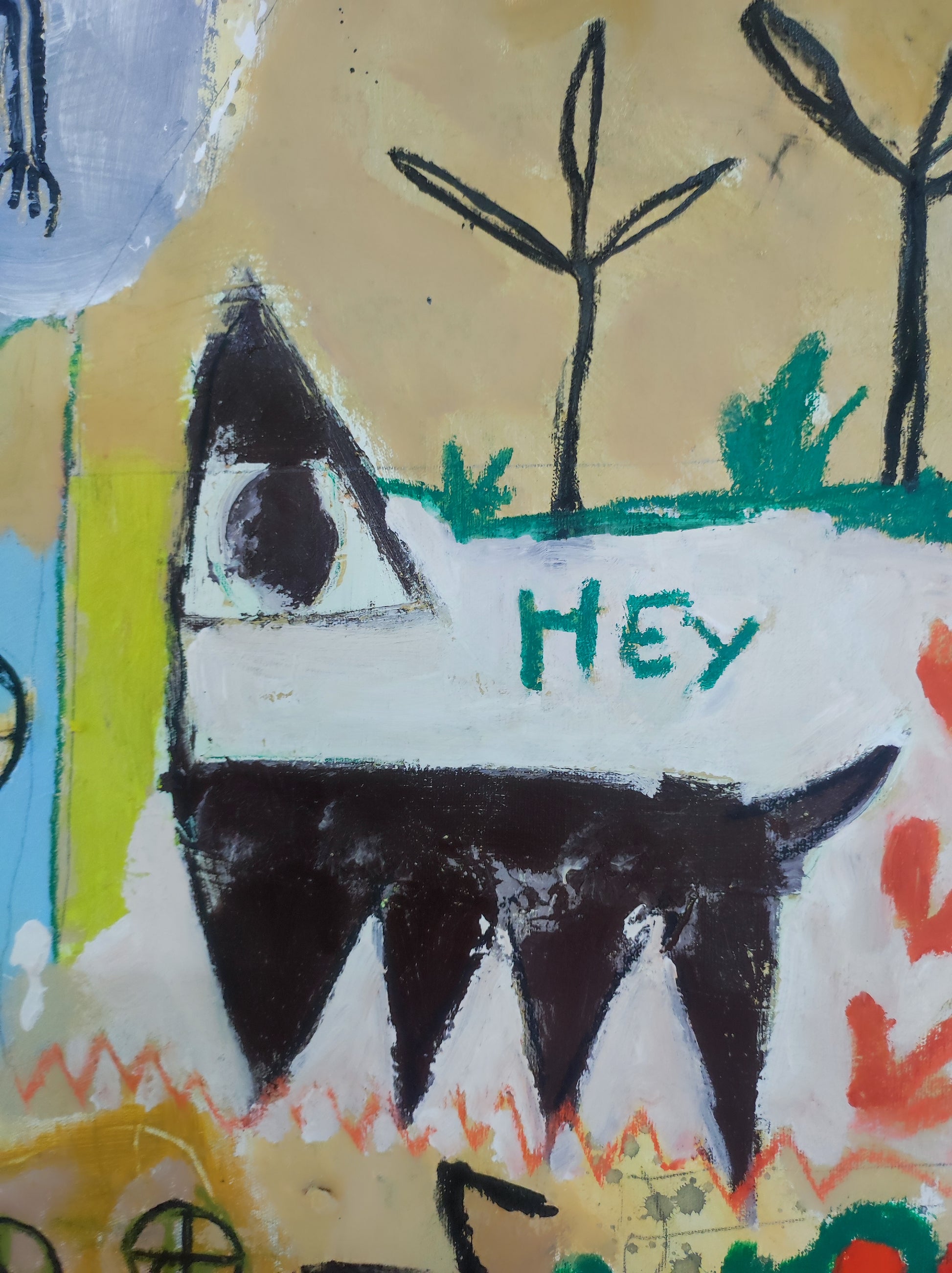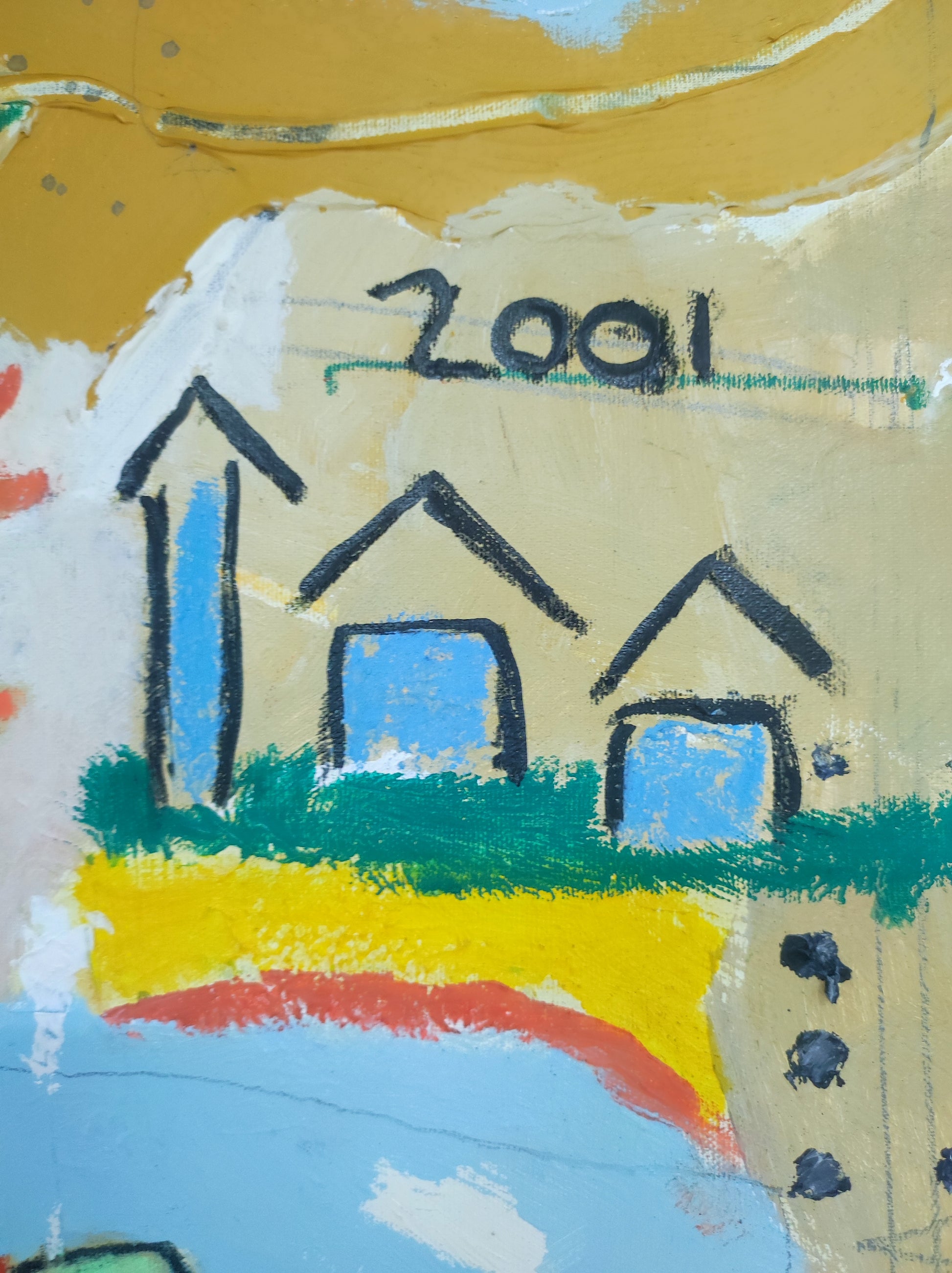 Pintura gestual, intuitiva, que deja que las cosas pasen y se apoya sobre lo que aparece. Aprovechando el accidente y aceptando las consecuencias.