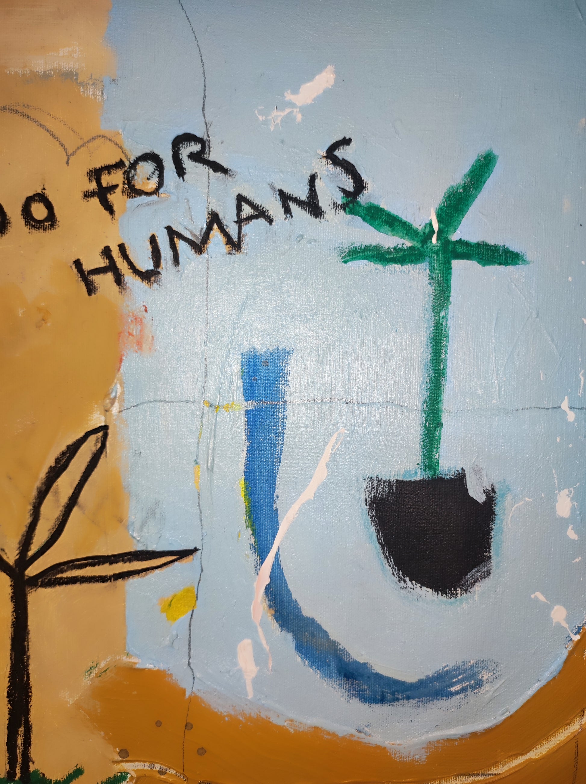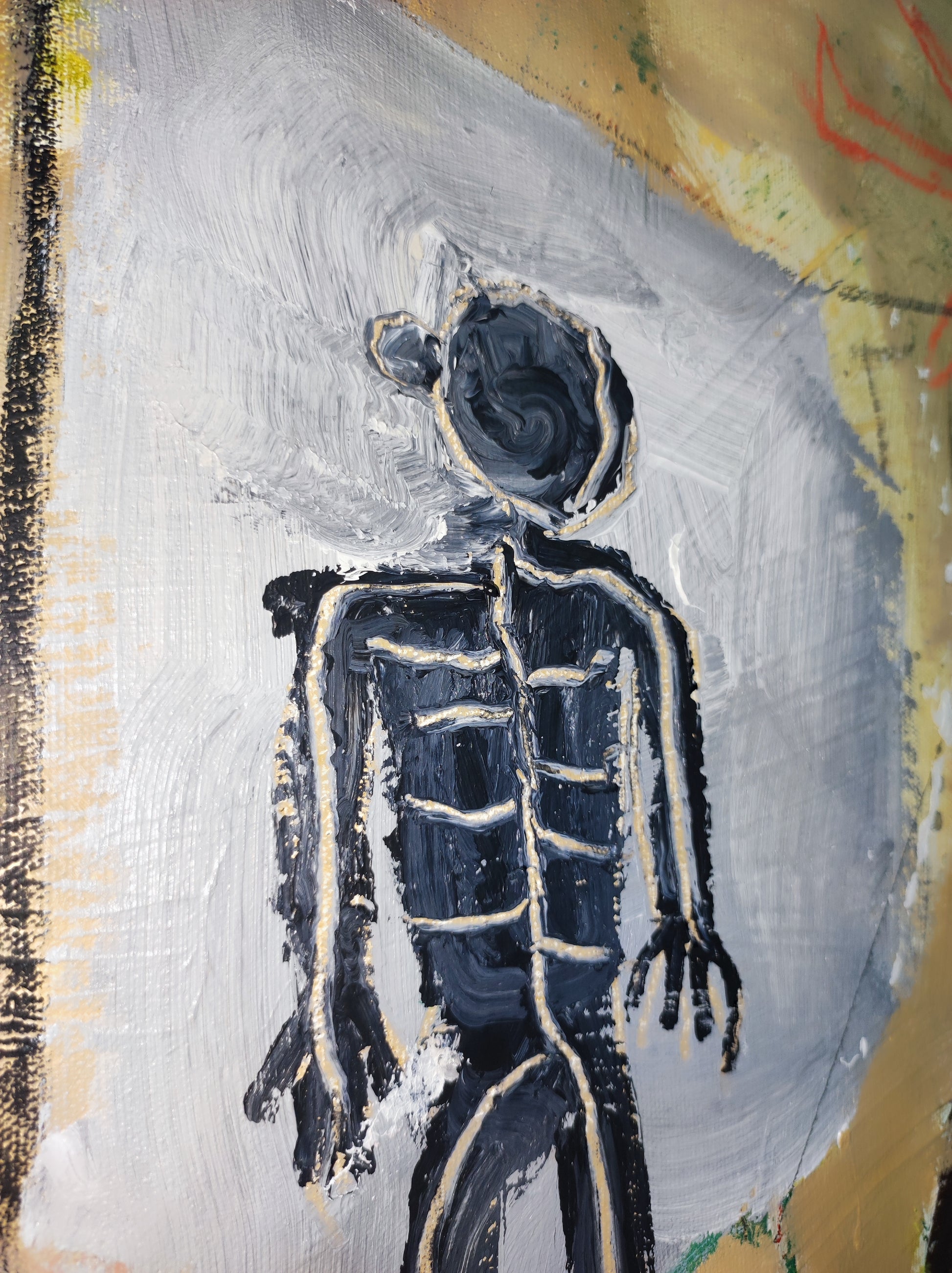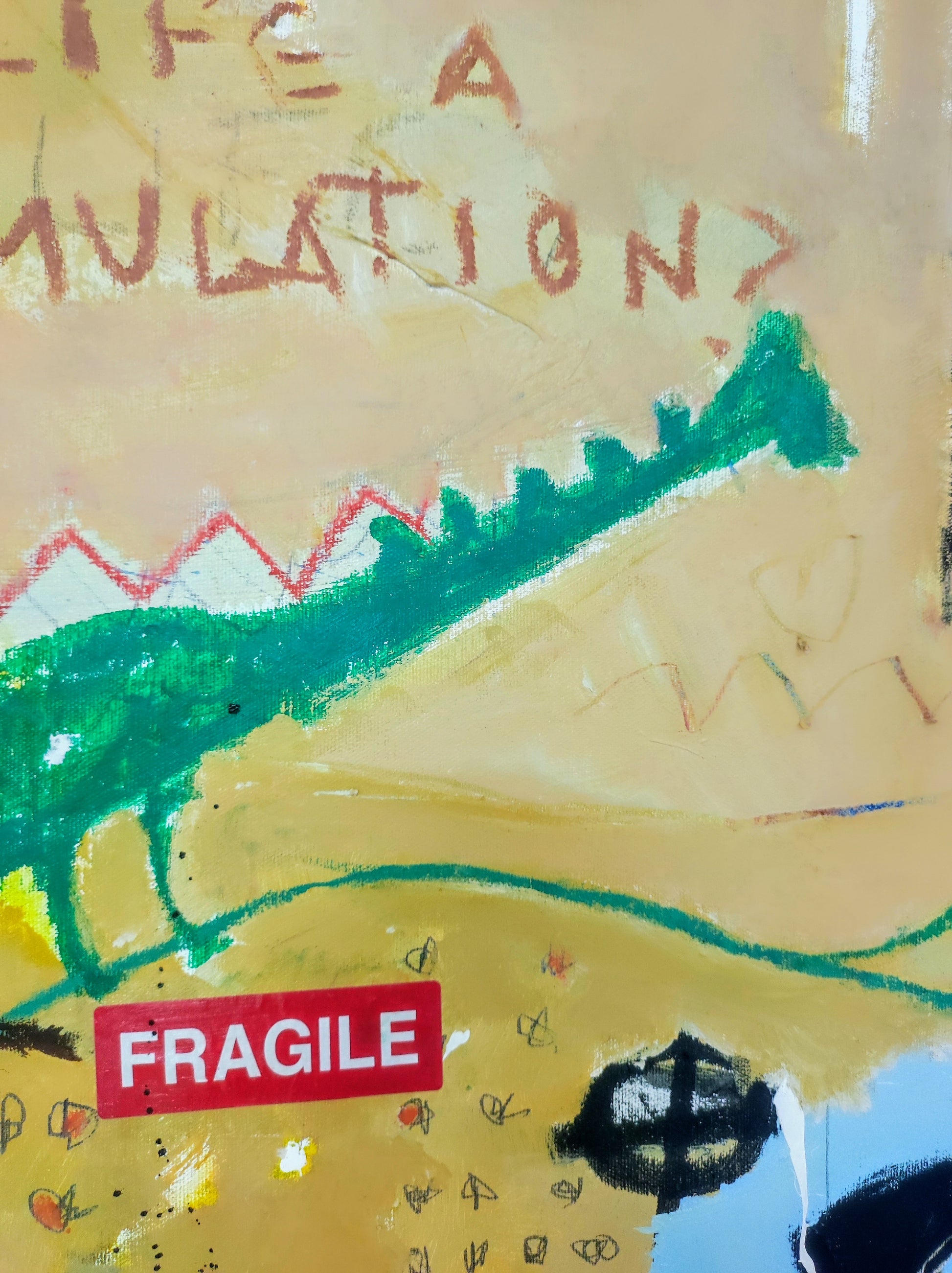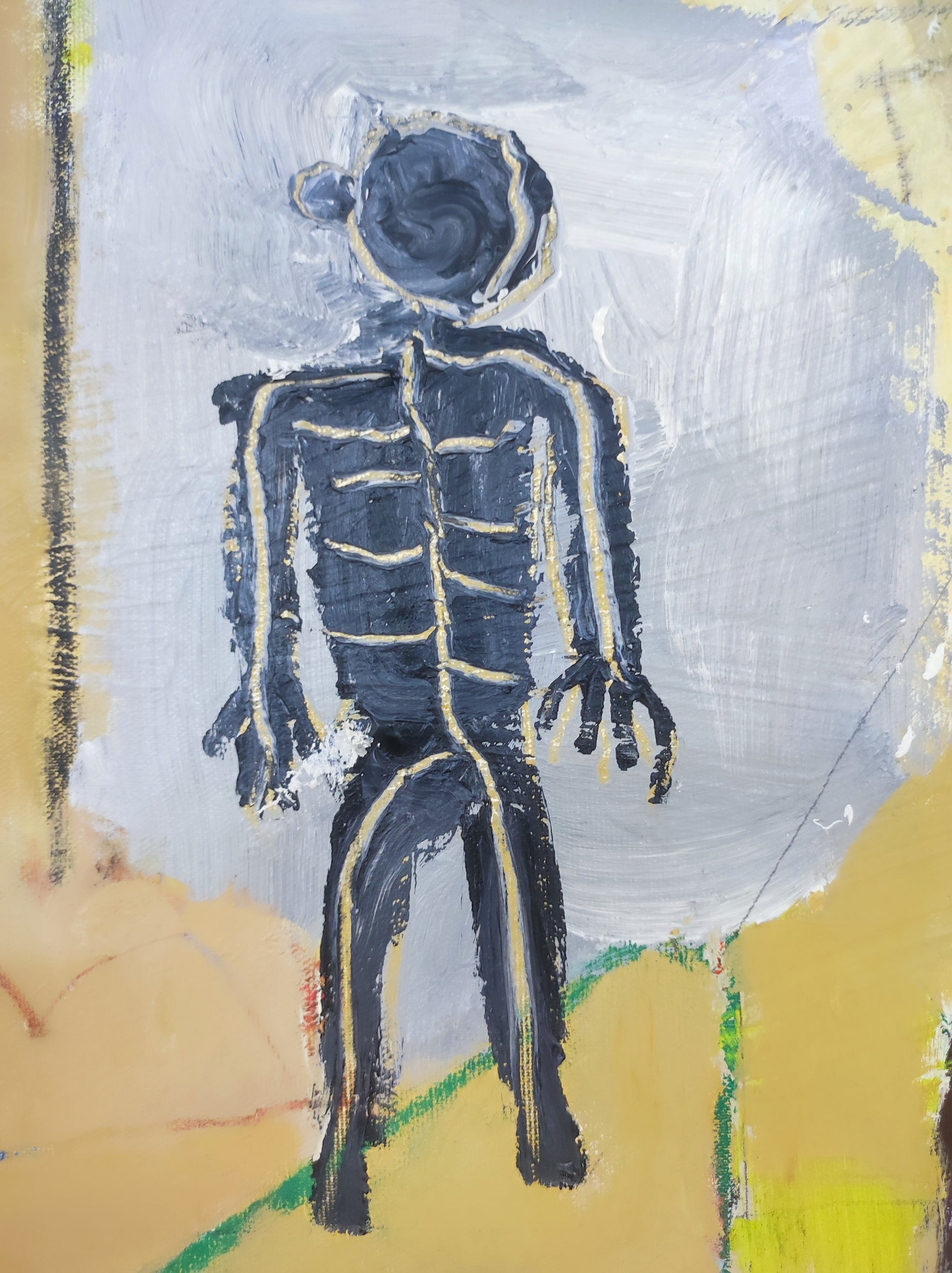 Pintura gestual, intuitiva, que deja que las cosas pasen y se apoya sobre lo que aparece. Aprovechando el accidente y aceptando las consecuencias.