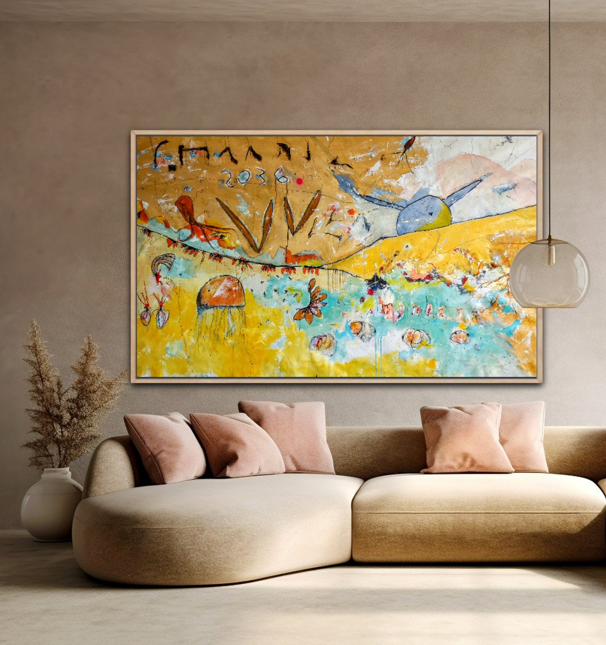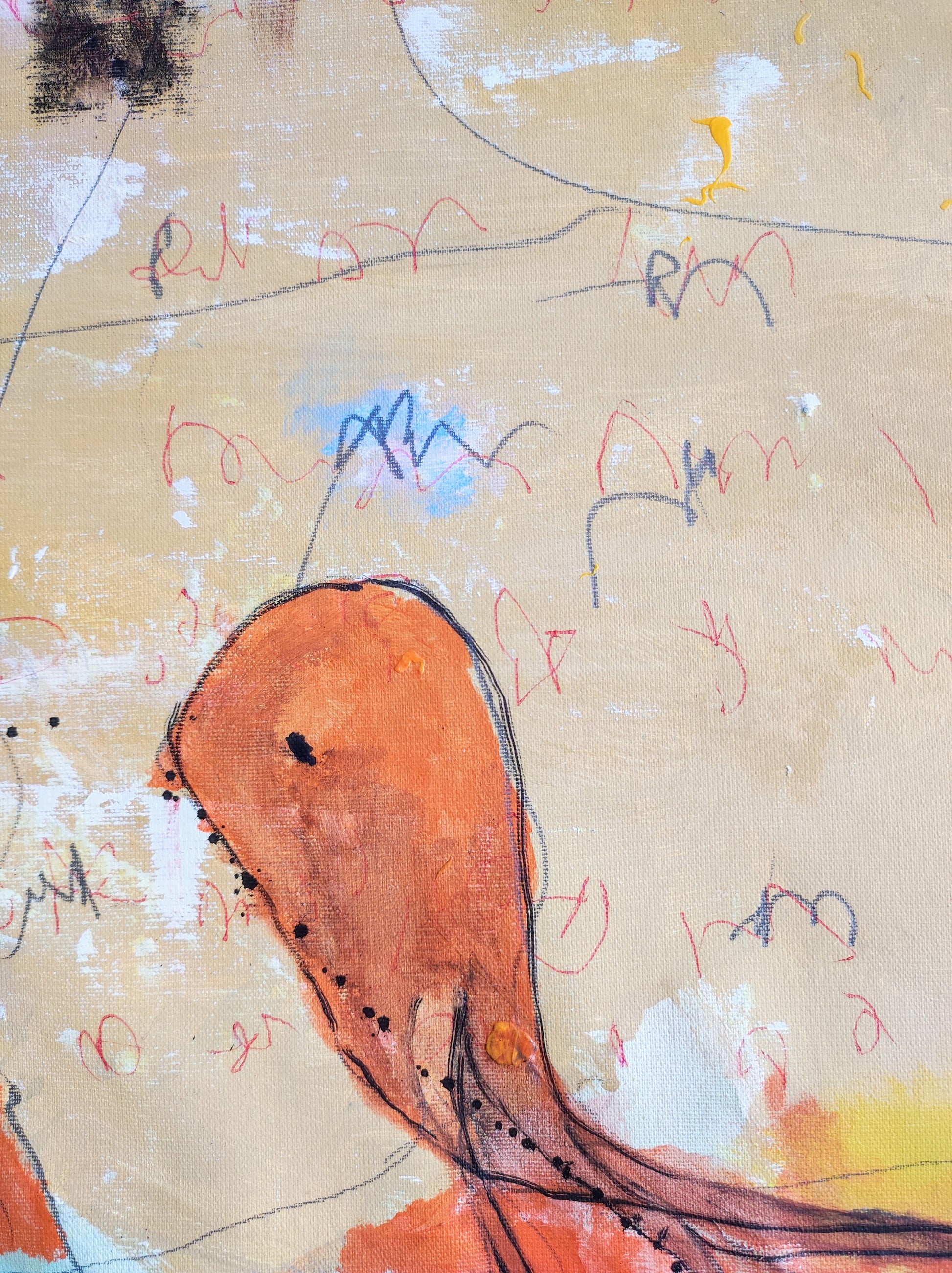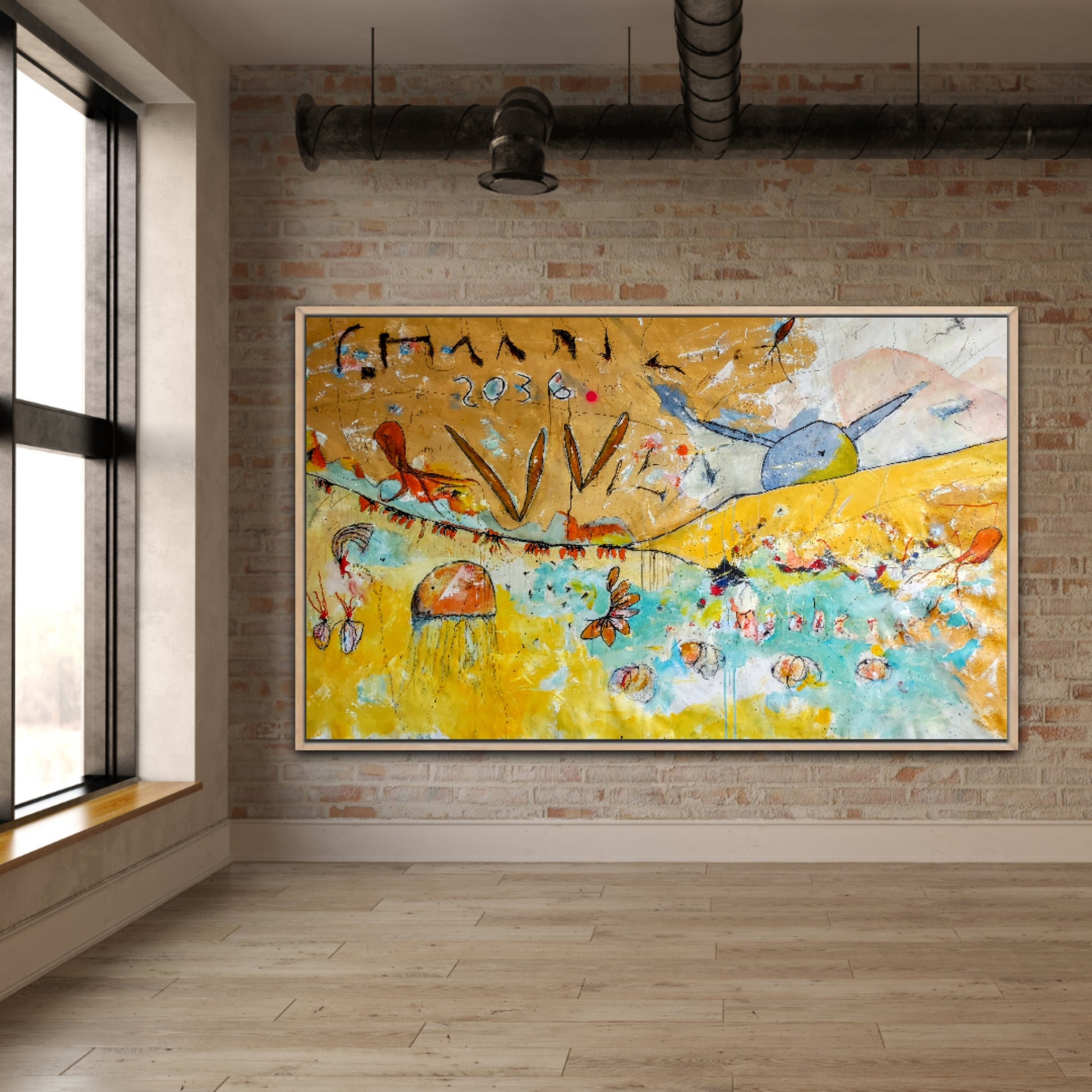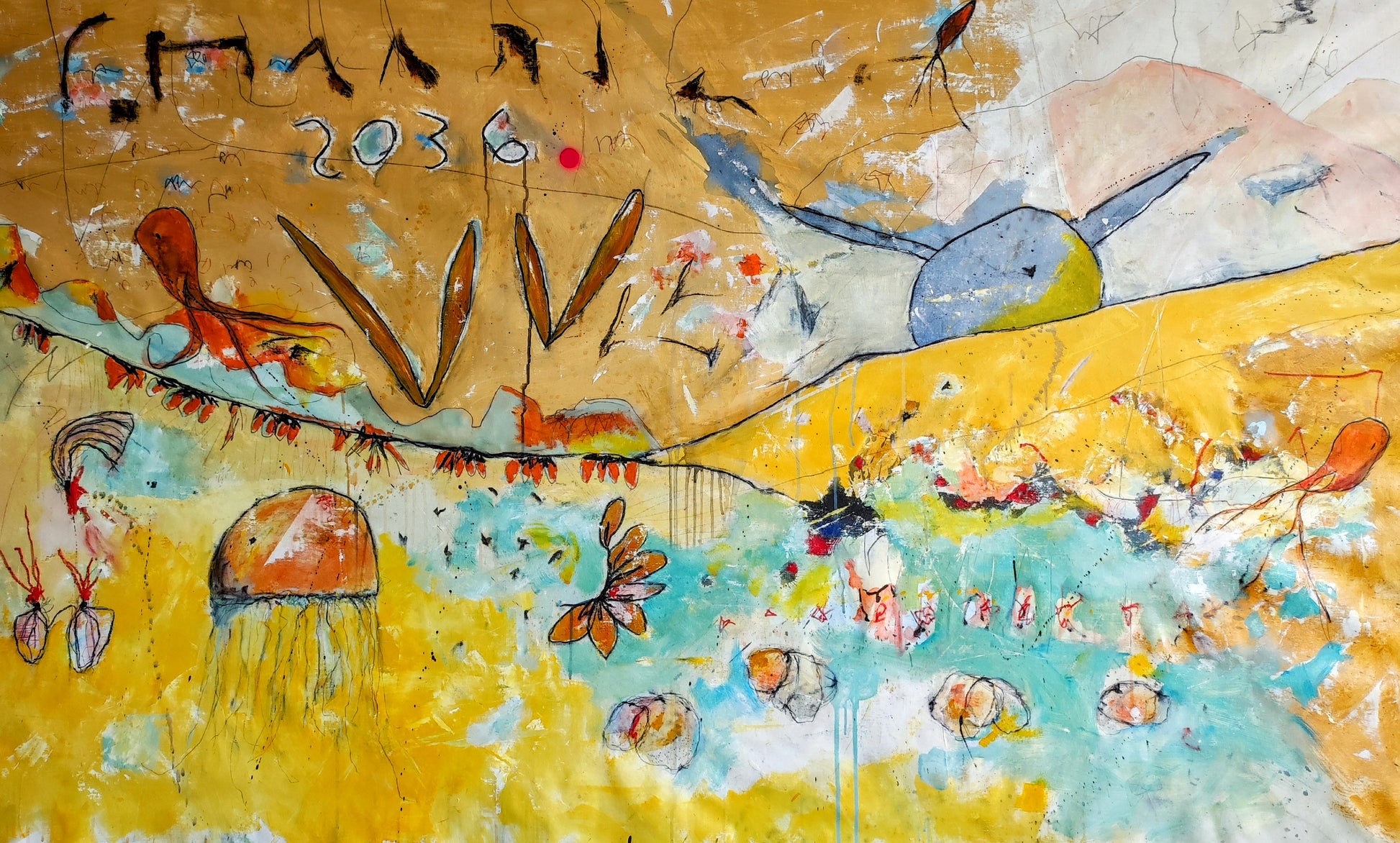 Técnica: acrílico, pigmentos, tinta china, ceras, carboncillo, pintura en spray, bolígrafo y lápiz.