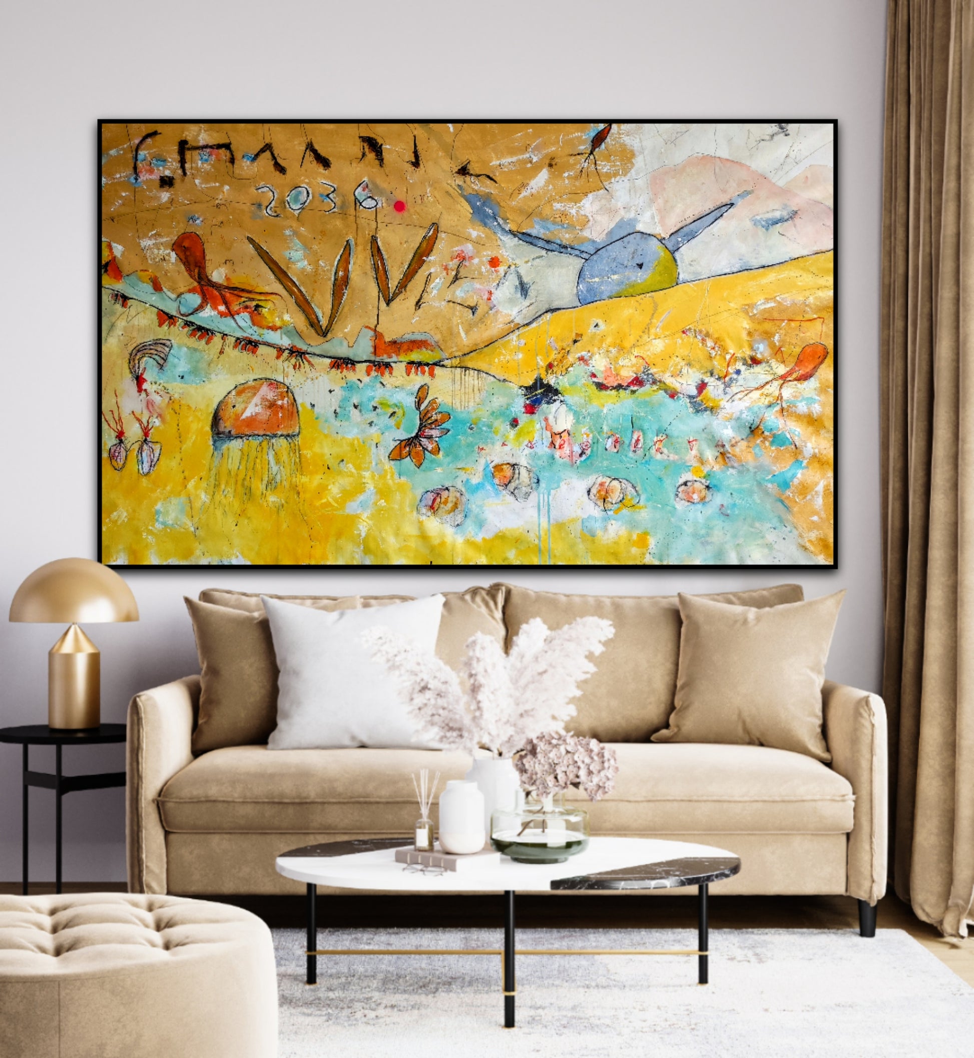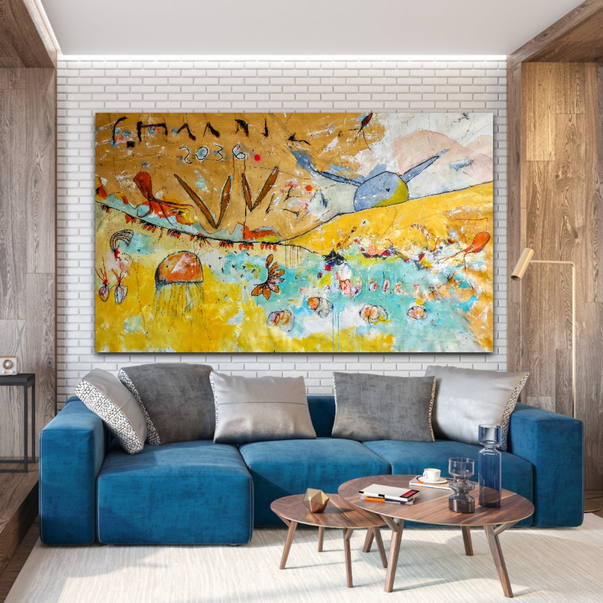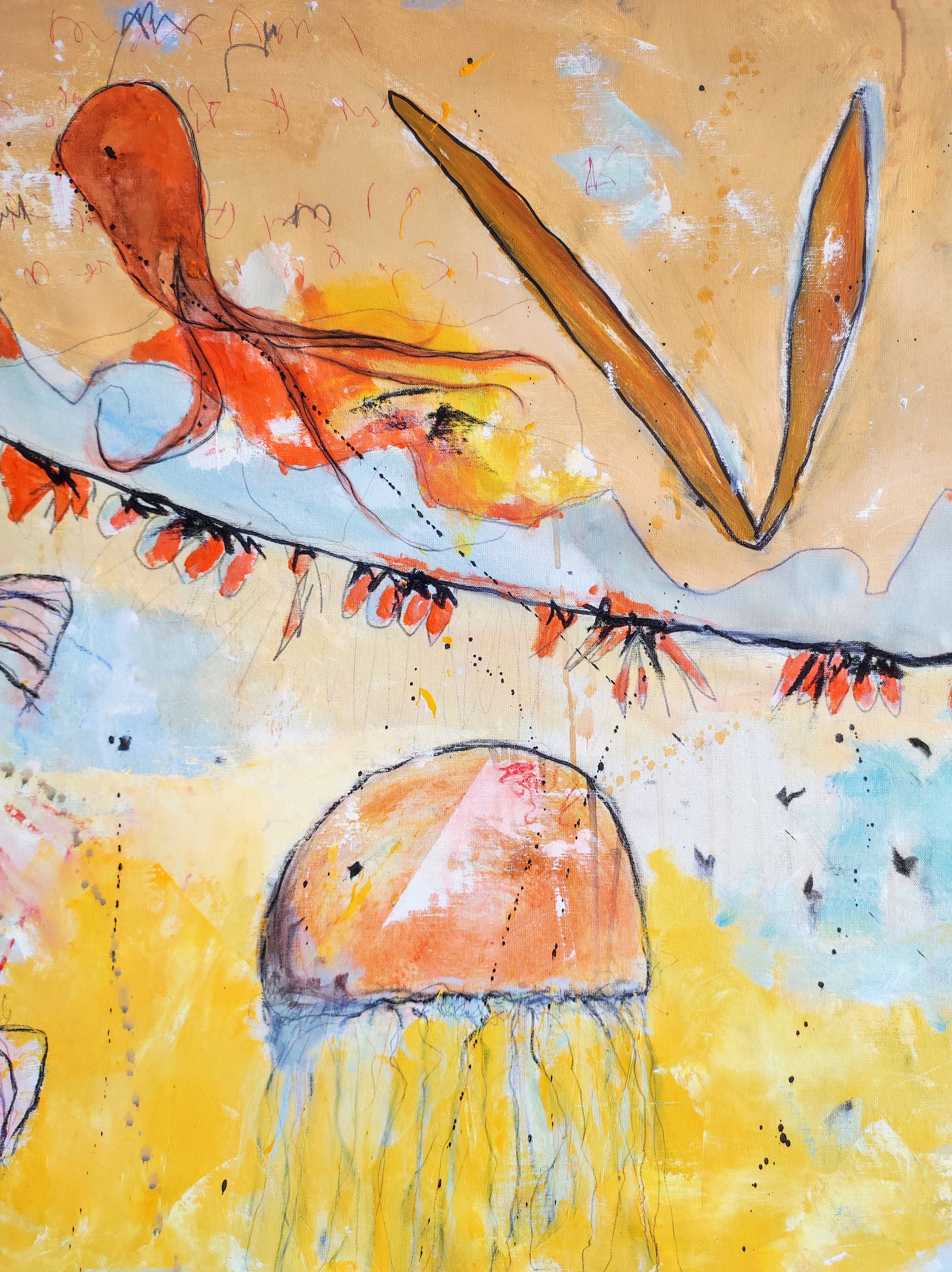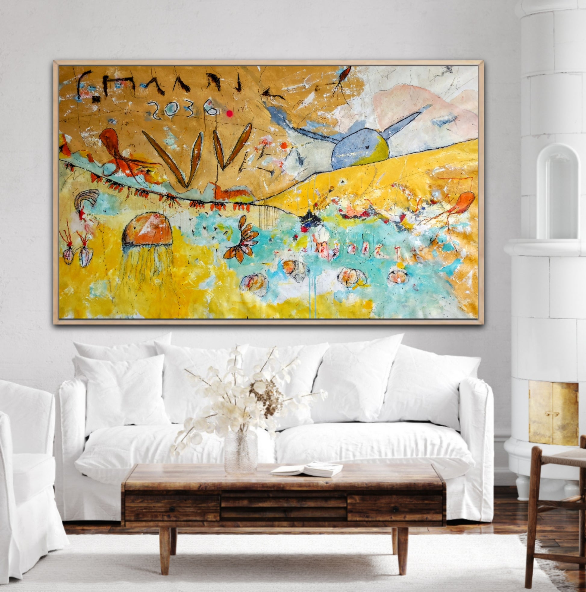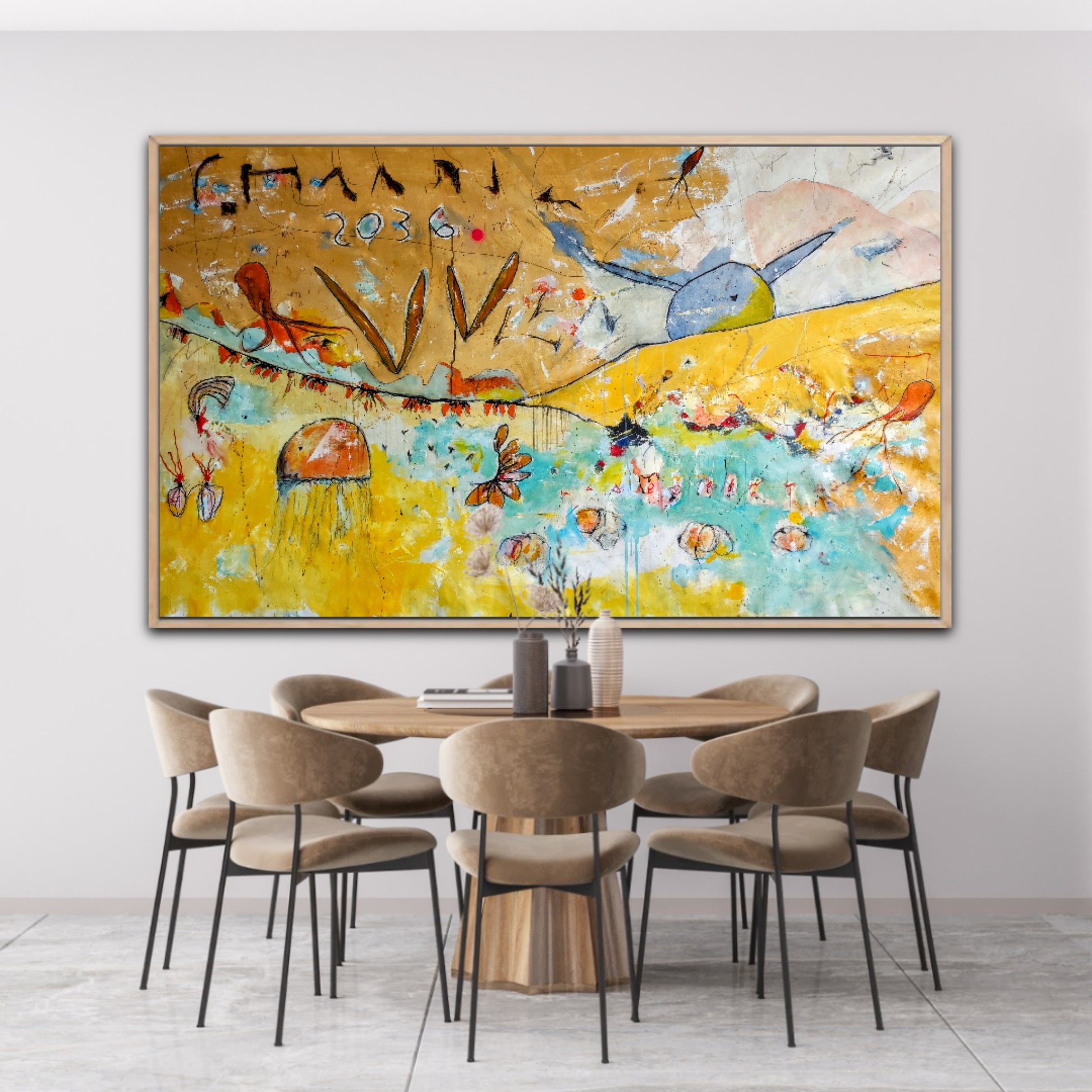 Técnica: acrílico, pigmentos, tinta china, ceras, carboncillo, pintura en spray, bolígrafo y lápiz.