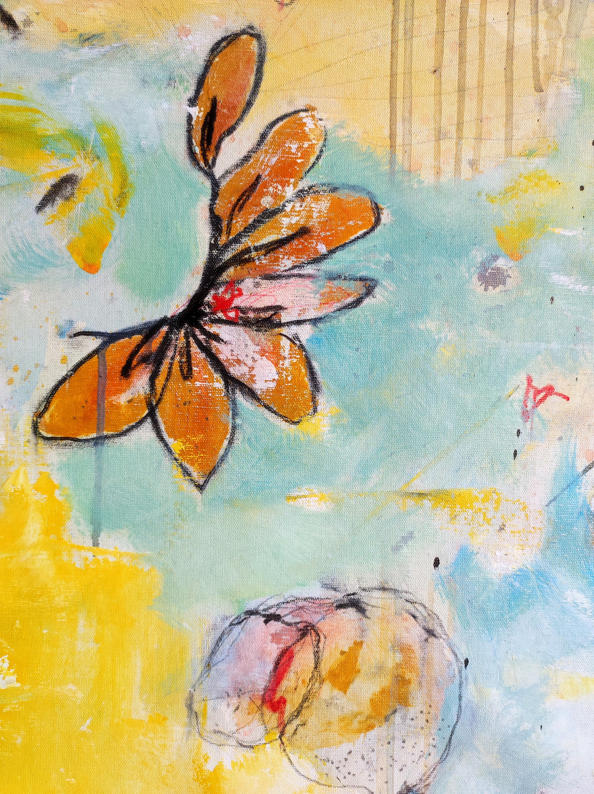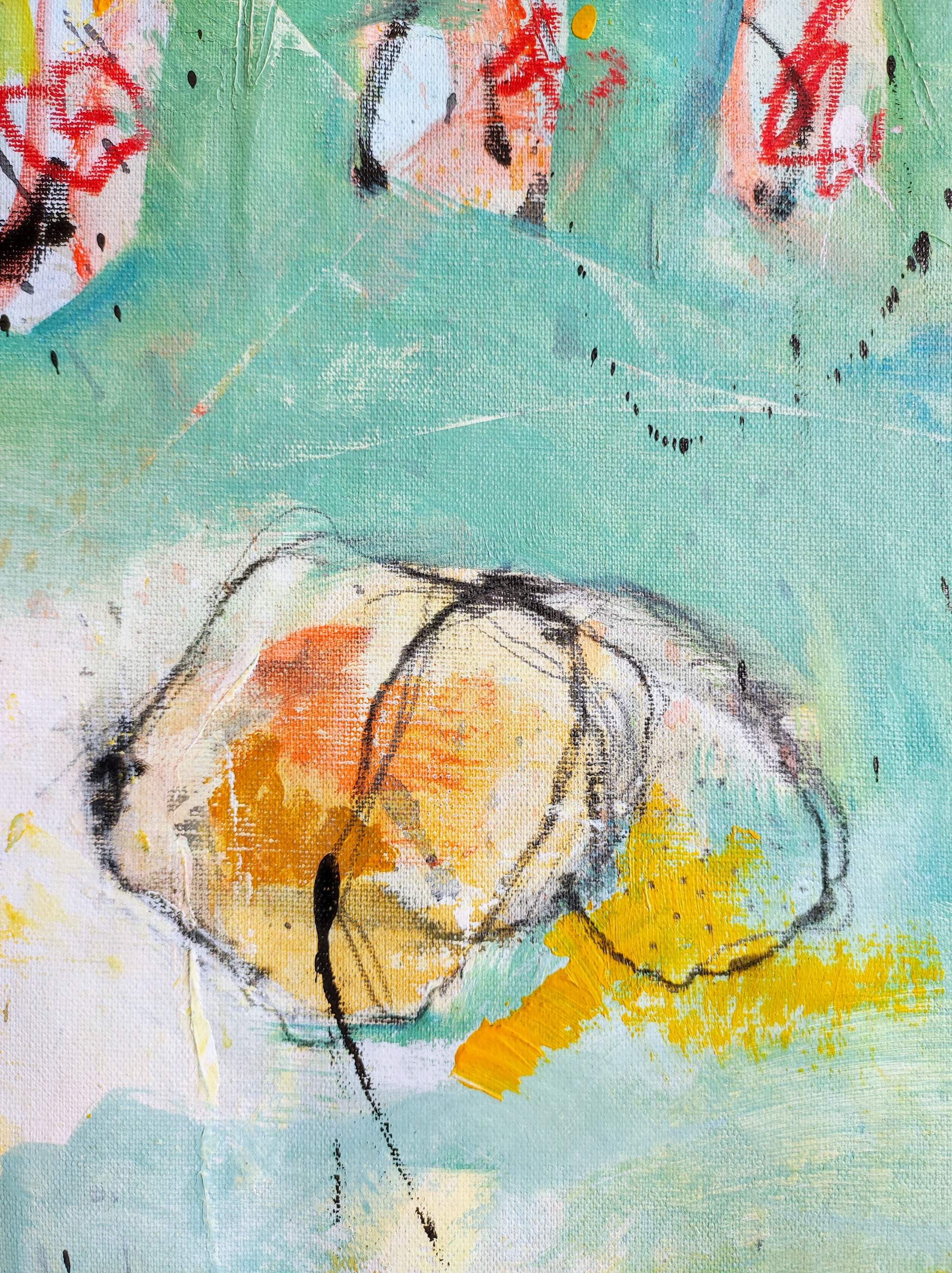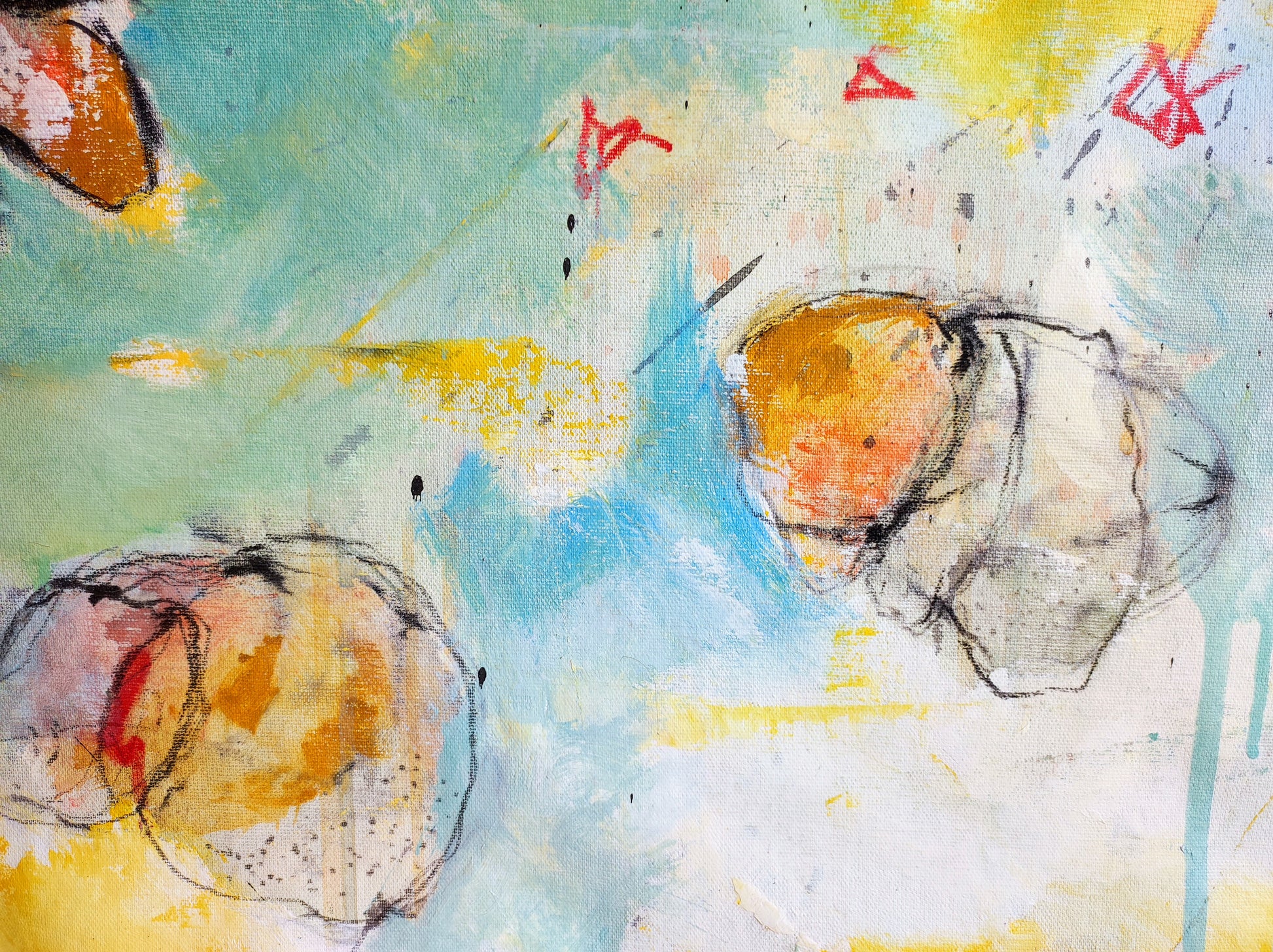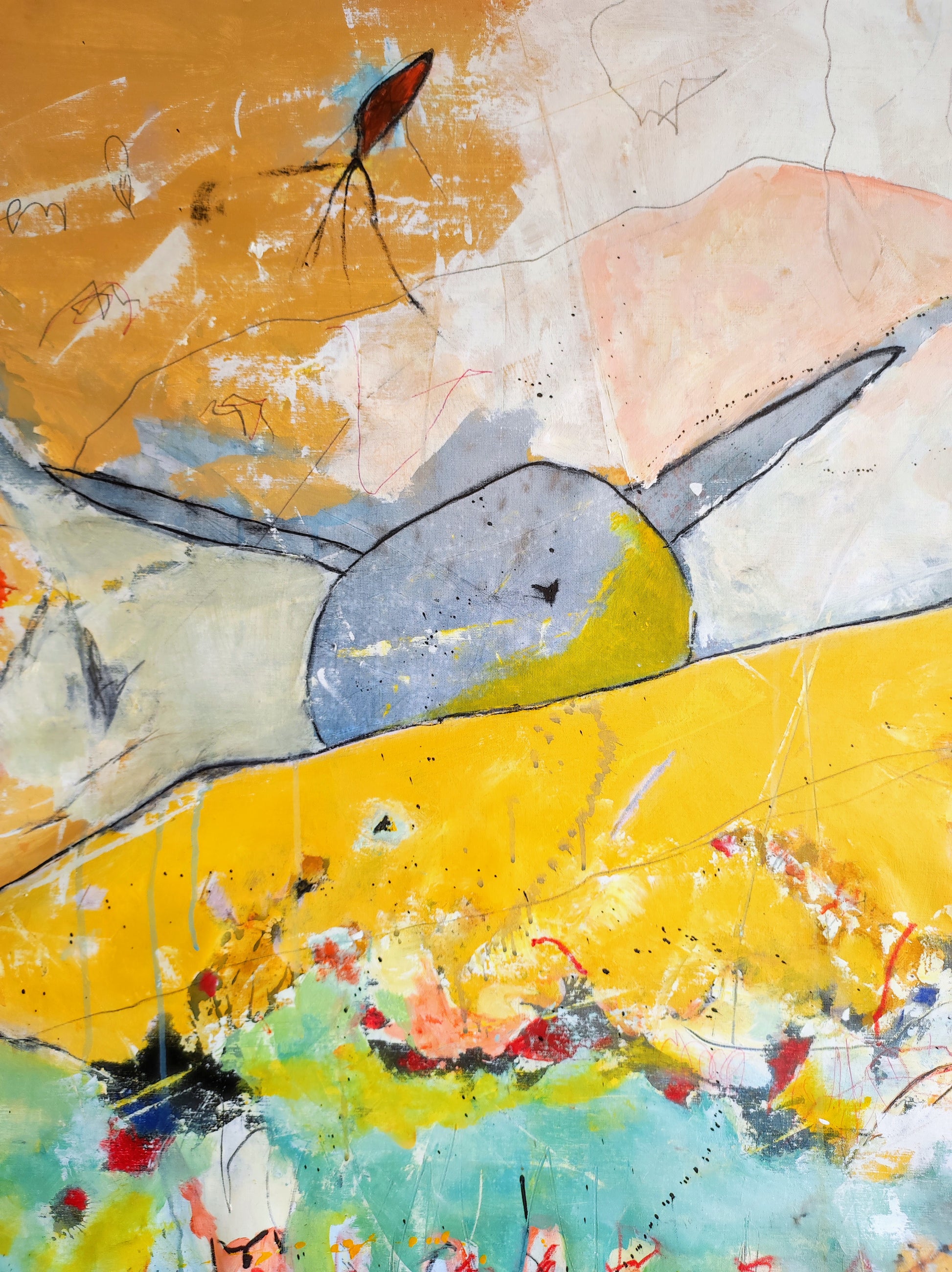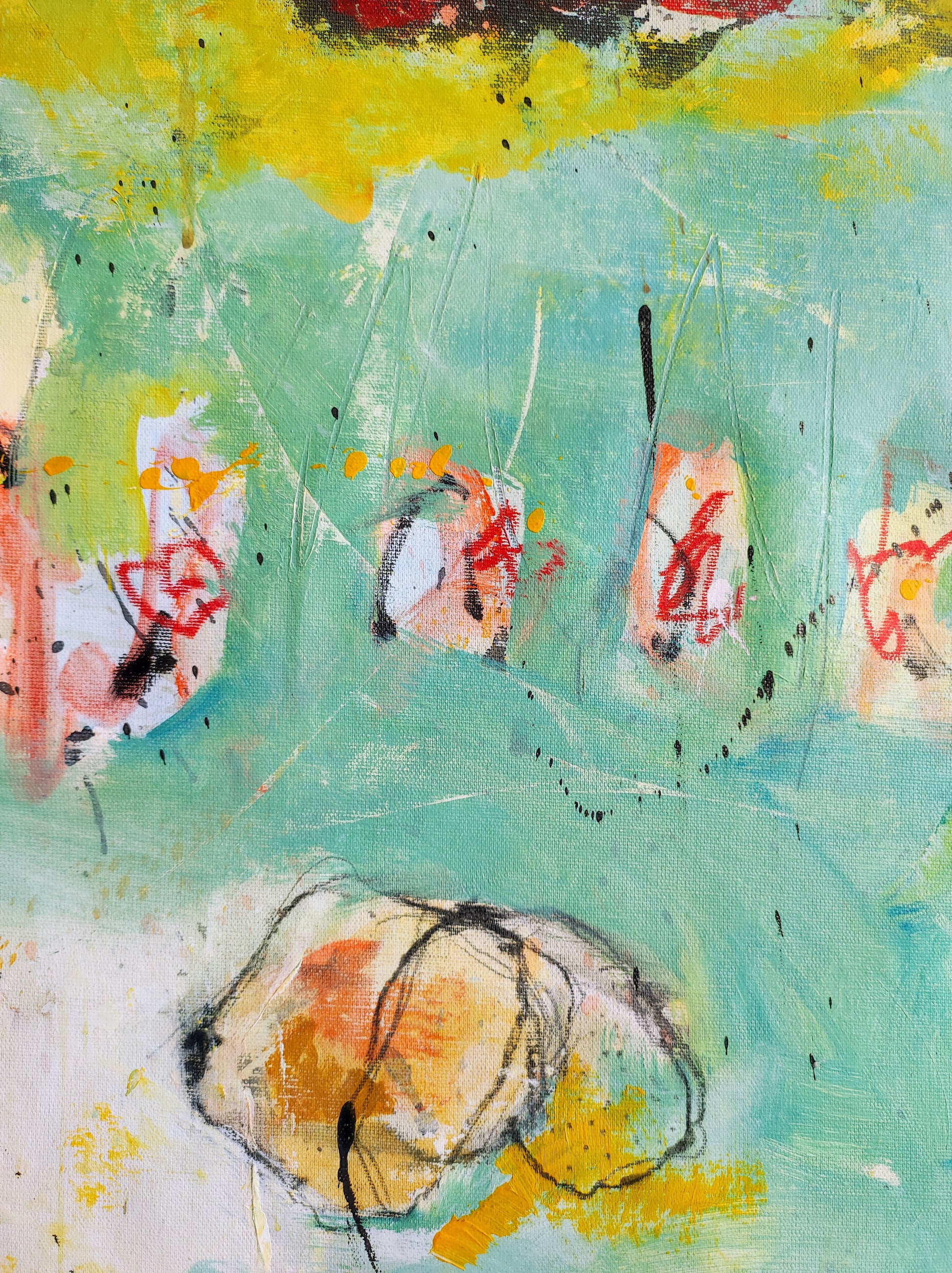 Pintura gestual, intuitiva, que deja que las cosas pasen y se apoya sobre lo que aparece. Aprovechando el accidente y aceptando las consecuencias.