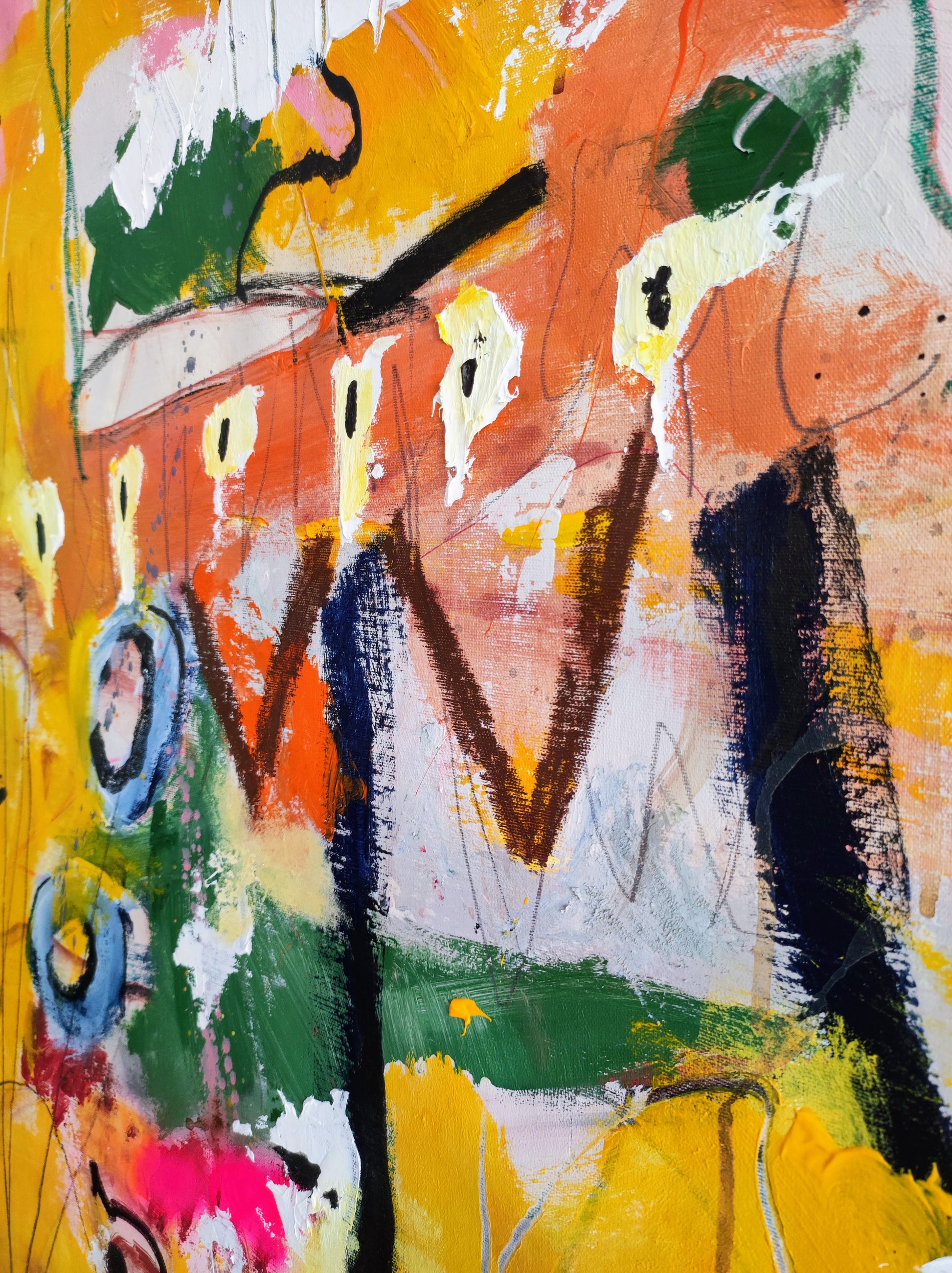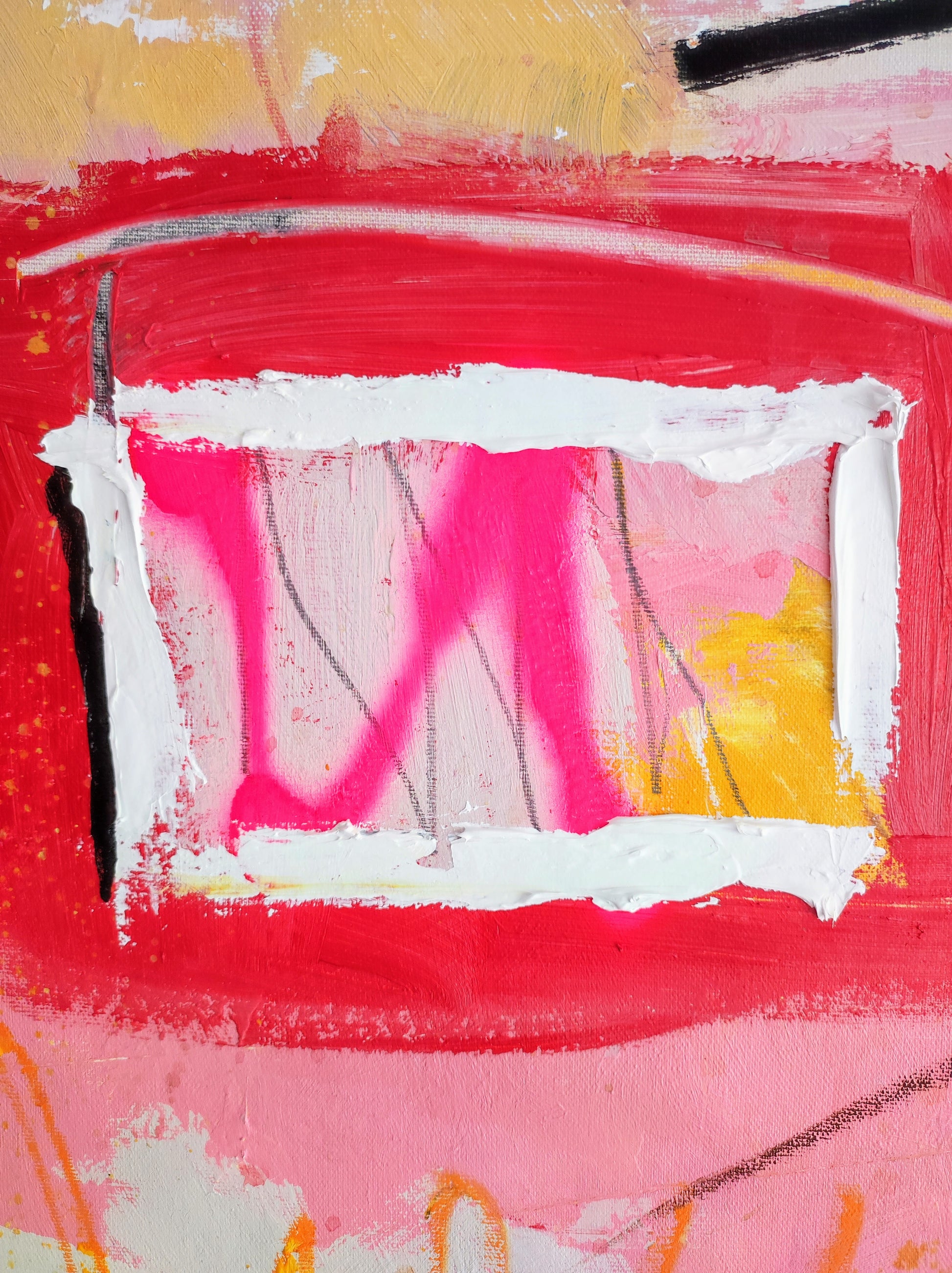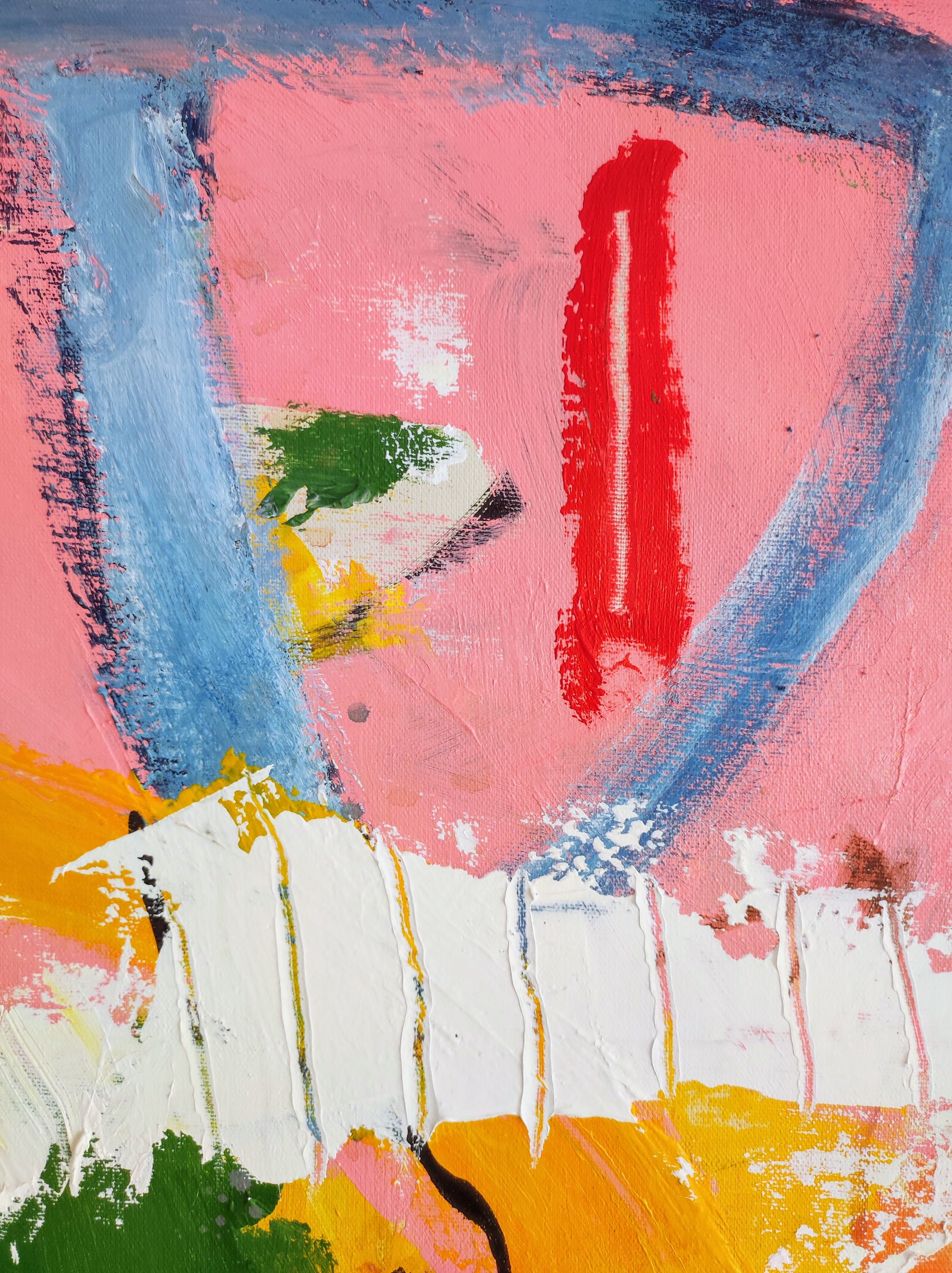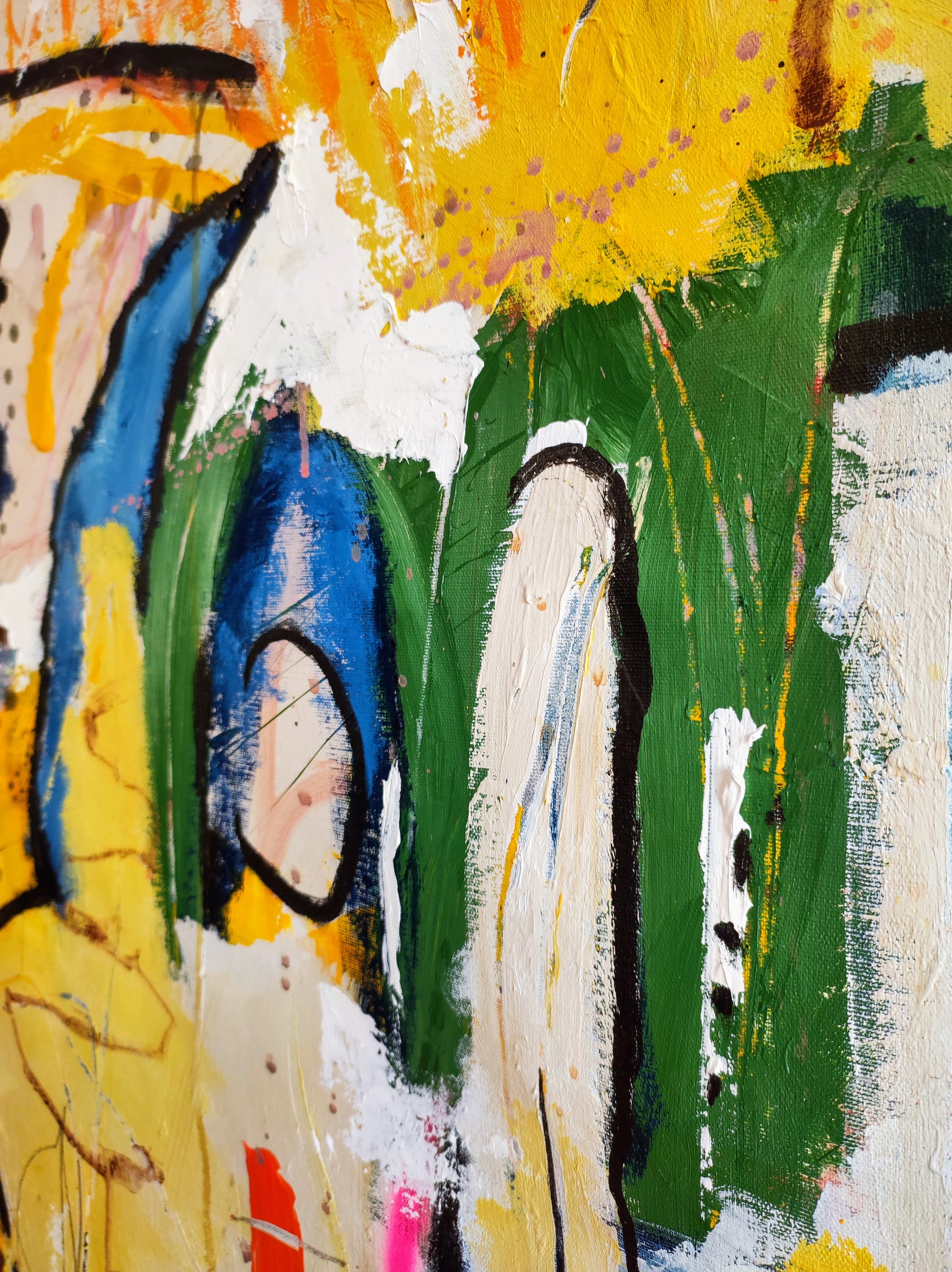 El juego del caos, de la experimentación, del aprendizaje. Todo se mezcla, con la mirada perdida. Improvisación, capas de color, trazos, marcas, nada tiene sentido hasta que empieza a tenerlo, poco a poco las piezas encajan, parecido a la vida misma.