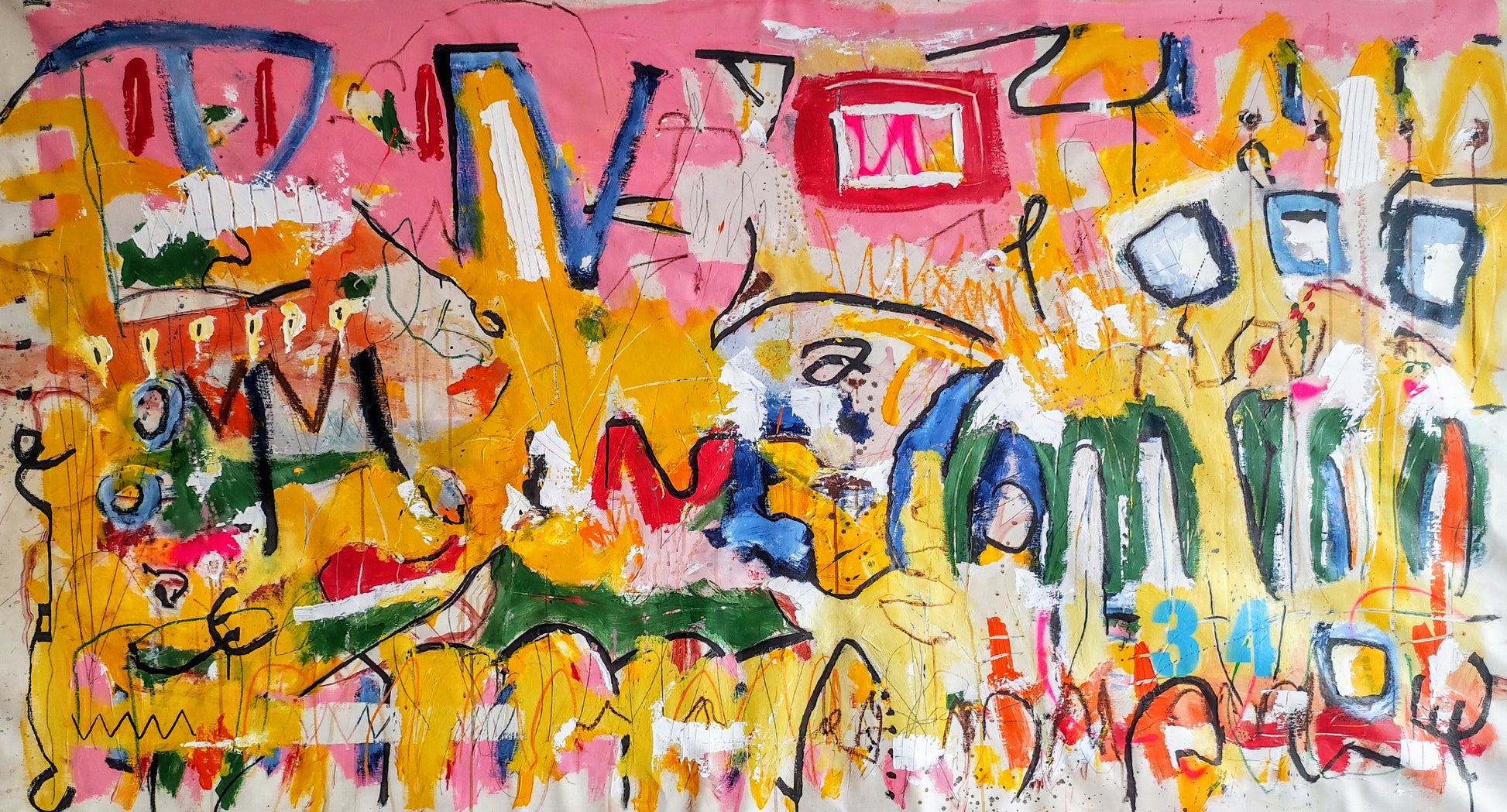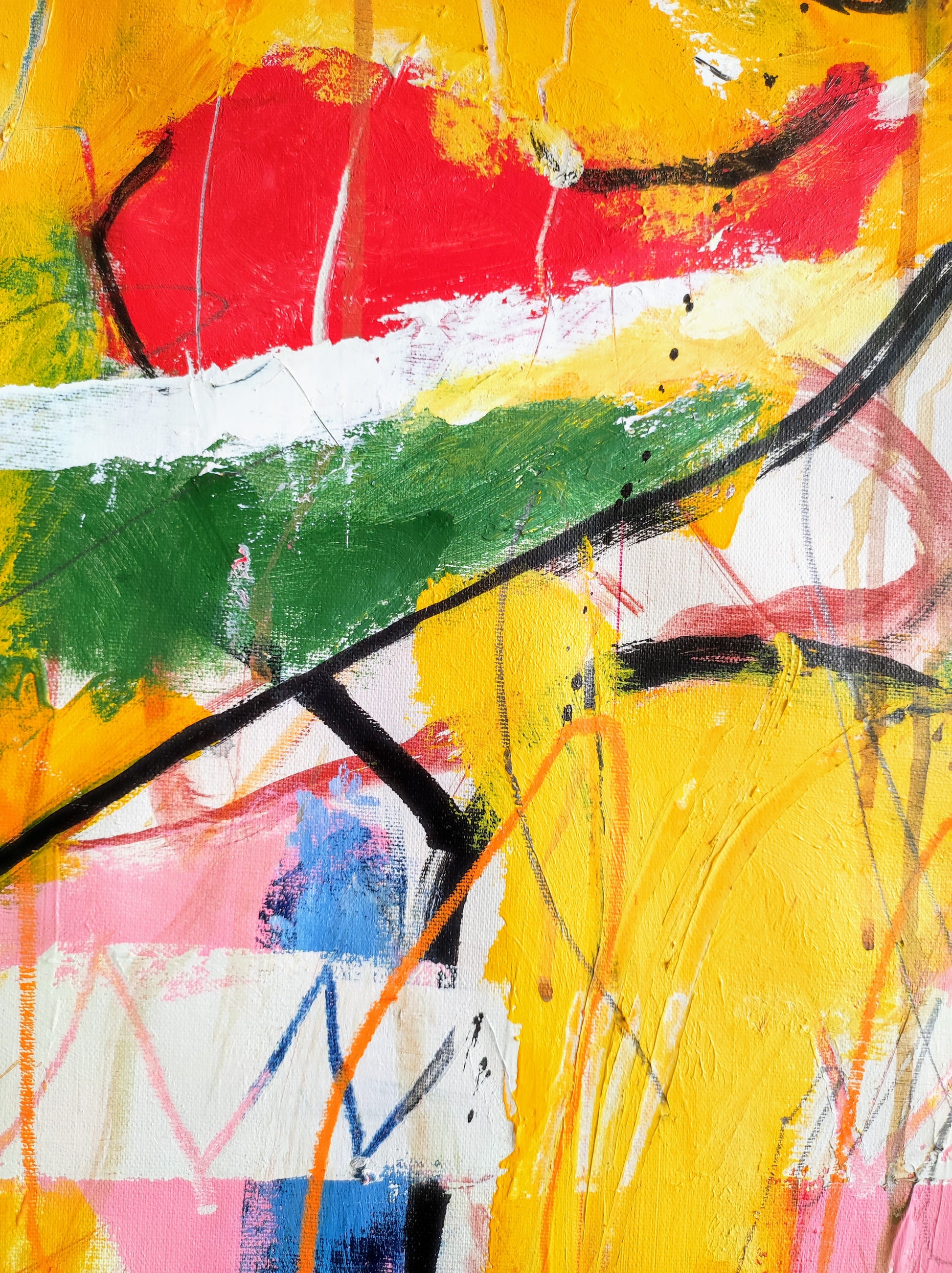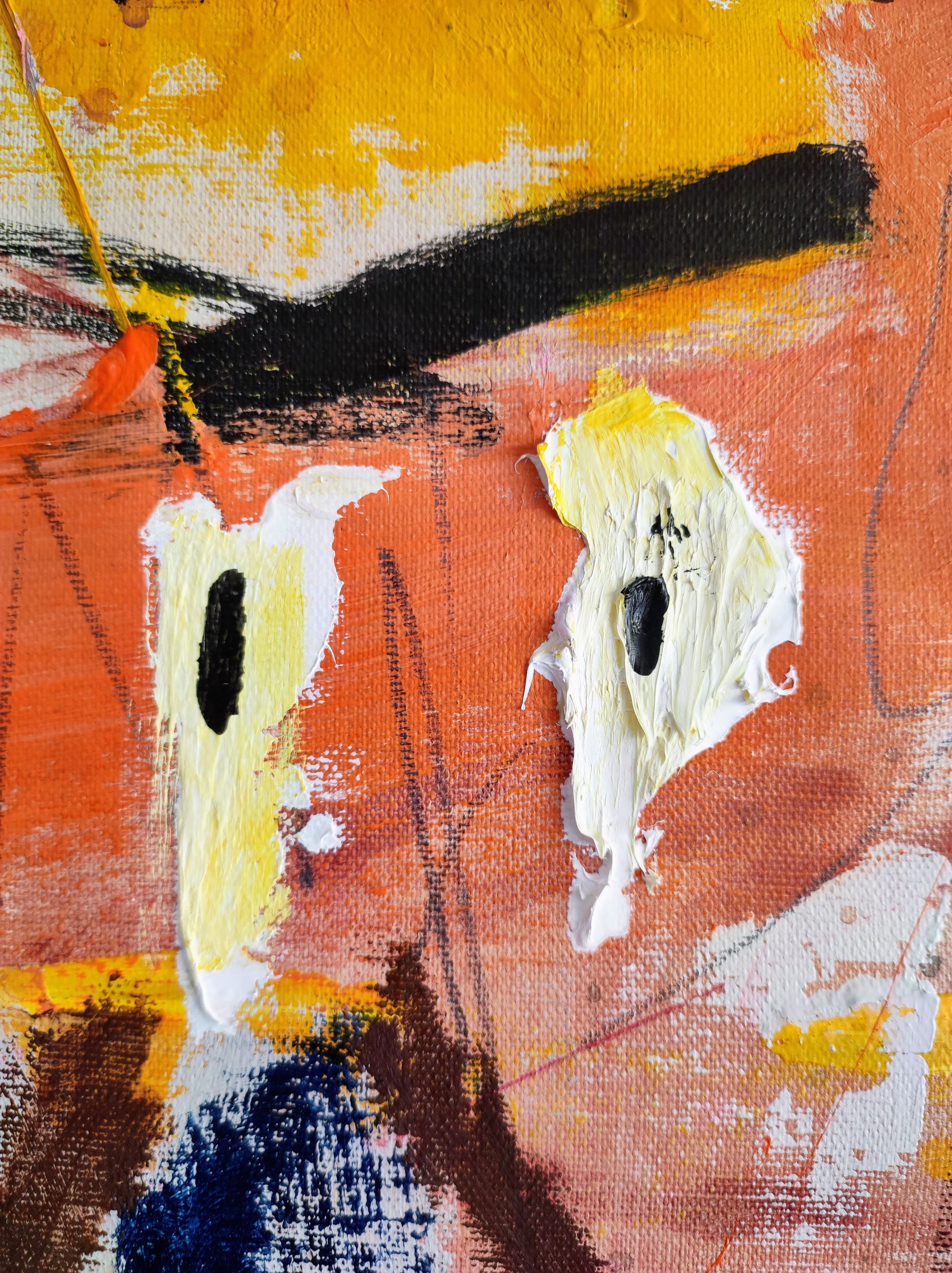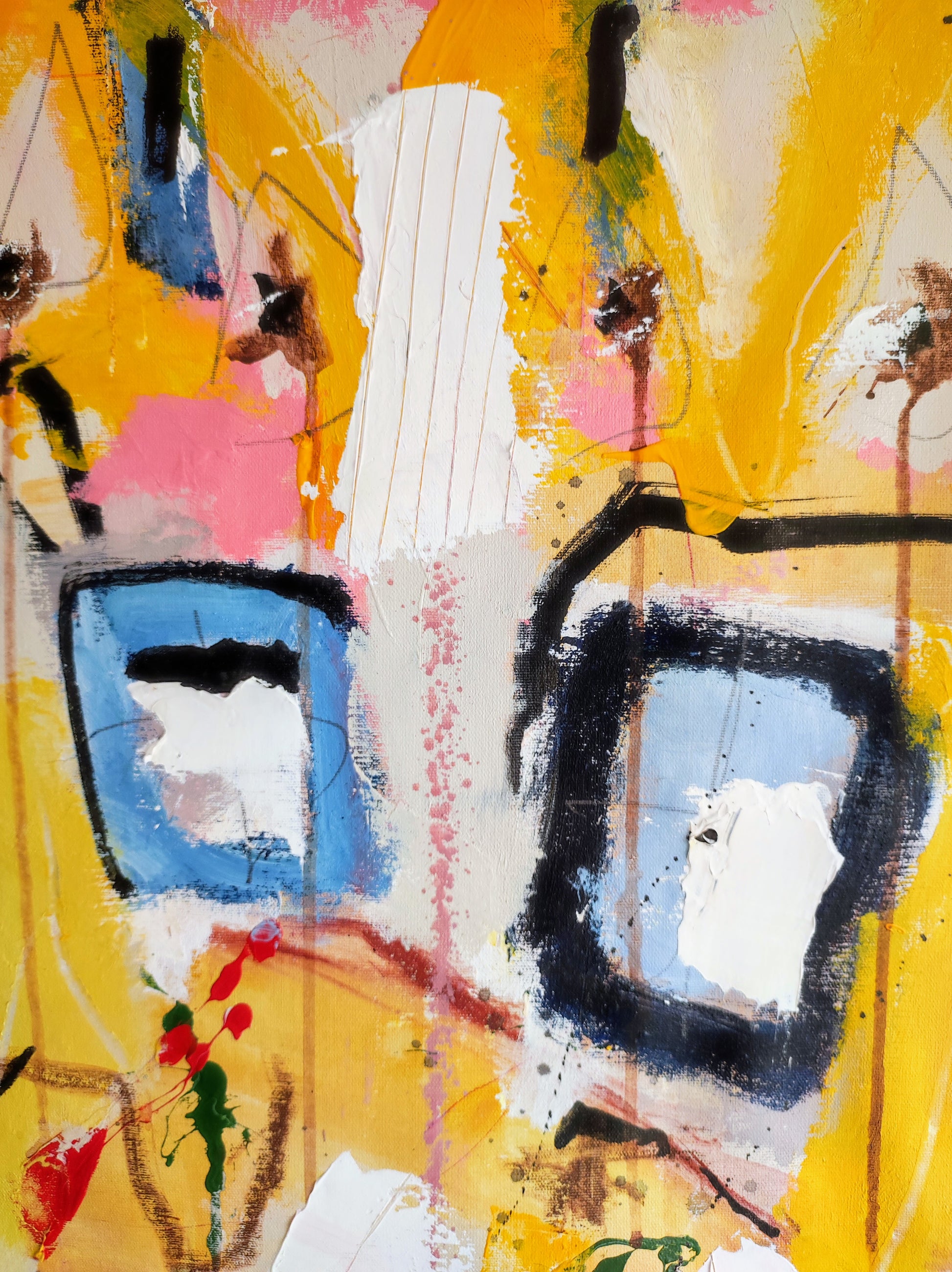 El juego del caos, de la experimentación, del aprendizaje. Todo se mezcla, con la mirada perdida. Improvisación, capas de color, trazos, marcas, nada tiene sentido hasta que empieza a tenerlo, poco a poco las piezas encajan, parecido a la vida misma.