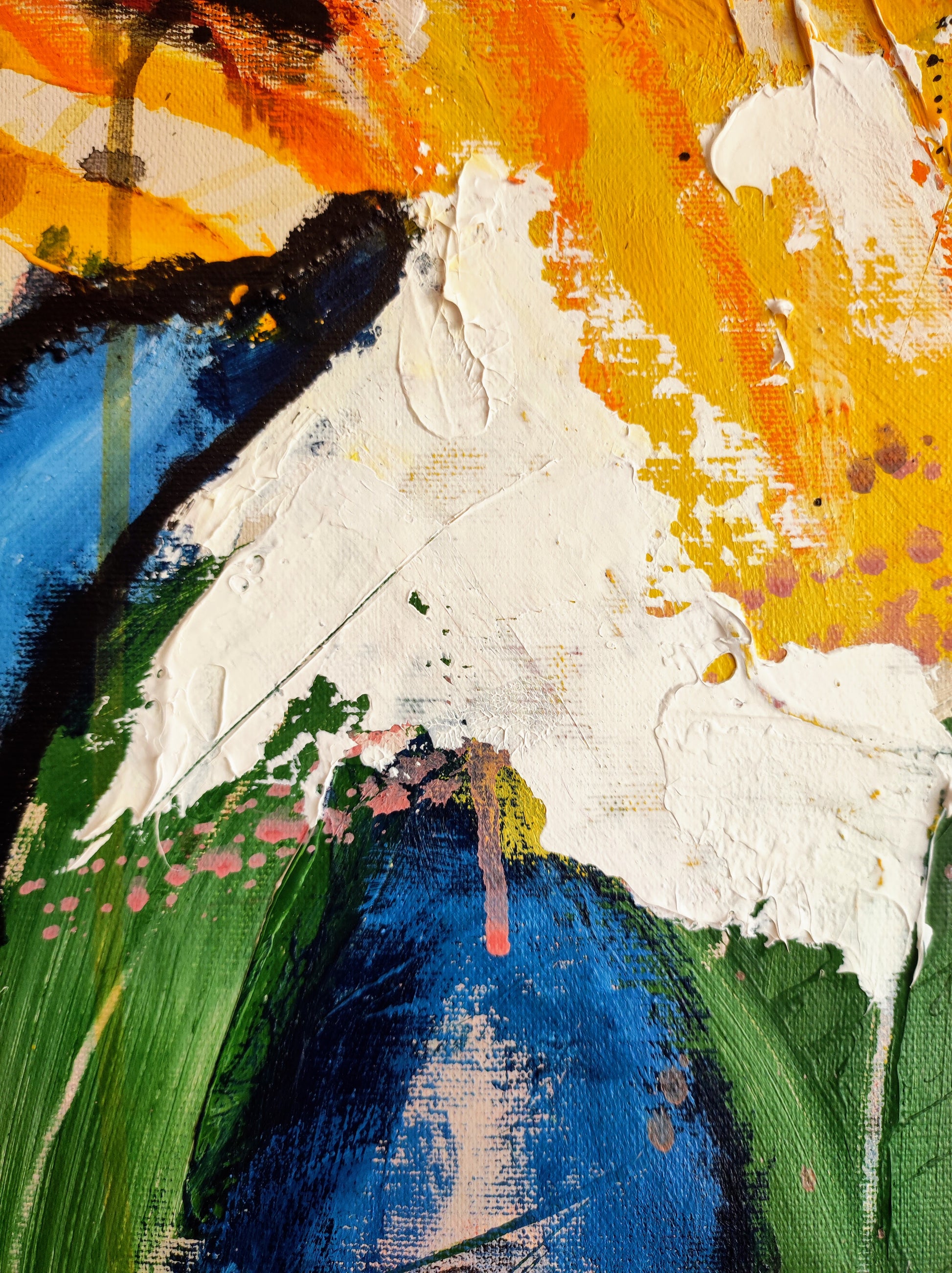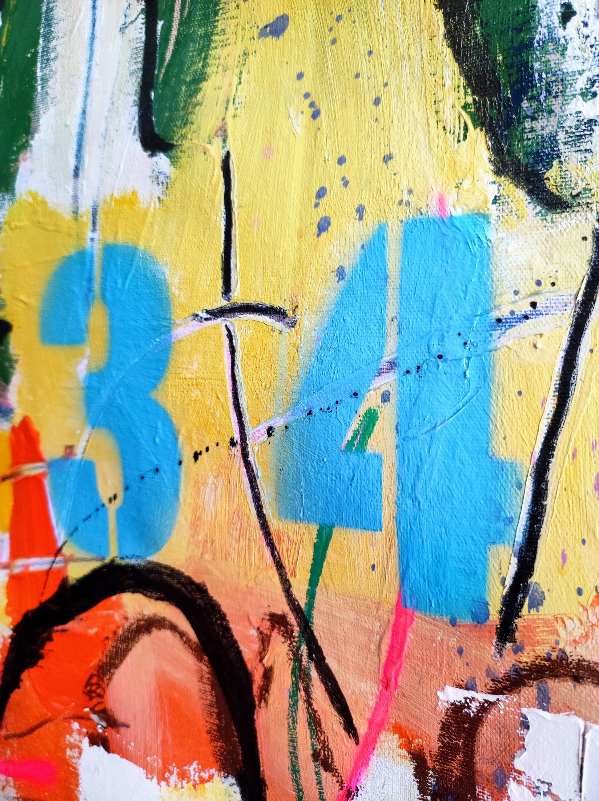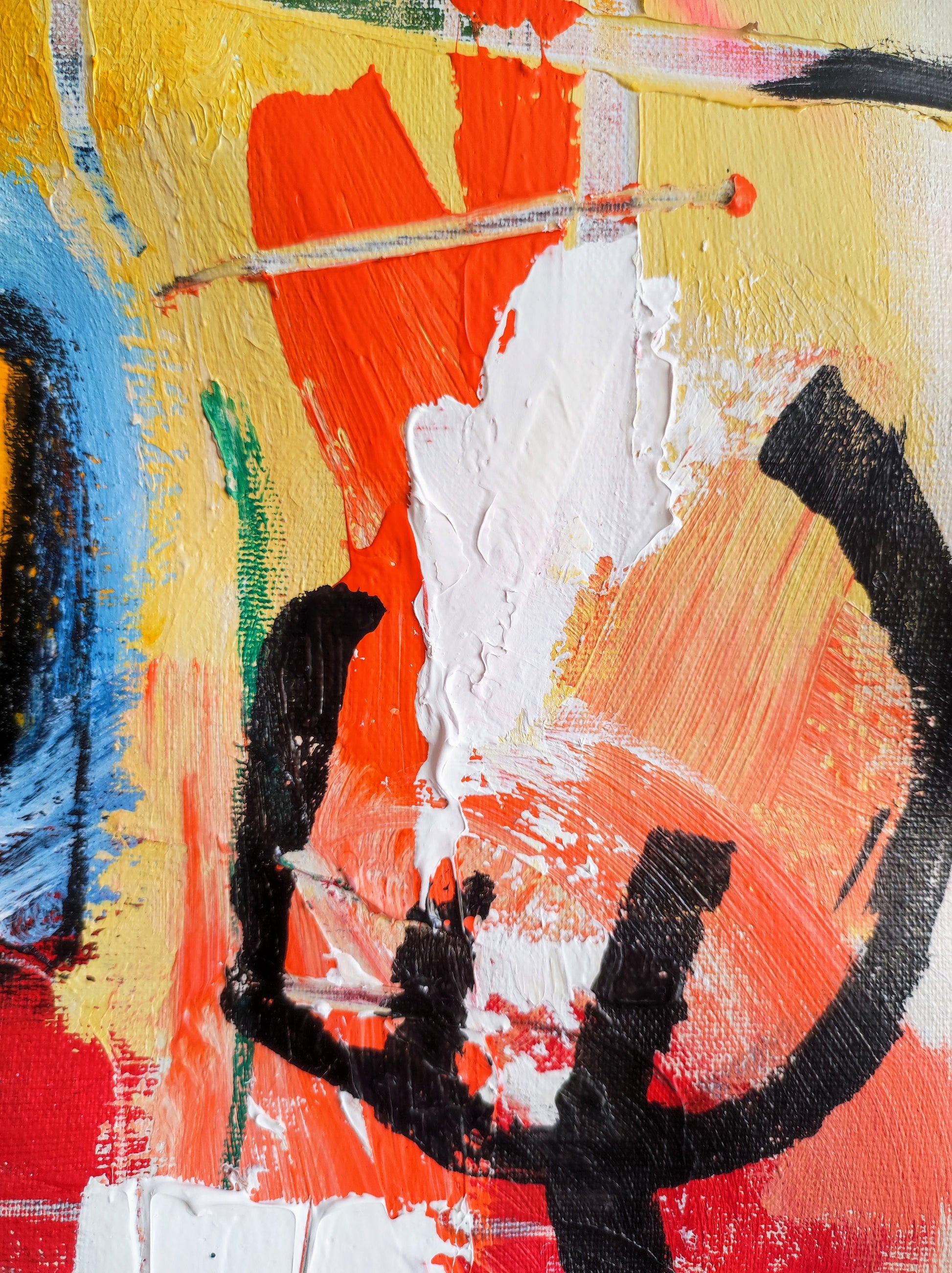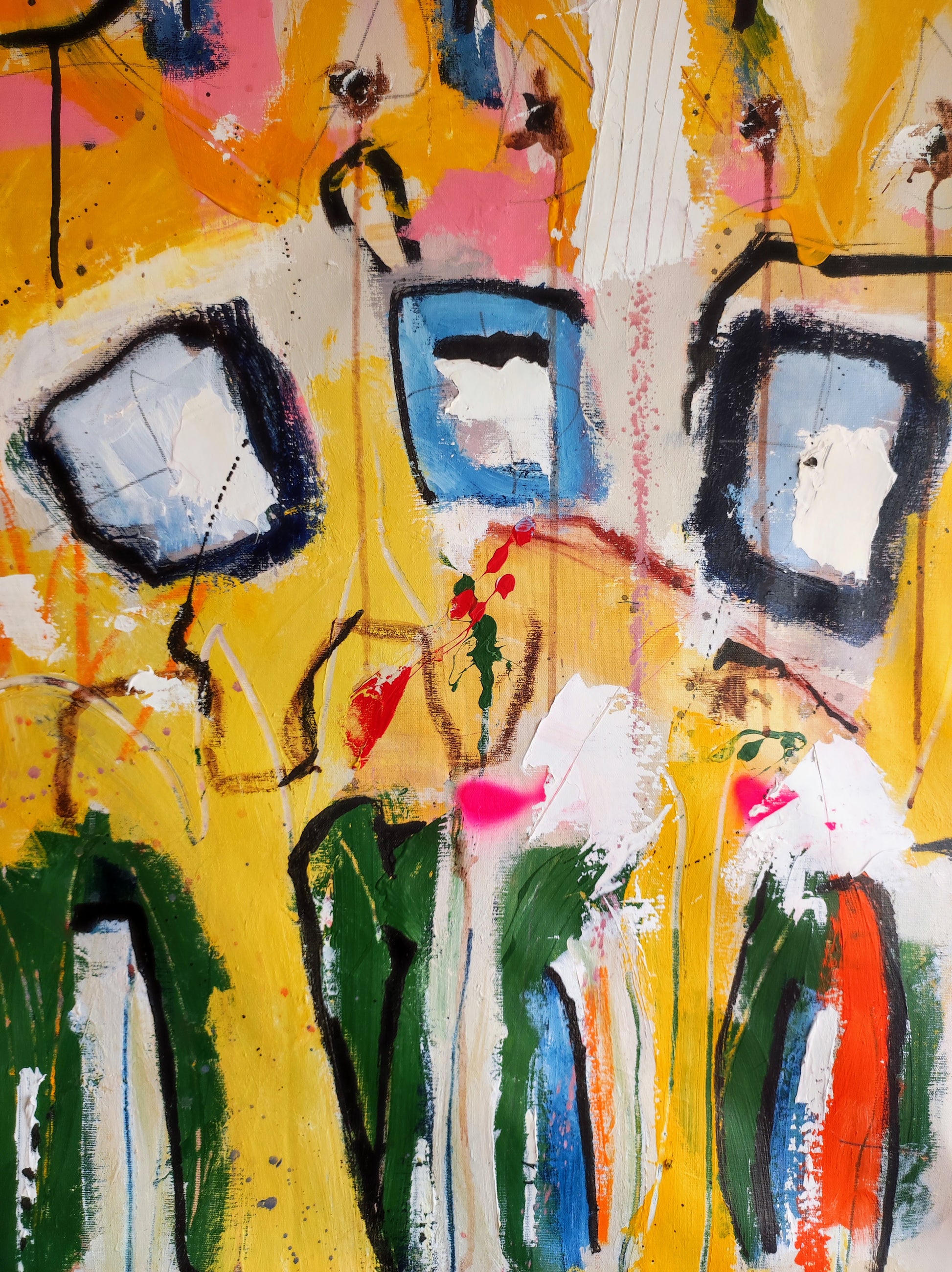 El juego del caos, de la experimentación, del aprendizaje. Todo se mezcla, con la mirada perdida. Improvisación, capas de color, trazos, marcas, nada tiene sentido hasta que empieza a tenerlo, poco a poco las piezas encajan, parecido a la vida misma.