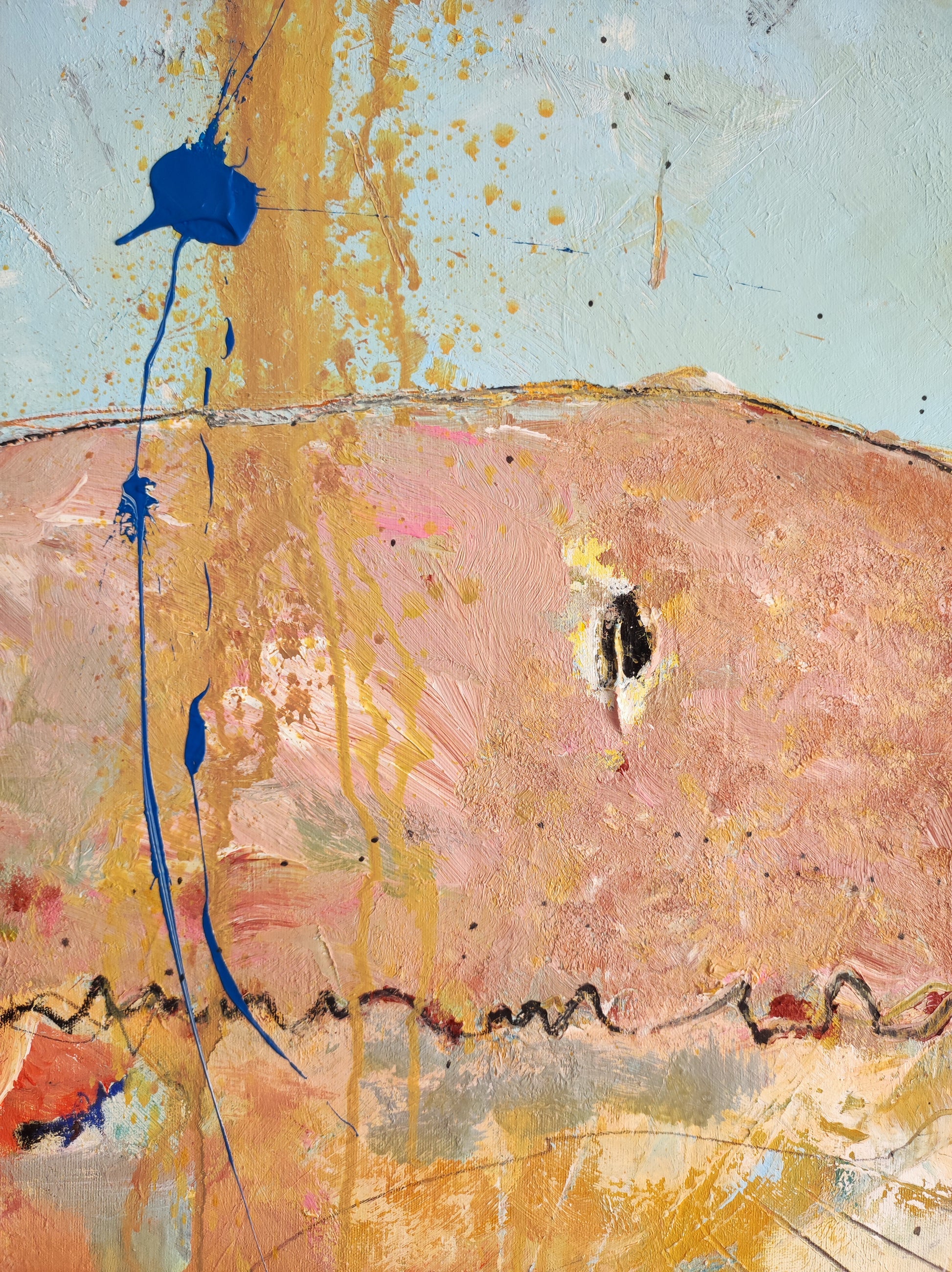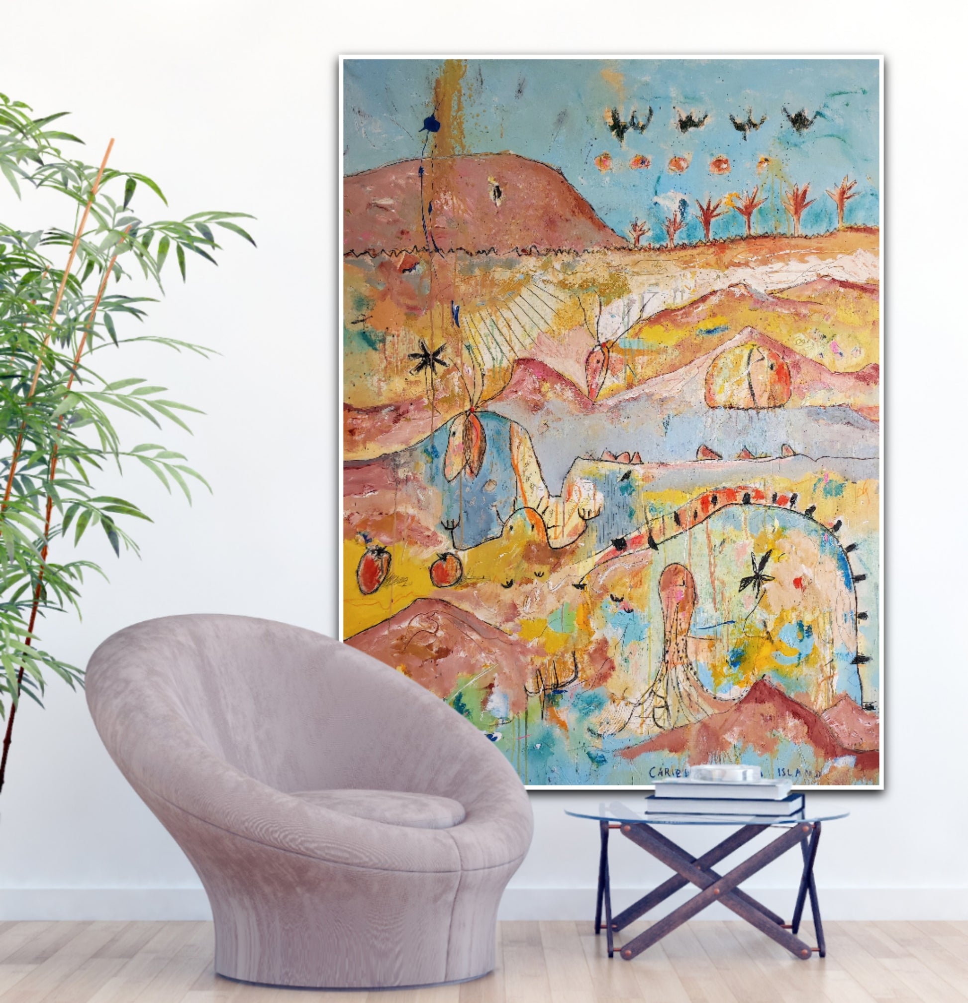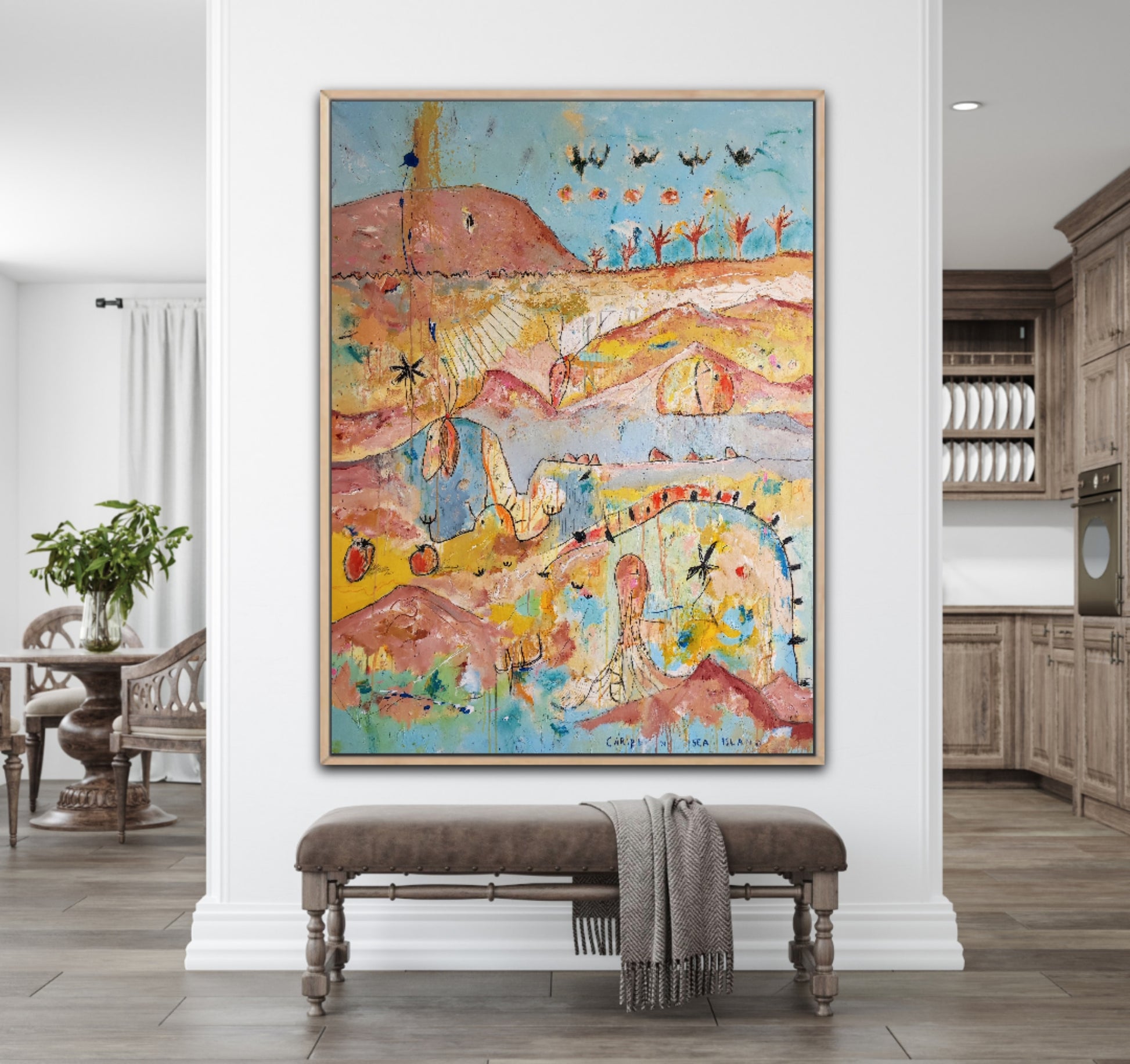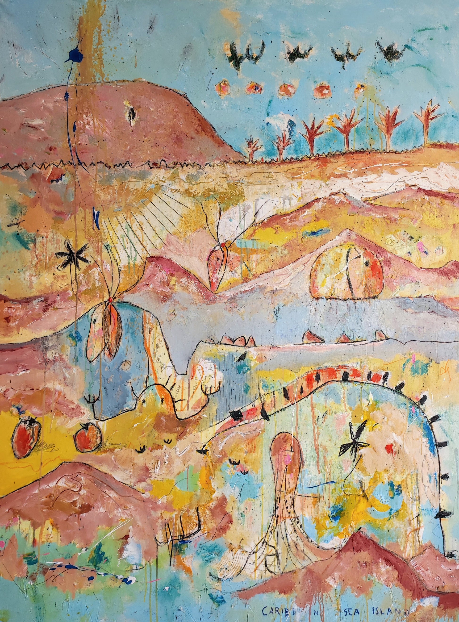 Técnica: acrílico, pigmentos, gesso, tinta china, ceras, carboncillo y lápiz.