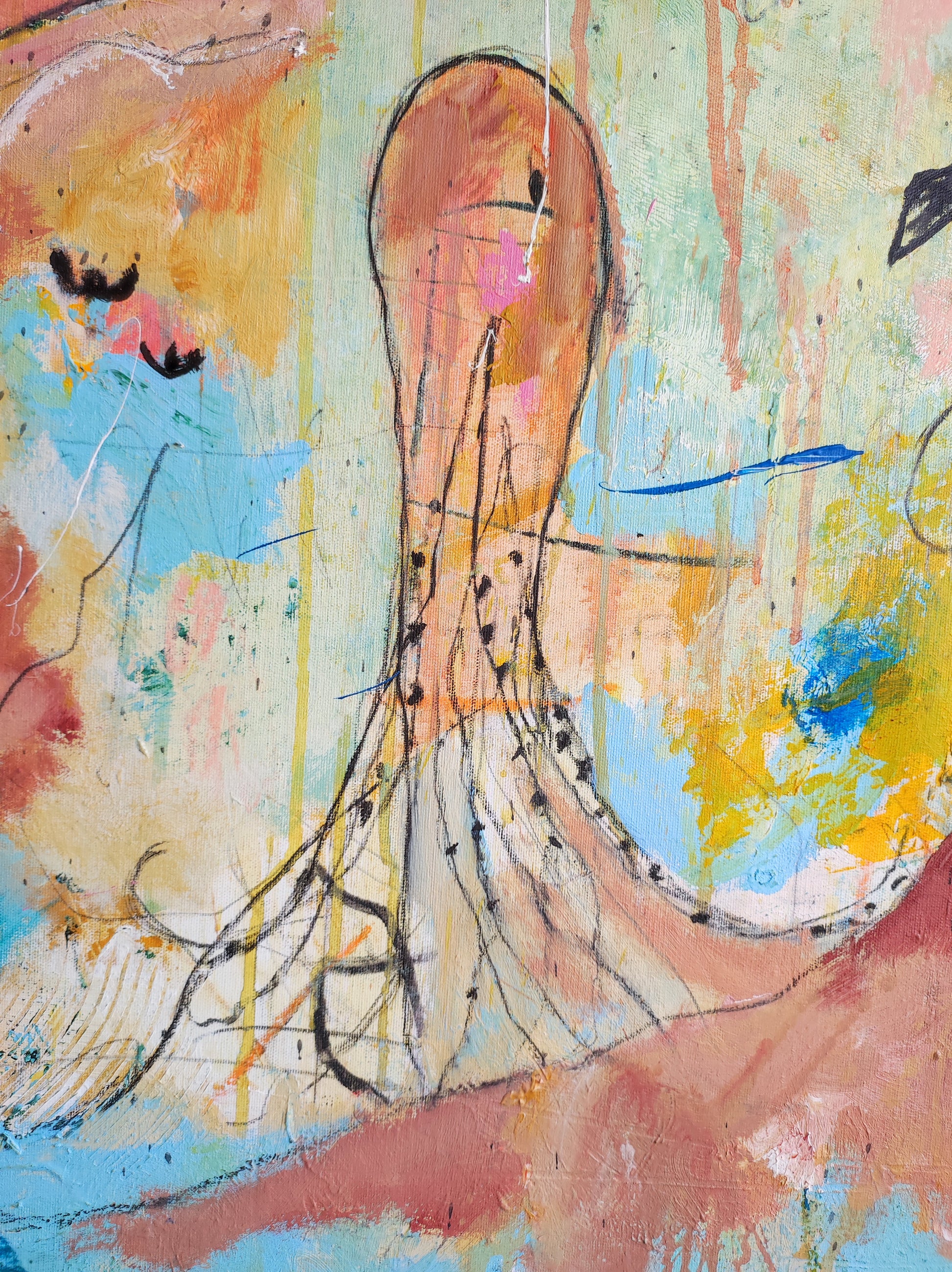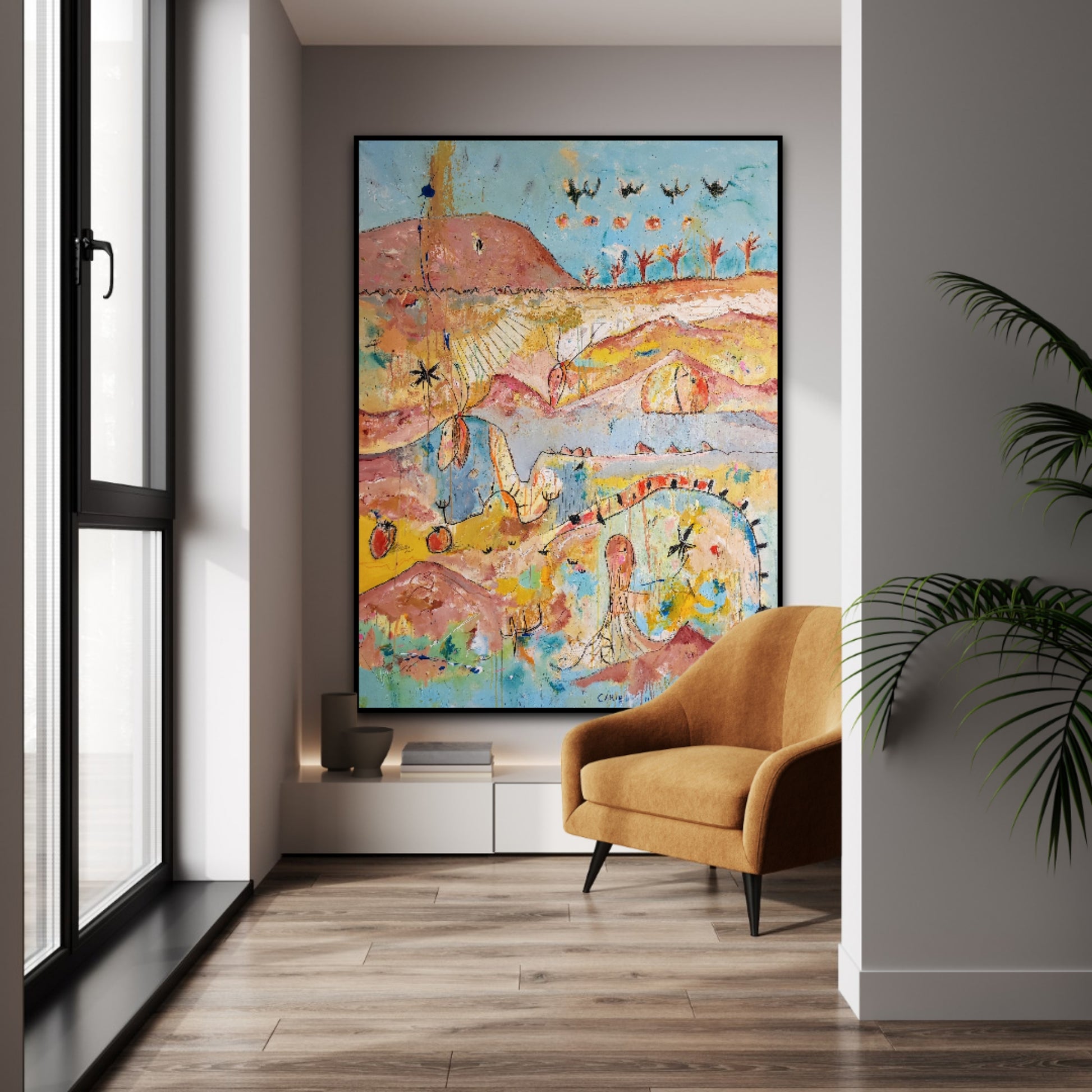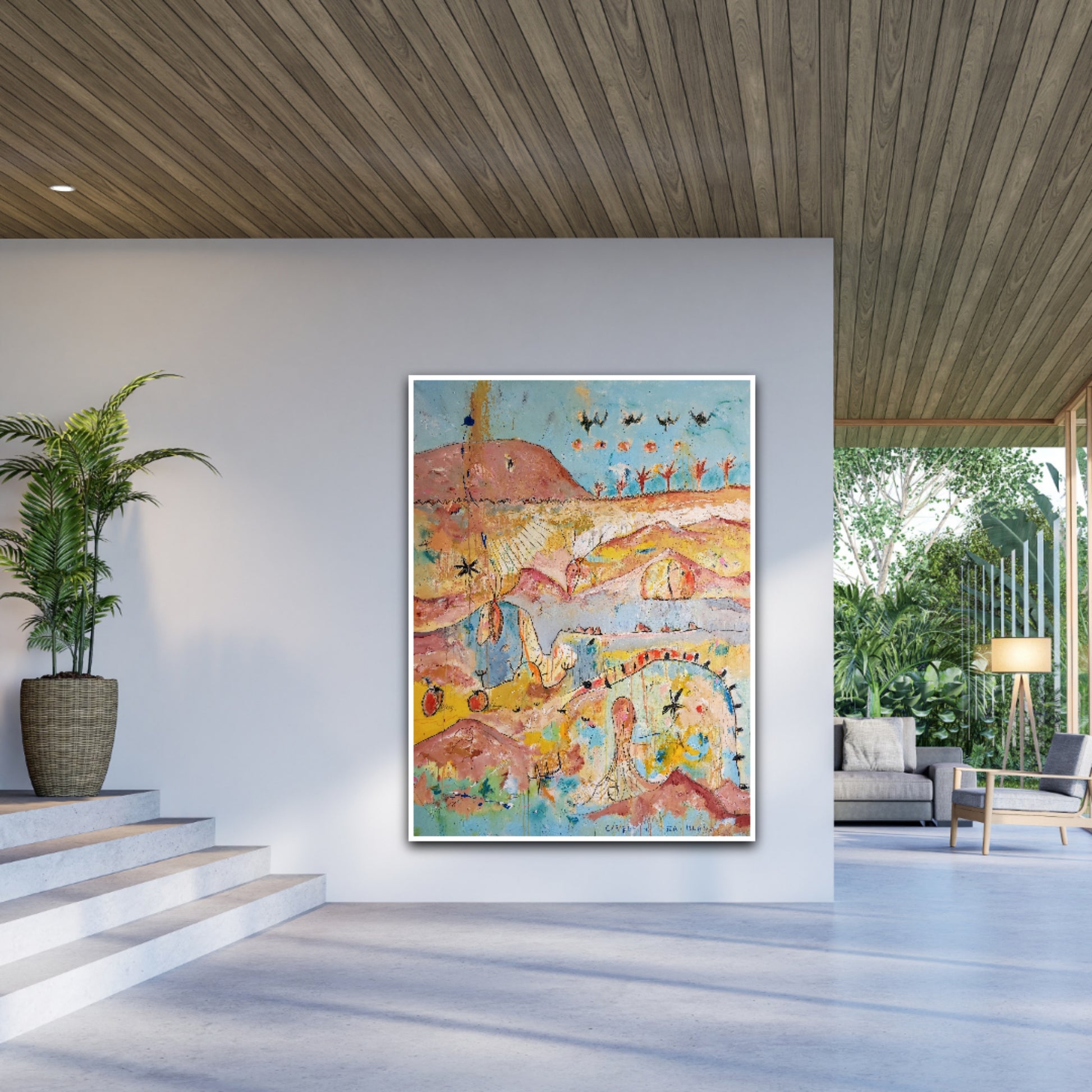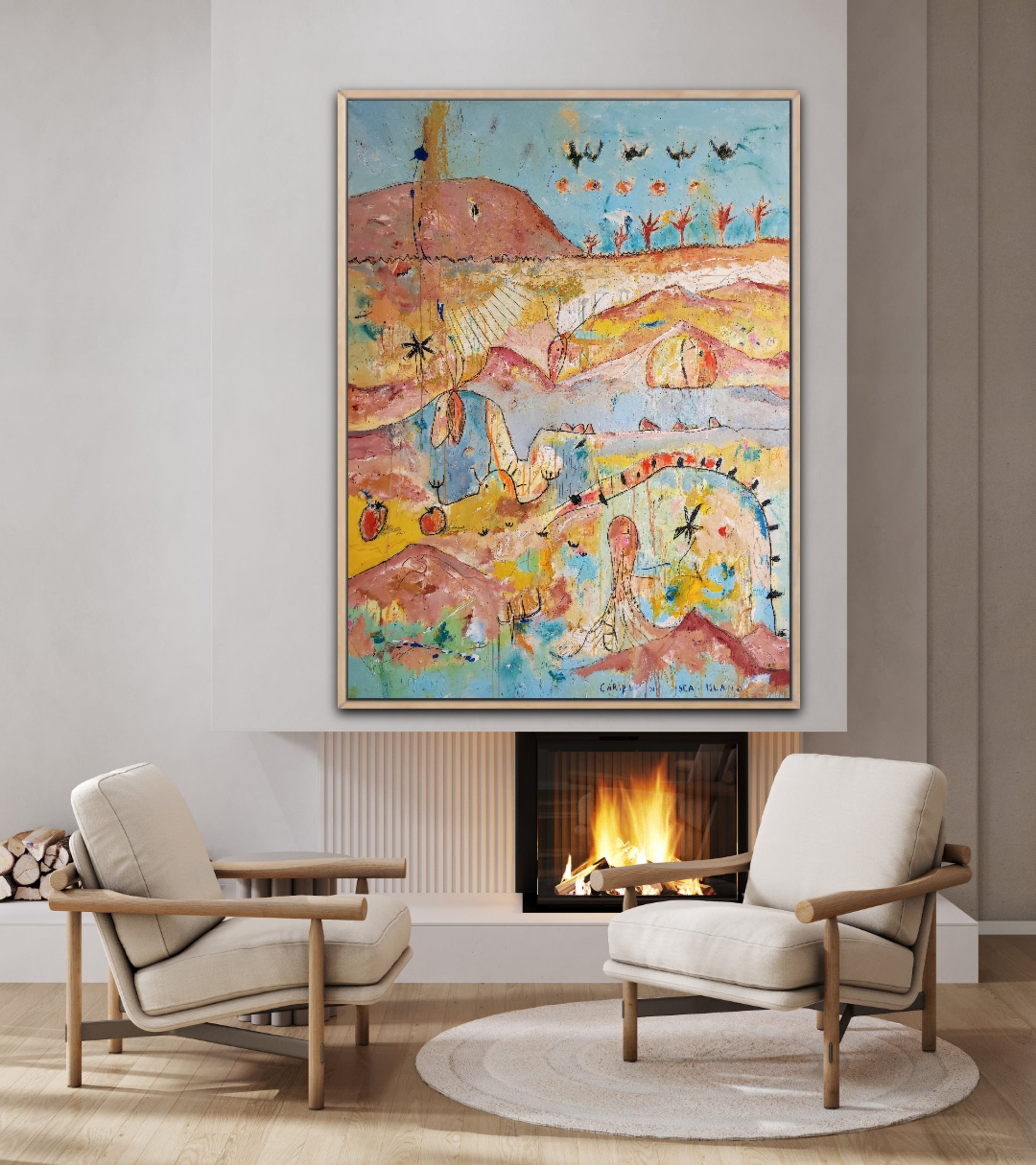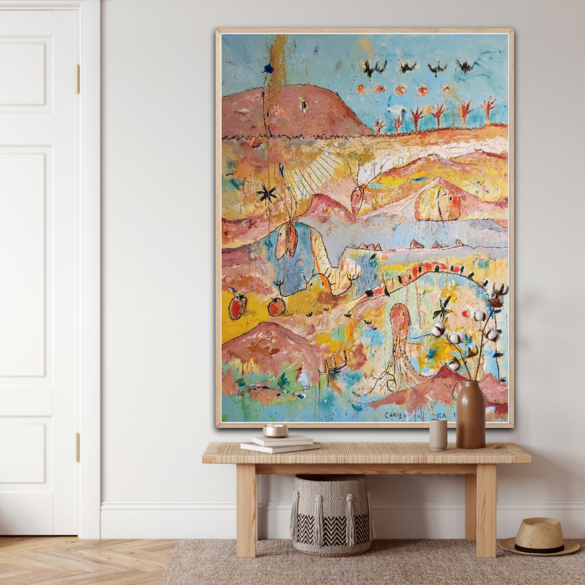 Técnica: acrílico, pigmentos, gesso, tinta china, ceras, carboncillo y lápiz.