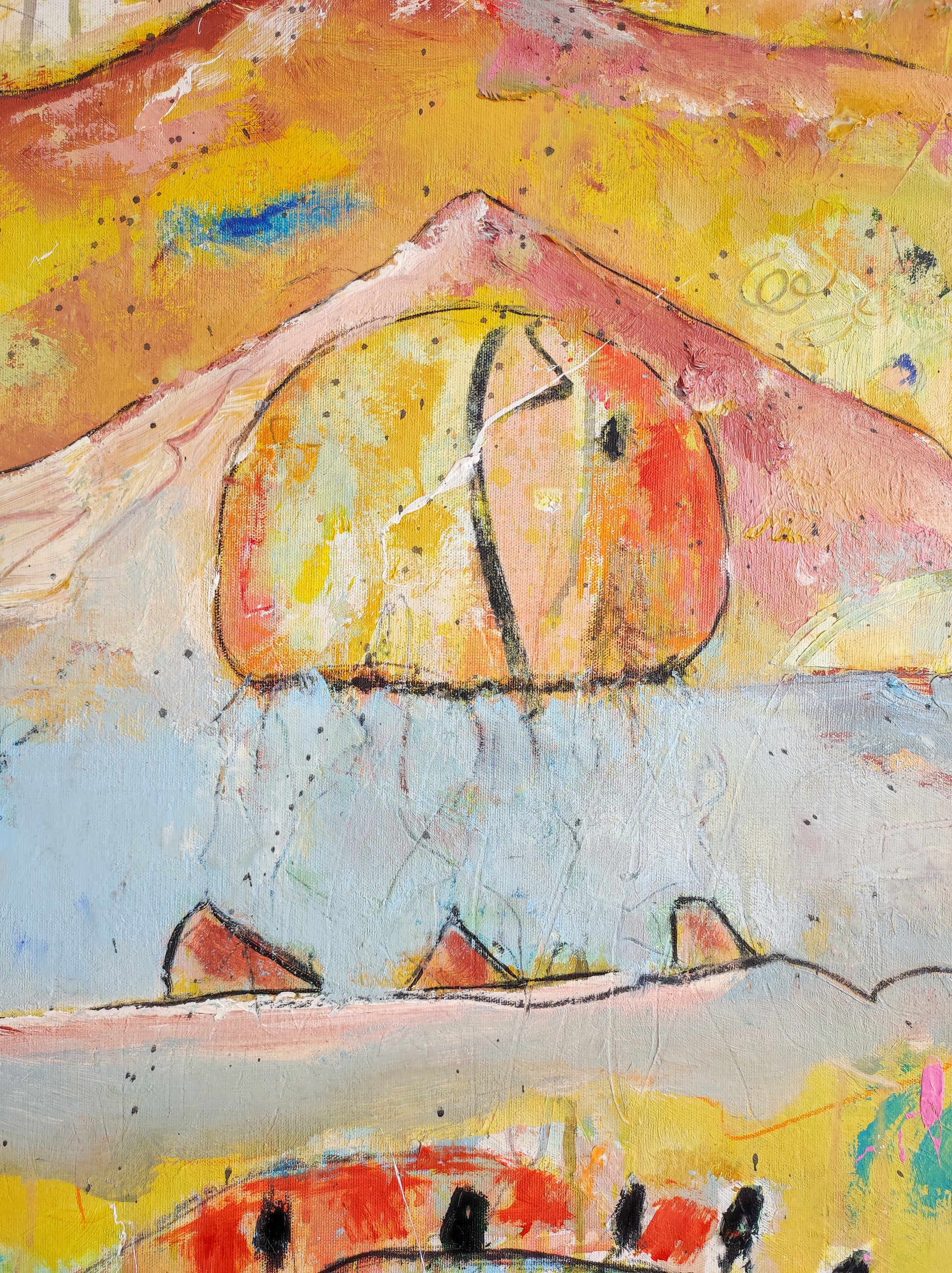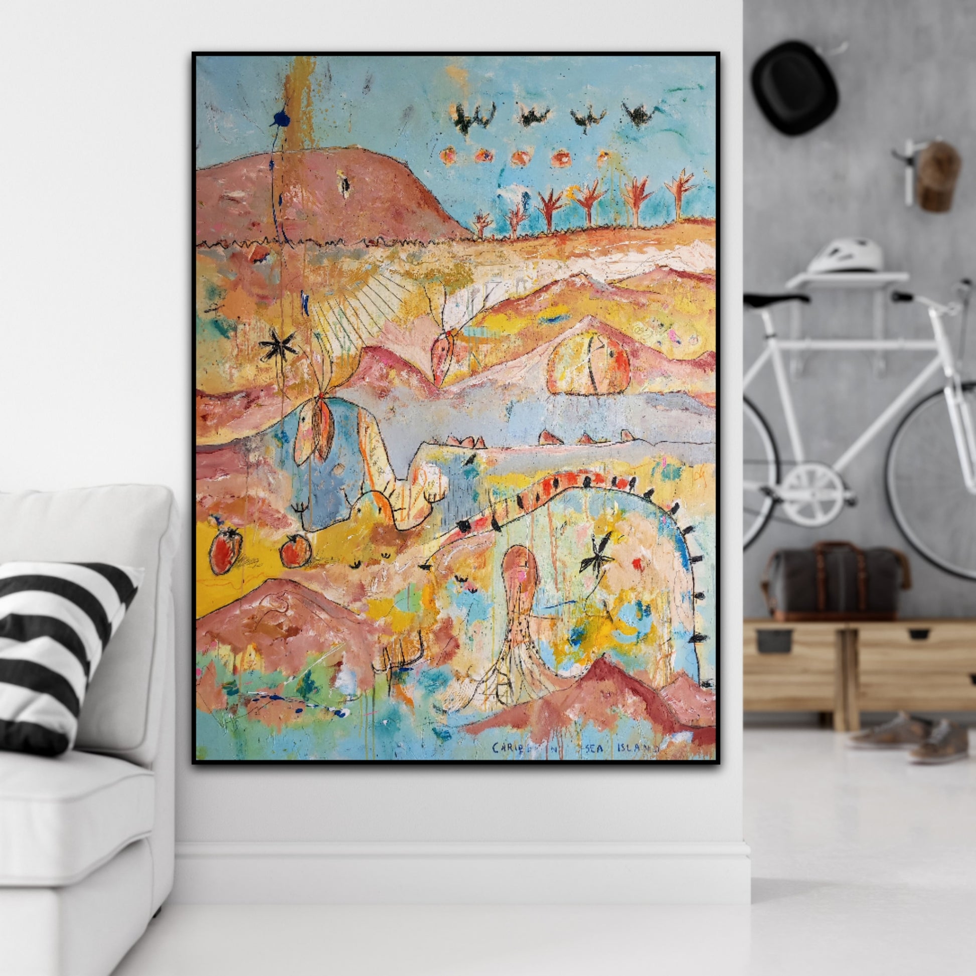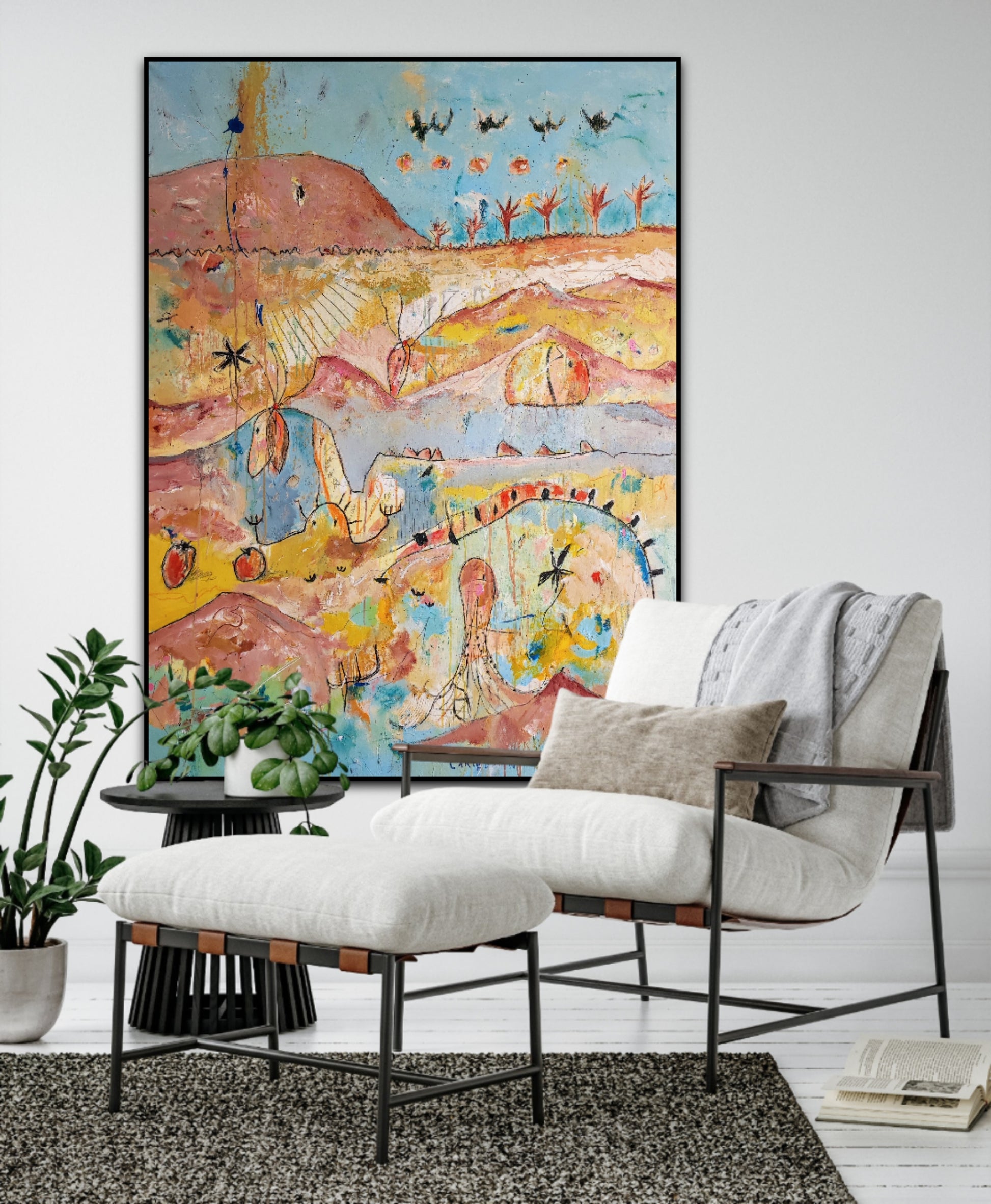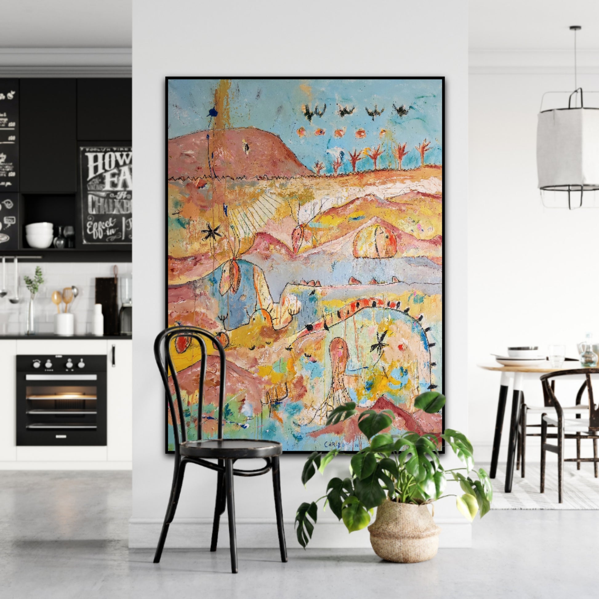 Técnica: acrílico, pigmentos, gesso, tinta china, ceras, carboncillo y lápiz.