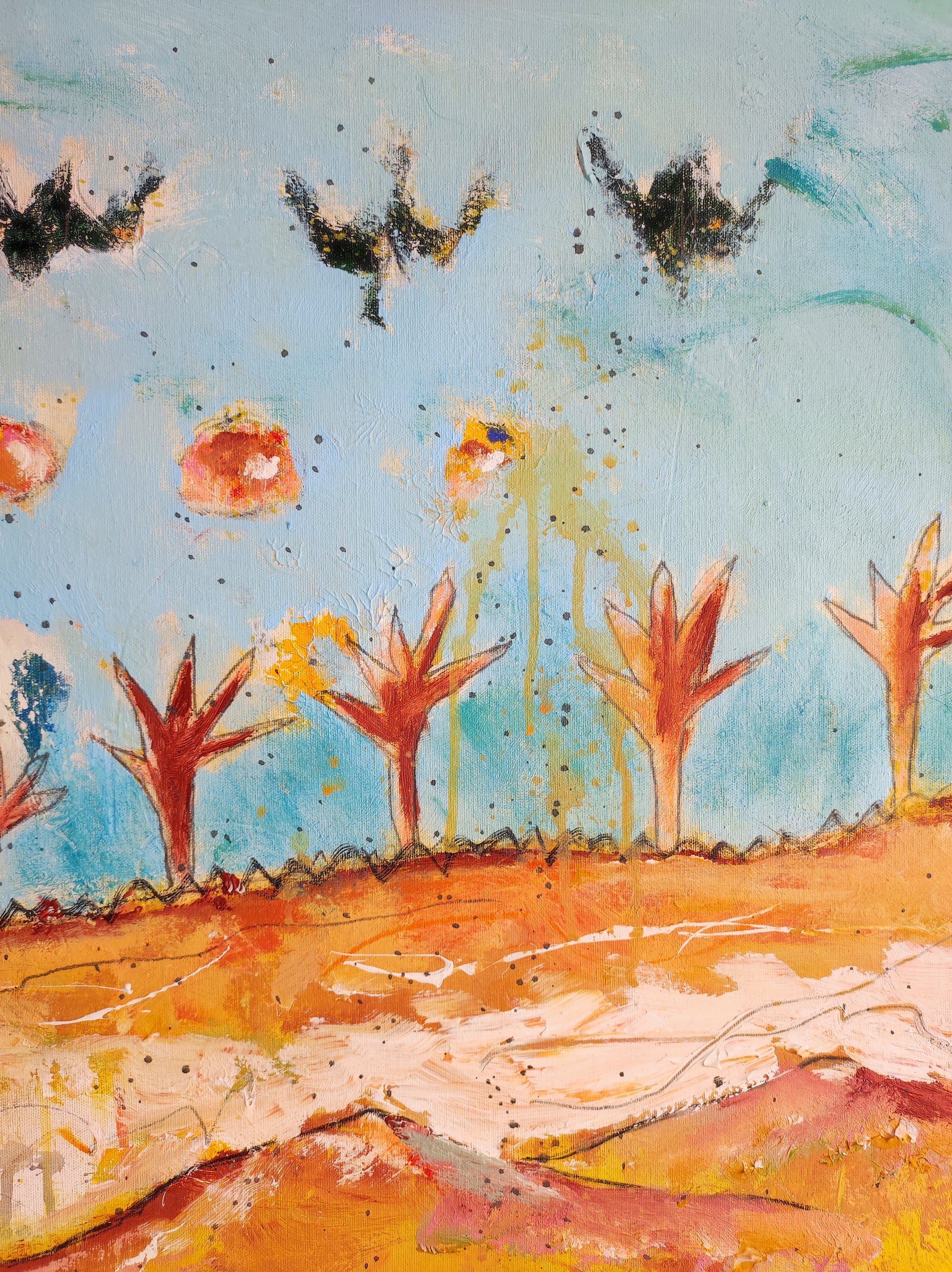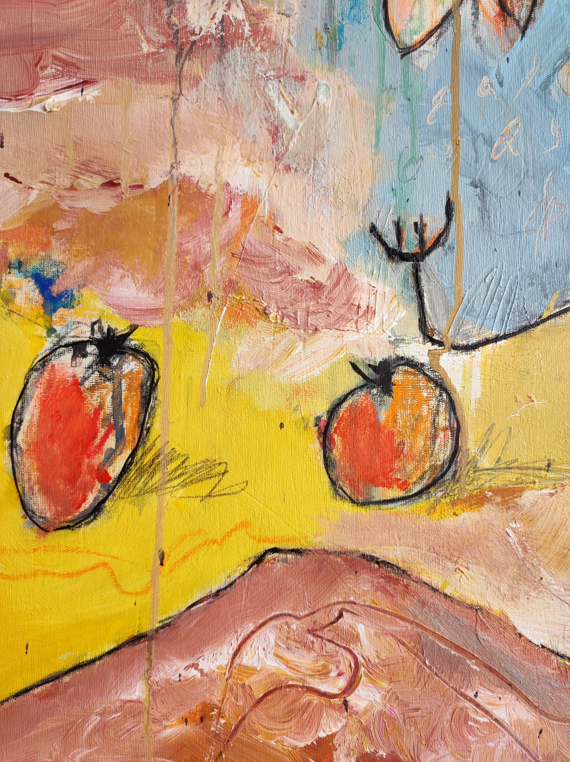 El sueño de un paisaje donde todo se mezcla y está fuera de sitio. Faltan partes y todo está a punto de caerse. Plantas, animales, seres, máscaras... diluido, descomponiéndose.