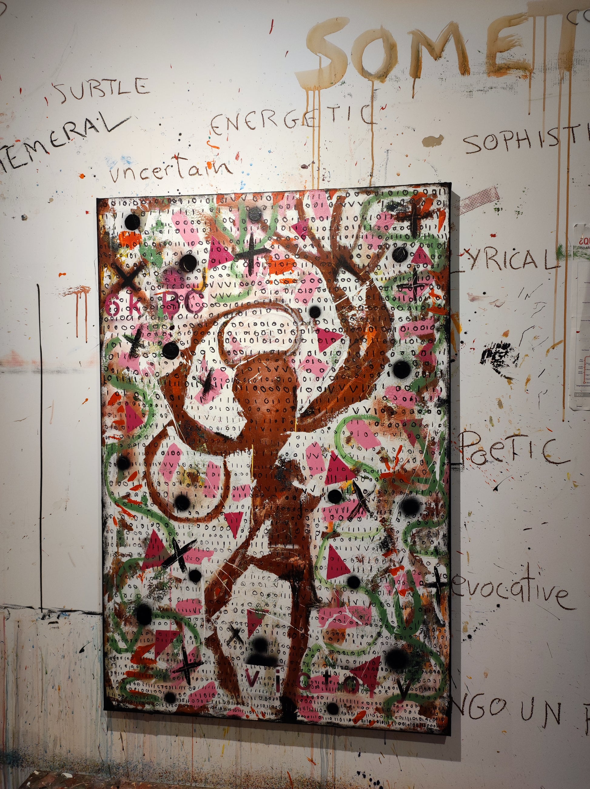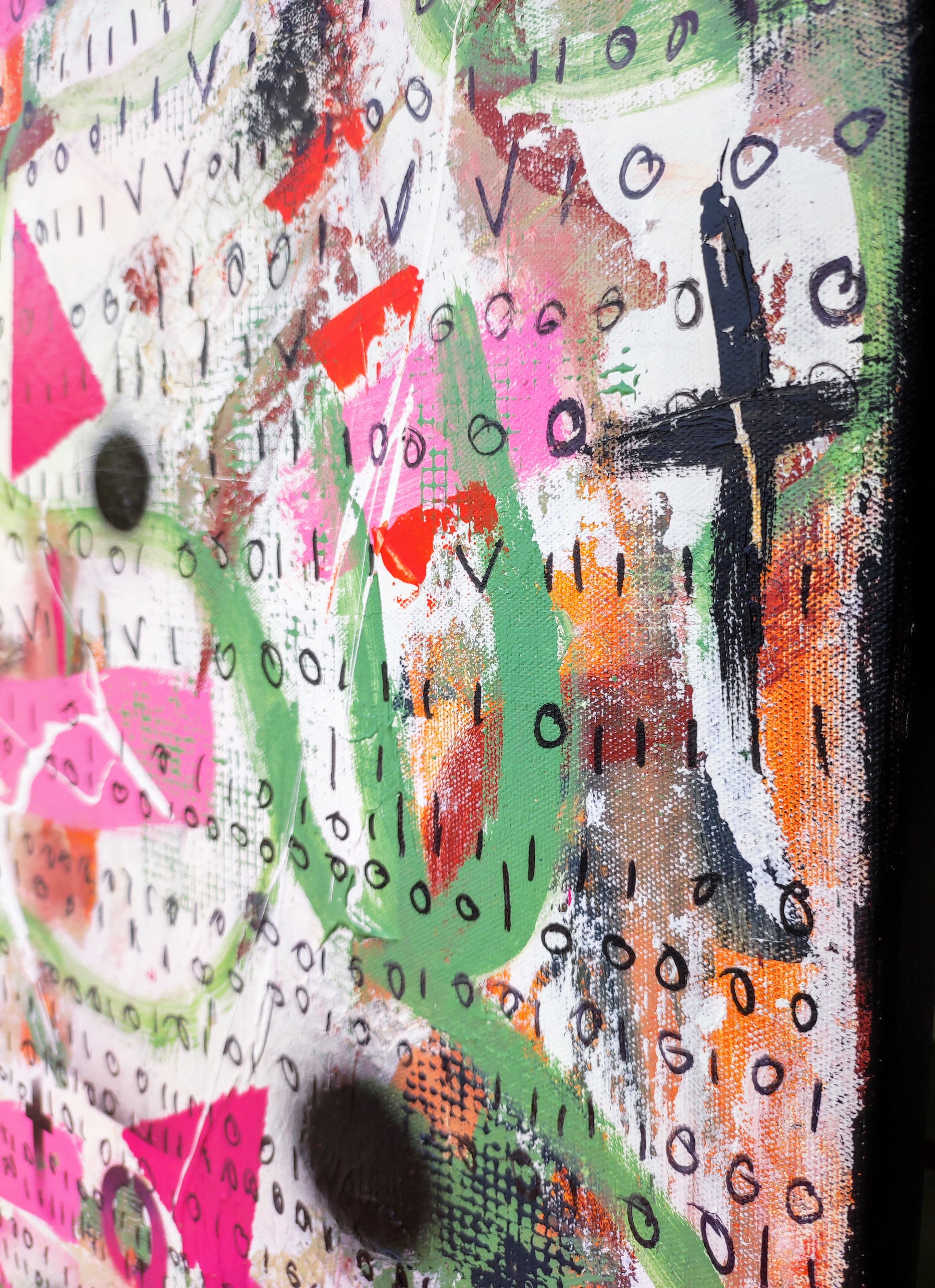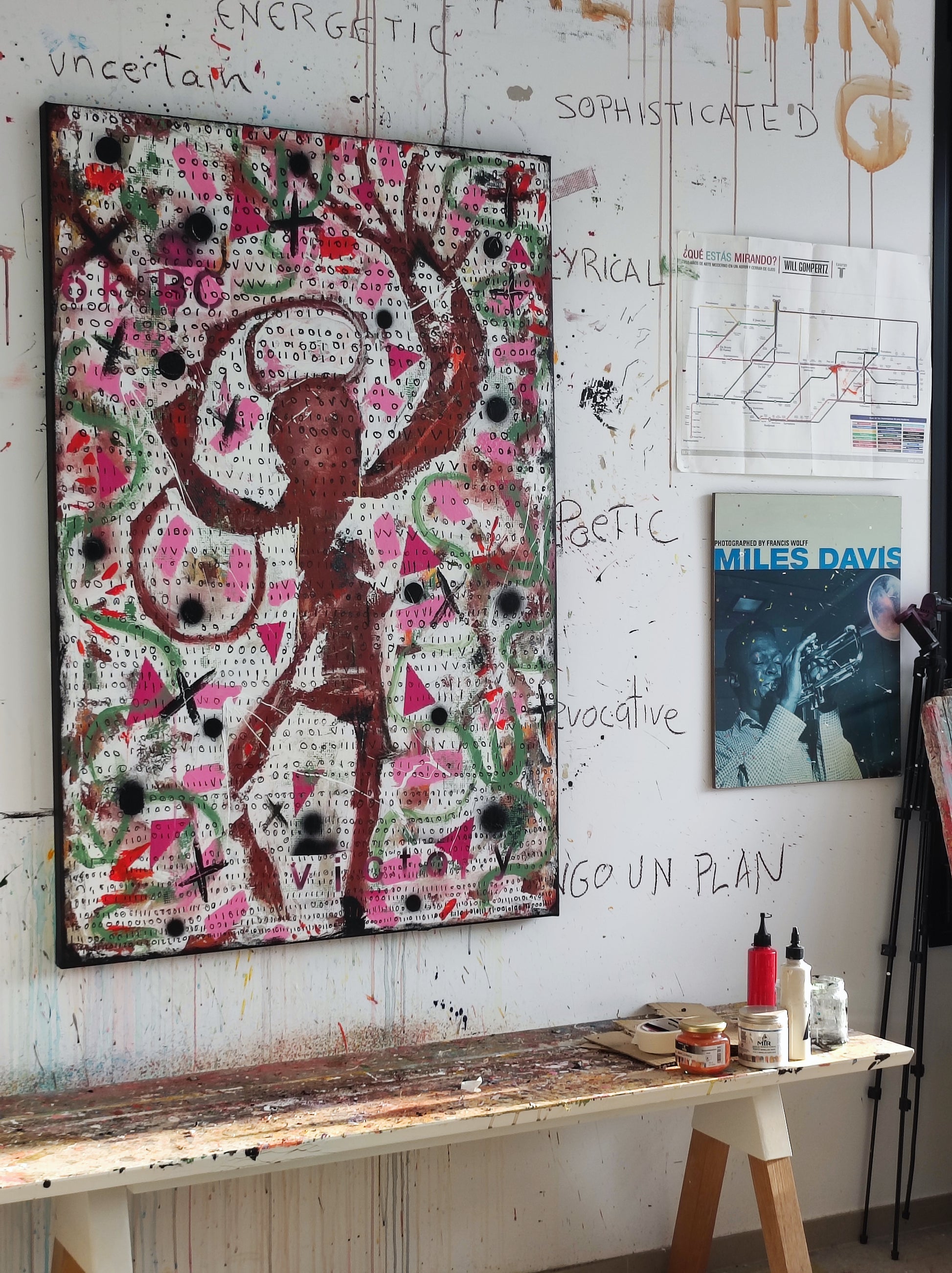 Técnica: acrílico, gesso, carboncillo, ceras, rotulador y pintura en spray.