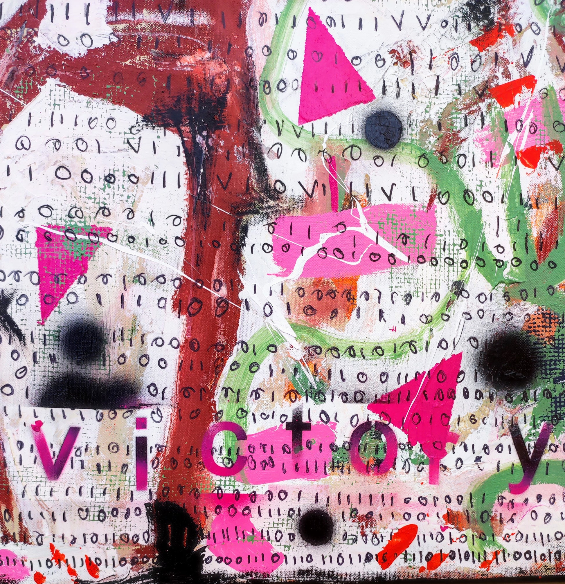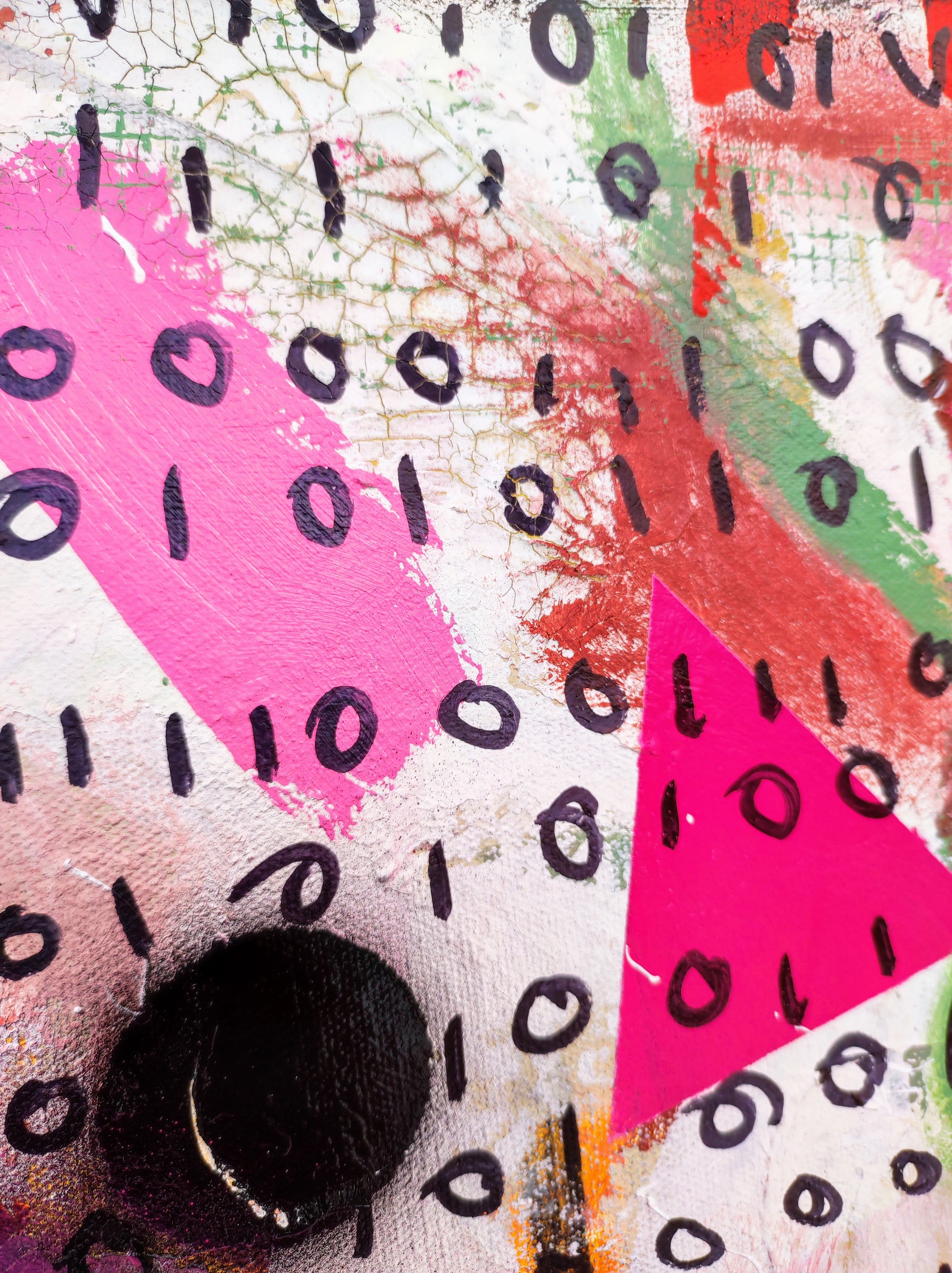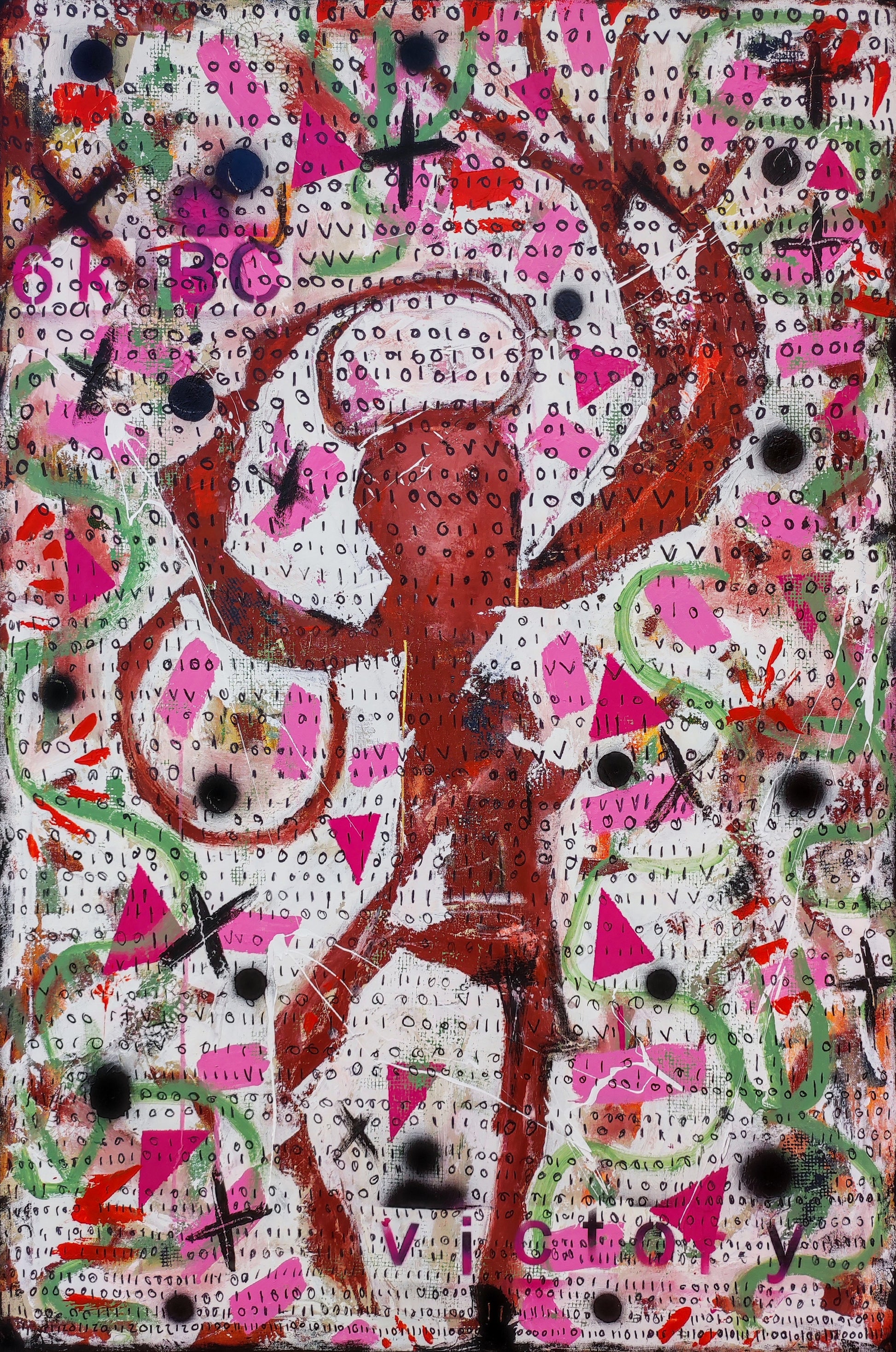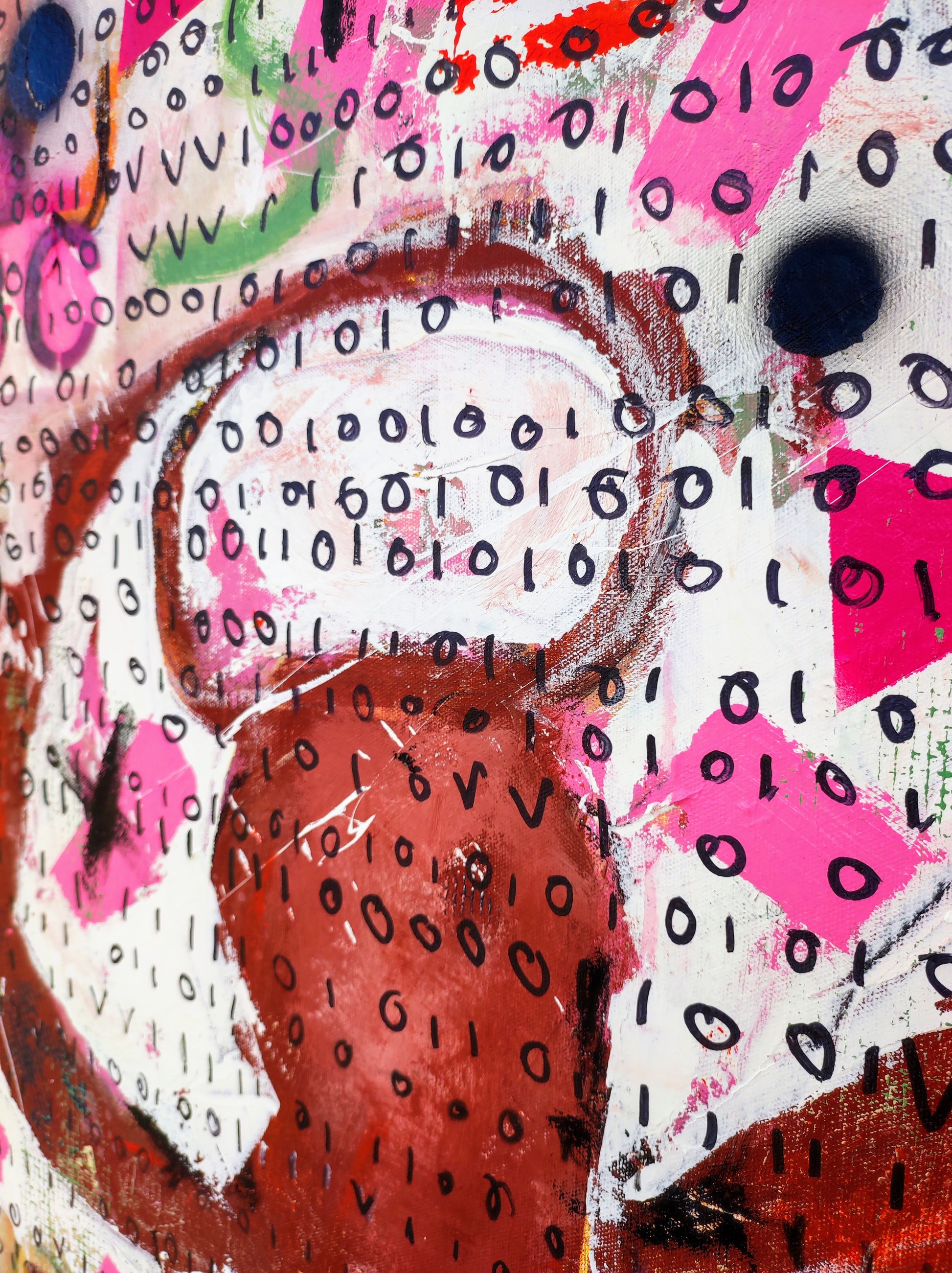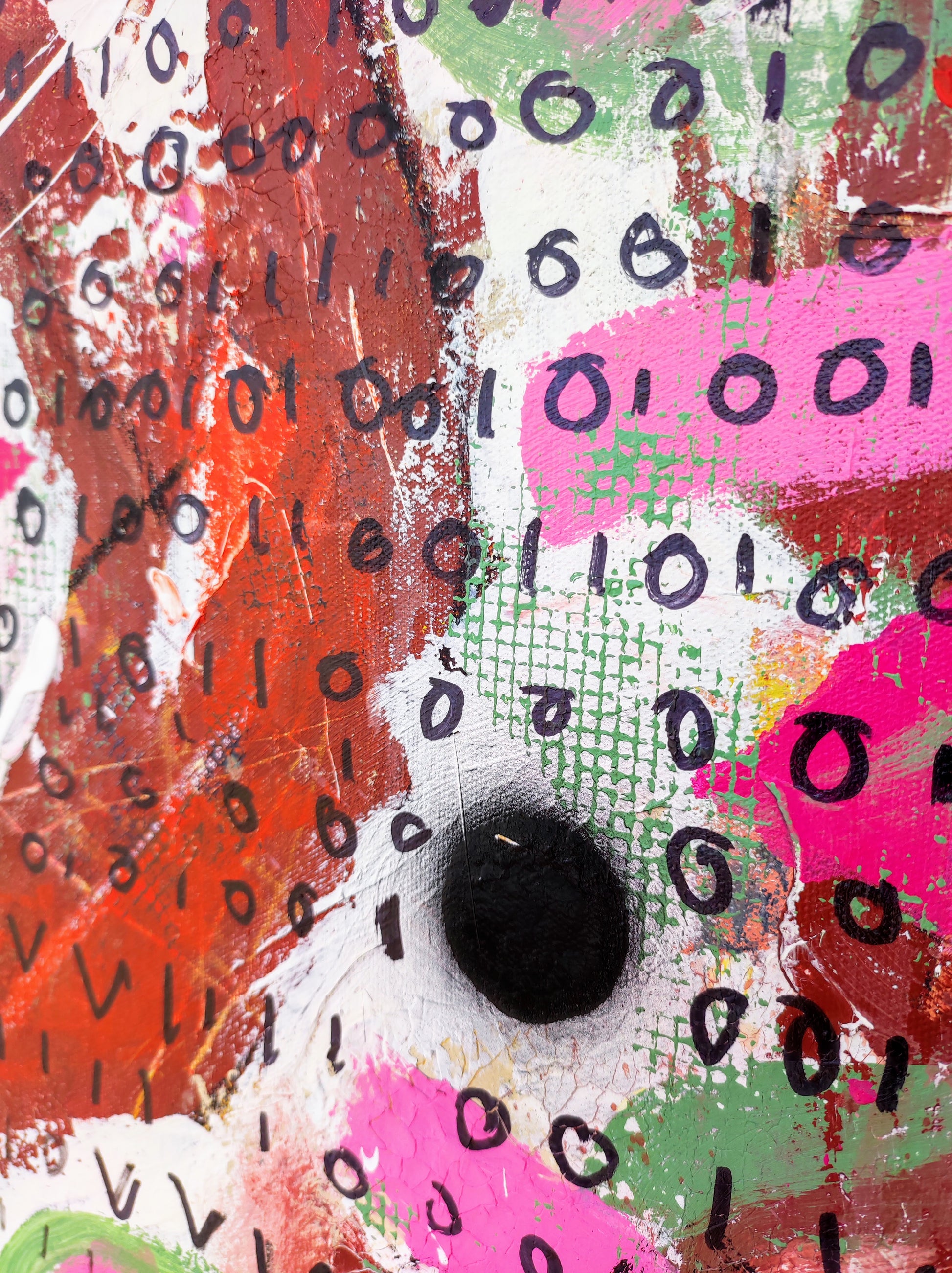 Esta evolución del ser humano a través de la tecnología se representa con un código binario como capa final en la obra que cubre toda la pintura (el código incluye además de 0 y 1 alguna V de victoria).